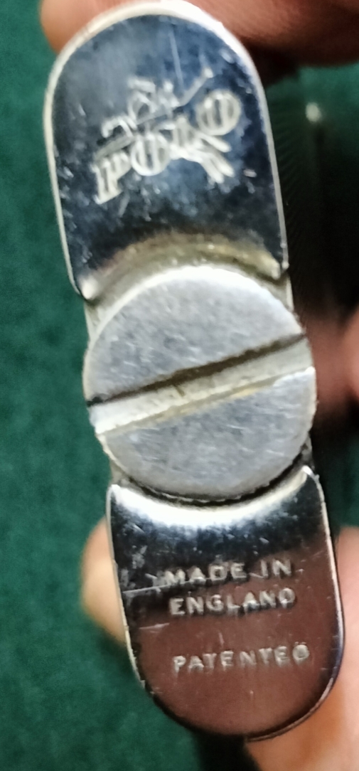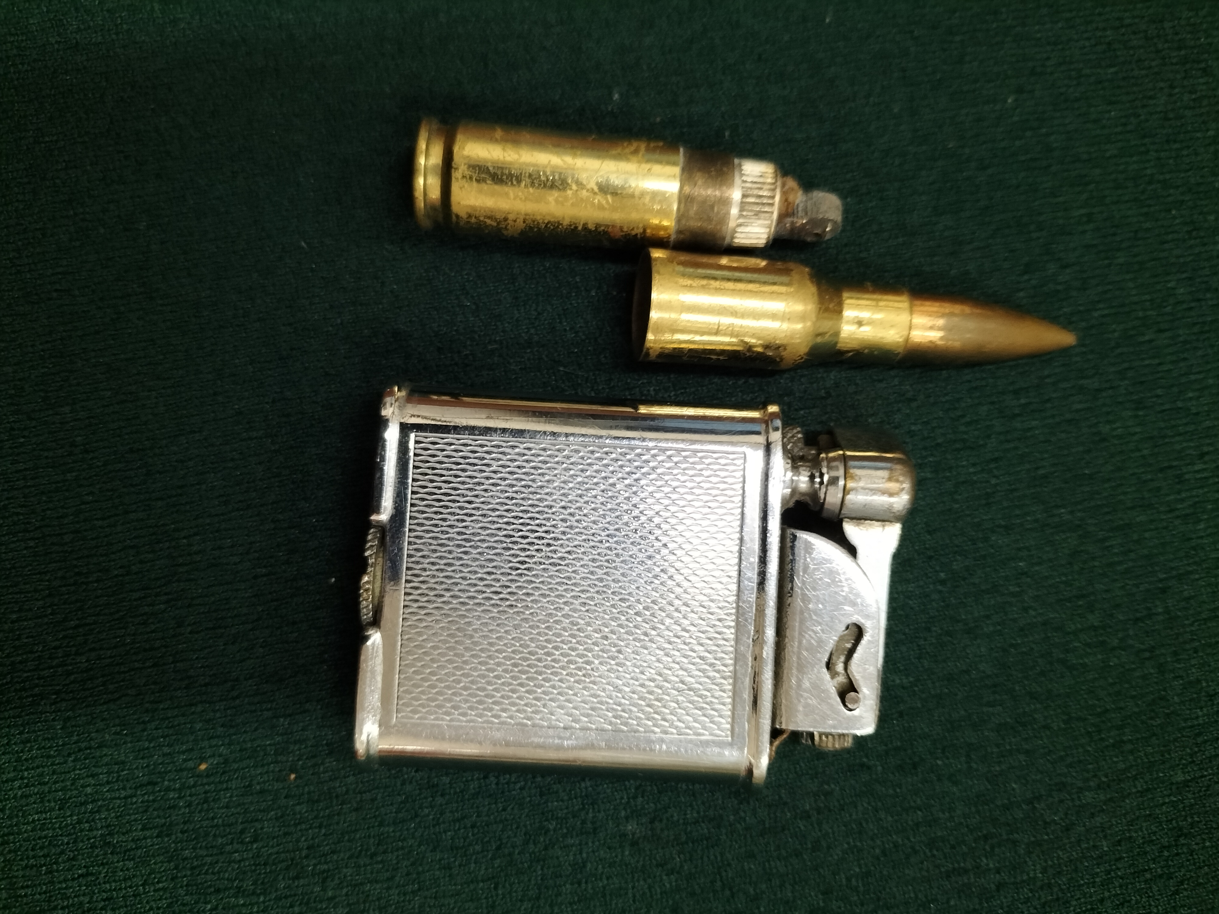 This lot features two vintage mechanical petrol lighters, representing both high-quality English manufacturing and novelty militaria design. The primary piece is a rectangular lift-arm pocket lighter produced by the brand Polo in England. The casing is finished in a silver-toned plating, likely chromium, featuring a classic engine-turned barleycorn pattern. The base is struck with the Polo manufacturer mark, a polo player icon, MADE IN ENGLAND, and PATENTED. This style of lift-arm mechanism was a hallmark of mid-century English smoking accessories, often associated with the Orlik company. The second item is a novelty brass lighter designed to replicate a rifle cartridge. This two-piece construction consists of a detachable bullet-shaped cap and a lower casing that serves as the fuel reservoir, housing the wick and striker assembly. This style of lighter gained popularity as trench art and military-themed souvenirs during the mid-20th century.