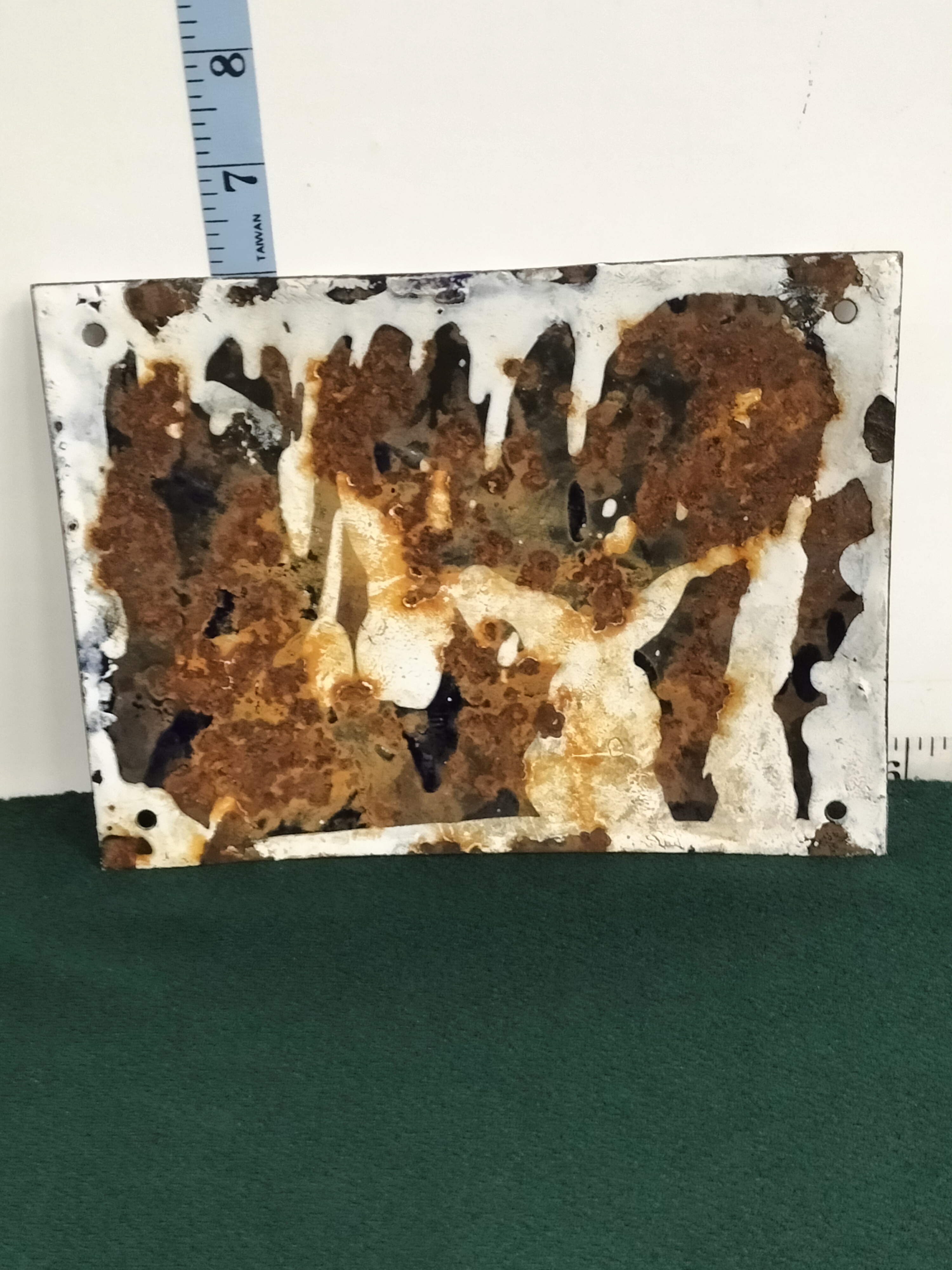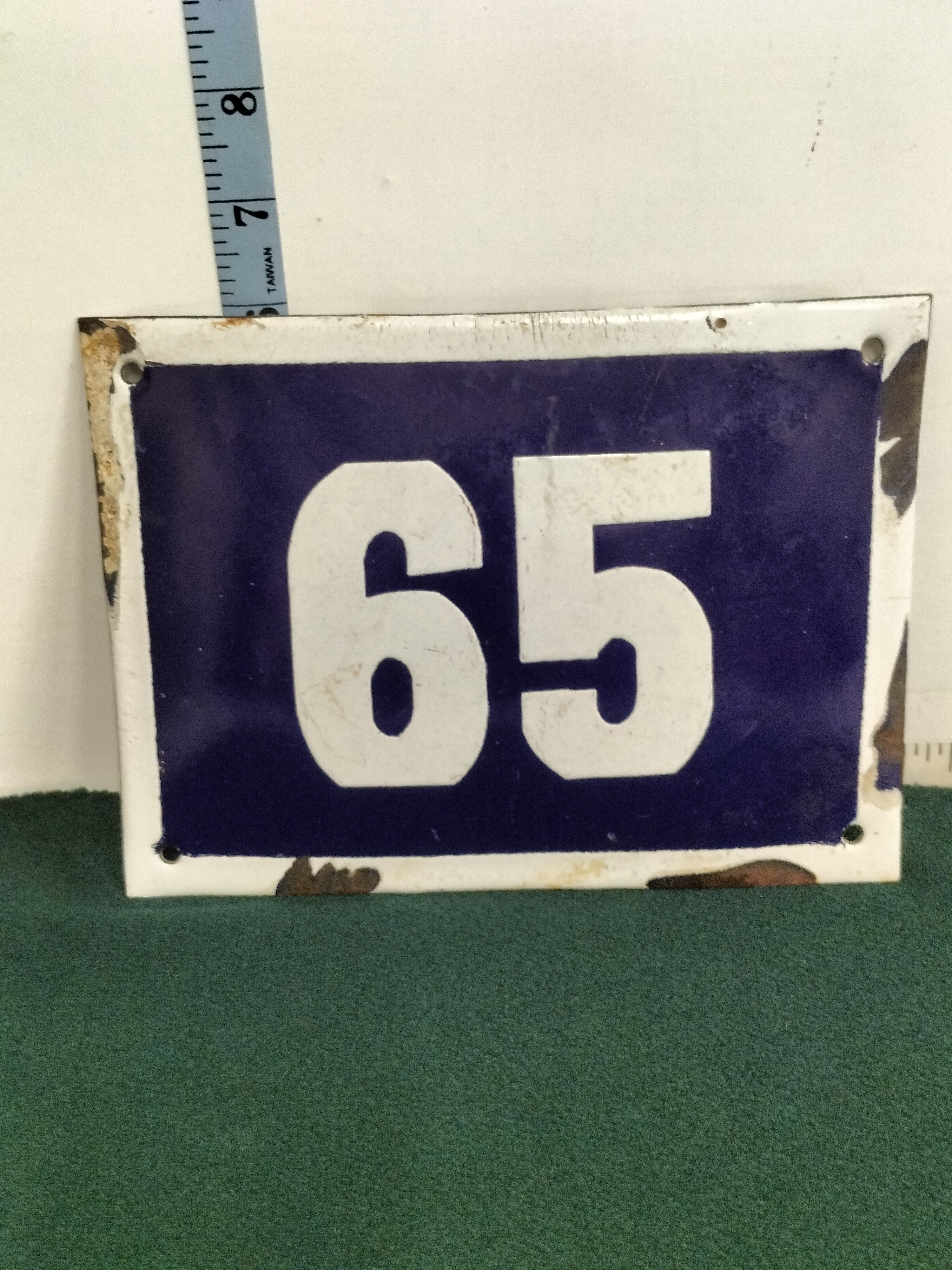 This unmarked Railway number sign is an original piece from the mid-20th century. It is constructed from porcelain enamel on steel and features the text 65 in bold white block-style numerals. The design consists of a deep cobalt blue background with a thin white border. The sign includes four original mounting holes, one at each corner. Dimensions: Approximately 4.75″ H x 6.25″ W.
