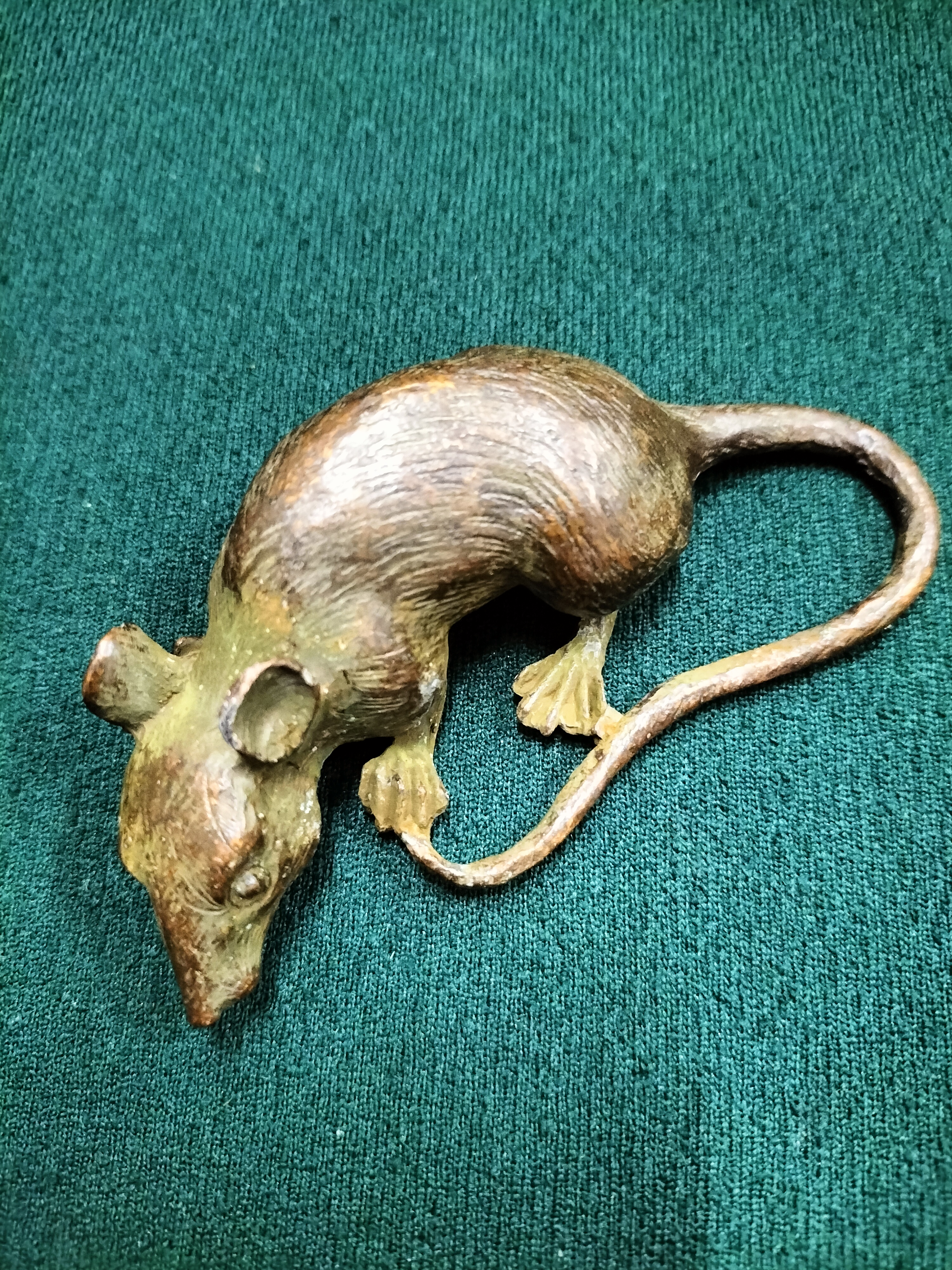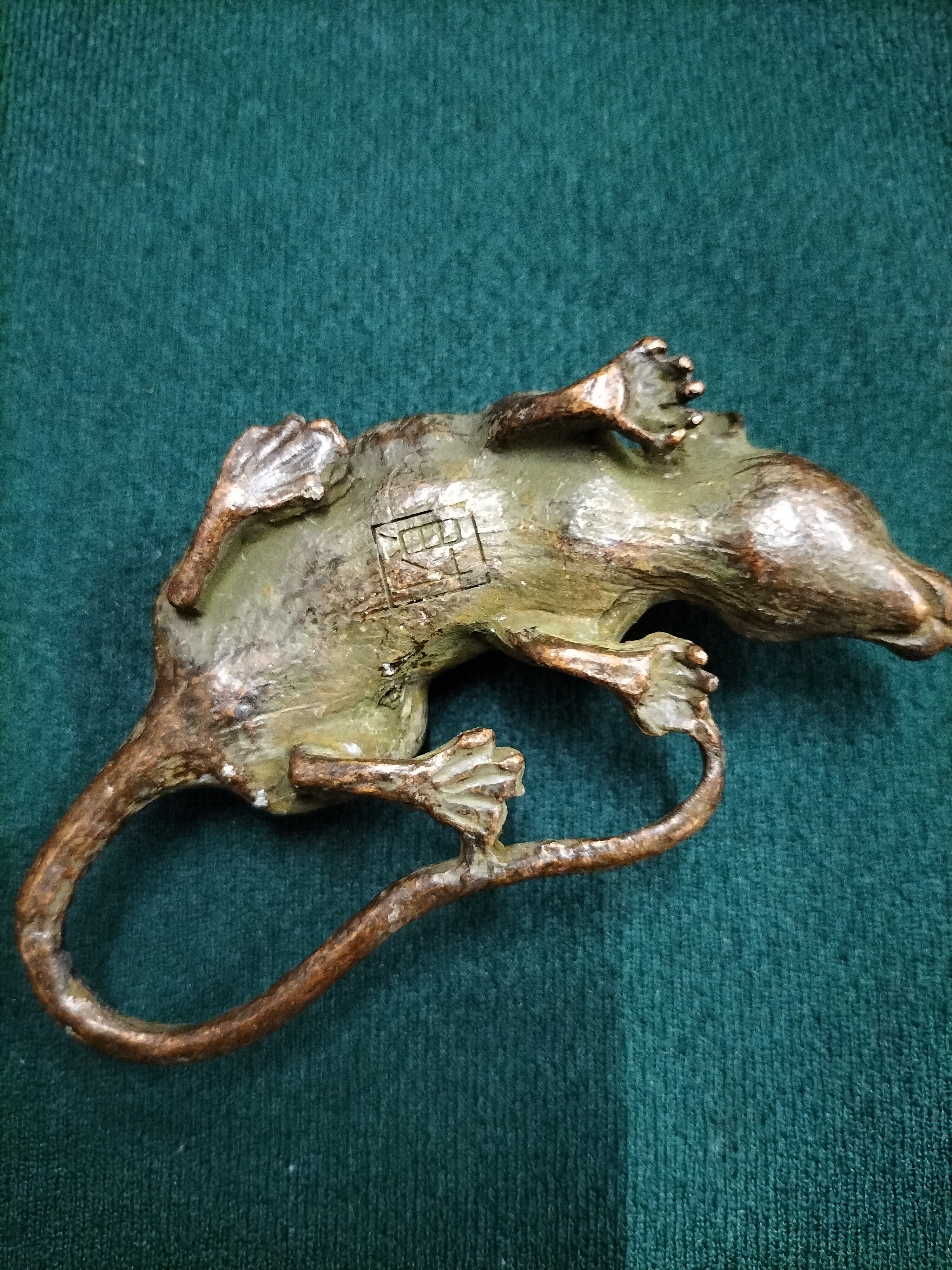 A finely cast bronze miniature animal sculpture known as an okimono, depicting a rat or mouse in a naturalistic, crouched pose. This piece is executed in the Meiji style, characteristic of Japanese decorative arts from the late 20th century. The sculpture features intricate hand-finished details, particularly in the texture of the fur, the delicate paws, and the long, gracefully curved tail. It was produced using the lost-wax casting technique. The underside bears a square recessed seal mark, indicating its East Asian origin. Height: 2.3cm. Weight: 169g.