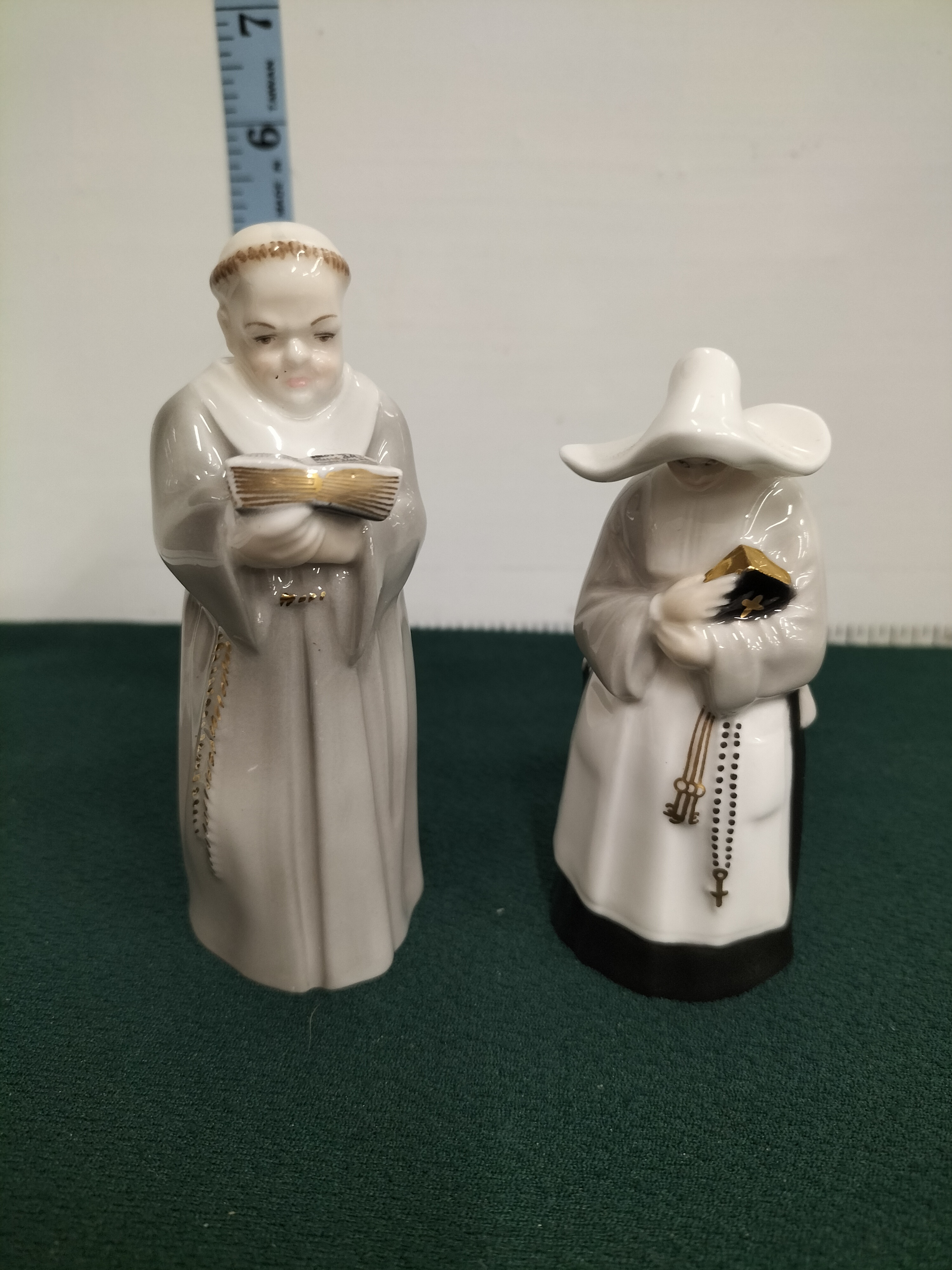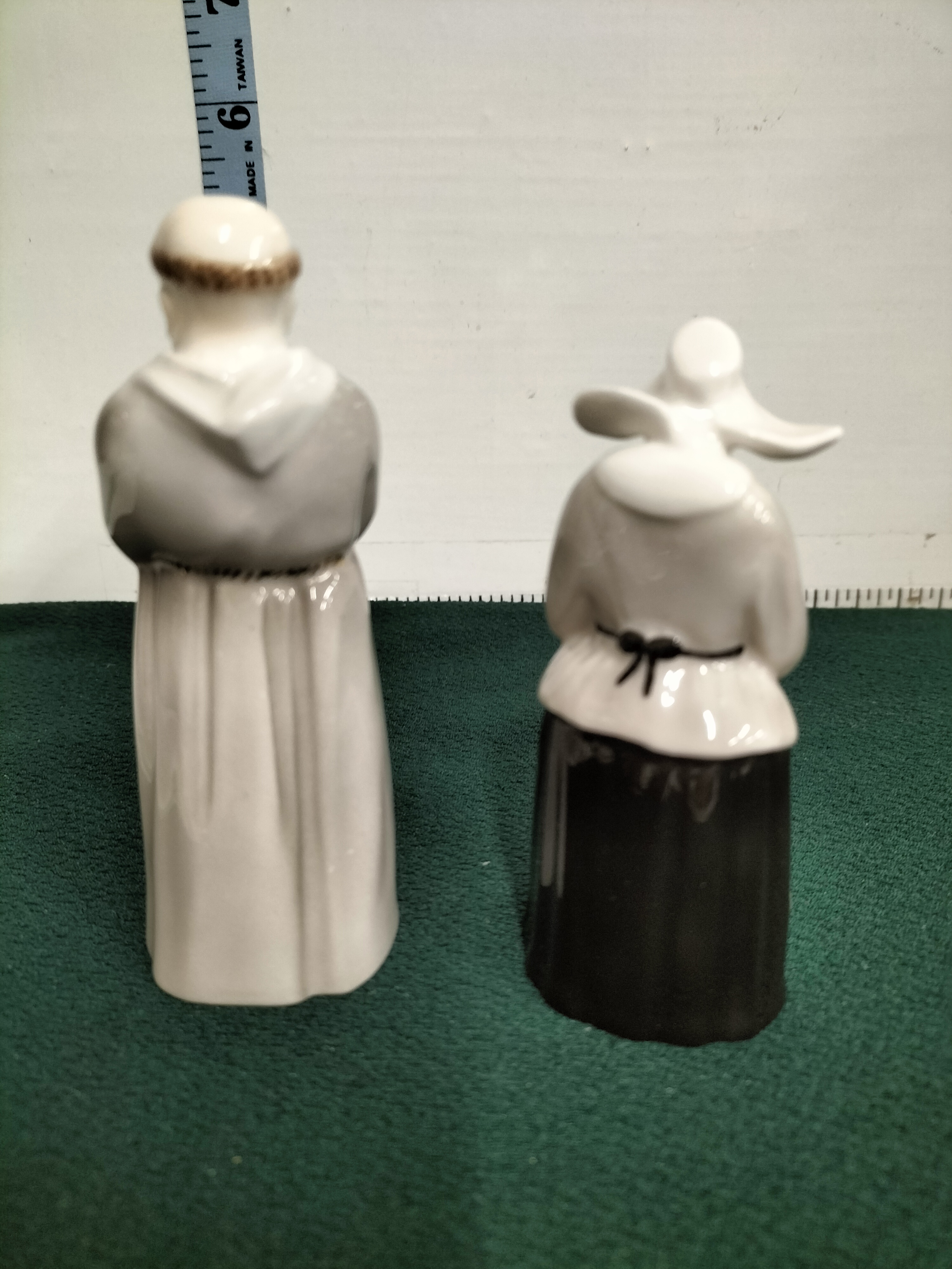 A pair of Royal Worcester porcelain figurines, modelled as candle snuffers, titled The Monk and The Nun. The Monk is depicted in a grey habit with a traditional tonsure, reading an open book with hand-painted gold-gilt edges. The companion figure, The Nun, is dressed in the black and white habit of the Daughters of Charity, featuring a large, winged cornette headpiece. She holds a closed book with gilt accents and has a detailed rosary with a cross and keys suspended from her waist. Both pieces feature a high-gloss glaze and are characteristic of the factory’s ecclesiastical series. No factory marks or decorator signatures are visible on the underside of the bases.