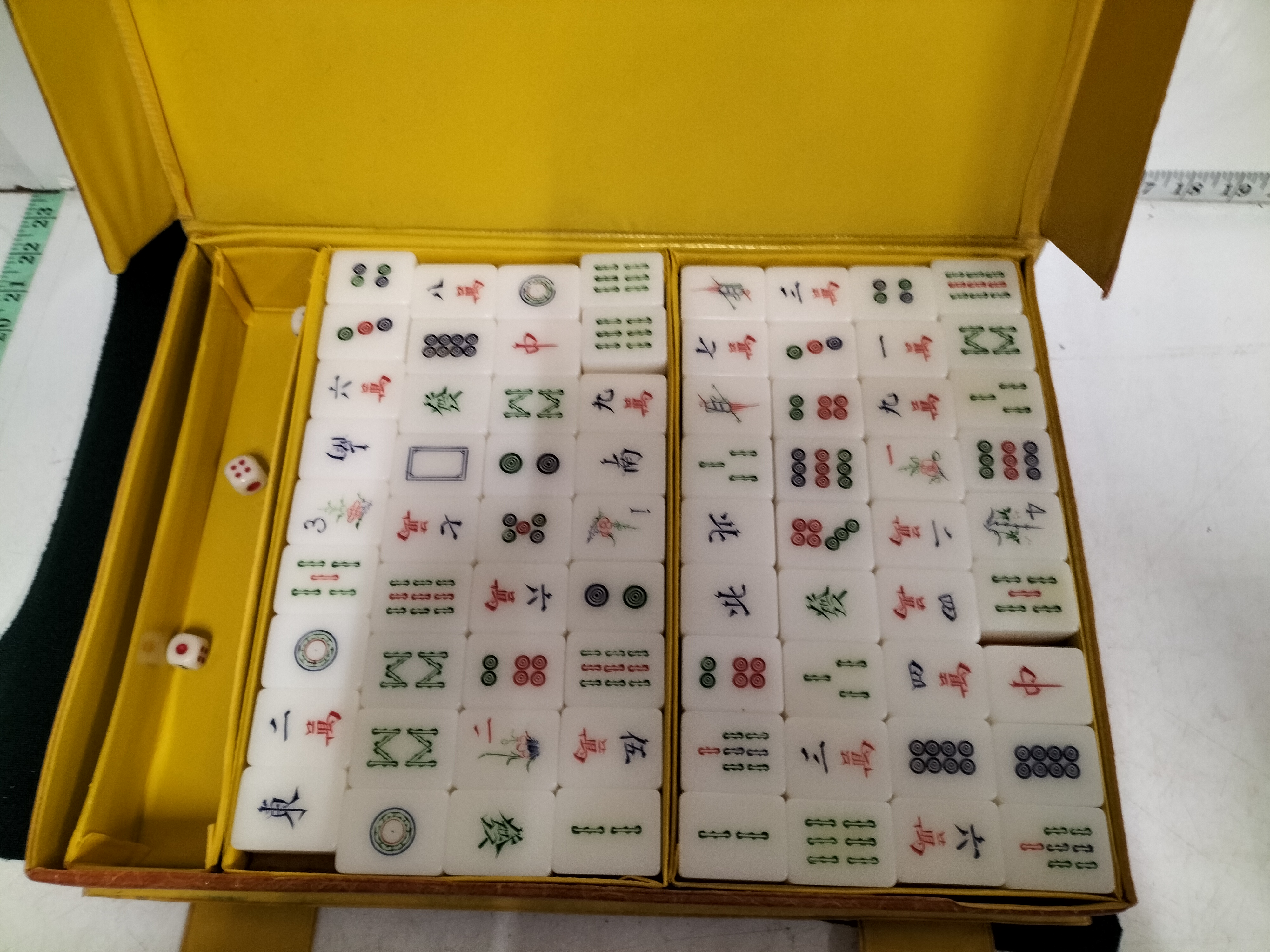 A comprehensive Chinese Mahjong set featuring 144 tiles manufactured from dense, white melamine resin. Each tile is precisely engraved and finished with traditional pigments in red, green, blue, and black, depicting the standard suits of bamboo, dots, and characters, alongside winds, dragons, and floral motifs. The tiles include small Arabic numerals to facilitate ease of play for international collectors.