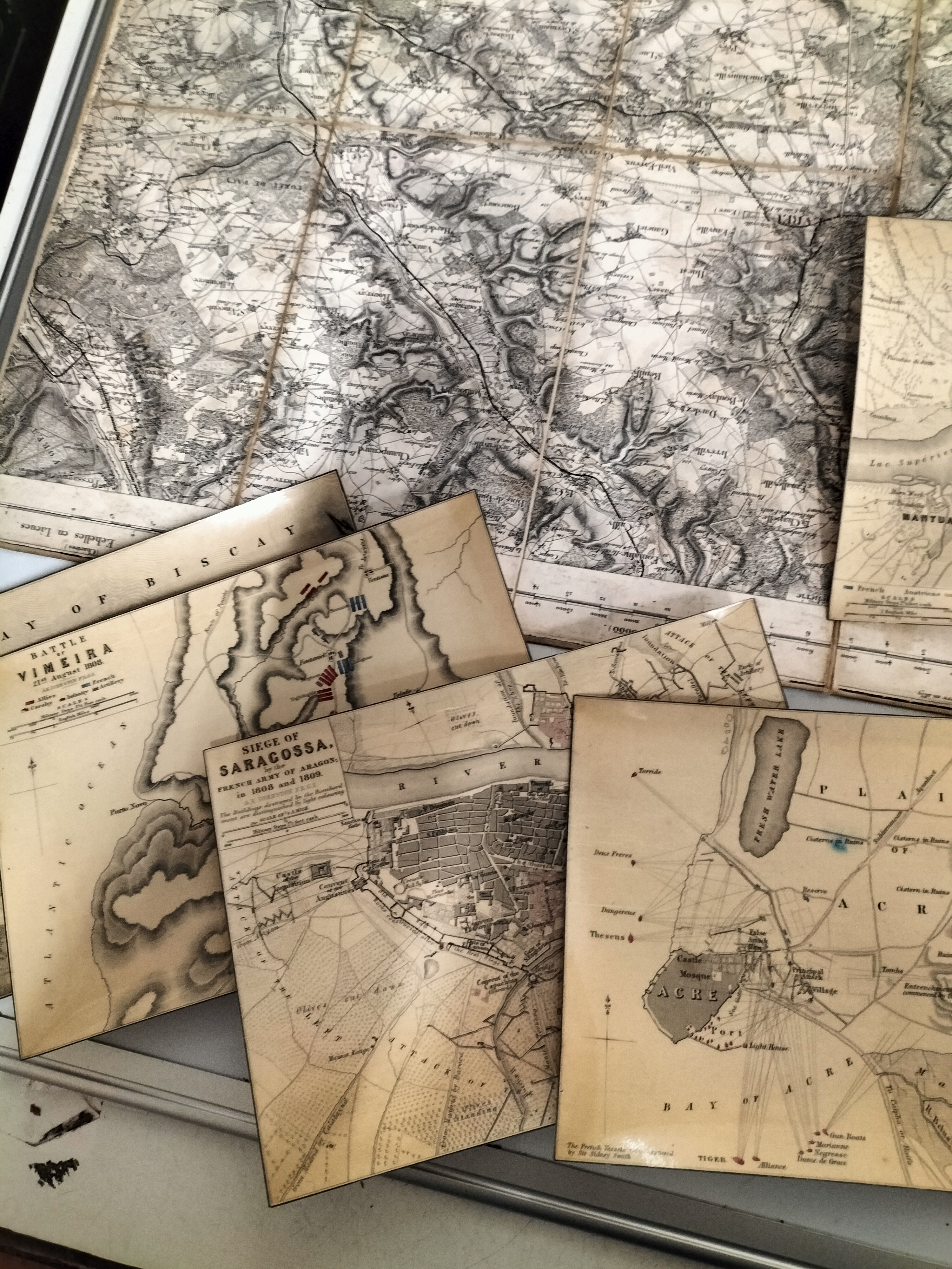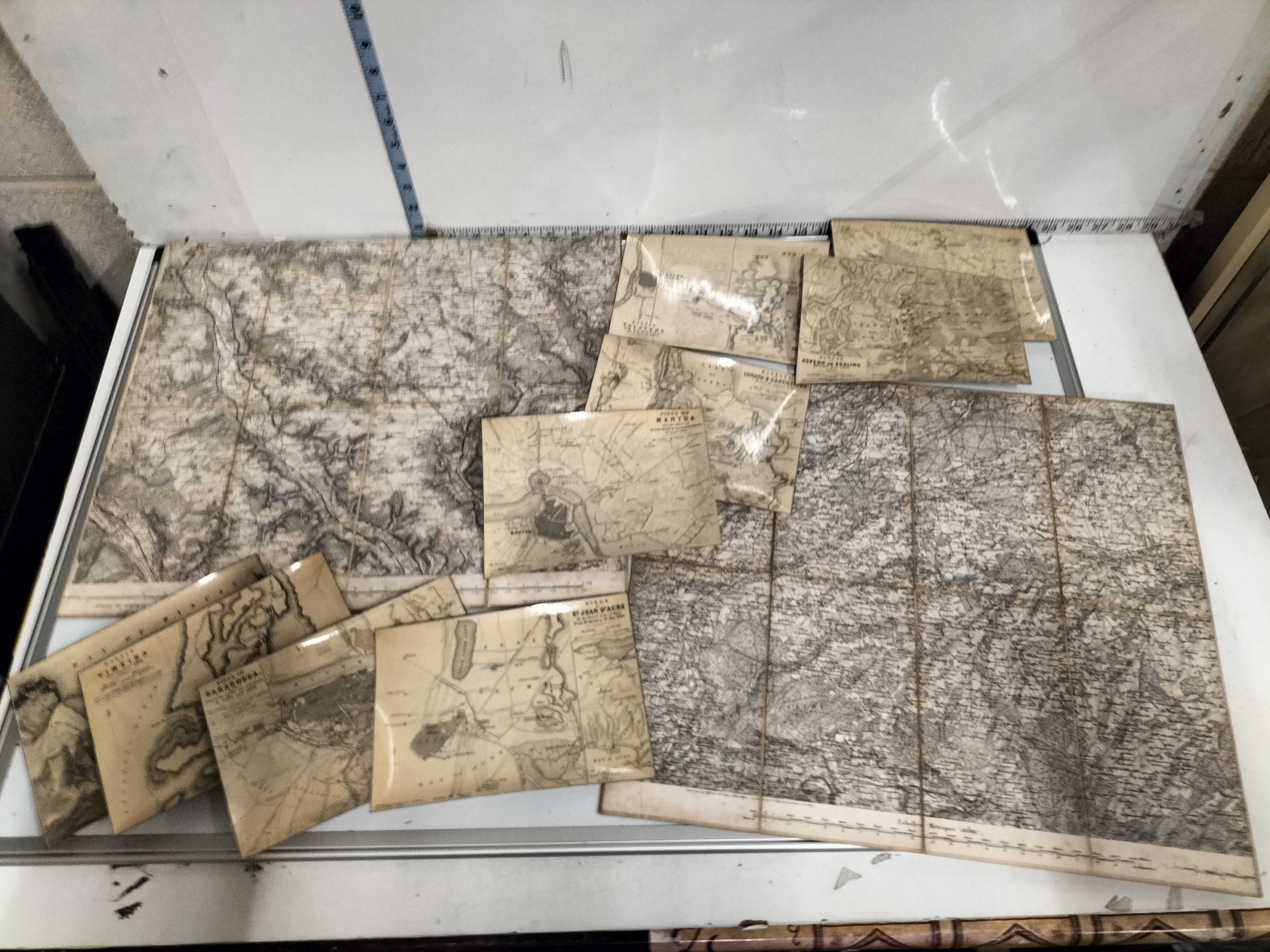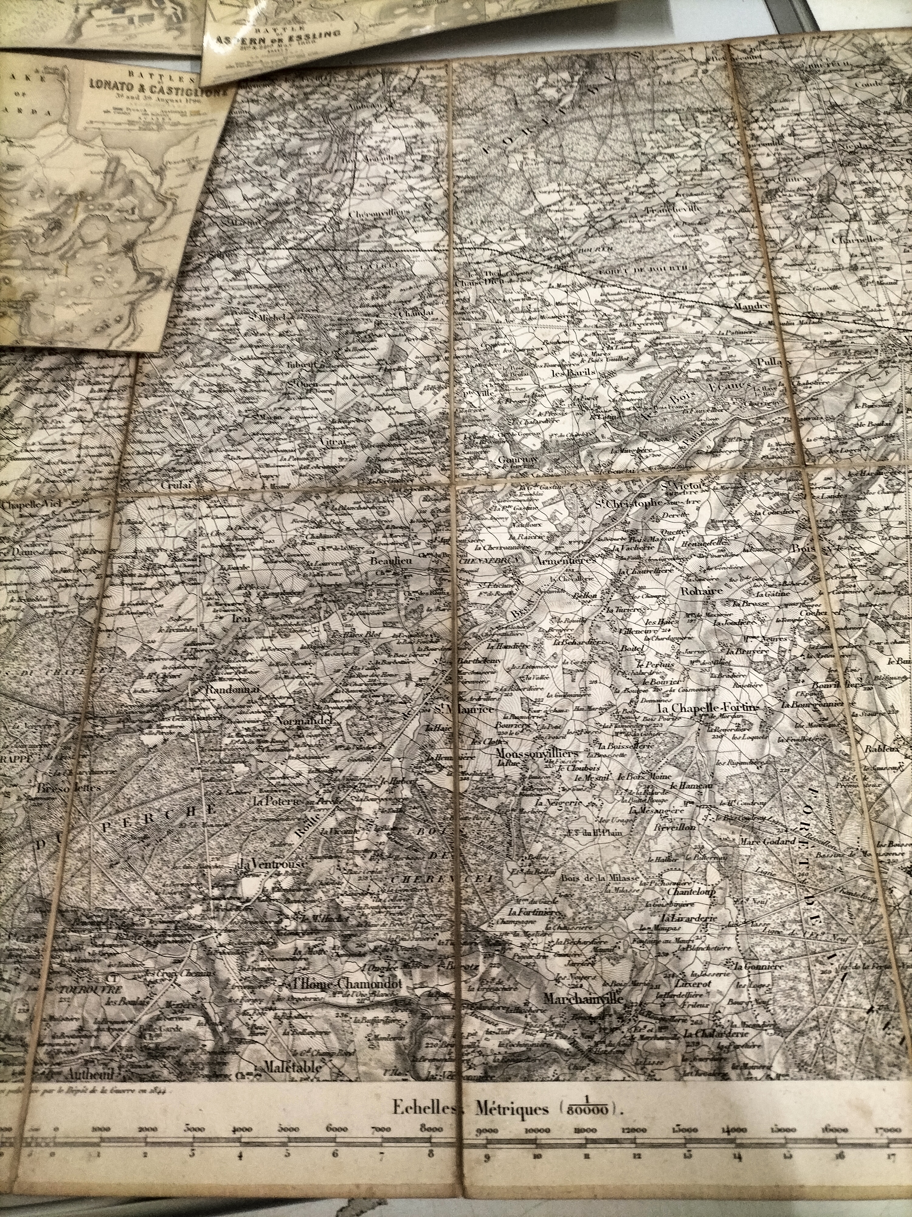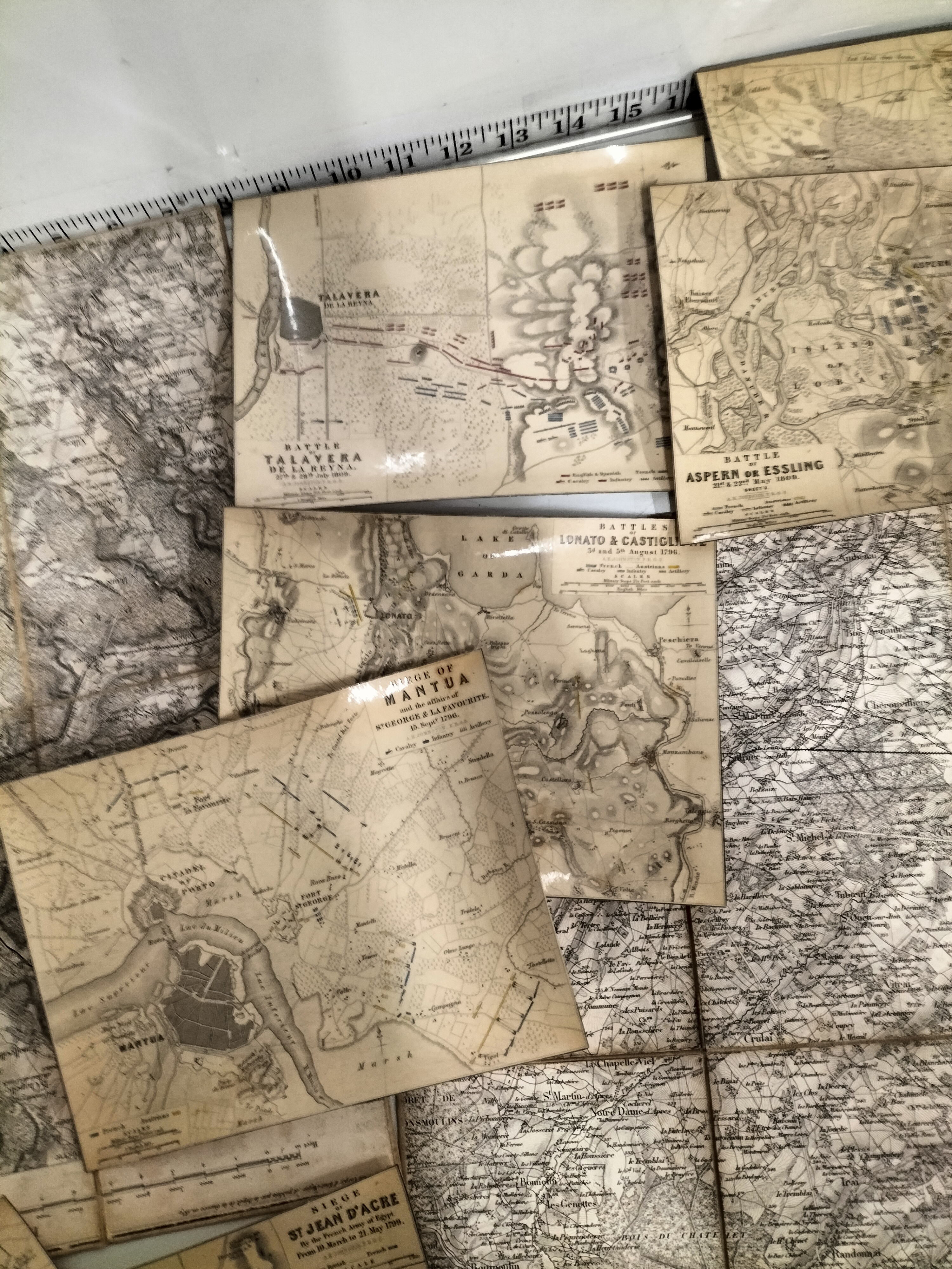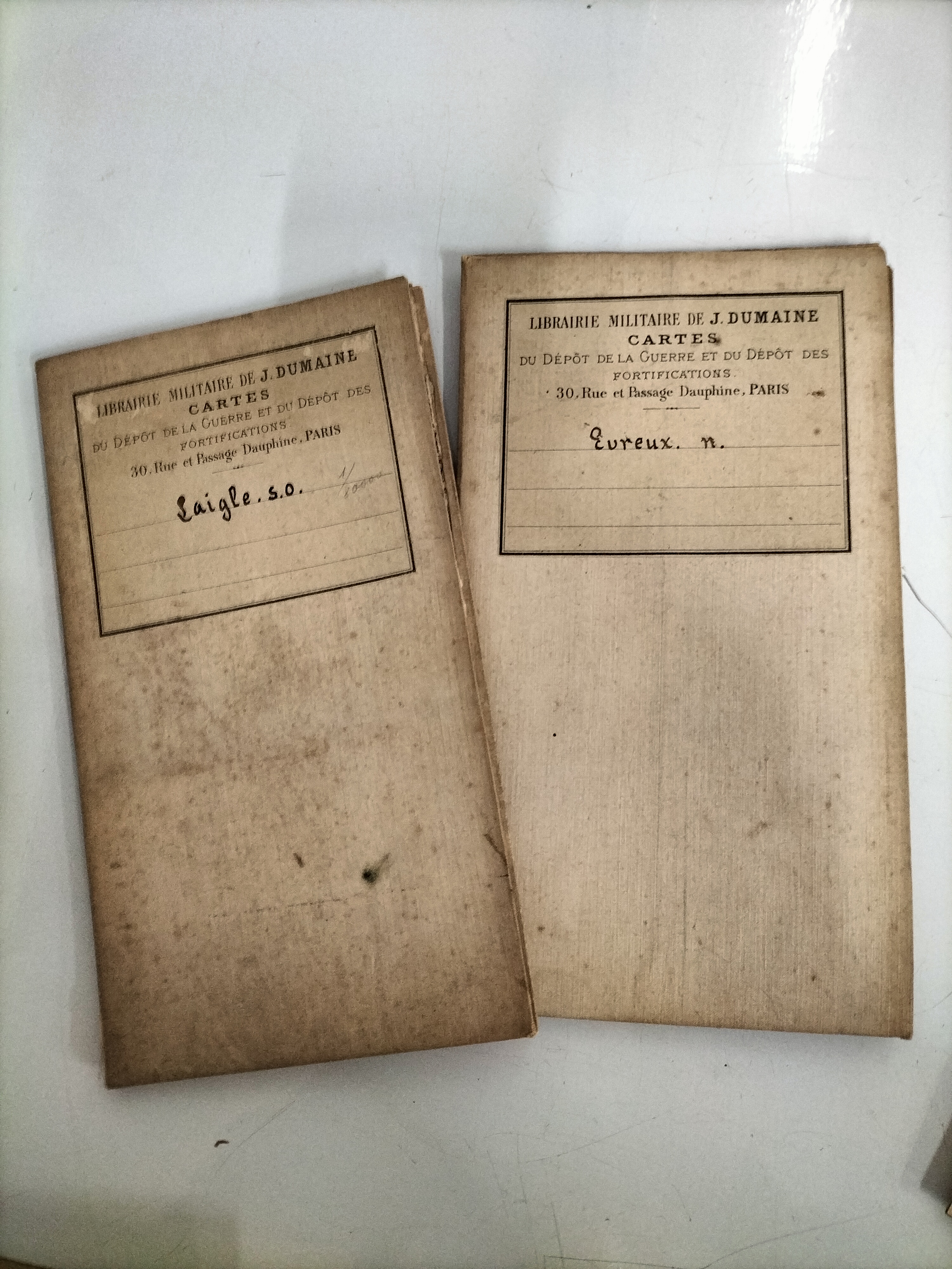 A diverse group of military cartography primarily issued by the Librairie Militaire de J. Dumaine, 30, Rue et Passage Dauphine, Paris, successor to Anselin. These maps were produced for the Depot de la Guerre and the Depot des Fortifications. The collection includes two large-scale engraved topographical maps at a 1:80,000 scale, covering the French regions of Evreux (Nord) and L’Aigle (Sud-Ouest). One map bears a publication date of 1844. These maps are expertly dissected into panels and mounted on linen backing for folding, accompanied by their original printed paper wrappers featuring period manuscript identifications. Additionally, the lot contains a series of approximately eight printed plans illustrating significant Napoleonic engagements, including the Battle of Talavera de la Reyna (1809), Battle of Aspern or Essling (1809), Battles of Lonato and Castiglione (1796), Siege of Mantua (1796-97), Battle of Vimeira (1808), Siege of Saragossa (1808-09), and the Siege of Acre (1799). The battle plans are printed on heavy paper or card, with some featuring a glossy protective finish. J. Dumaine was the preeminent French military publisher of the mid-19th century, making this collection a significant resource for historians of the Peninsular War and Napoleon’s campaigns in Italy and Egypt.
