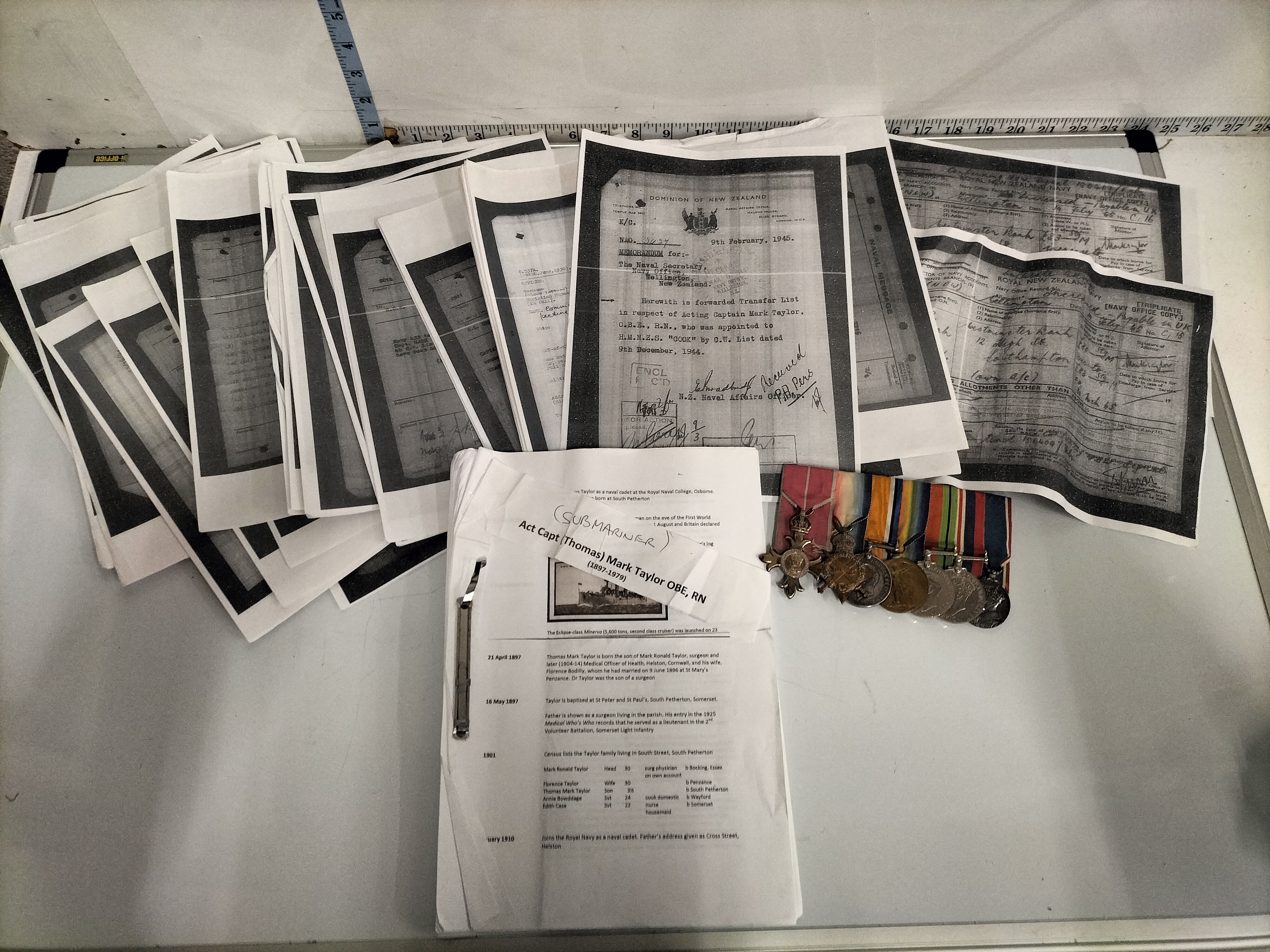A highly significant and comprehensive seven-medal service group and research archive belonging to Acting Captain (Thomas) Mark Taylor, OBE, RN (1897–1979). This lot represents a distinguished career spanning both World Wars and service in both the Royal Navy and the Royal New Zealand Navy. The medal group, professionally court-mounted, comprises: The Most Excellent Order of the British Empire (OBE), Officer’s breast badge, Military Division (2nd type ribbon); 1914-15 Star; British War Medal 1914-20, rim-named to LIEUT. T. M. TAYLOR. R.N.; Victory Medal, rim-named to LIEUT. T. M. TAYLOR. R.N.; 1939-45 Star; Defence Medal; and War Medal 1939-45.