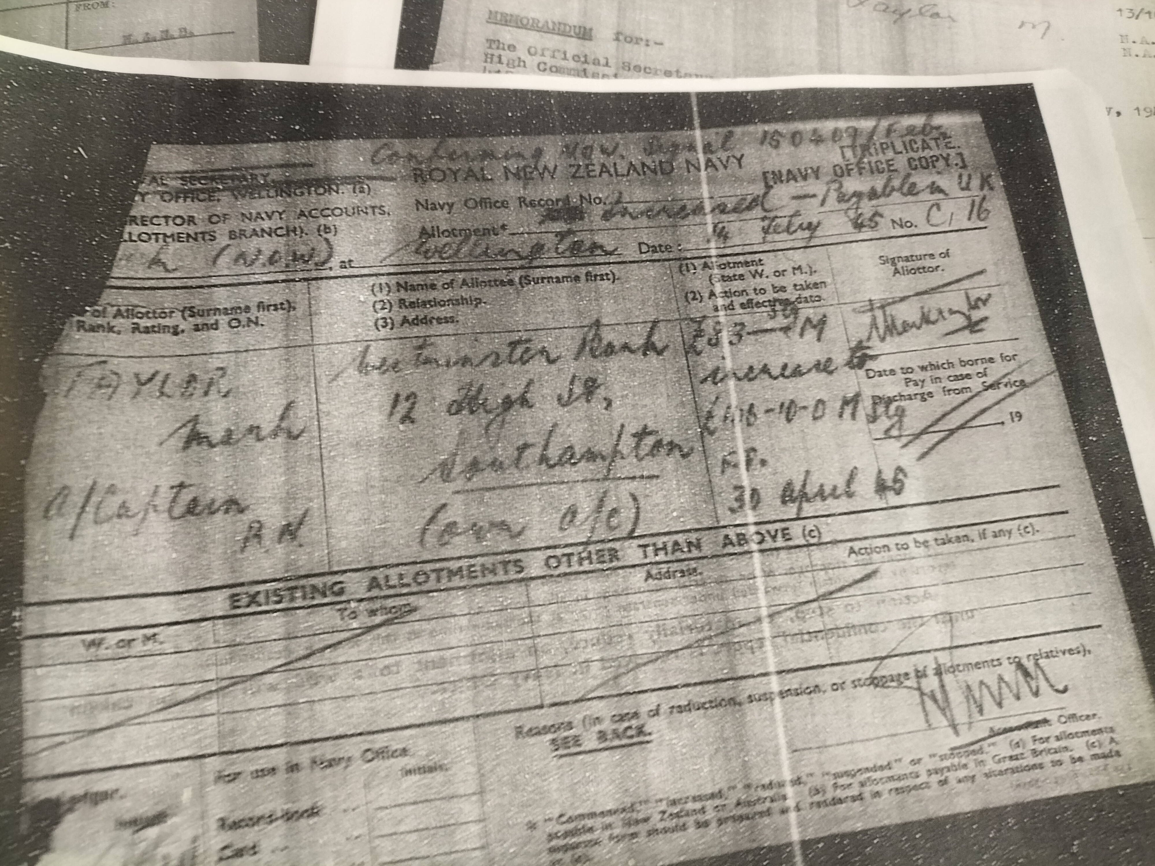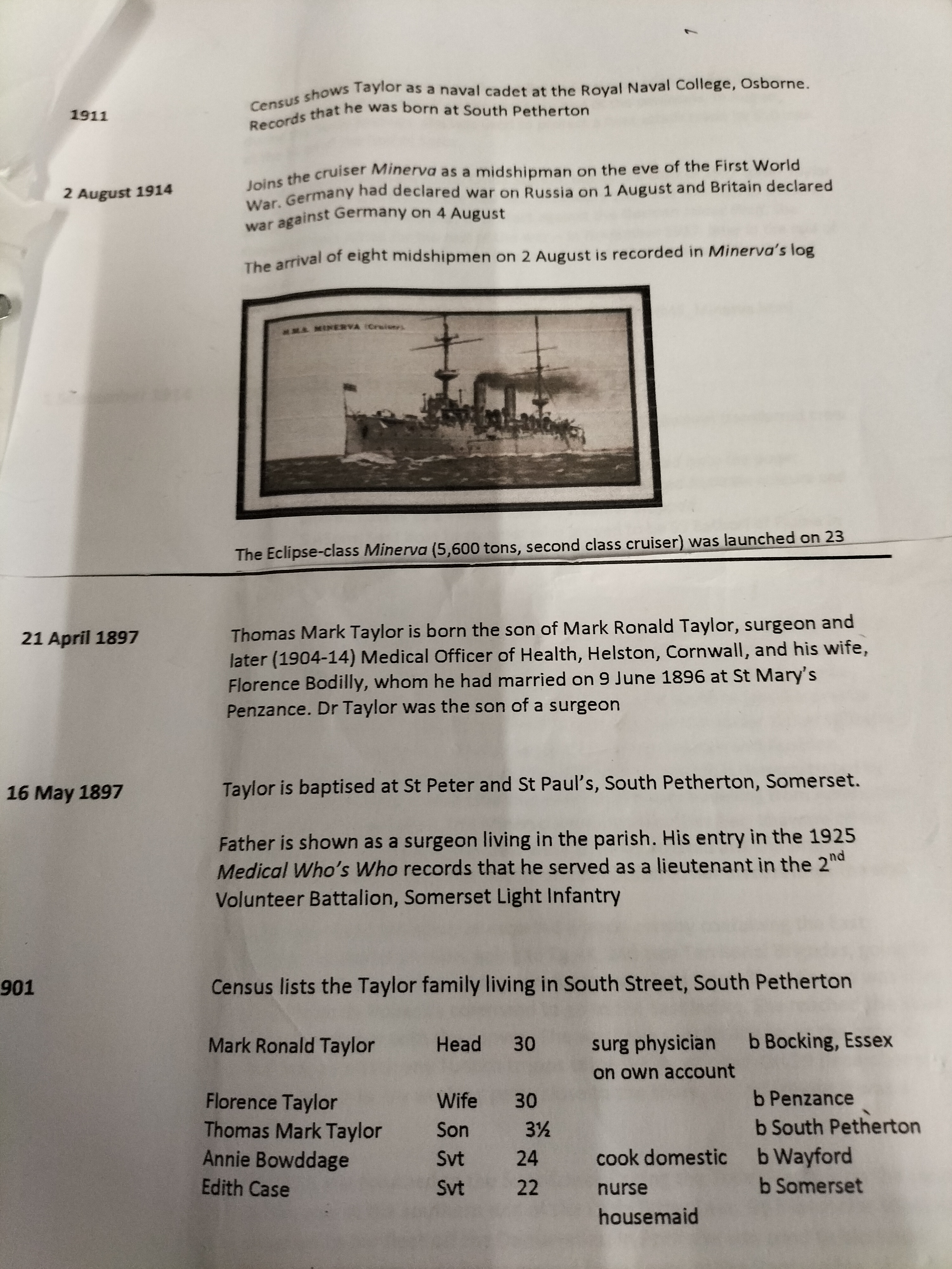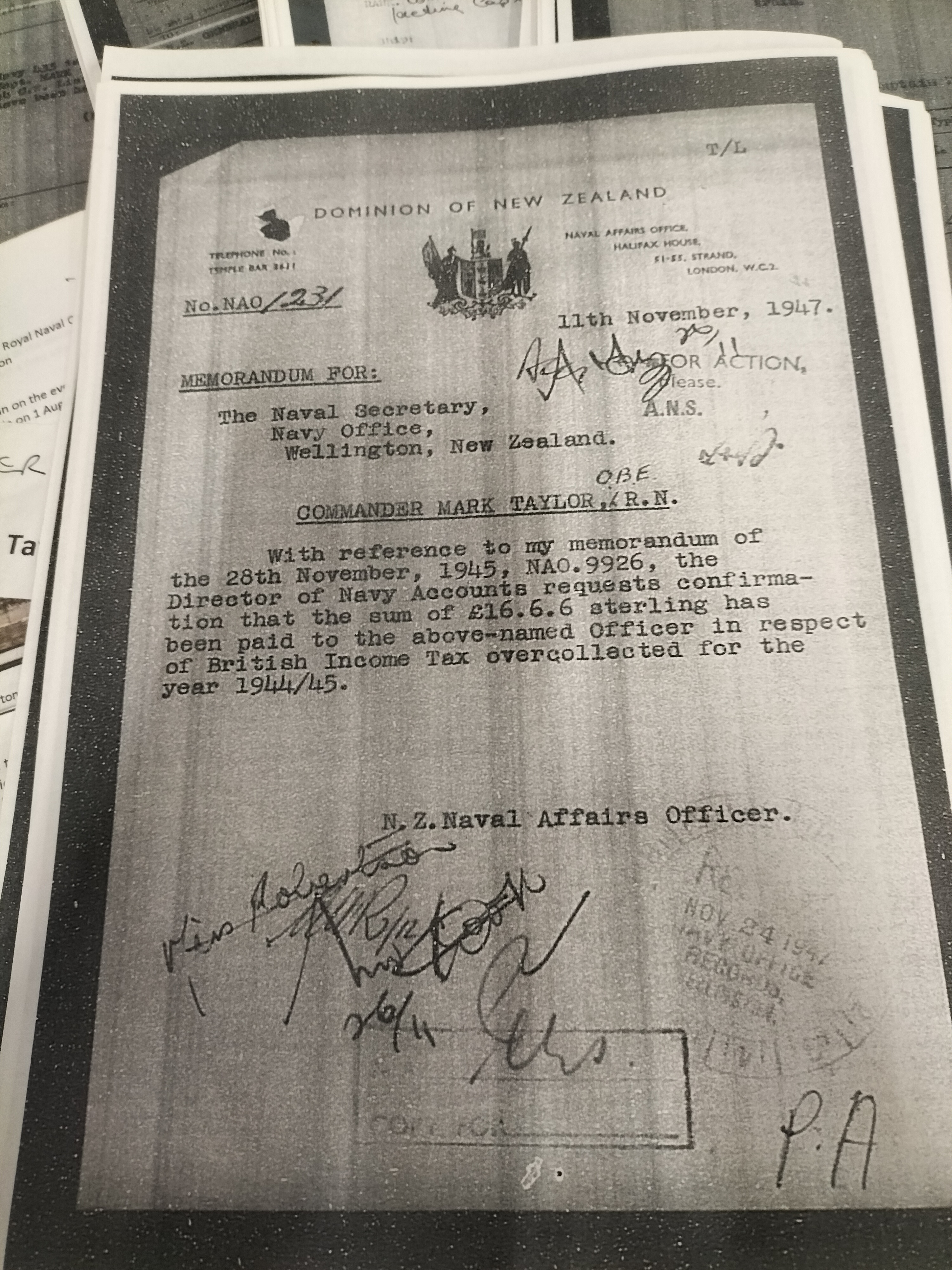 Taylor’s service history is extensively documented within the included research folder. He entered the Royal Navy as a cadet in 1910 and served as a Midshipman aboard the Eclipse-class cruiser HMS Minerva at the outbreak of the Great War. Notably, the archive identifies Taylor as a submariner, a specialist area of high interest to collectors. During the Second World War, Taylor transferred to the Royal New Zealand Navy, serving at HMNZS Cook and attaining the rank of Acting Captain by the end of the conflict. The archive contains modern photocopies of original naval memorandums,
