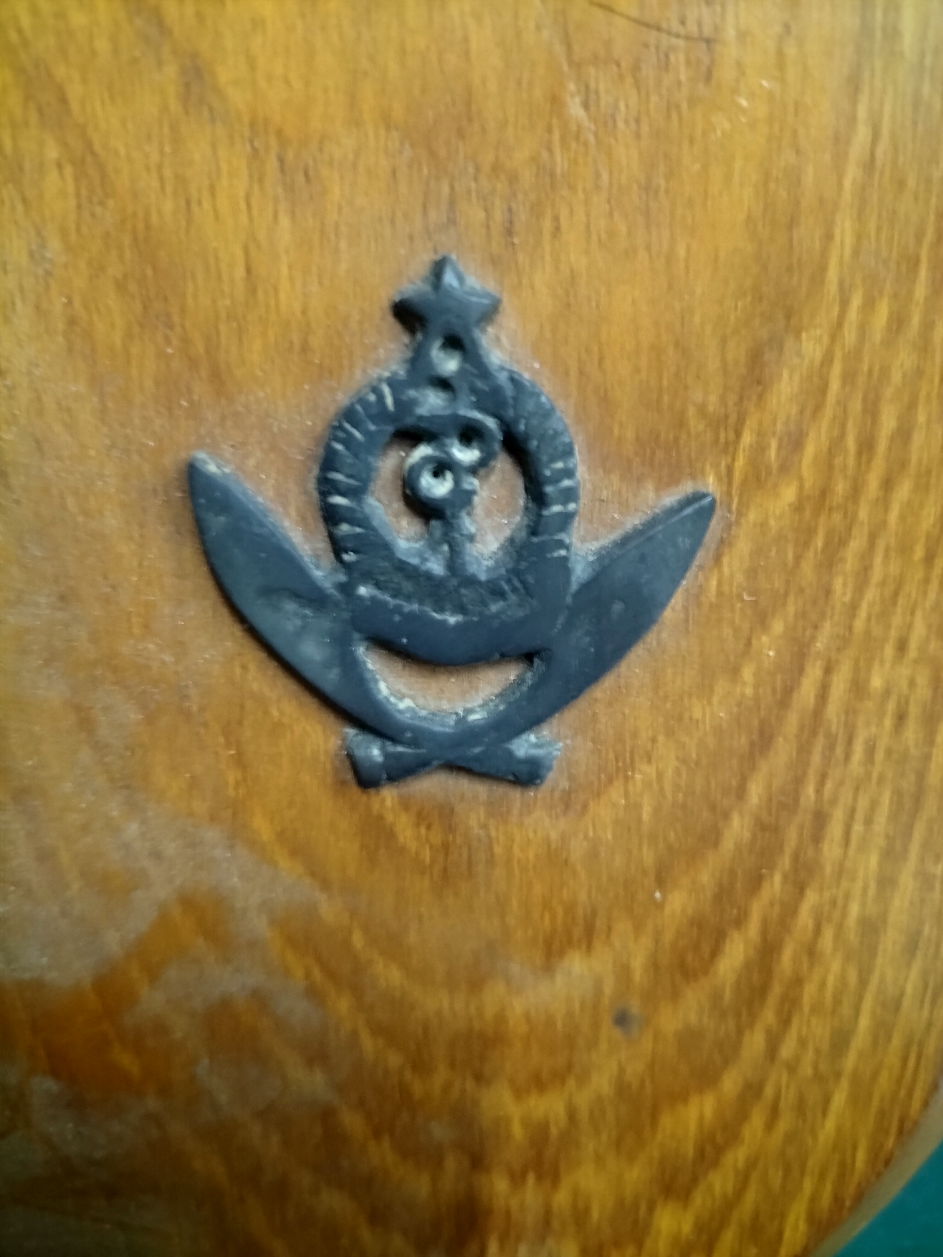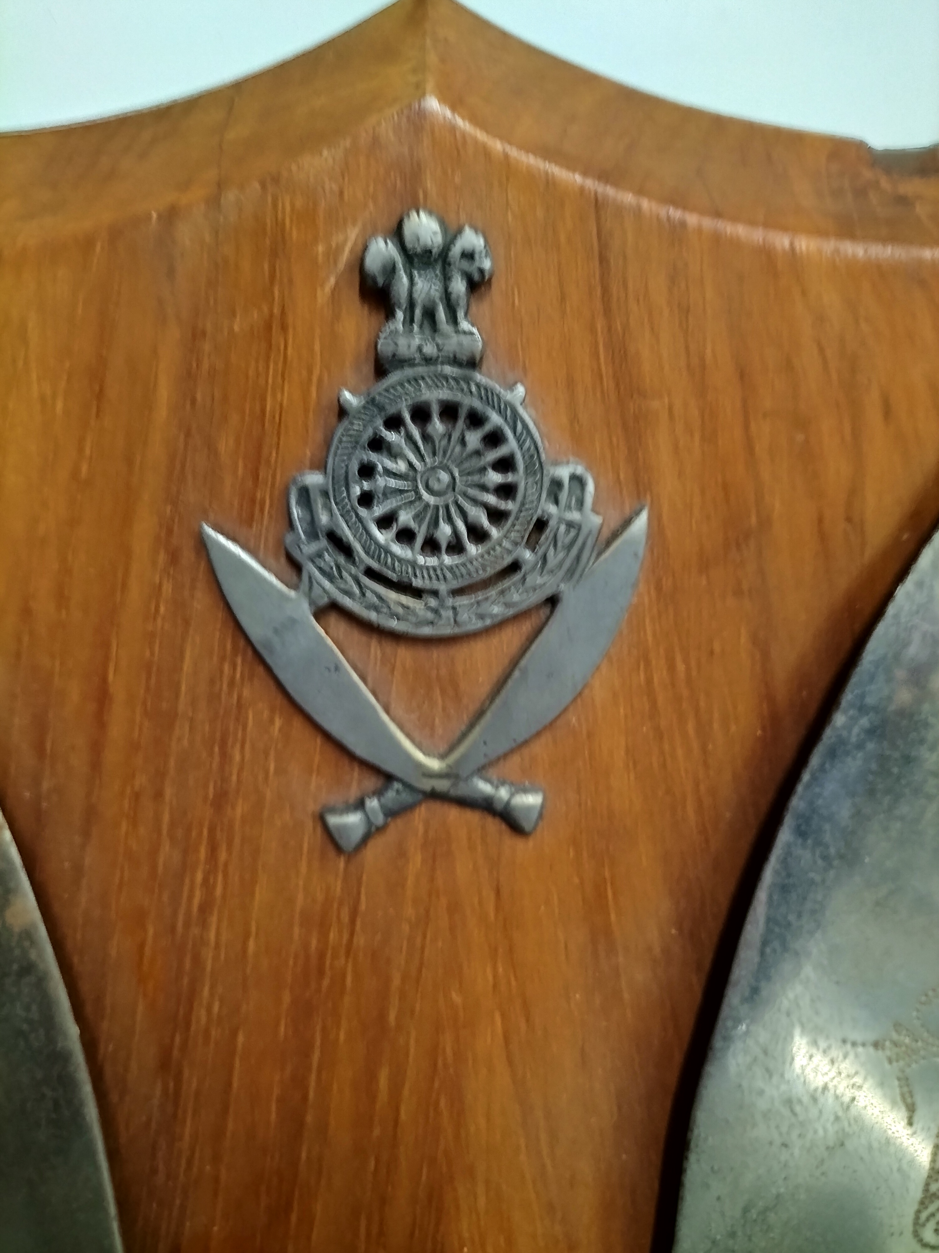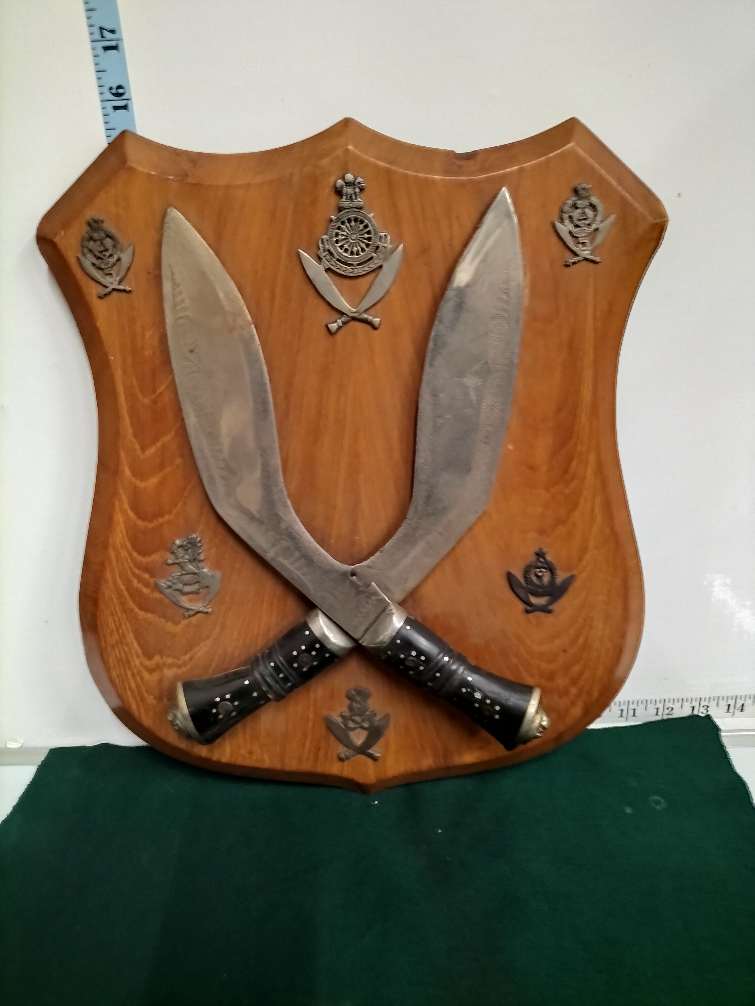 A commemorative presentation plaque featuring a crossed pair of fixed-blade kukri knives associated with the Indian Army Gorkha Regiment. The steel blades feature a traditional recurve profile with decorative etched scrollwork along the flats near the spine. The handles are constructed from a dark-toned carved horn or hardwood, embellished with decorative metal pin inlays, polished metal bolsters, and metal pommel caps. The knives are mounted on a shield-shaped wooden display board adorned with five metal regimental insignias, including the prominent top-centre Lion Capital of Ashoka over crossed kukris. No maker’s mark or tang stamp is visible. Blade length 11 inches.