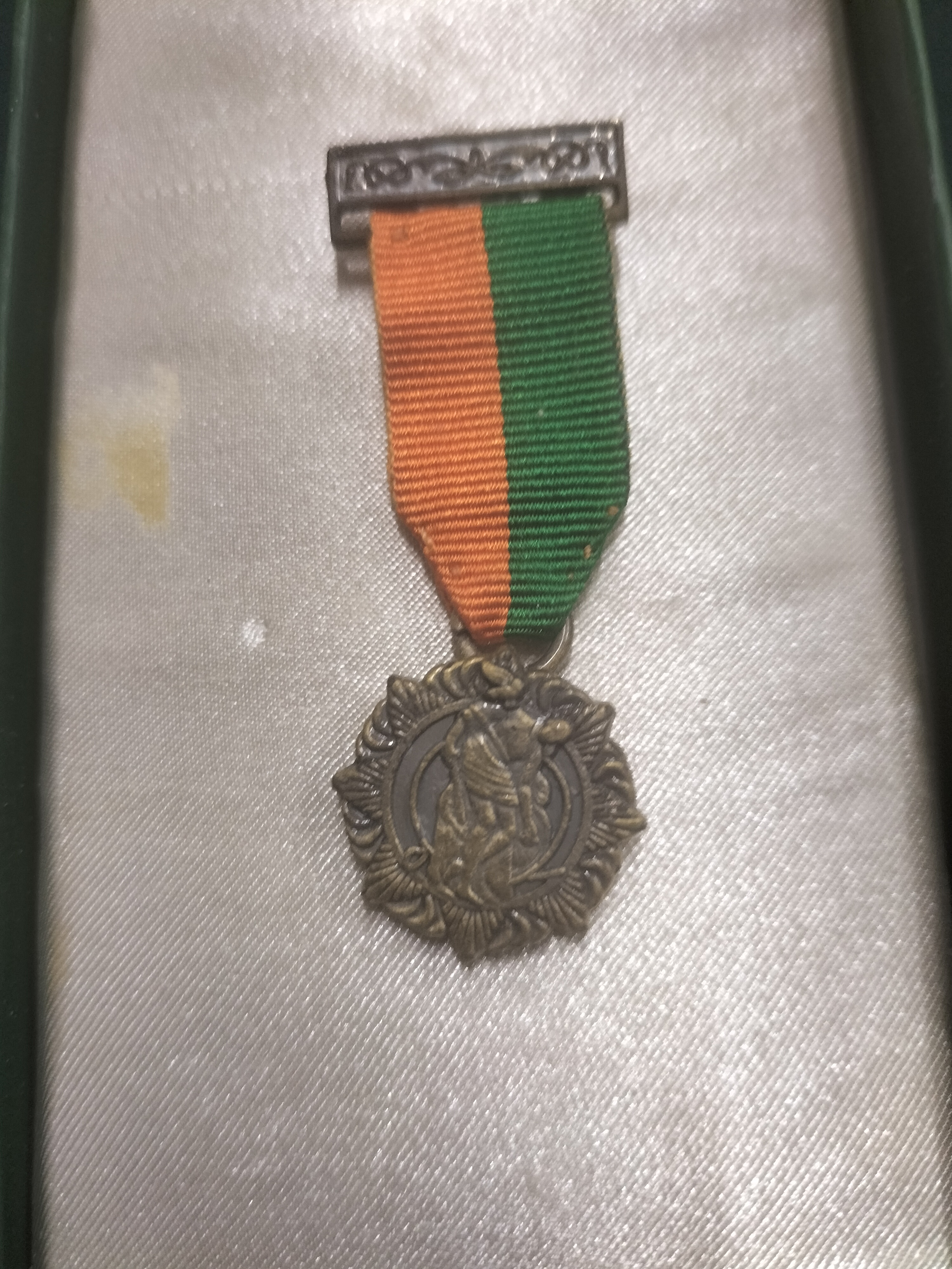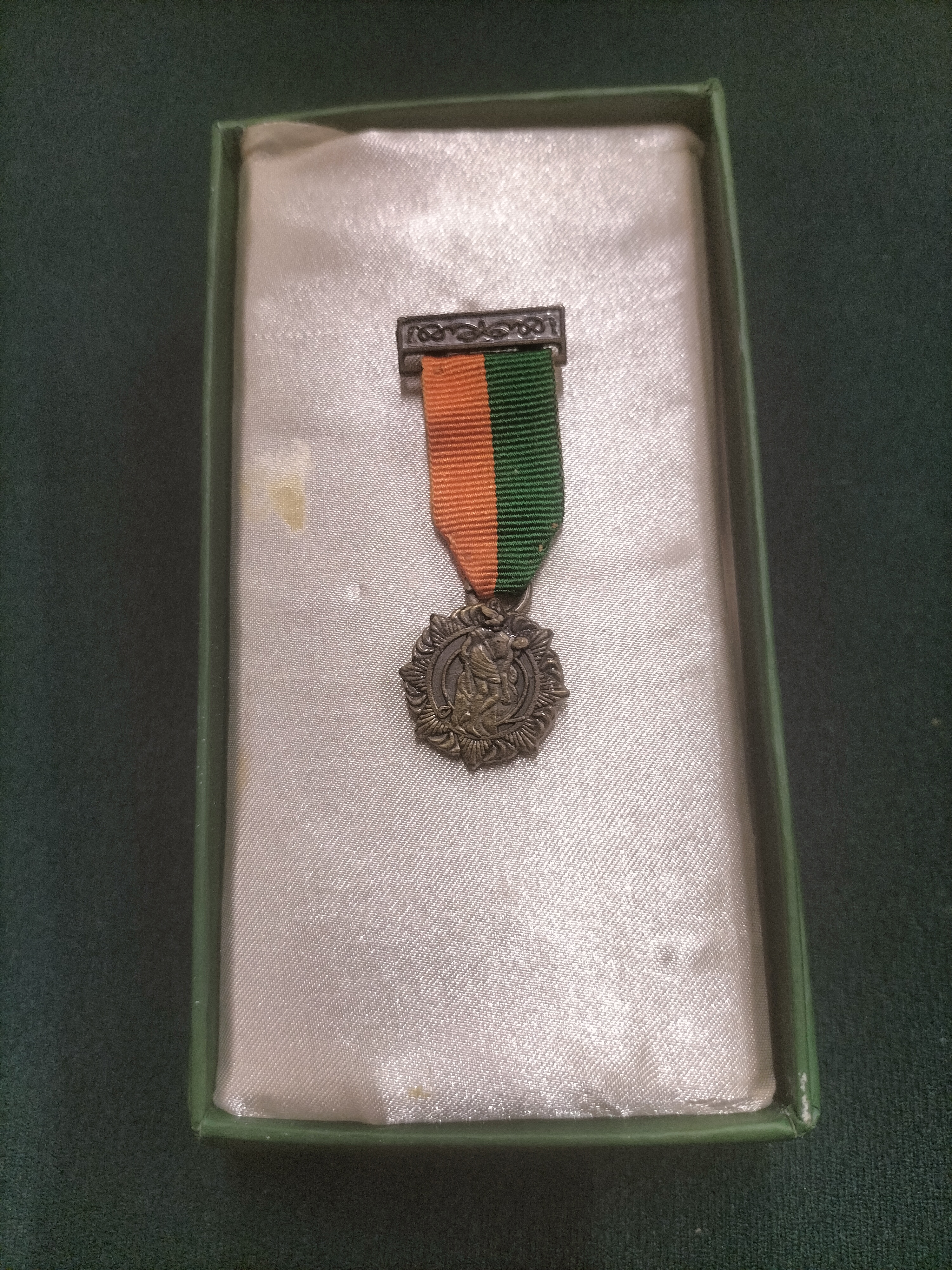 This item is a miniature version of the Irish Service Medal (1917-1921), frequently referred to as the Black and Tan Medal. Authorised in 1941, it was awarded to veterans of the Irish Republican Army, Cumann na mBan, and the Irish Citizen Army for their roles in the struggle for independence. The obverse features a central medallion showing an Irish Volunteer in profile, wearing a slouch hat and trench coat while holding a rifle, surrounded by a sunburst design. The medal is suspended from a bi-colour green and orange ribbon and a bronze-toned bar decorated with Celtic knotwork. This miniature is unnamed, which is standard for this class of award. It provides a historical link to the foundation of the Irish State and the veterans who served during the 1917-1921 conflict.