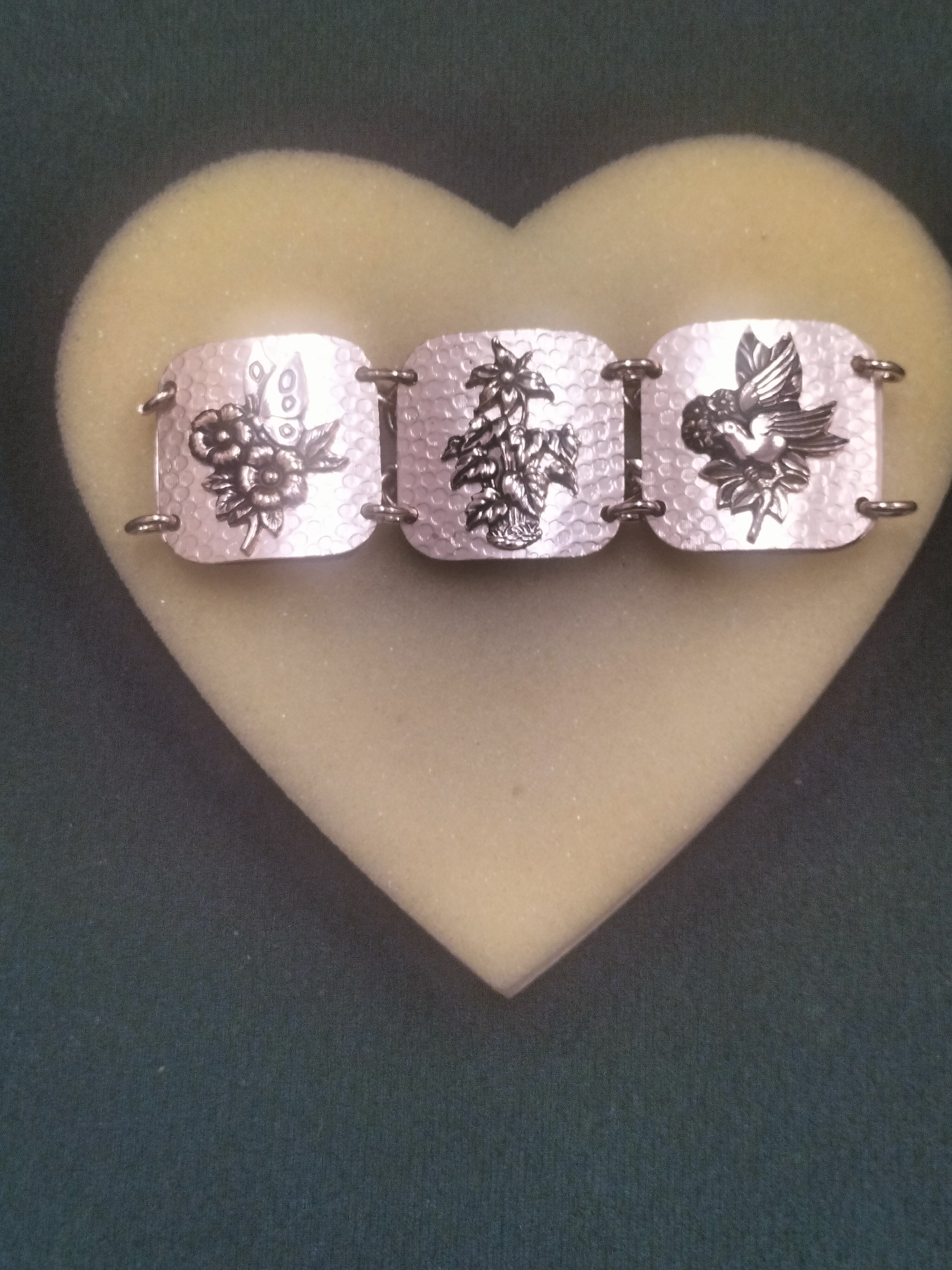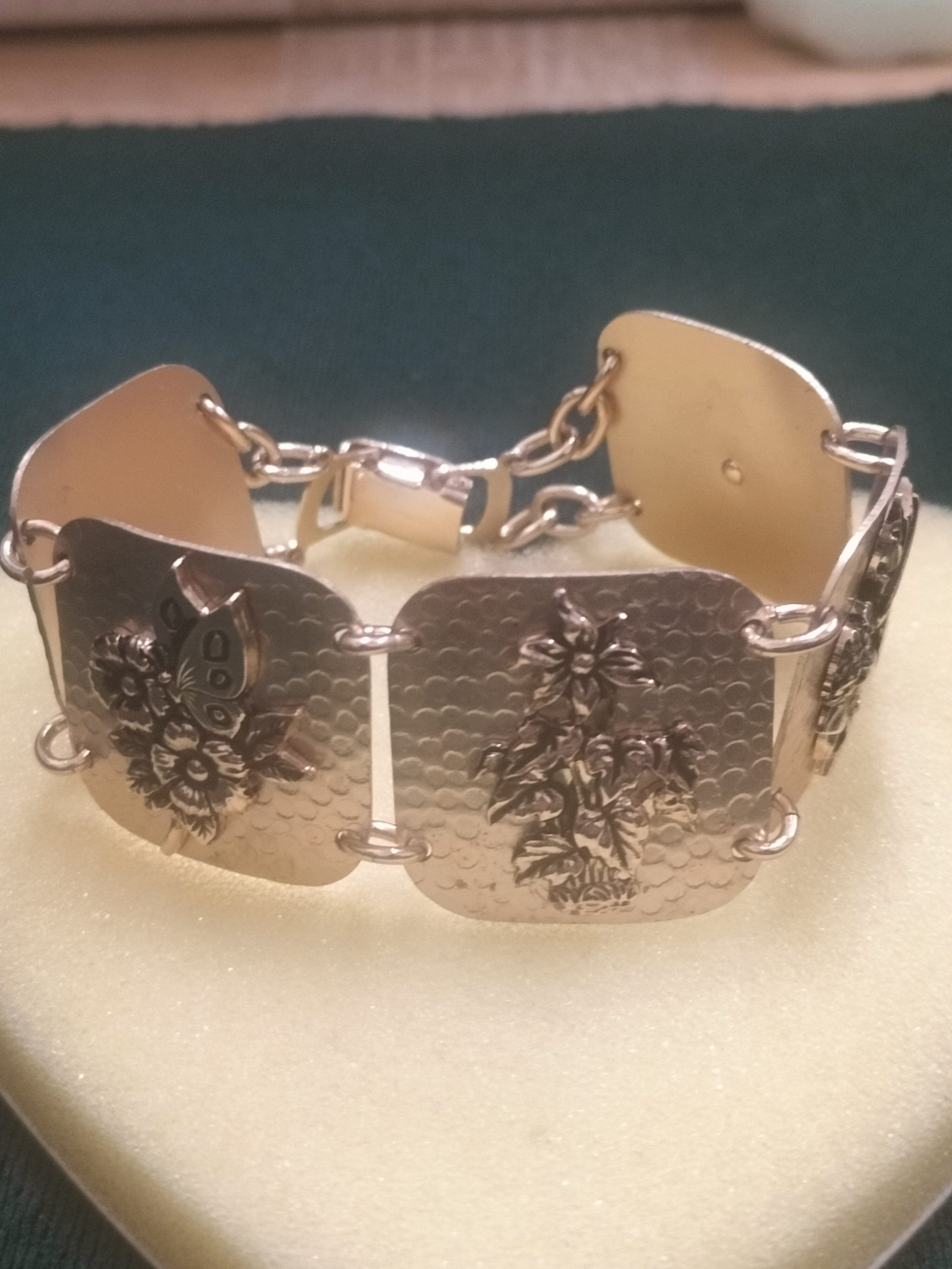 A vintage yellow-metal panel bracelet comprising multiple rectangular links with rounded corners. Each panel features a hand-hammered or textured ground decorated with applied three-dimensional motifs, including a butterfly amongst flowers, a floral bouquet, and a bird in flight. The piece is constructed with double jump-ring connectors and is secured by a matching yellow-metal fold-over clasp with a short double-link safety chain. The style is characteristic of mid-20th-century artisanal metalwork, such as that produced by Wendell August Forge. The metal is unmarked and appears to be a gold-toned base metal or bronze. No hallmarks, purity stamps, or maker’s marks are visible. Weight and measurements are not available.