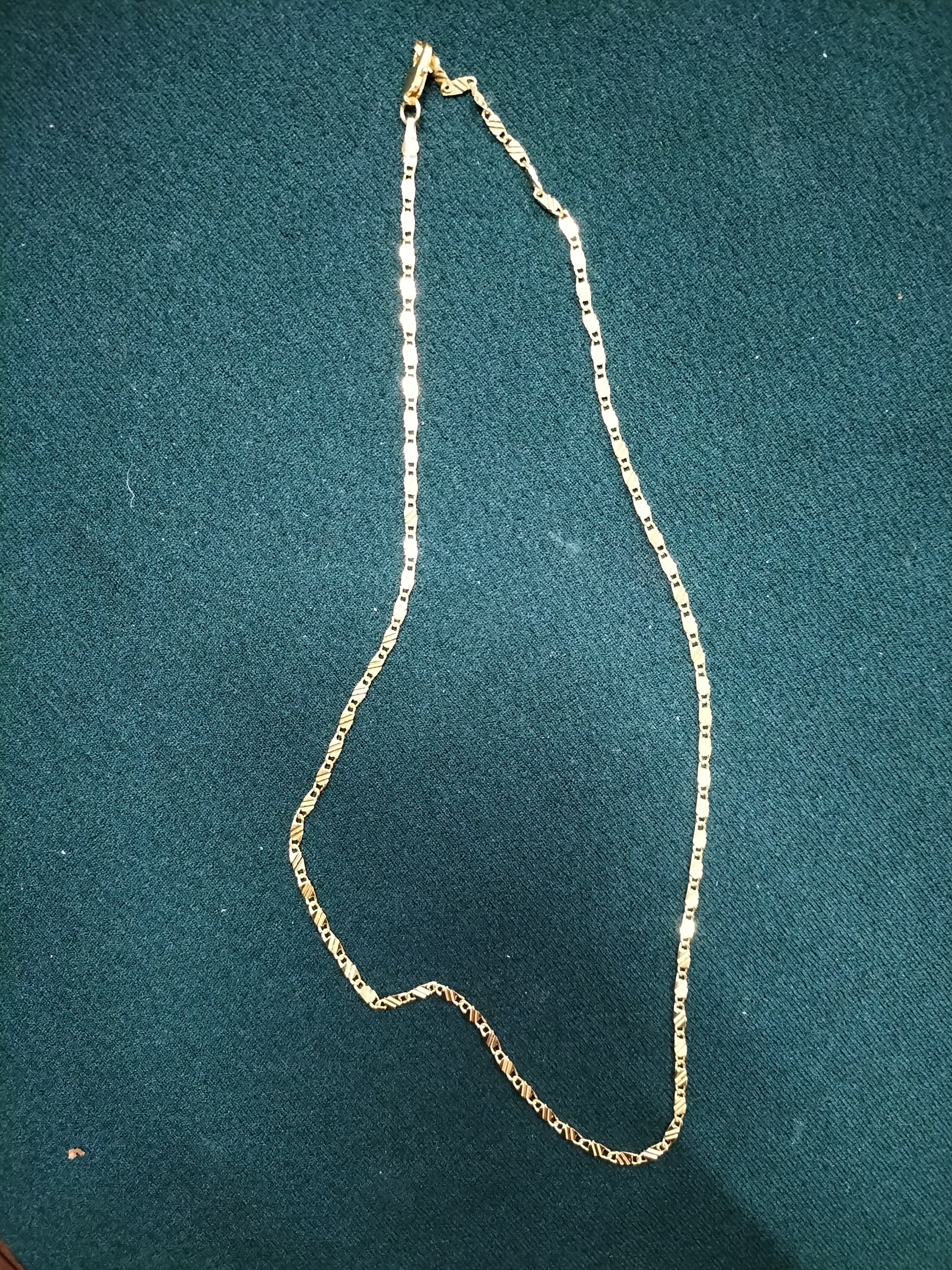 This yellow gold-toned jewellery item features a Valentino style flat-link chain, also known as a sparkle or criss-cross chain. The necklace is composed of flat, rectangular links with diagonal, textured facets designed to catch and reflect light from multiple angles. The piece is finished with a lobster claw clasp. No hallmarks or maker’s marks are visible on the clasp or connecting rings. The uniform colour and lustre are consistent with gold, though professional testing is recommended to confirm the exact carat weight. Length: Approximately 45-50 cm (18-20 inches). Weight: Not provided.
