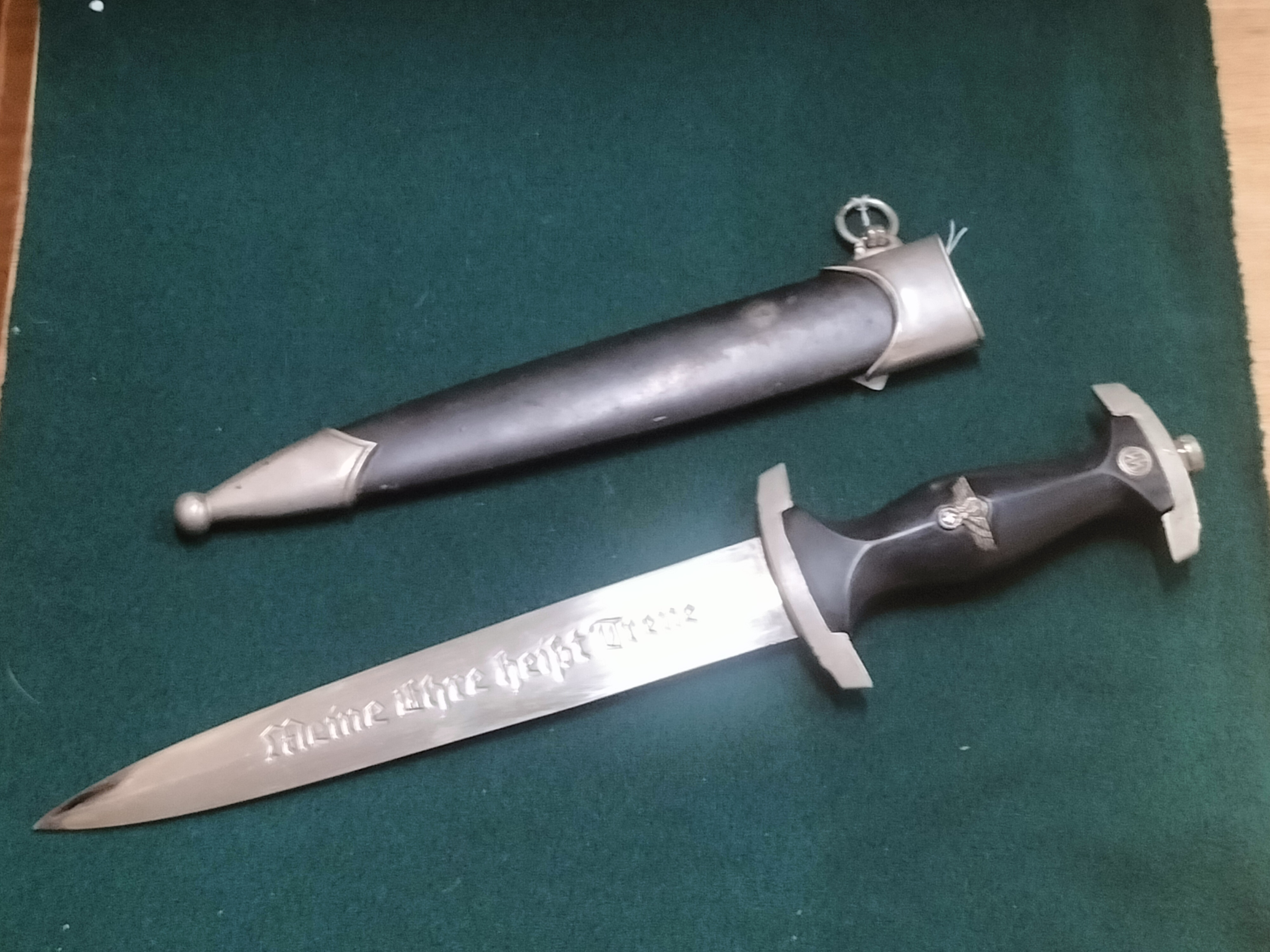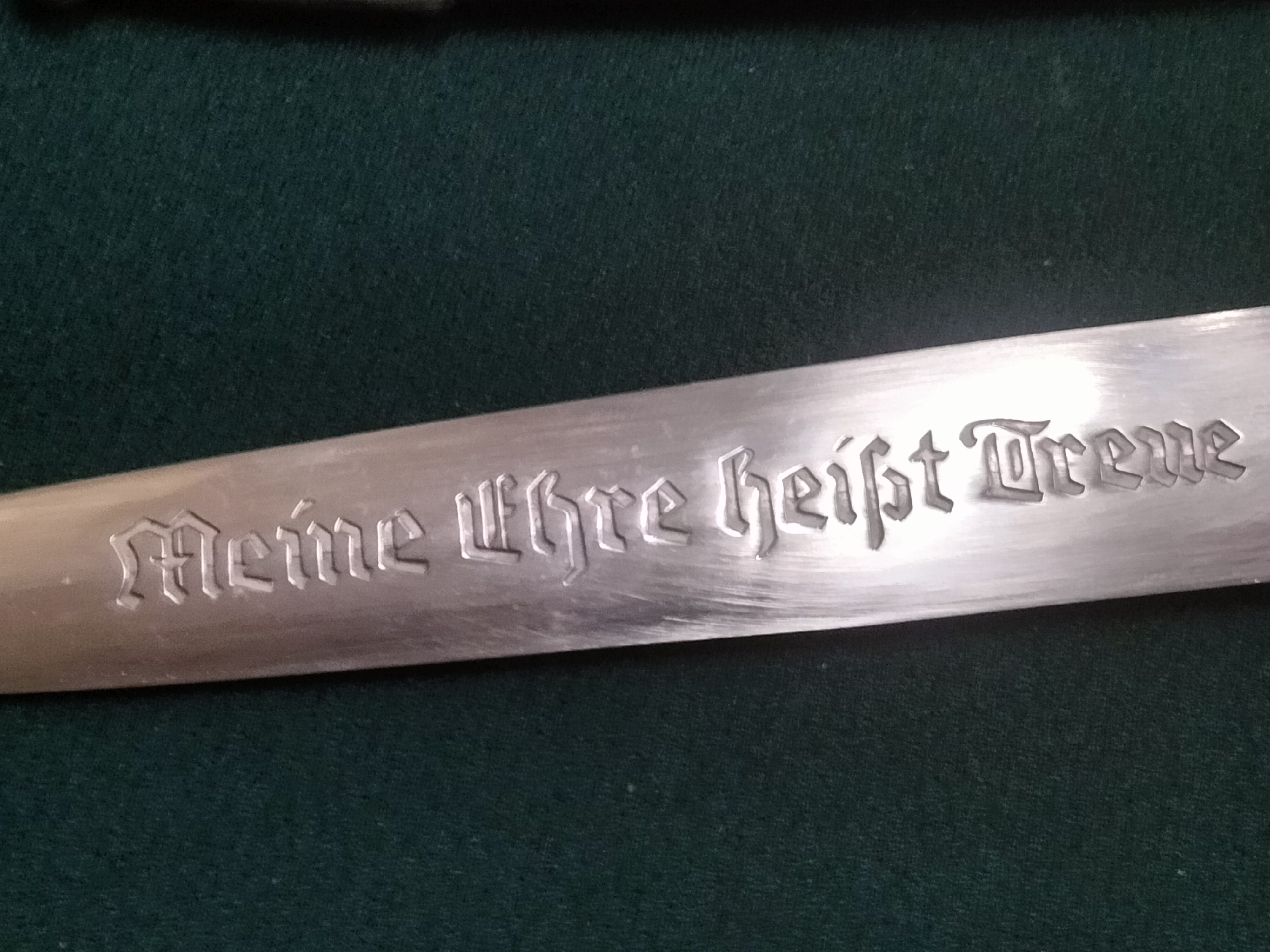This is a German Reproduction SS (Schutzstaffel) Model 1933 service dagger, a military-issue edged weapon from the WWII era, produced circa the mid-to-late 1930s or early 1940s. The item features a double-edged polished steel blade. The obverse is deeply etched with the SS motto, Meine Ehre heißt Treue, in traditional Fraktur script. The reverse ricasso displays the RZM circle logo over the manufacturer code M7/14, identifying the maker as P.D. Lüneschloss of Solingen. The hilt is constructed with a contoured black hardwood grip inset with a silvered aluminium eagle and swastika at the centre and a circular enameled SS Sig-rune emblem near the pommel. The crossguard and pommel nut are made of silver-plated zinc or nickel-silver. The steel scabbard has a factory black-painted finish with silver-plated or nickel-silver fittings, including a throat with a single suspension ring and a chape with a rounded ball end. Blade length: 22 cm.