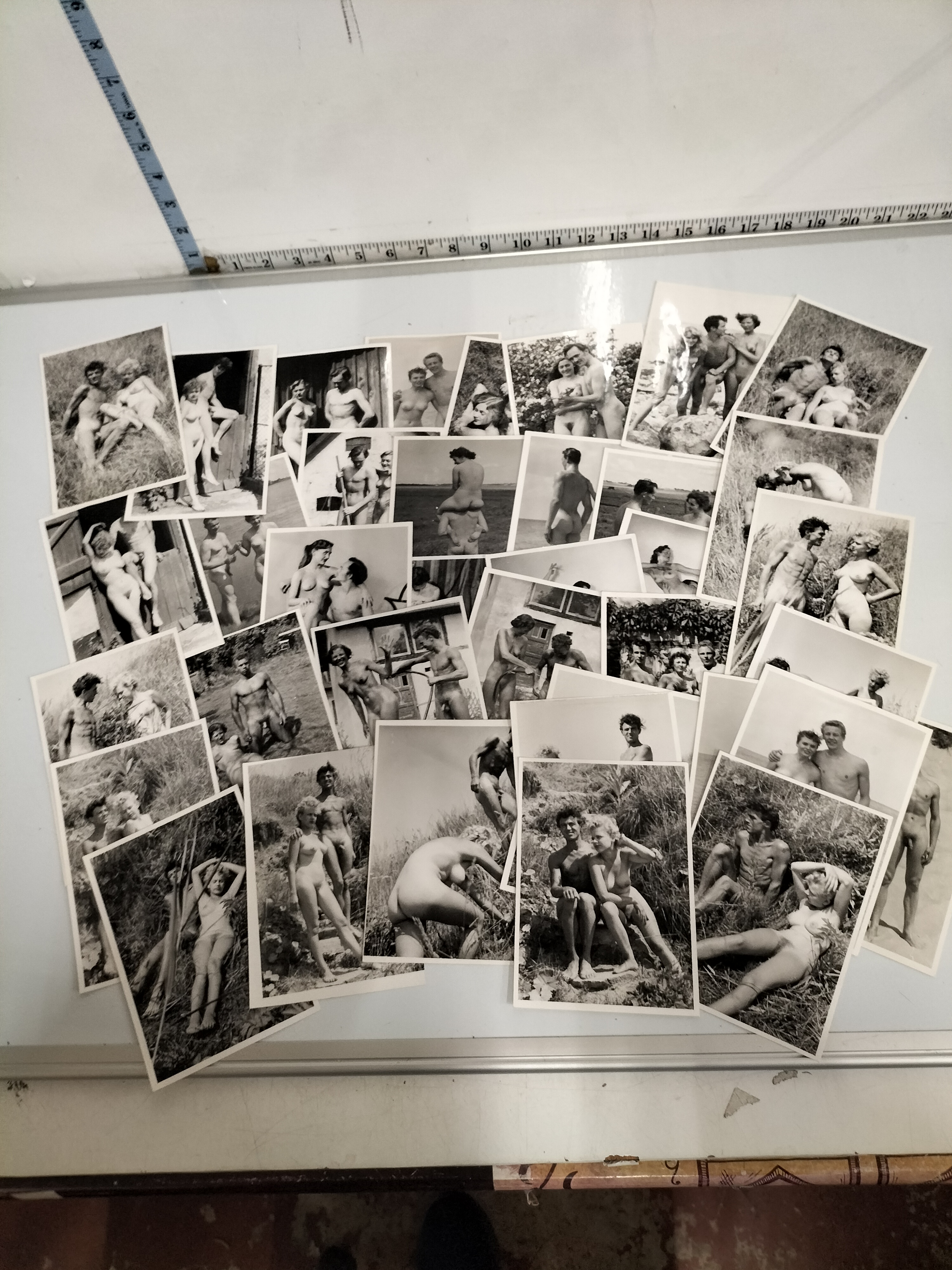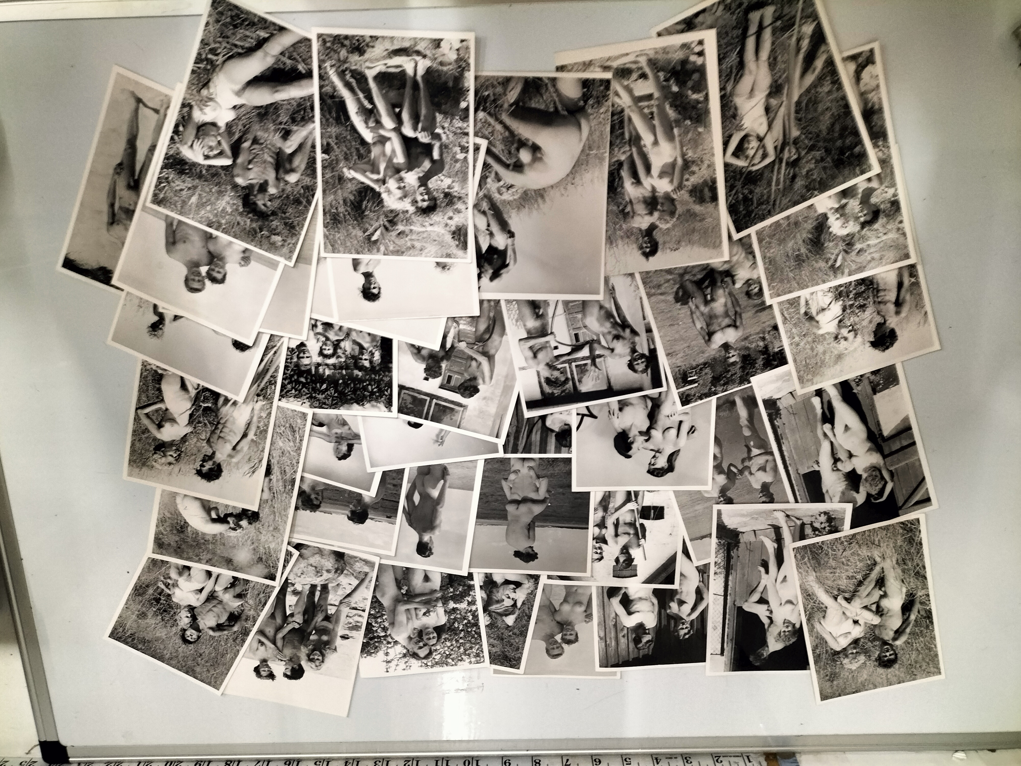 This lot comprises a significant collection of approximately 45 to 50 original black-and-white snapshot photographs dating from the 1930s to the 1950s. These silver gelatin prints on paper represent a compelling archive of mid-century social history, specifically documenting the naturist or sun-worshipper movements of the era. The images feature various studies of the human form, depicting men and women both individually and in groups. Subjects are shown in naturalistic and rustic environments, including grassy fields, coastal regions, and simple wooden architectural structures, in various states of undress and full nudity. The photography is characterised by a candid, unpretentious aesthetic, reflecting private photographic practices and social attitudes prior to the widespread availability of mass-produced commercial erotica. The prints exhibit the tonal range and fine grain typical of mid-century darkroom processing. Each photograph measures approximately 3.5 by 4.5 inches, which was a standard snapshot size for the period. No signatures, studio stamps, or edition markings are visible on the face of the prints.