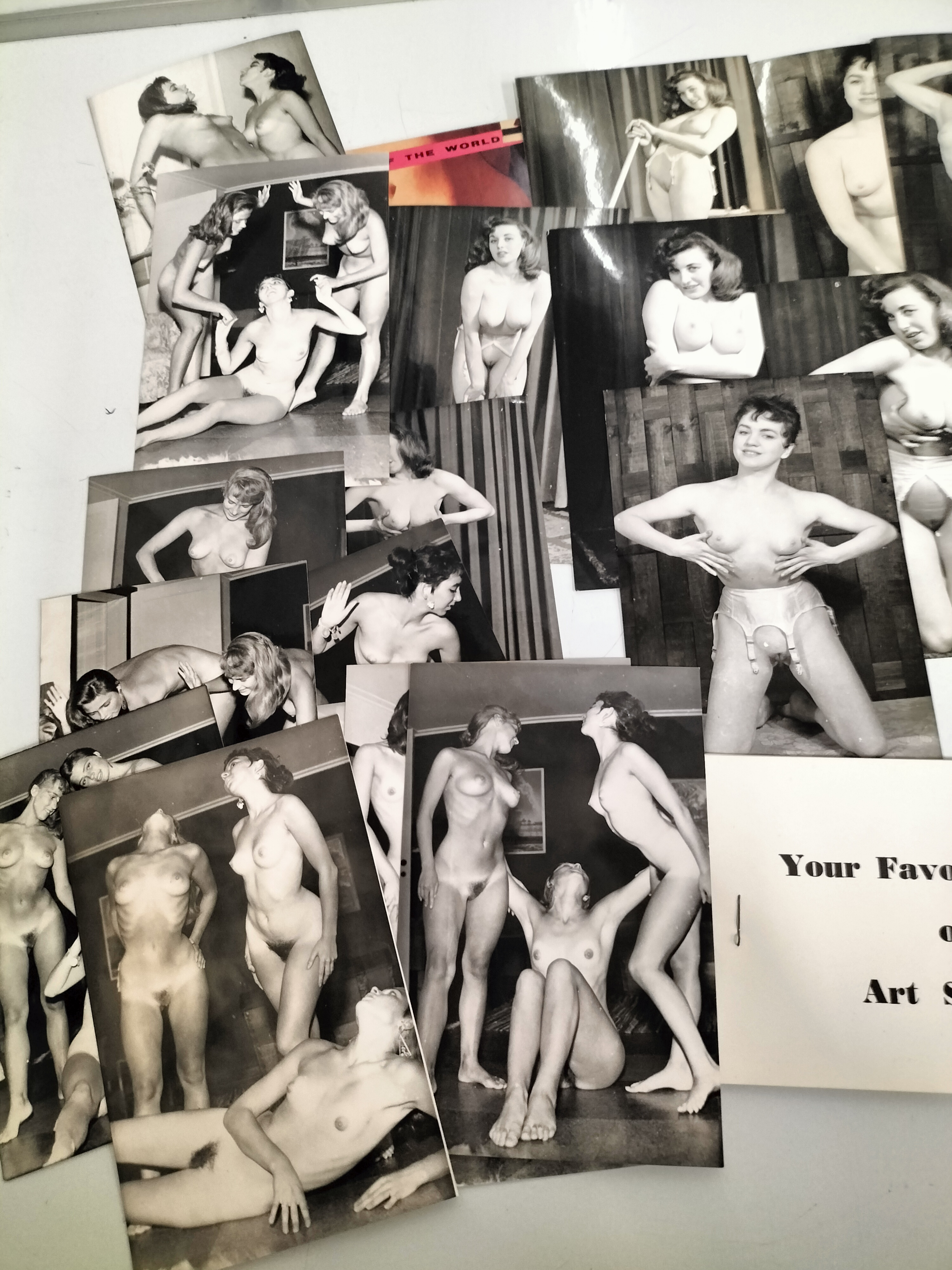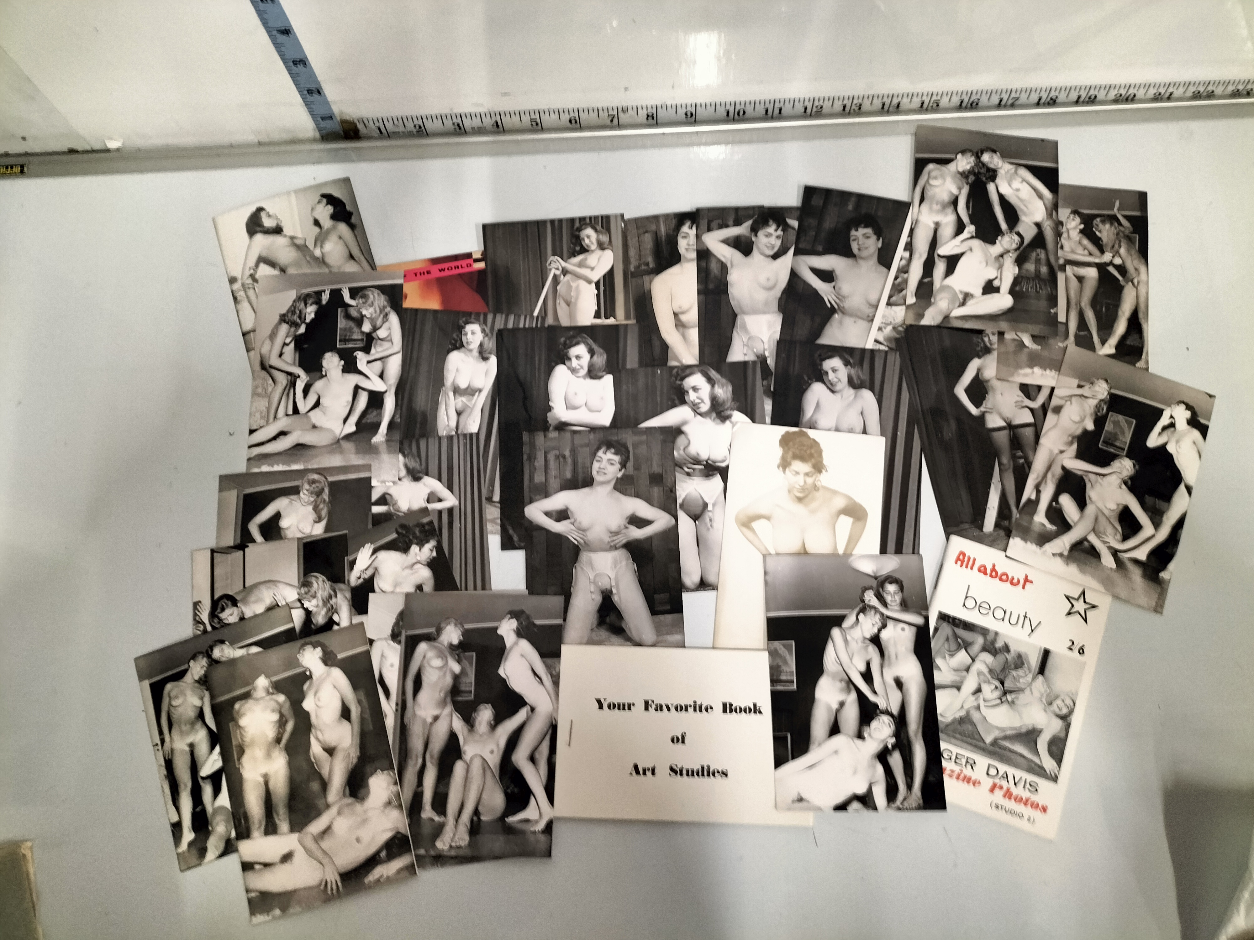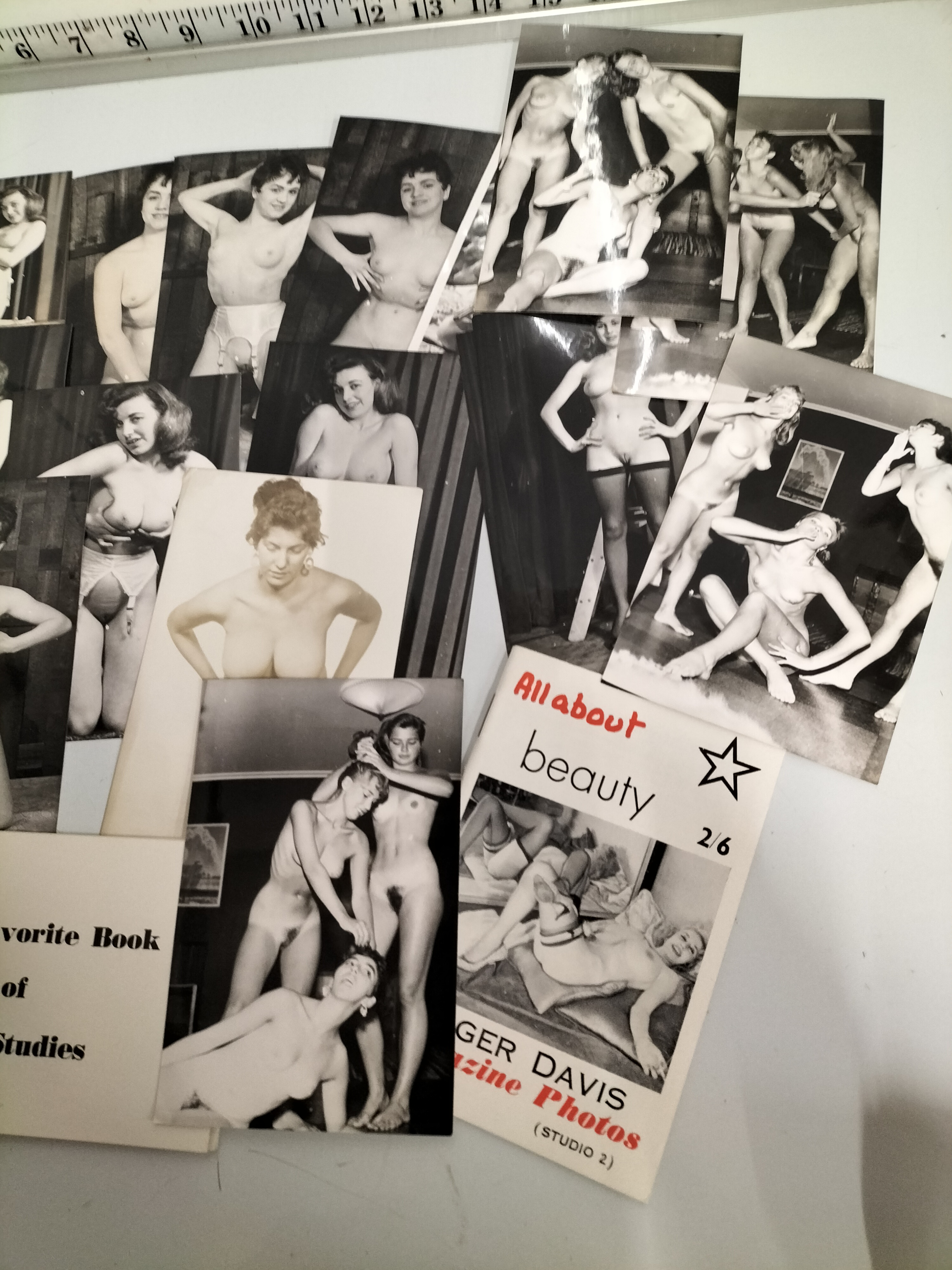 This lot comprises a comprehensive collection of approximately 20 vintage black-and-white photographic prints and two associated booklets, dating from the late 1940s to the early 1960s. The photographs are silver gelatin prints on semi-gloss paper, a standard format for mass-produced erotic sets of the mid-20th century. The subject matter features female models in solo and group compositions, depicted in various stages of undress, including full nudity and period lingerie such as garter belts and stockings. The aesthetic is characteristic of the art study or glamour genre common in the United Kingdom and United States during this era. One booklet, titled All About Beauty, is identified as a product of Roger Davis / Magazine Photos (Studio 2) and bears a British price marking of 2/6. A second booklet is titled Your Favorite Book of Art Studies. These items represent a significant era of erotic ephemera, often sold through mail-order catalogues or specialised bookstores prior to the broader liberalisation of adult media. Individual photographs measure approximately 4 x 5 inches and 4 x 6 inches.