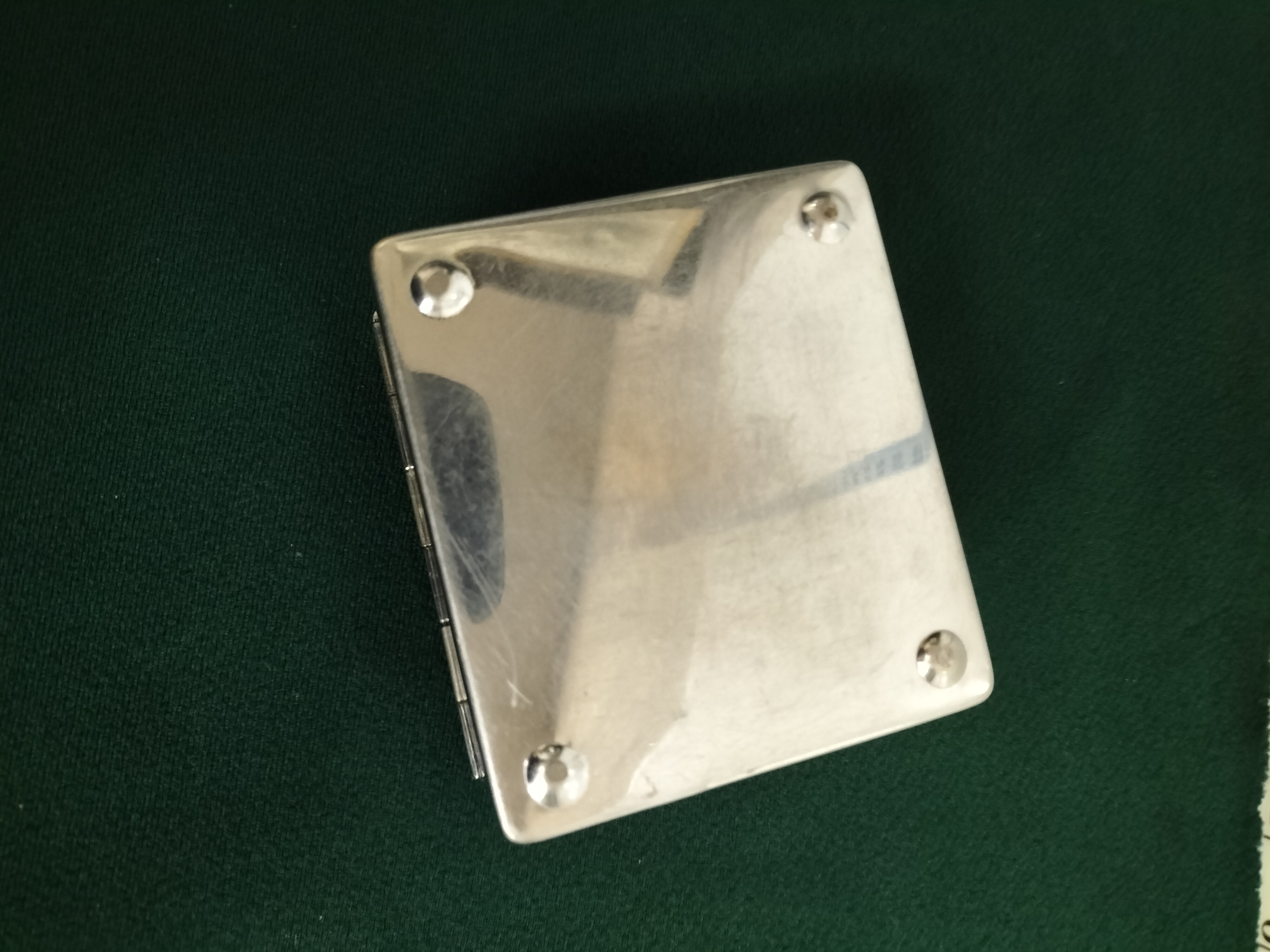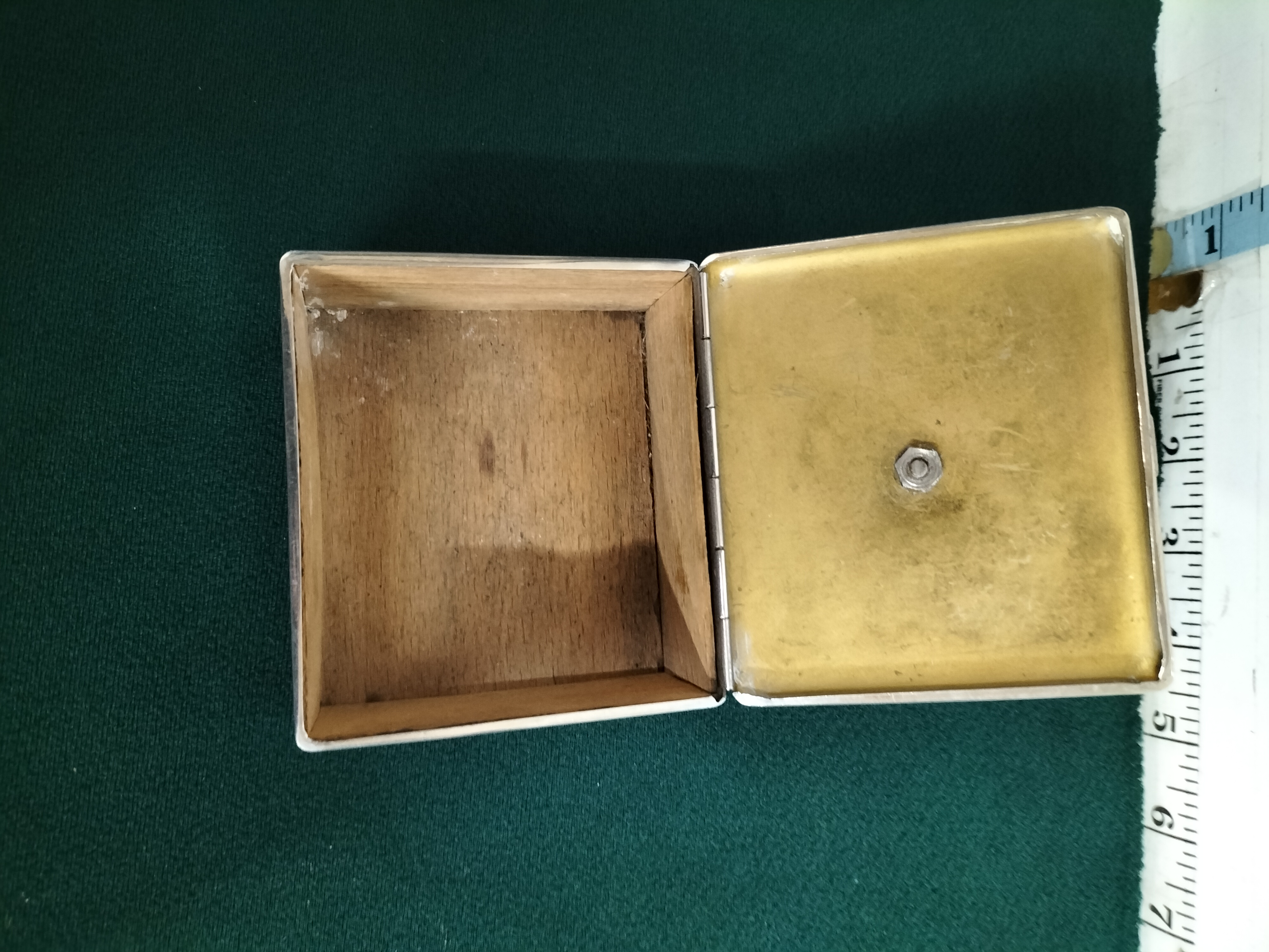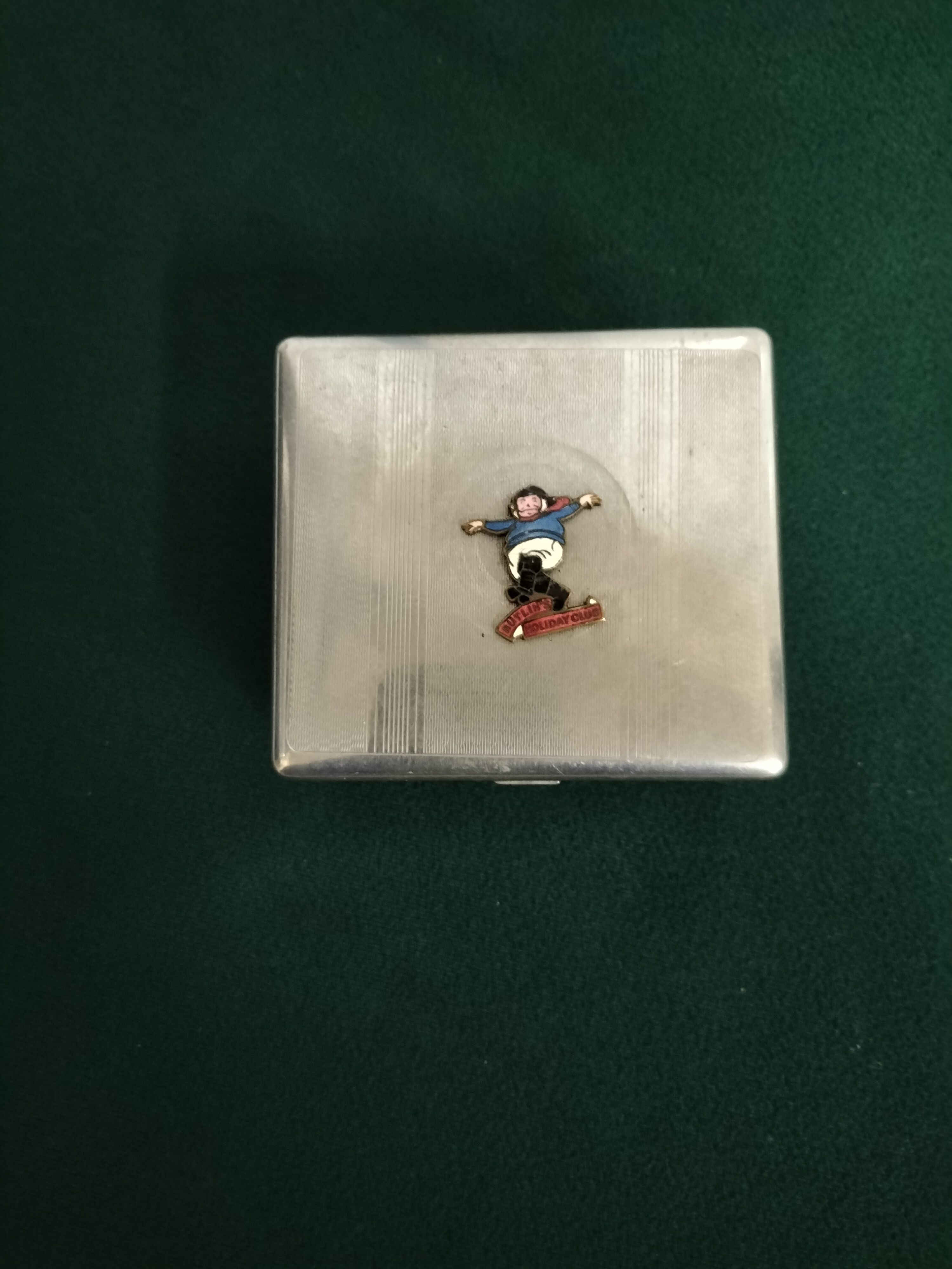 This original mid-20th century souvenir presentation box was produced for the Butlin’s Holiday Club. The square exterior is crafted from silver-toned metal, likely chrome or silver plate, featuring an elegant Art Deco-influenced engine-turned linear design across the lid. Centrally mounted is a vibrant enamel emblem depicting the iconic jolly holidaymaker mascot standing above a red banner with the text BUTLIN’S HOLIDAY CLUB. The interior base is lined with cedar wood, suggesting its use as a cigarette or tobacco box, while the underside of the lid reveals a brass-toned metal finish and the original securing nut for the emblem. Dimensions: Approximately 3.5 inches square.