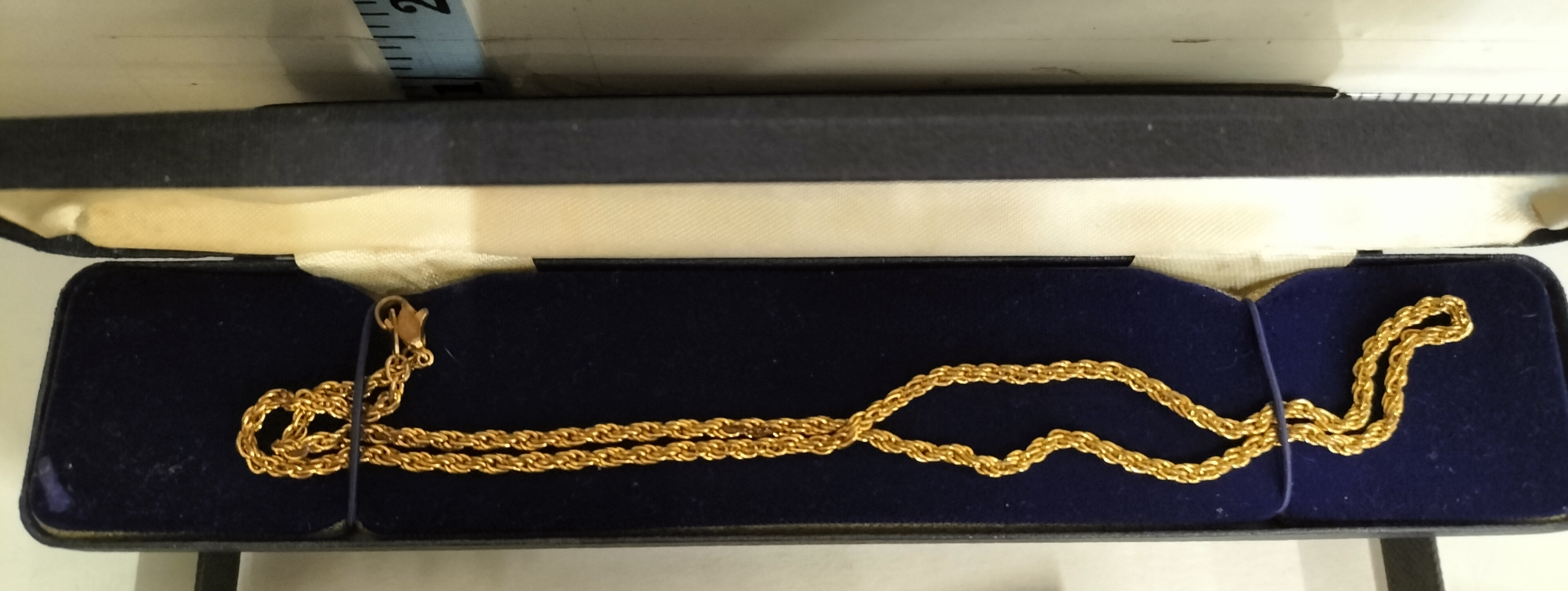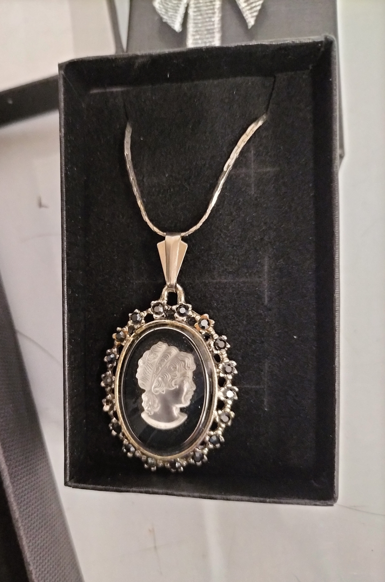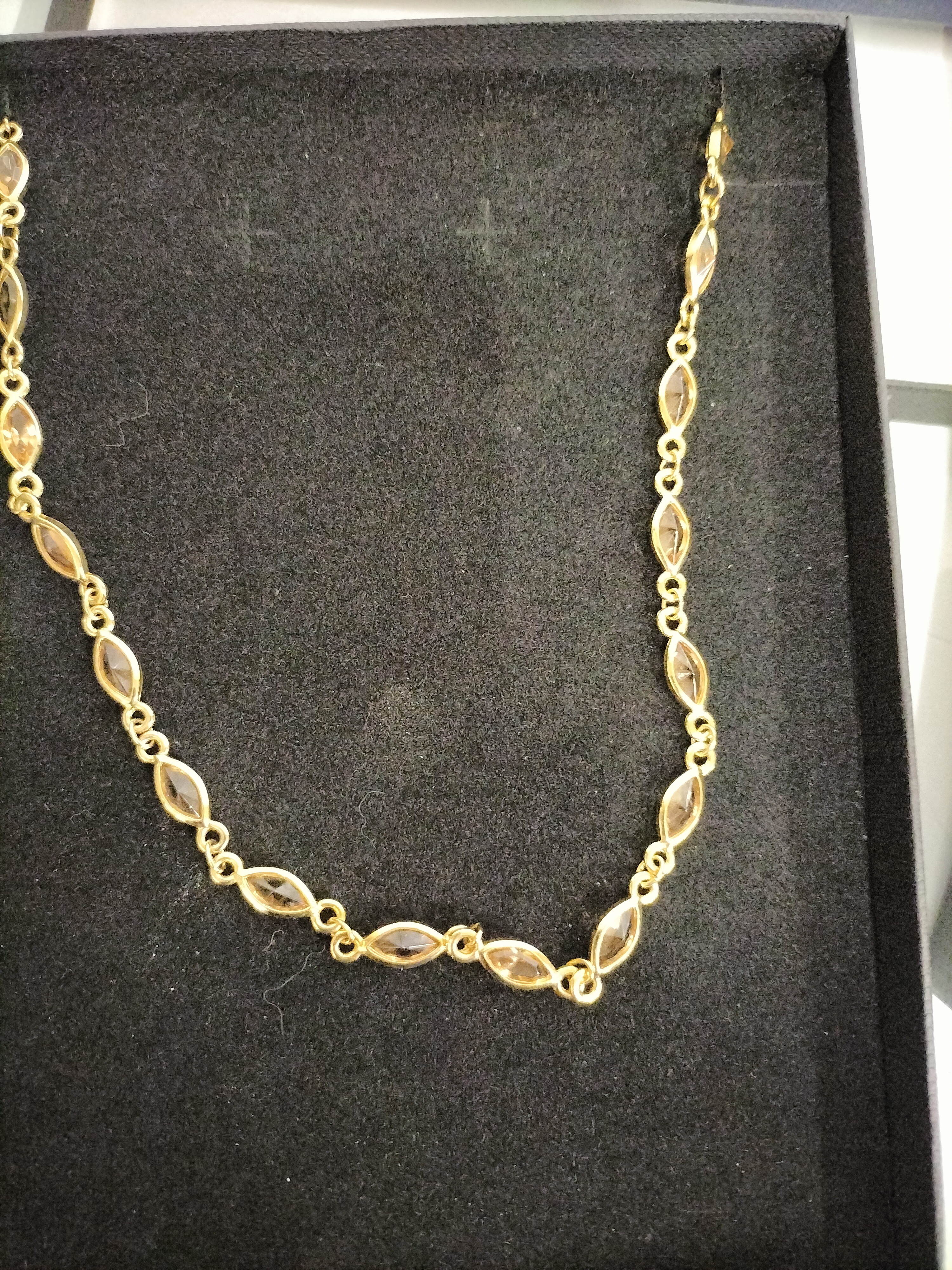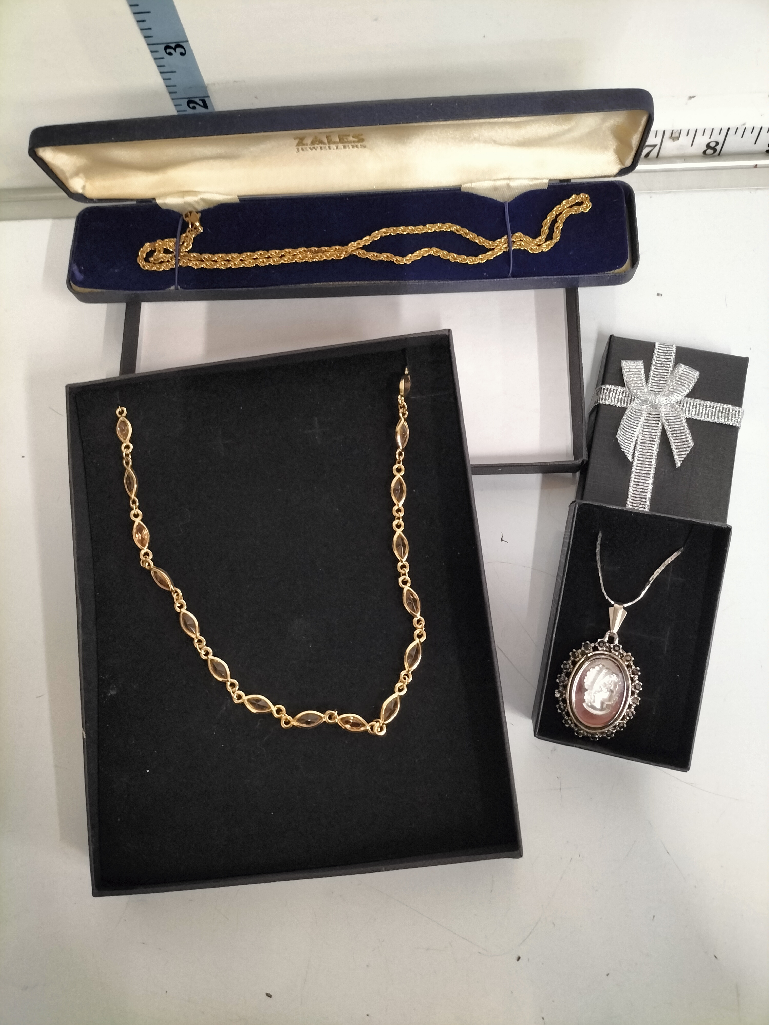 This collection comprises three individual necklaces of varying designs. The first is a yellow-toned metal rope-style chain presented in a Zales Jewellers gift box. The second is a yellow-toned metal necklace featuring a series of bezel-set, marquise-cut transparent stones in a light honey or amber colour, connected by small metal loops. The third piece consists of a silver-toned thin chain with an oval pendant featuring a white-on-black cameo-style bust, bordered by a decorative halo of small, prong-set dark round stones. The metals are unmarked and appear to be costume jewellery or plated base metal. No hallmarks, maker’s marks, or purity stamps are visible. Rope chain length approximately 46 cm. Cameo pendant approximately 3.5 cm in length.