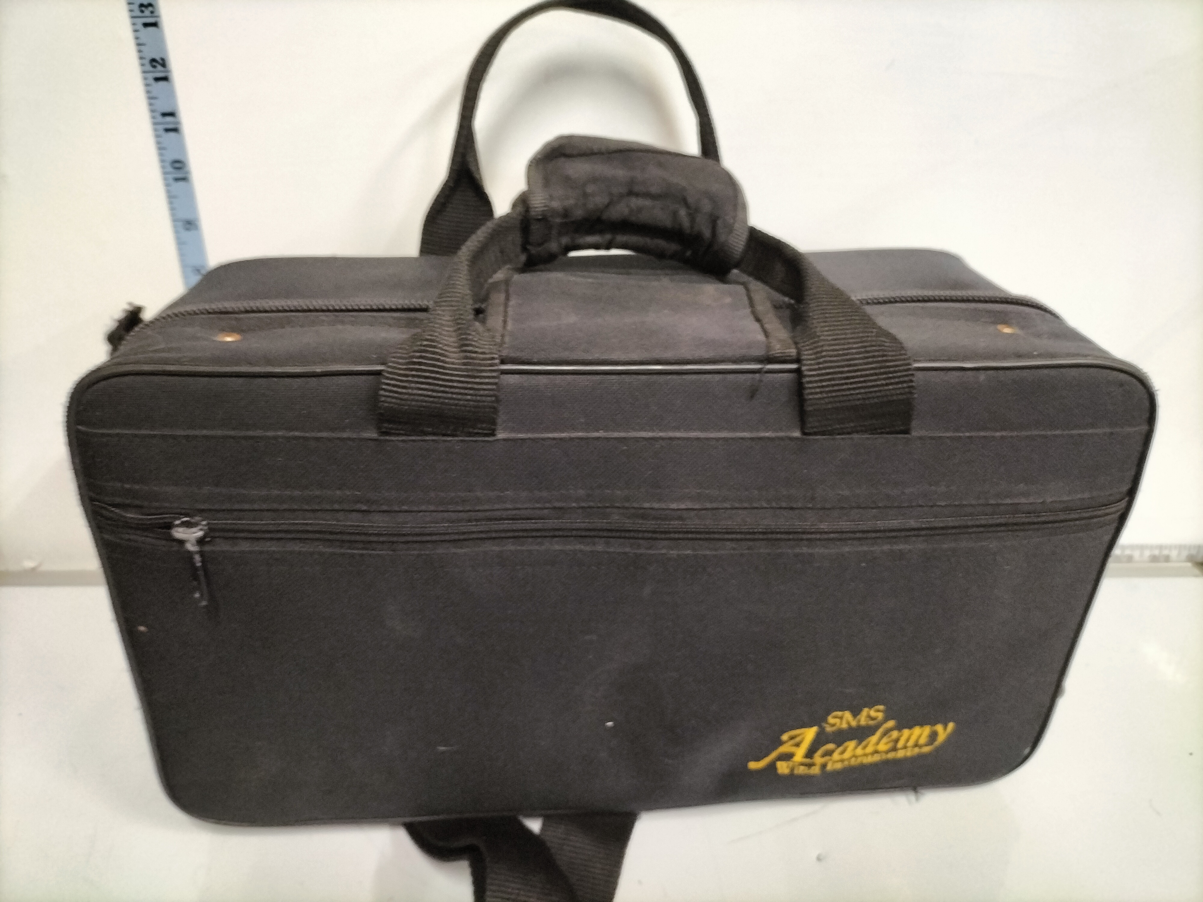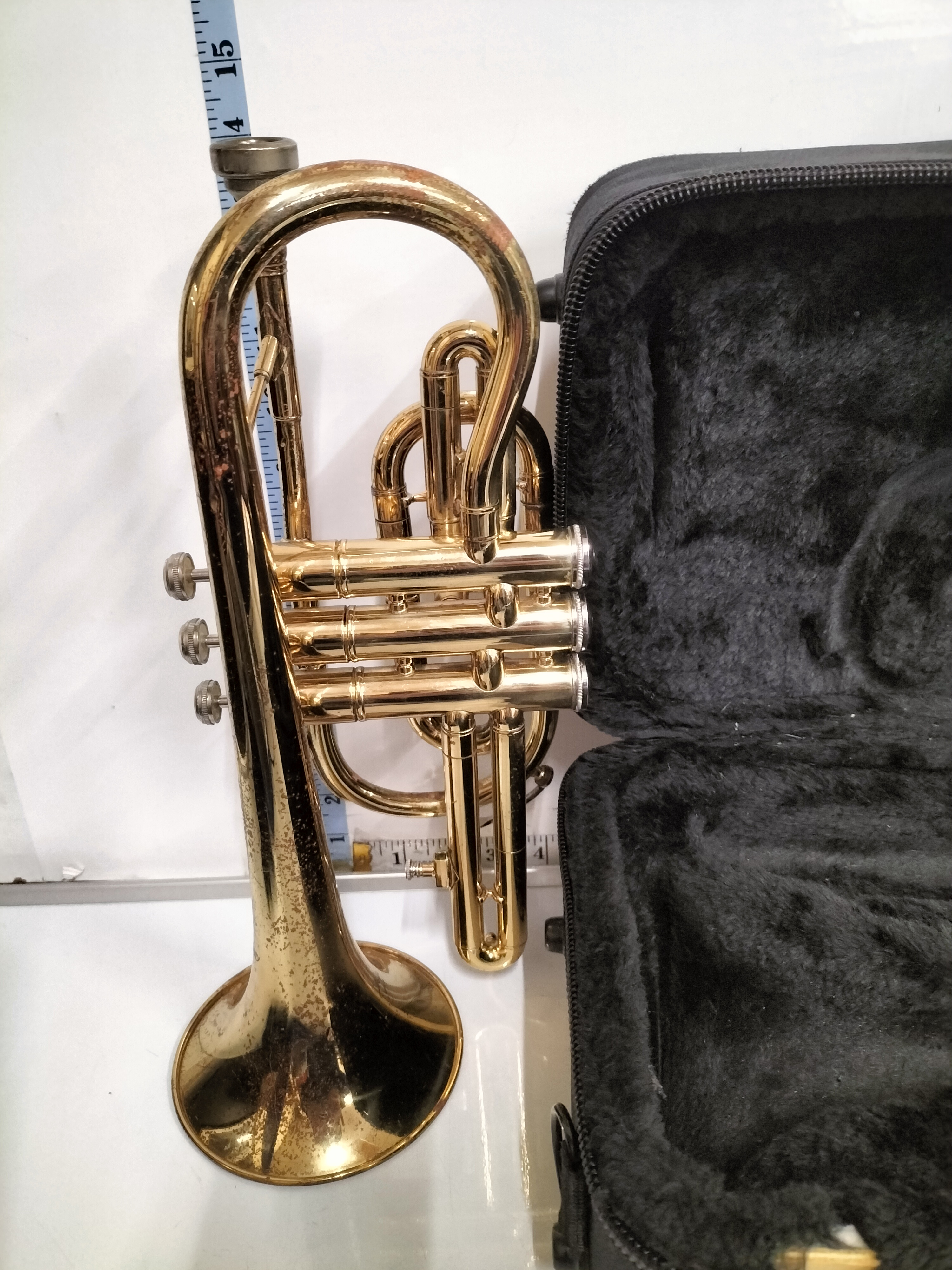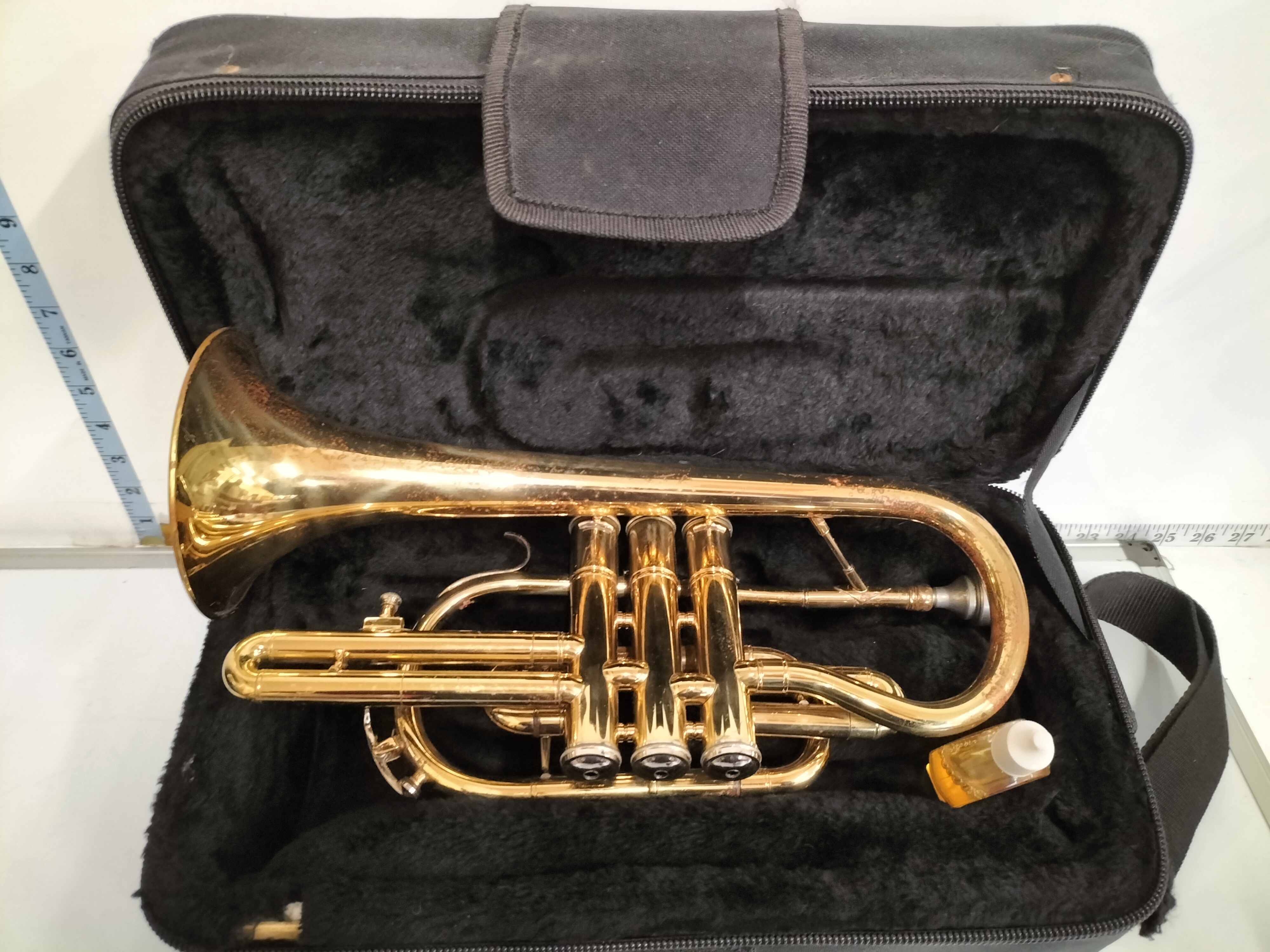 A student-level Bb cornet constructed from brass with a gold lacquer finish. The instrument features a traditional short-model wrap with three piston valves and a flared bell. It is accompanied by a silver-toned mouthpiece and a bottle of valve oil. The cornet is housed in a black fabric-covered hard shell case featuring the embroidered logo for SMS Academy Wind Instruments, complete with a zippered front pocket and carrying strap. The design and components are consistent with standard student models from the late 20th to early 21st century. Height: Approximately 13 inches.