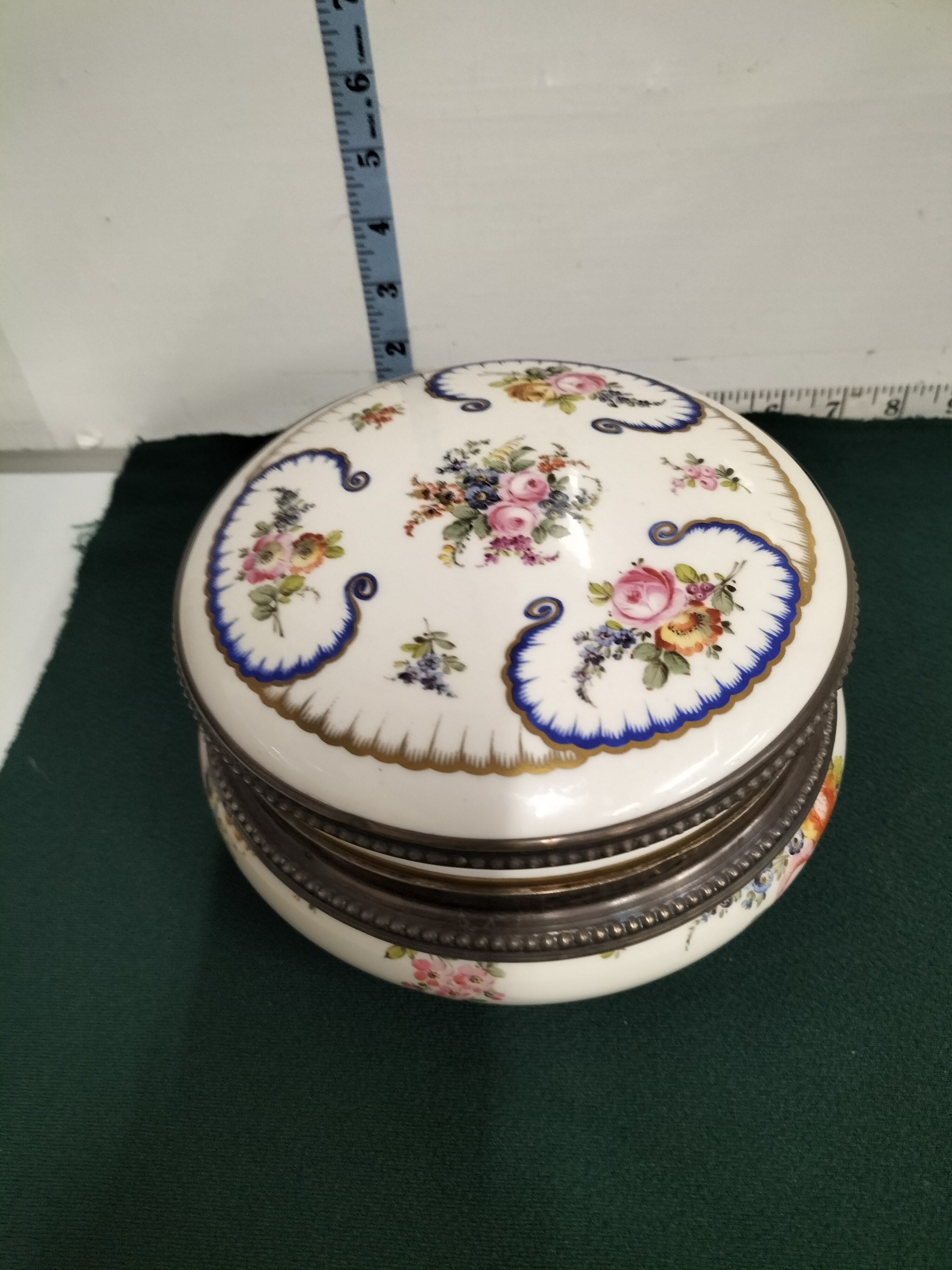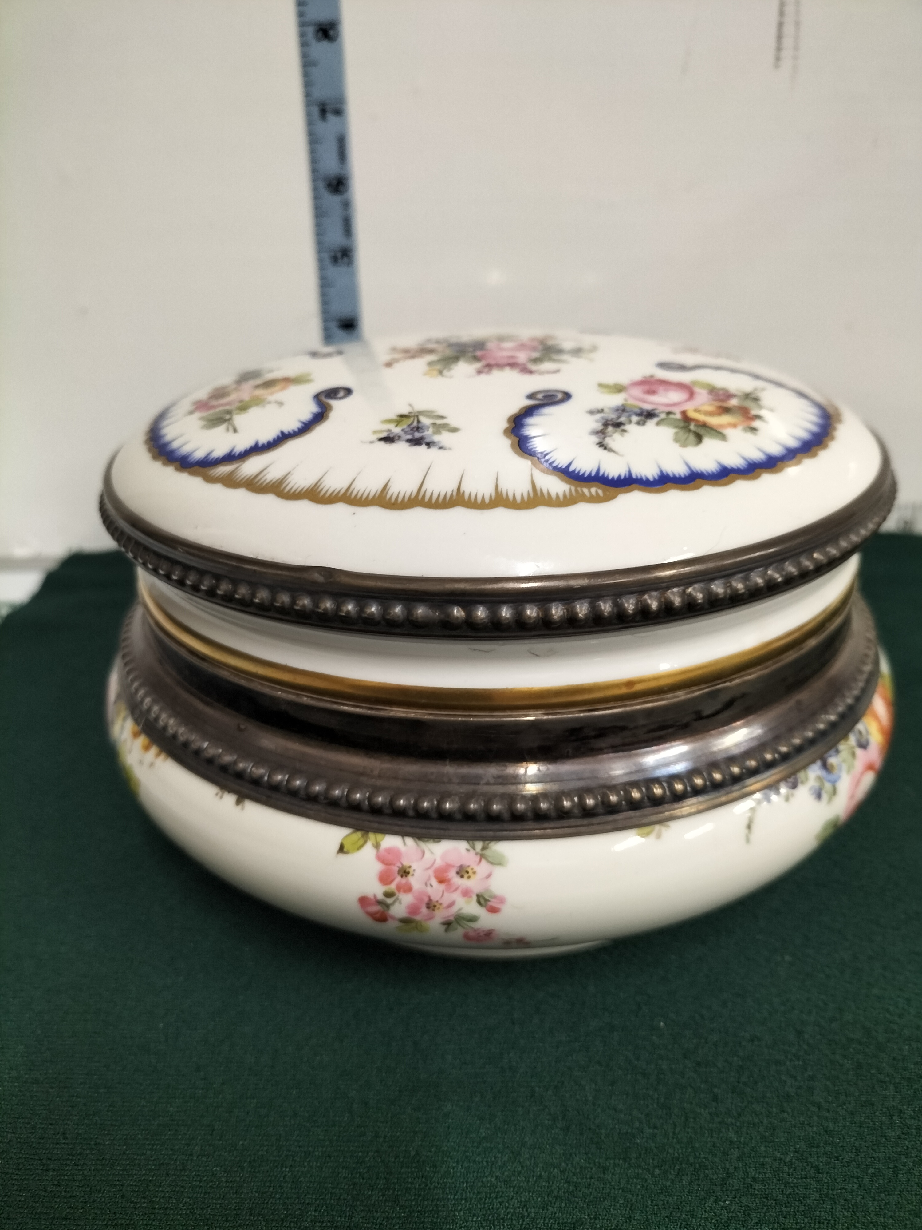 Rare Museum Quality huge Sevres circa 1751. A circular hard-paste porcelain dresser box or bonbonnière. The lid features a central polychrome hand-painted floral bouquet, surrounded by four blue-and-white feathered scroll motifs accented with gilded scalloped borders. The base is similarly decorated with scattered floral sprays on a white ground. Both the lid and the base are fitted with beaded metal rims. The underside bears an underglaze blue mark of interlaced letters, from the Sèvres factory, alongside a small gold oval sticker. This piece is characteristic of late 19th-century French decorative arts. Diameter: 6 inches; Height: 3.5 inches.