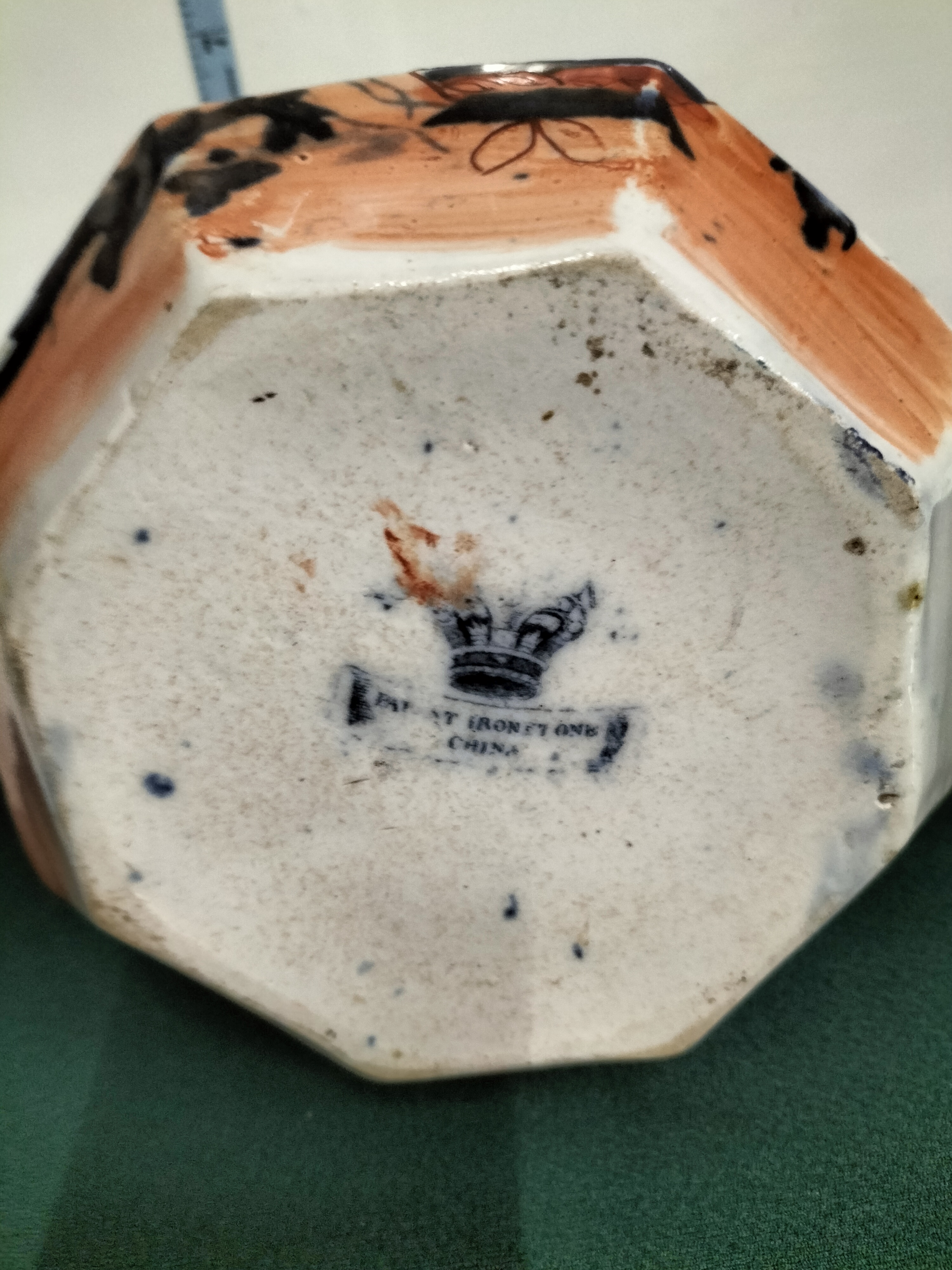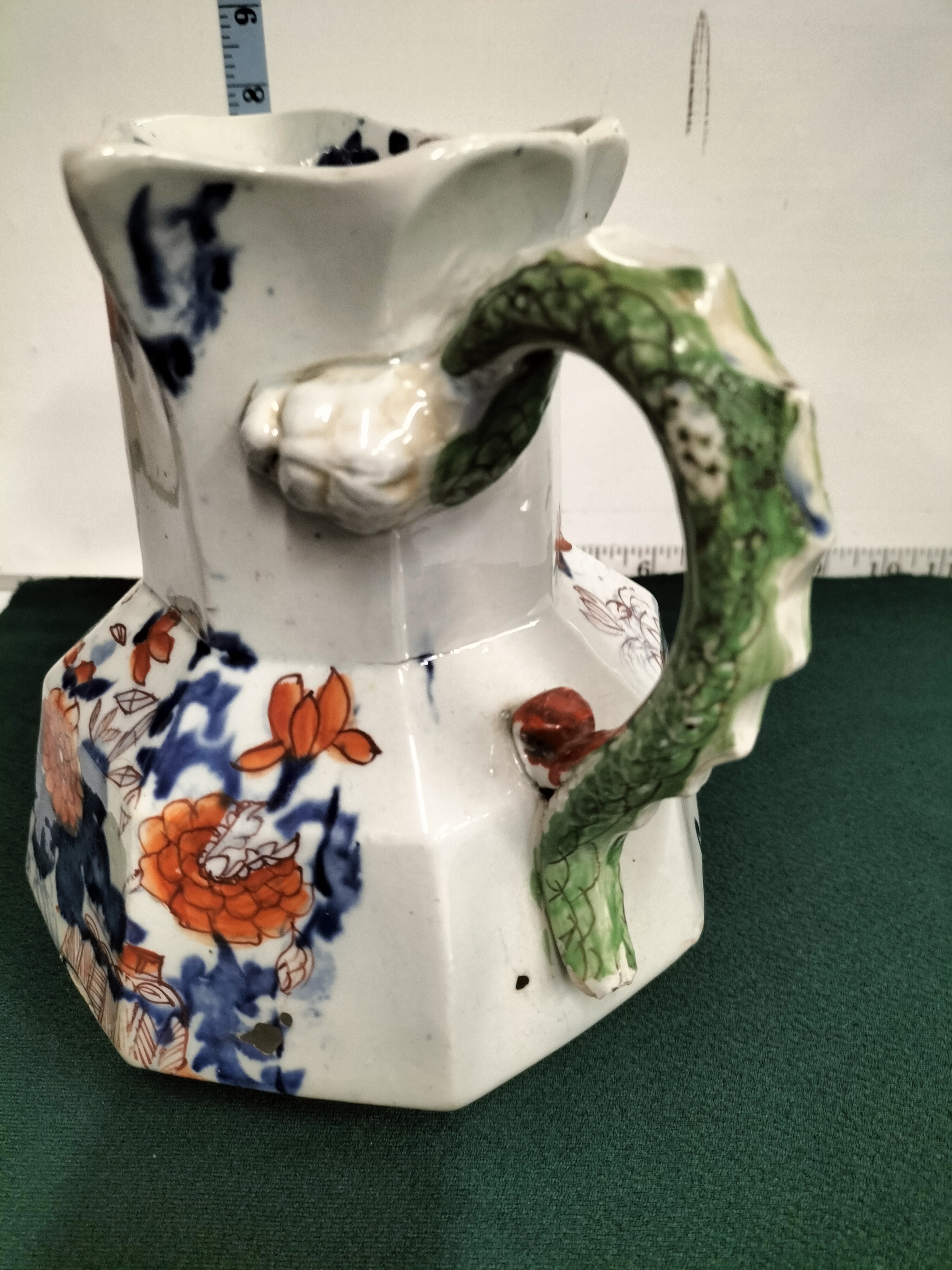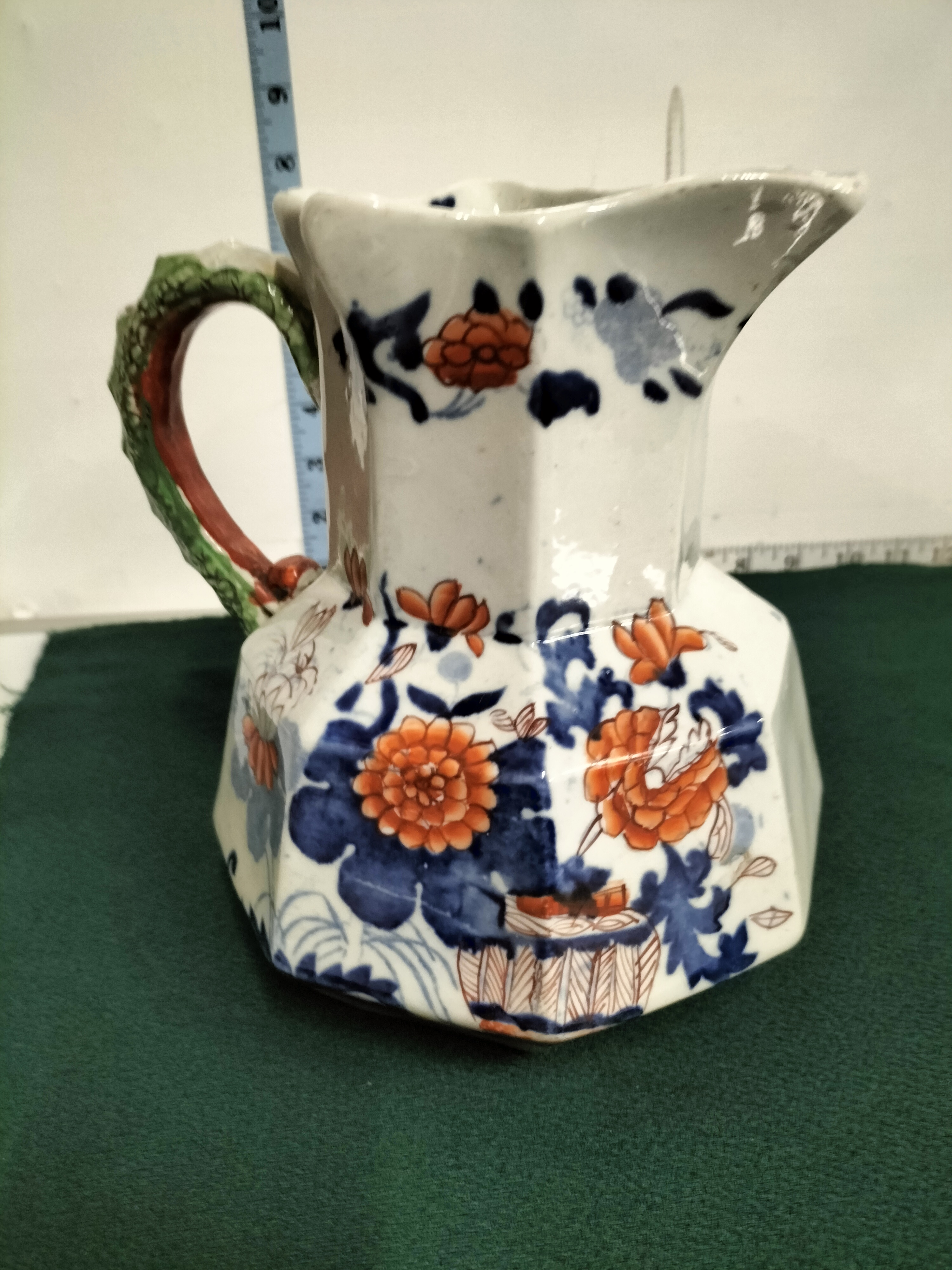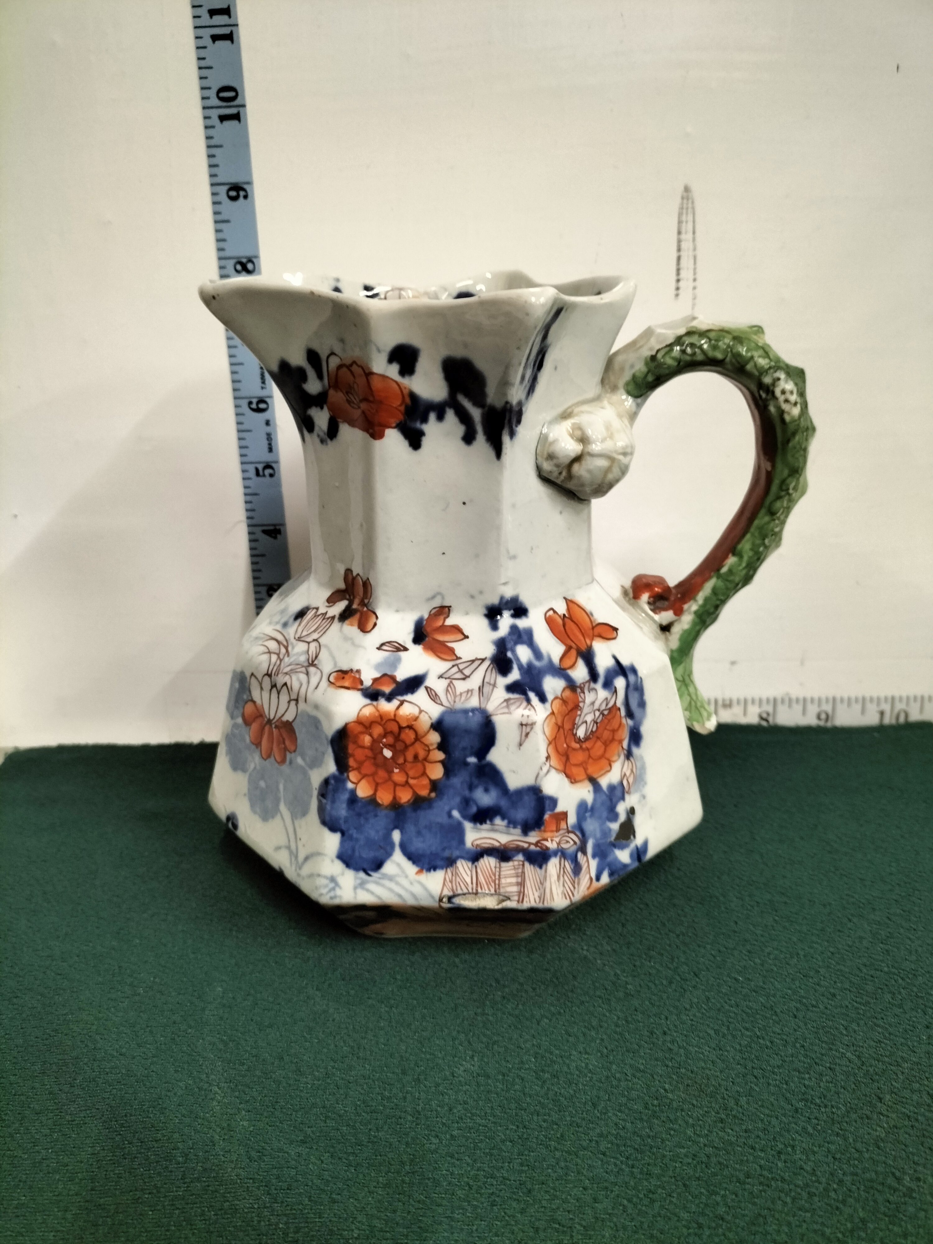 An early 19th-century English ironstone pitcher by Mason’s, featuring the iconic octagonal form and a moulded serpent-form hydra handle. The vessel is decorated in a vibrant Imari-style palette with transfer-printed and hand-enamelled floral motifs in cobalt blue, iron red, and pale blue against a white ground. The handle is finished in contrasting green and red glazes. The base is marked with the characteristic blue transfer-printed crown above a banner inscribed PATENT IRONSTONE CHINA. Height: approximately 7.5 inches.