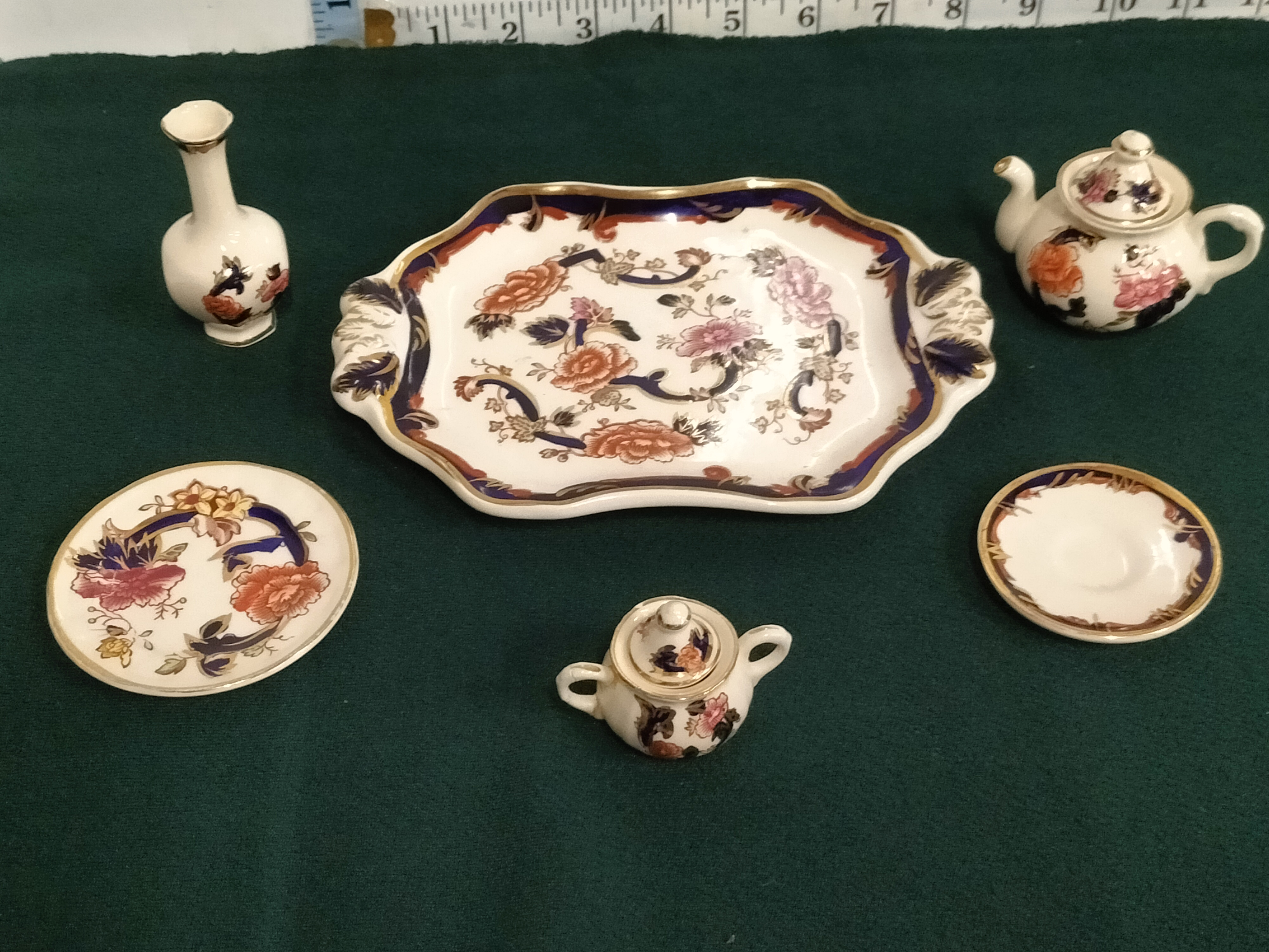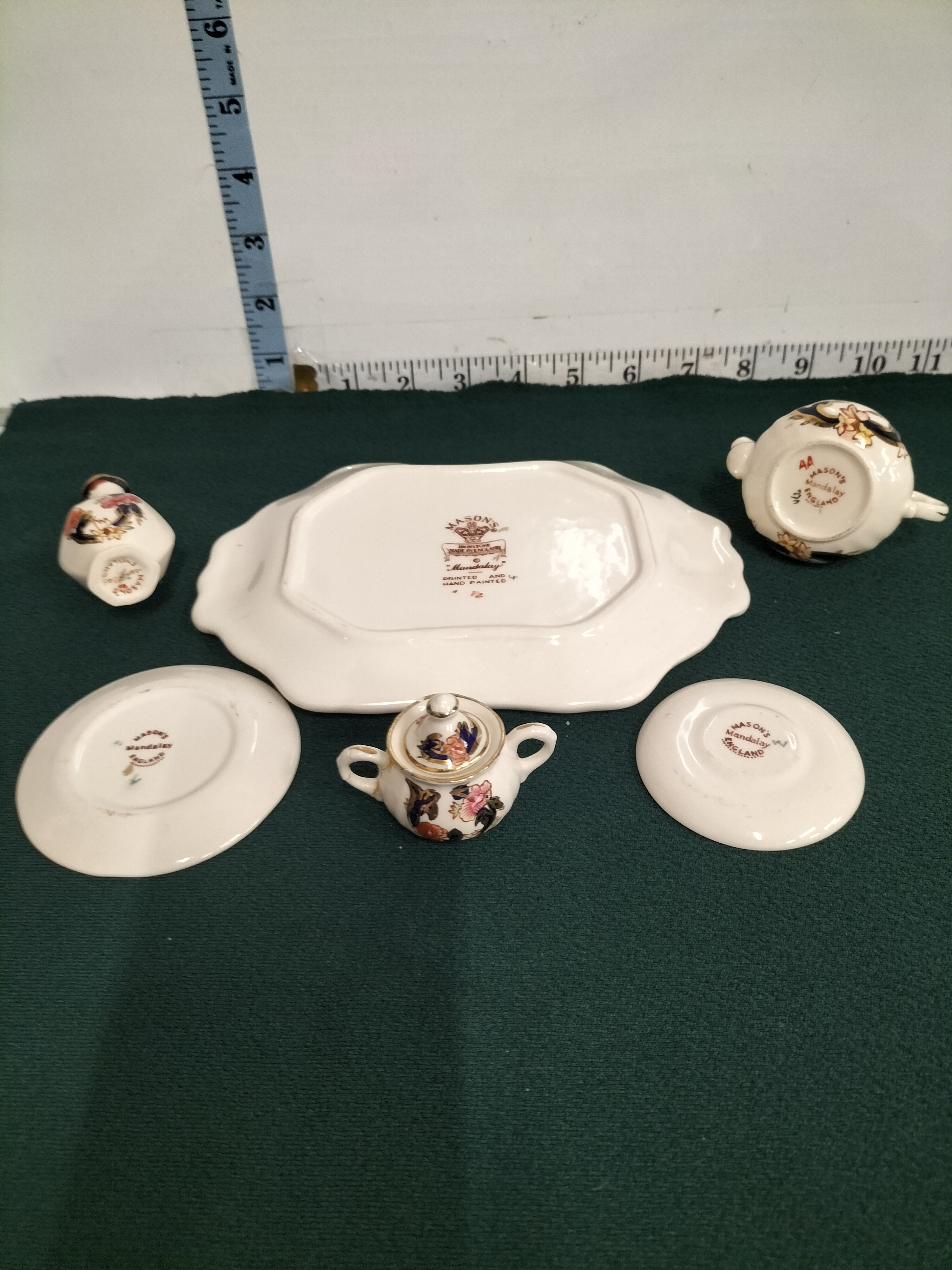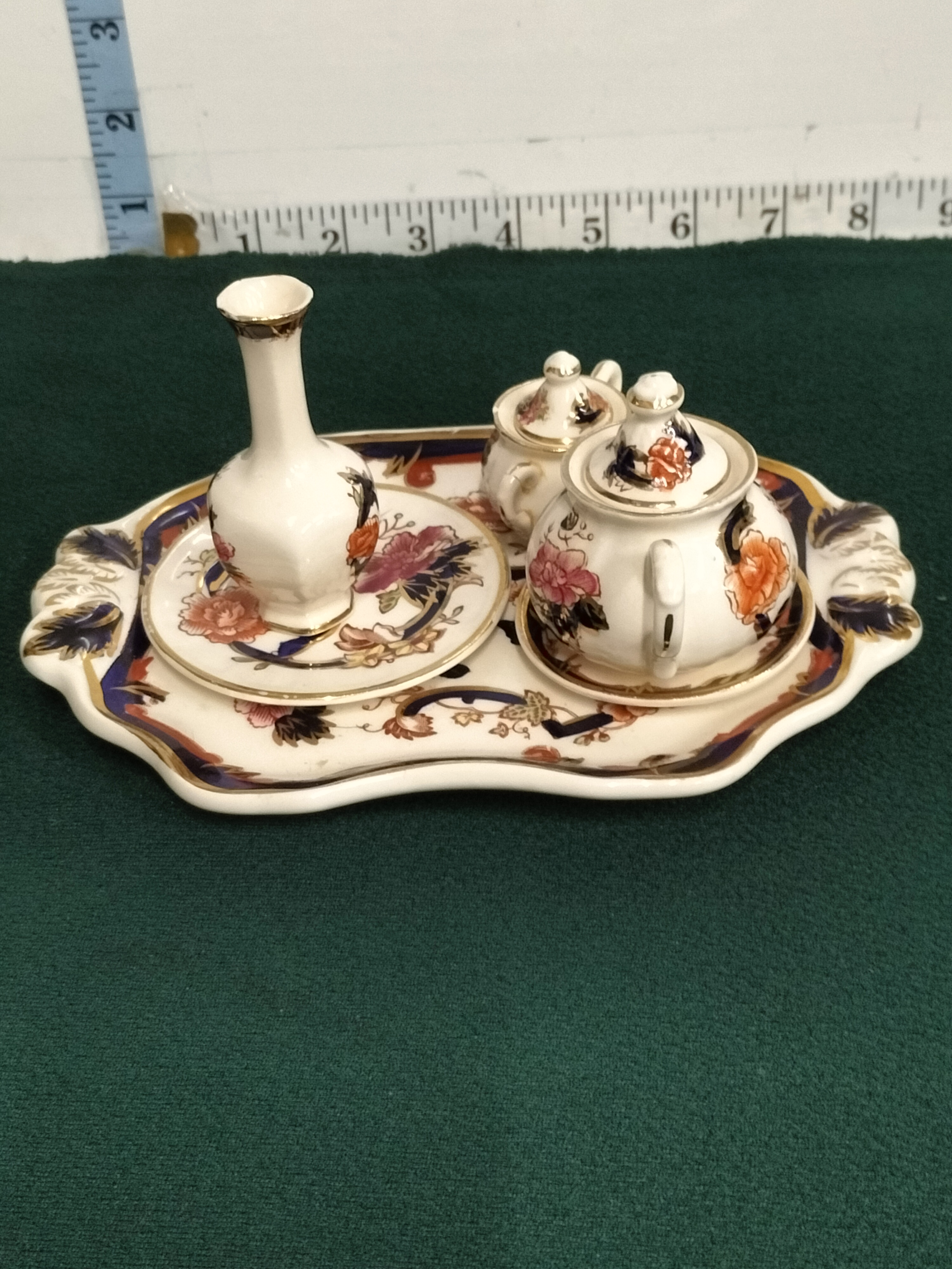 A fine collection of miniature ironstone ceramics produced by Mason’s in the popular Mandalay pattern. This set comprises a shaped rectangular twin-handled tray, a globular teapot with cover, a twin-handled sugar bowl with cover, a faceted bud vase, and two matching saucers. Each piece is decorated in the traditional Imari palette, featuring vibrant transfer-printed floral sprays in shades of pink, orange, and yellow, enhanced with hand-painted cobalt blue accents and fine gilded rims. The underside of the tray and other components bear the printed maker’s mark: Mason’s Ironstone Made in England, alongside the pattern name Mandalay and the notation Printed and Hand Painted. This set represents a charming 20th-century interpretation of the classic 19th-century ironstone aesthetic. Tray length: approximately 19 cm (7.5 inches).
