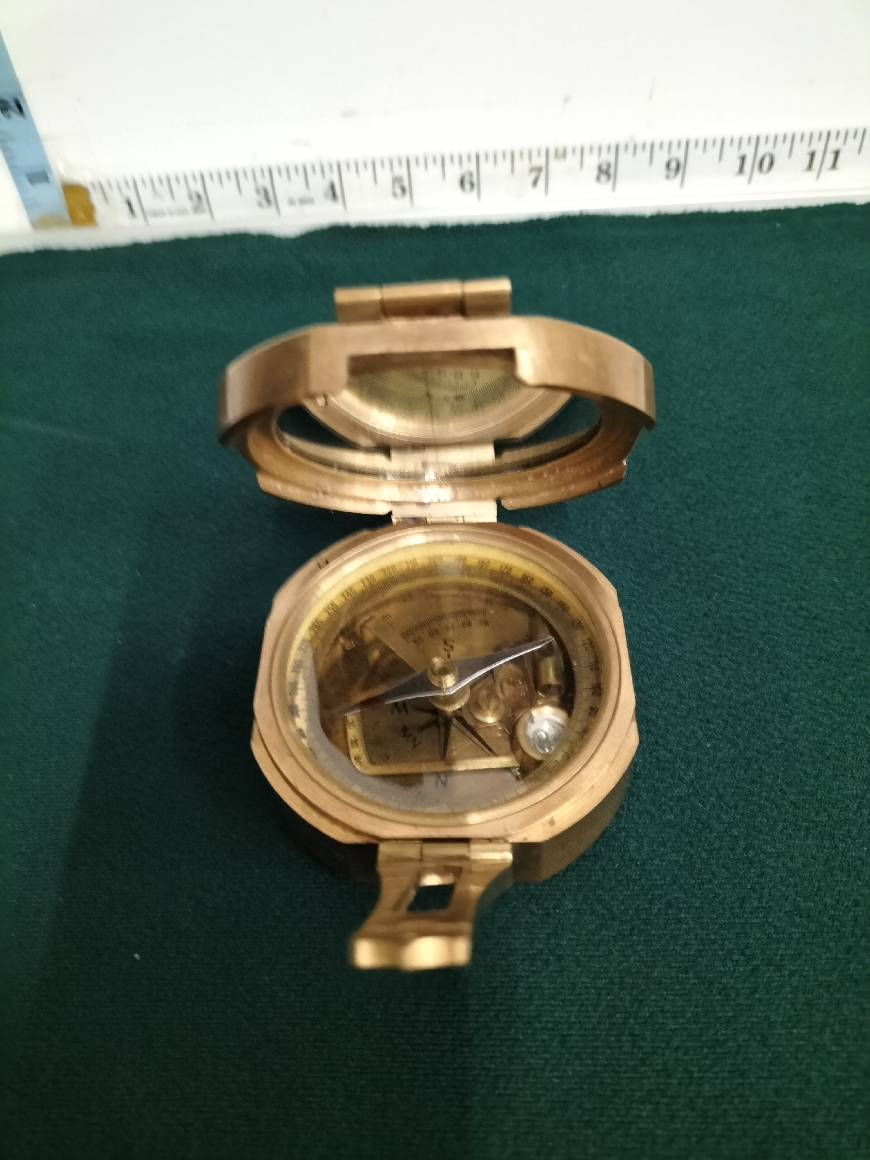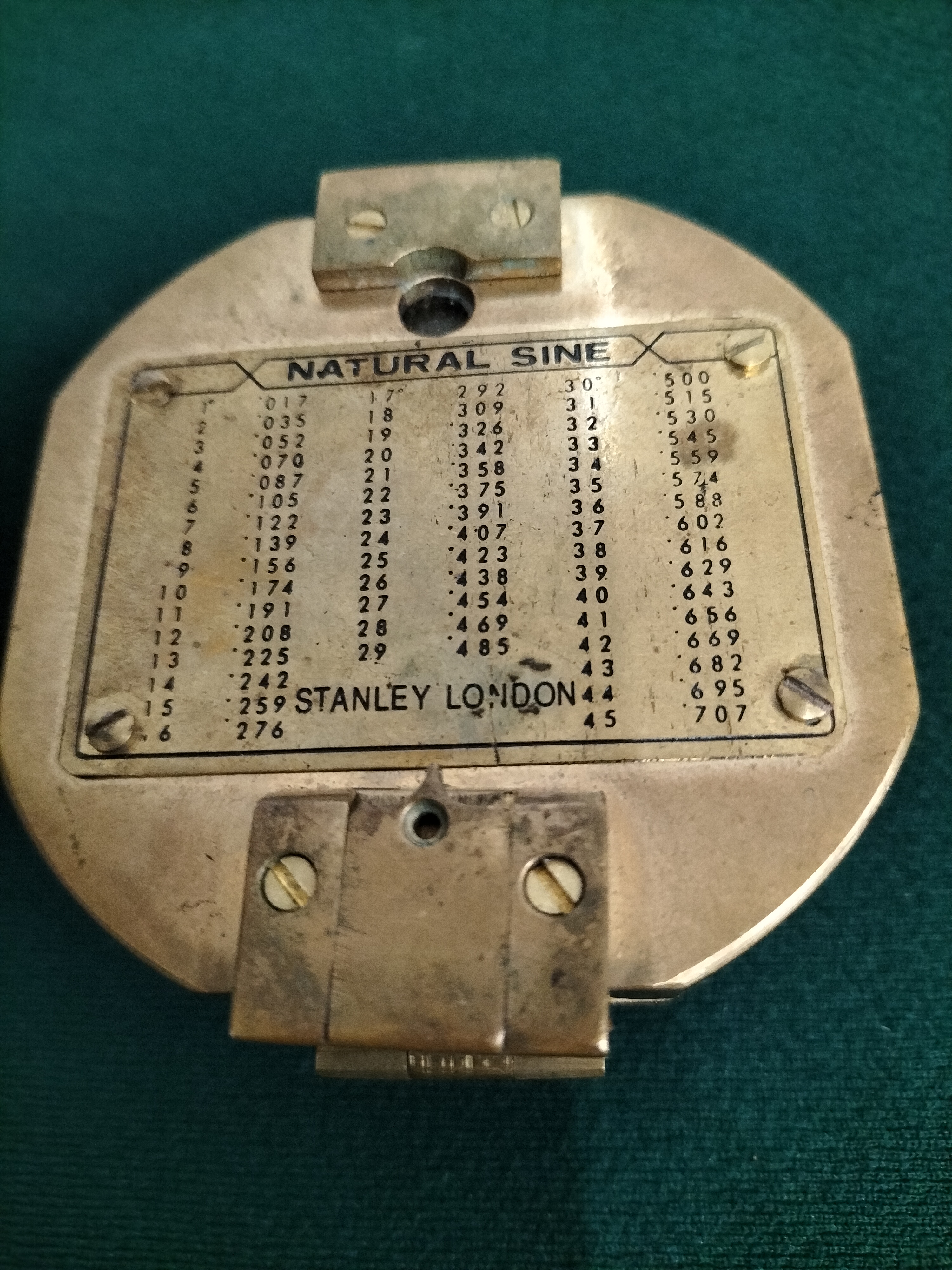 A Brunton-style pocket transit surveying compass by Stanley London. Constructed from polished brass, the instrument features a hinged lid with an internal sighting mirror and a folding sighting arm. The base plate is engraved with a NATURAL SINE table for angles 1 through 45 degrees, signed STANLEY LONDON at the foot. The interior houses a compass dial marked to 360 degrees in 2-degree increments, cardinal points, an internal clinometer scale for vertical measurements, and an integrated spirit level. This multifunctional tool is designed for determining horizontal bearings, inclination, and level. The overall diameter is approximately 7.5 centimetres. No case is included.