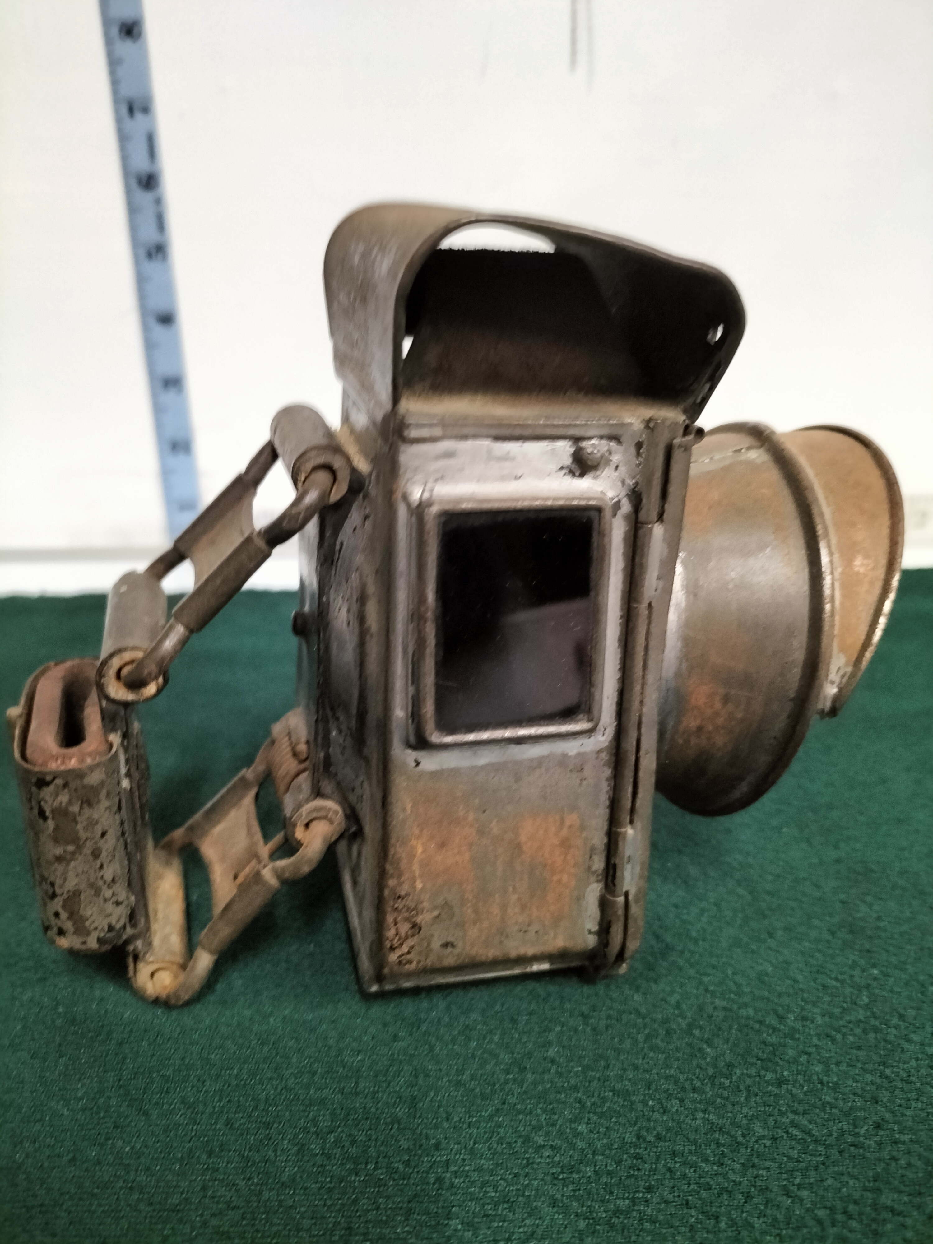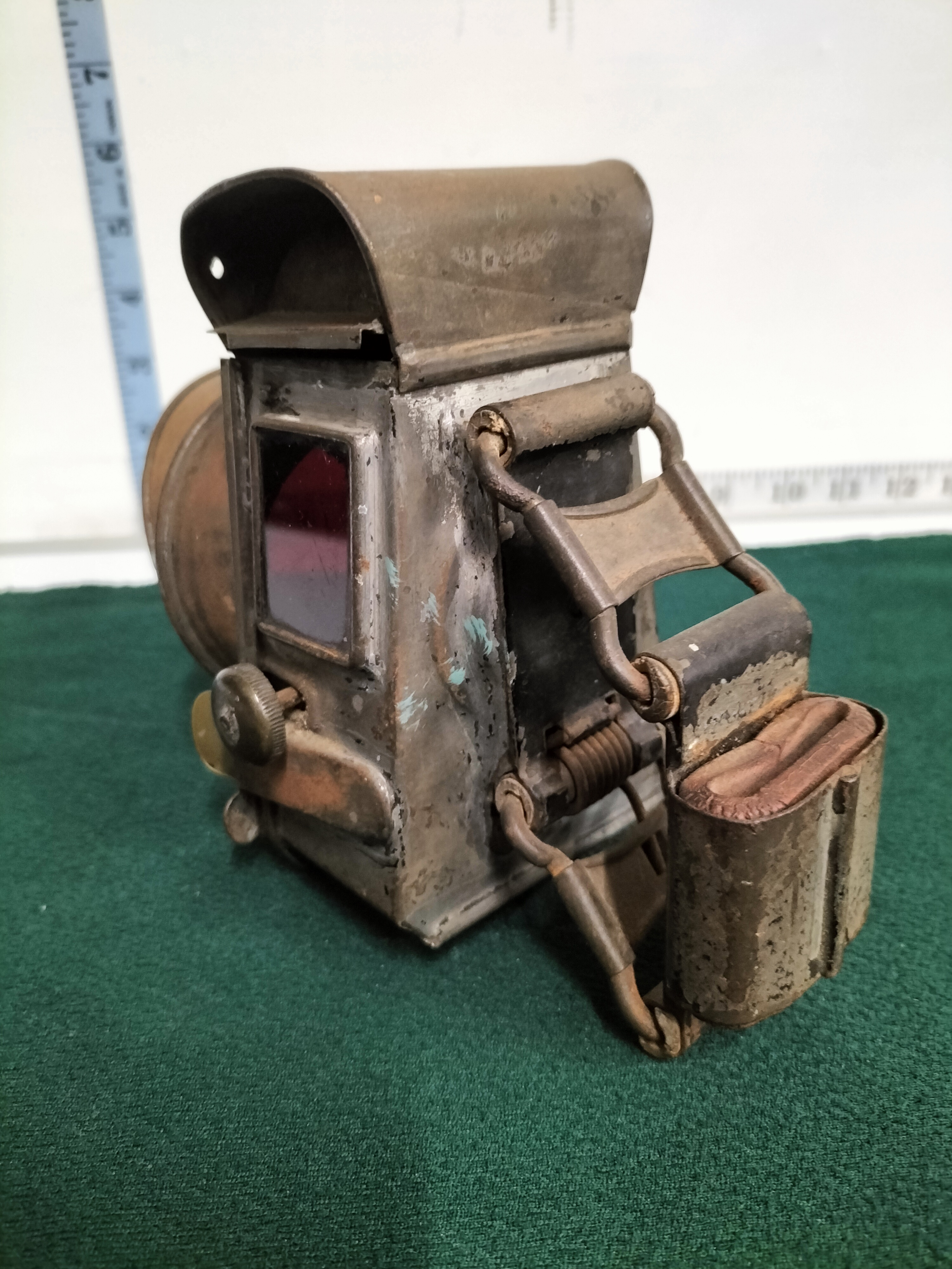 This is an authentic antique oil-burning lamp, designed for use on early Safety bicycles or light carriages. Constructed from sheet steel with a weathered patina, the unit features a prominent circular clear glass front lens protected by a metal hood. The square body includes two side apertures: one clear glass for lateral visibility and one red glass lens, serving as a rear-facing signal. A notable feature is the heavy-duty, spring-loaded mounting bracket at the rear, designed to dampen road vibrations; this bracket retains remnants of its original leather or fabric padding. A side-hinged door allows access to the internal burner compartment, and an external knob is present for wick adjustment. While no manufacturer marks or patent dates are visible, the design is highly characteristic of British makers such as Joseph Lucas or H. Miller and Co. from the late 19th to early 20th century. This is an original period piece, not a modern reproduction. Dimensions: Approximately 7.5 to 8 inches in height.