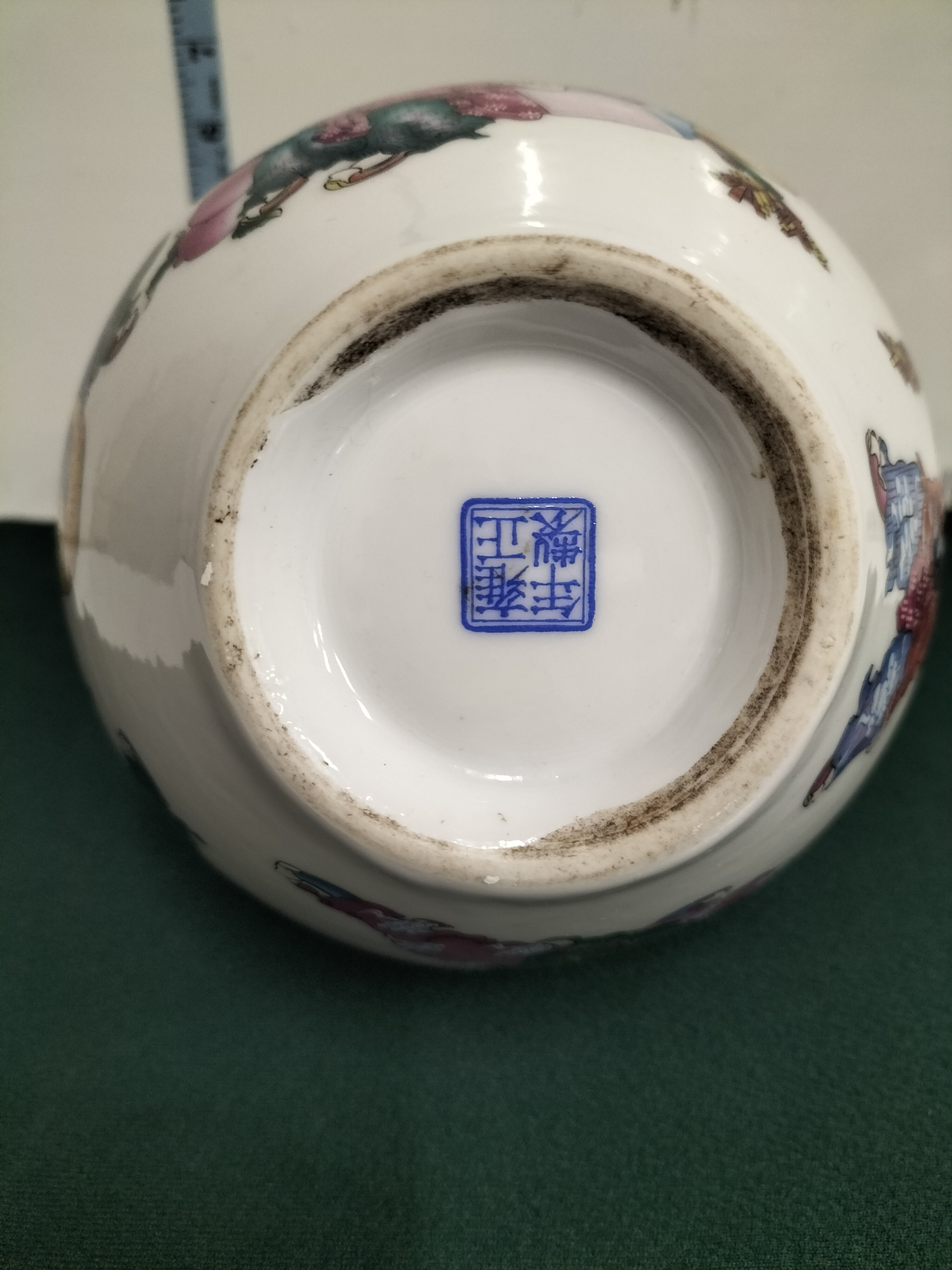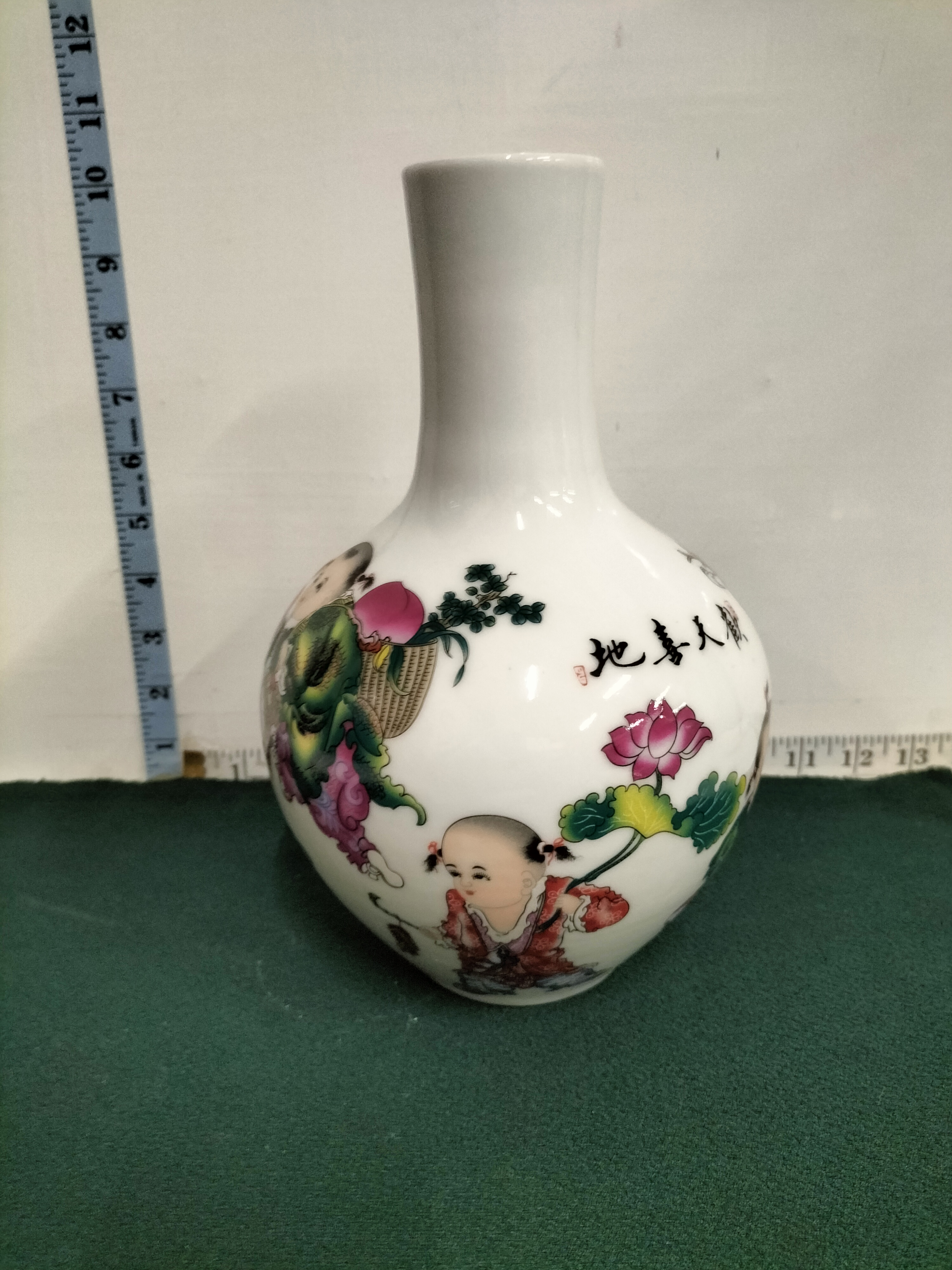 A Chinese porcelain bottle vase featuring a globular body and a slender, cylindrical neck. The exterior is decorated in polychrome overglaze enamels with a traditional Hundred Boys motif, depicting children at play amidst auspicious symbols including peaches and a lotus blossom. The composition includes a black calligraphic inscription with a small red seal. The base features an underglaze blue four-character apocryphal Yongzheng reign mark within a double-line square. This item is a 20th-century decorative piece produced in the style of the Qing Dynasty. Height: approximately 9 inches.