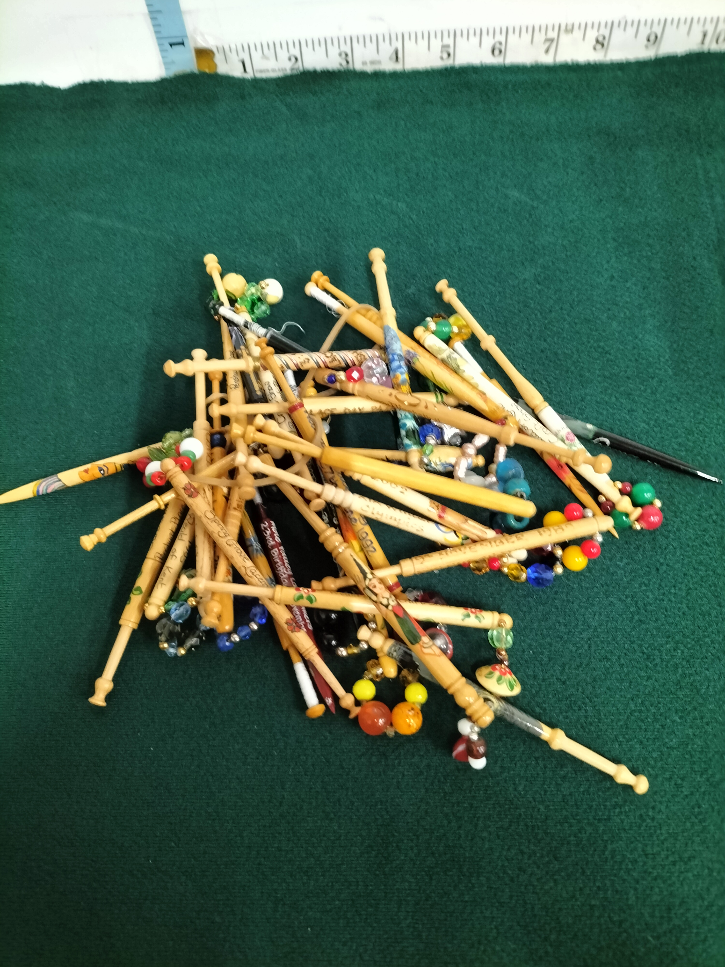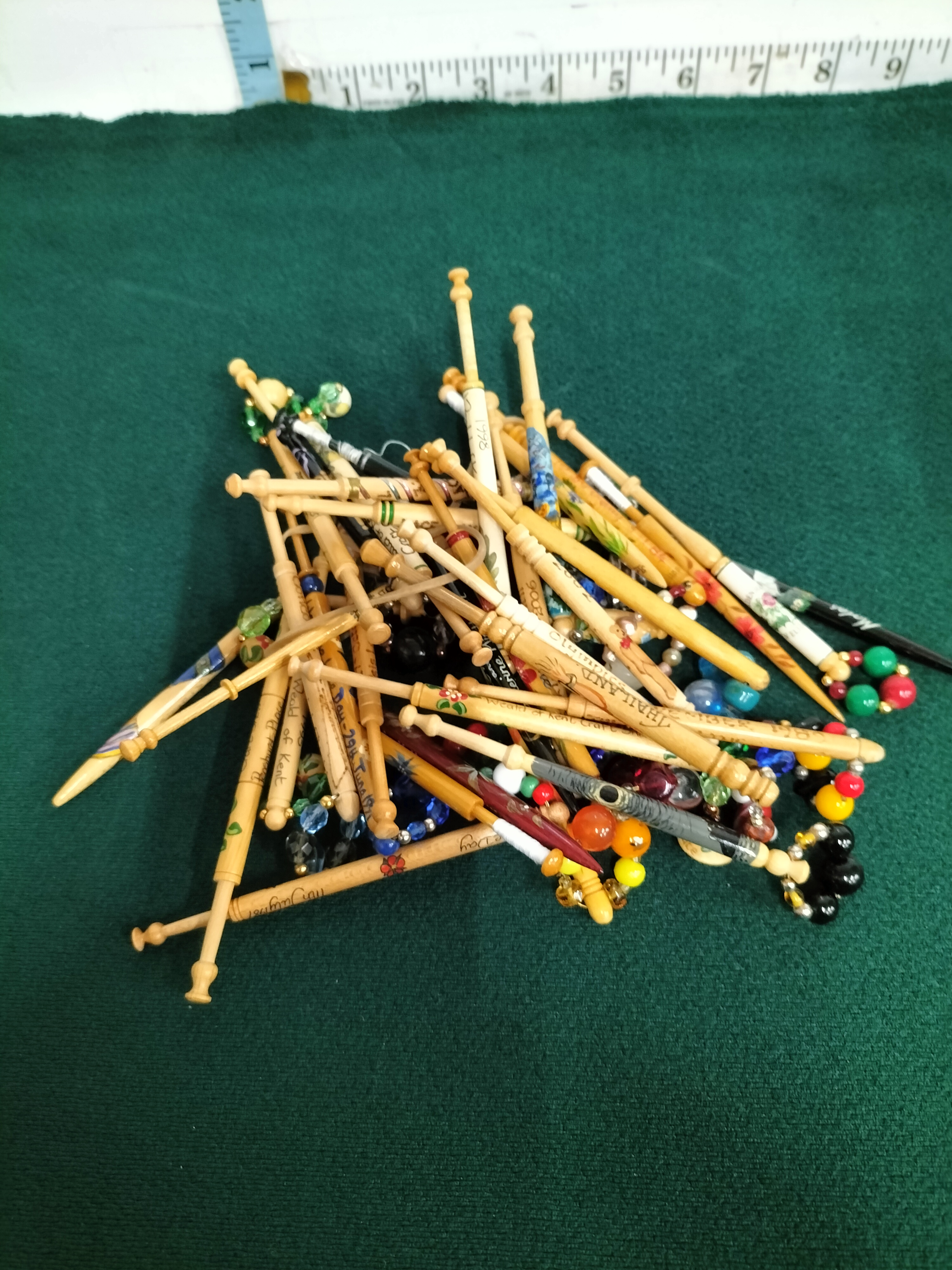 A comprehensive collection of decorative lace bobbins, primarily of the Midland style, crafted from turned light-coloured wood. The assortment features numerous examples adorned with hand-painted floral motifs and detailed handwritten inscriptions. Notable inscriptions include geographical locations and specific events such as THAILAND, Weald of Kent Craft, Spring Grove Lace, and Lace Day. Several pieces serve as commemorative markers for the lace-making community, bearing dates including 1991, 1992, 1995, and 2006, with one reference noting Since 1988. Many bobbins are fitted with traditional spangles consisting of colourful glass beads attached by wire loops to provide necessary tension during the lace-making process. The collection represents a significant record of late 20th-century and early 21st-century craft gatherings and regional lace-making societies. Individual bobbins measure approximately 10.2 cm to 12.7 cm (4 to 5 inches) in length.