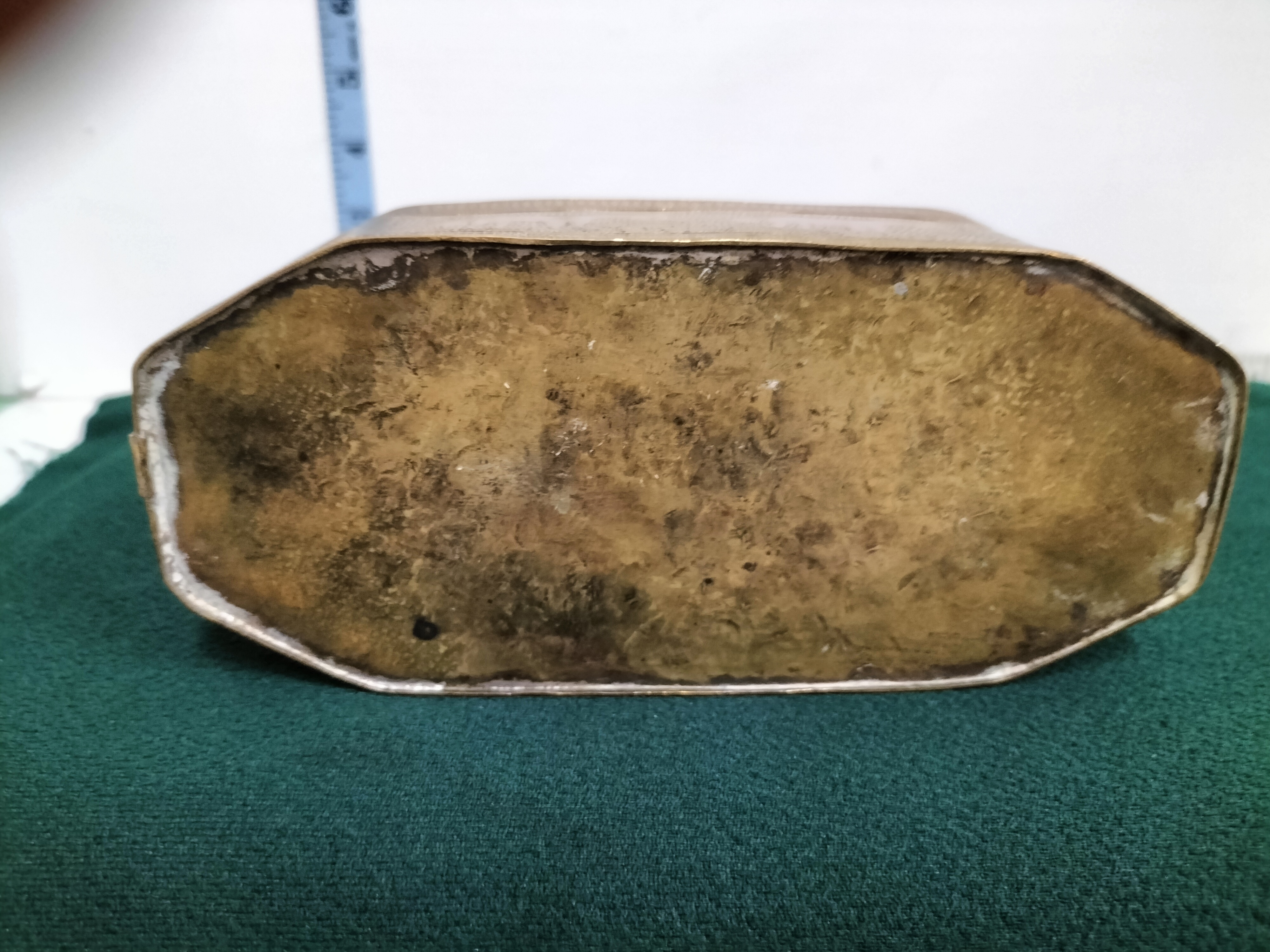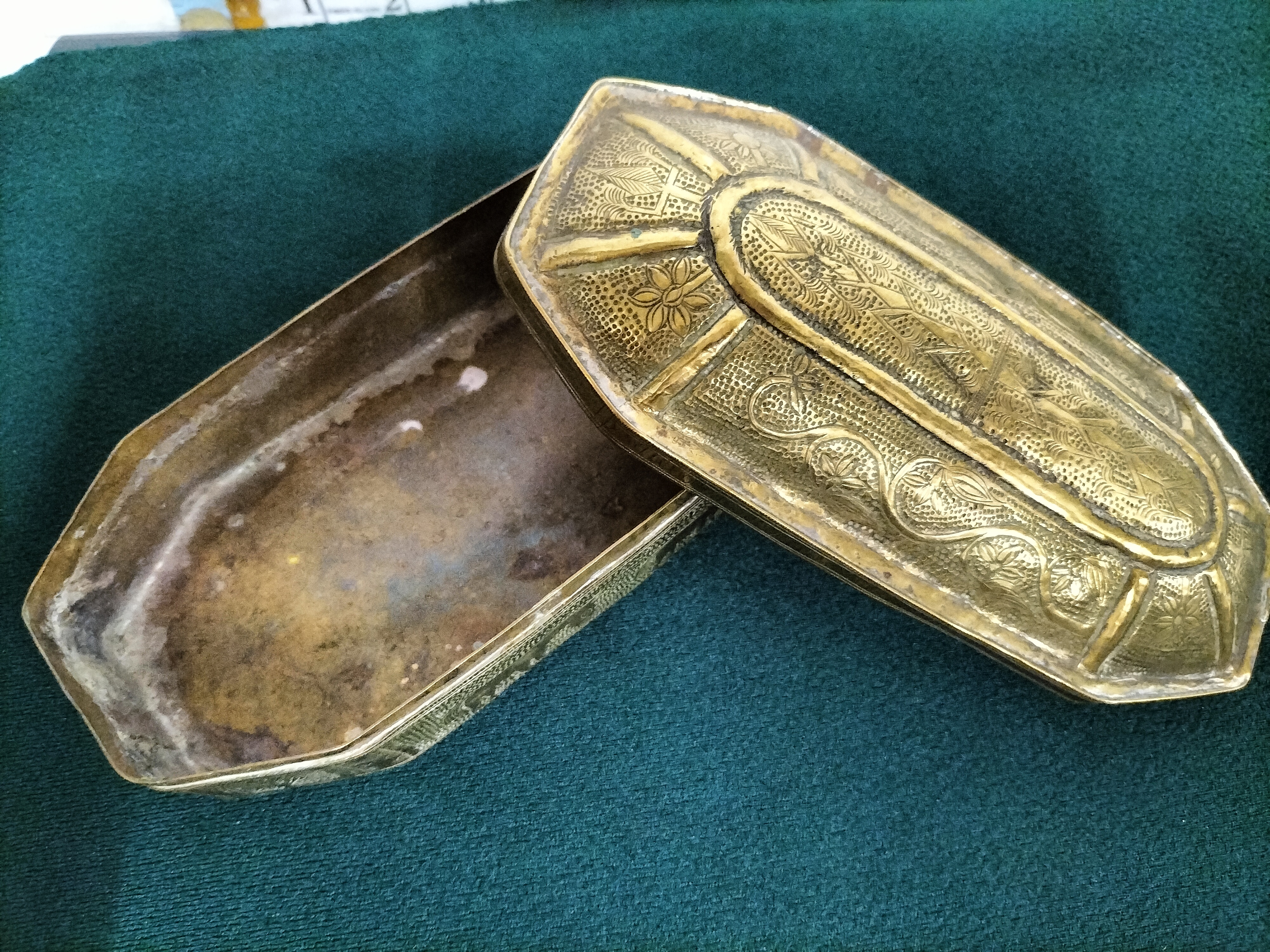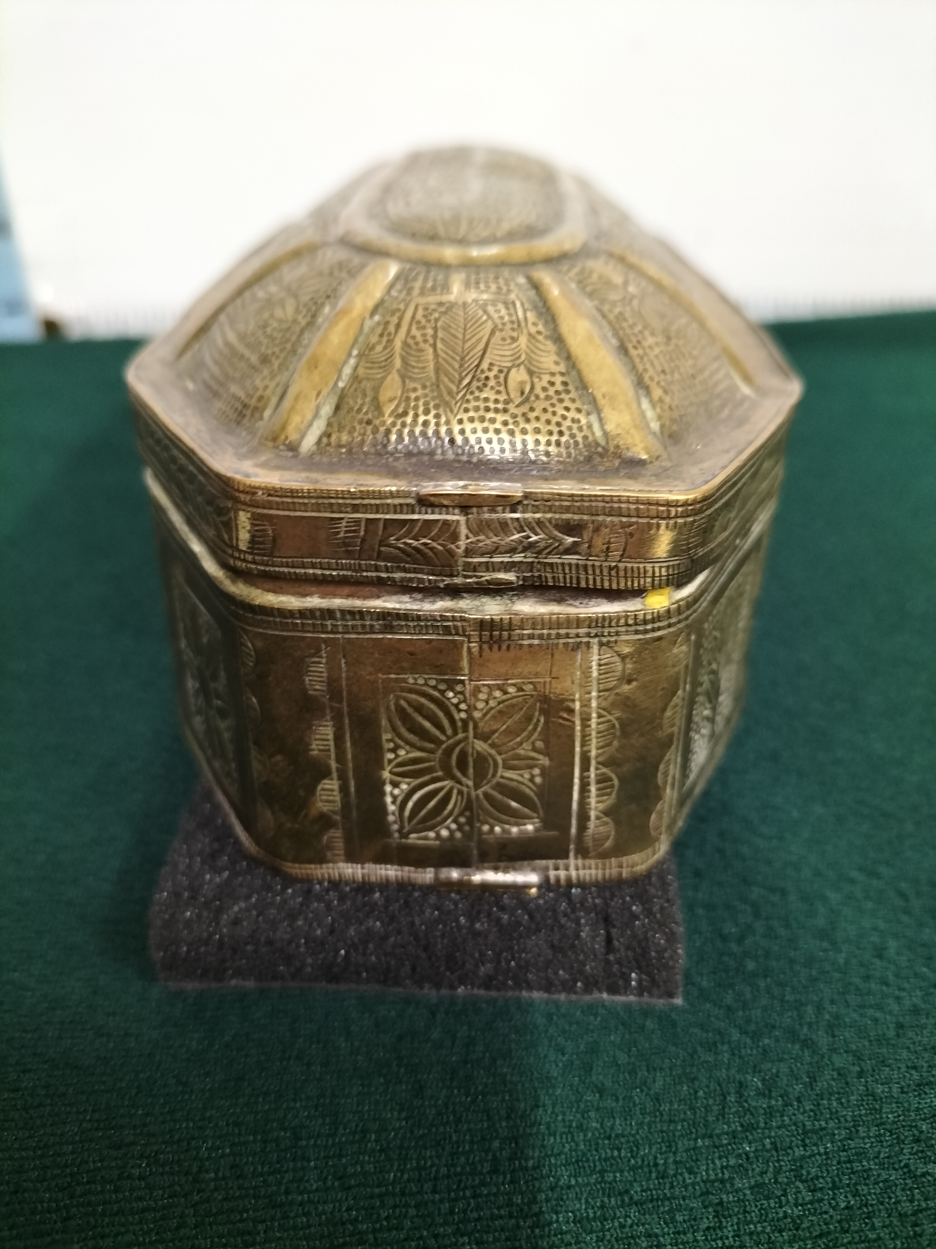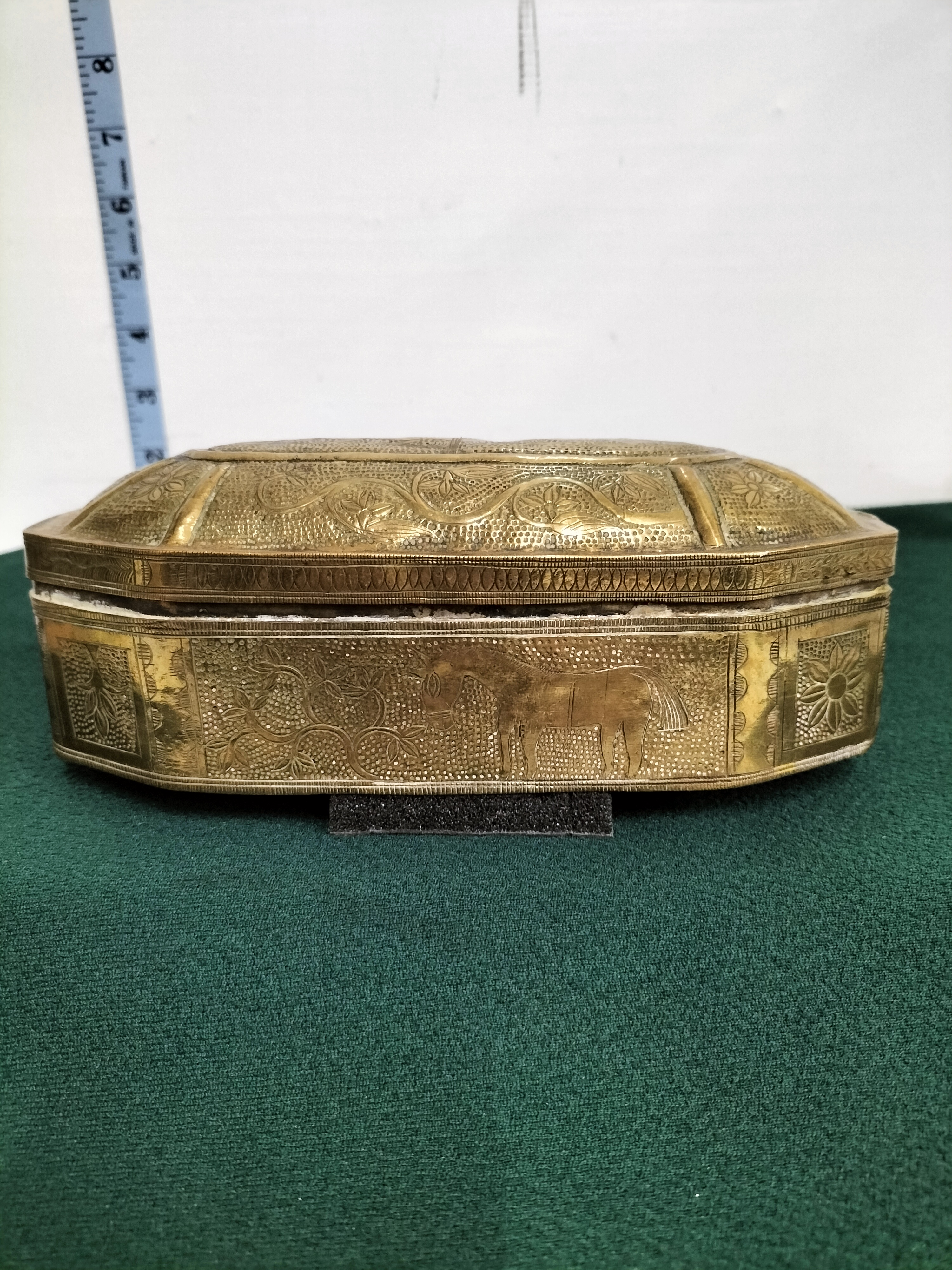 An elongated octagonal brass jewellery box of Indo-Persian origin, dating from the late 19th to early 20th century. This metalware piece is constructed from brass featuring extensive hand-chased and stippled decoration throughout. The domed lid is designed with a central raised panel accented by radial ribs and scrolling floral motifs set against a textured ground. The body is divided into rectangular panels, each containing intricate floral designs, with a prominent central scene depicting a horse. This item exemplifies the Mamluk Revival style, drawing on Moorish and Islamic decorative traditions popular during the late Victorian and Edwardian periods. No maker’s marks or signatures are present. Length: approximately 7.5 inches.