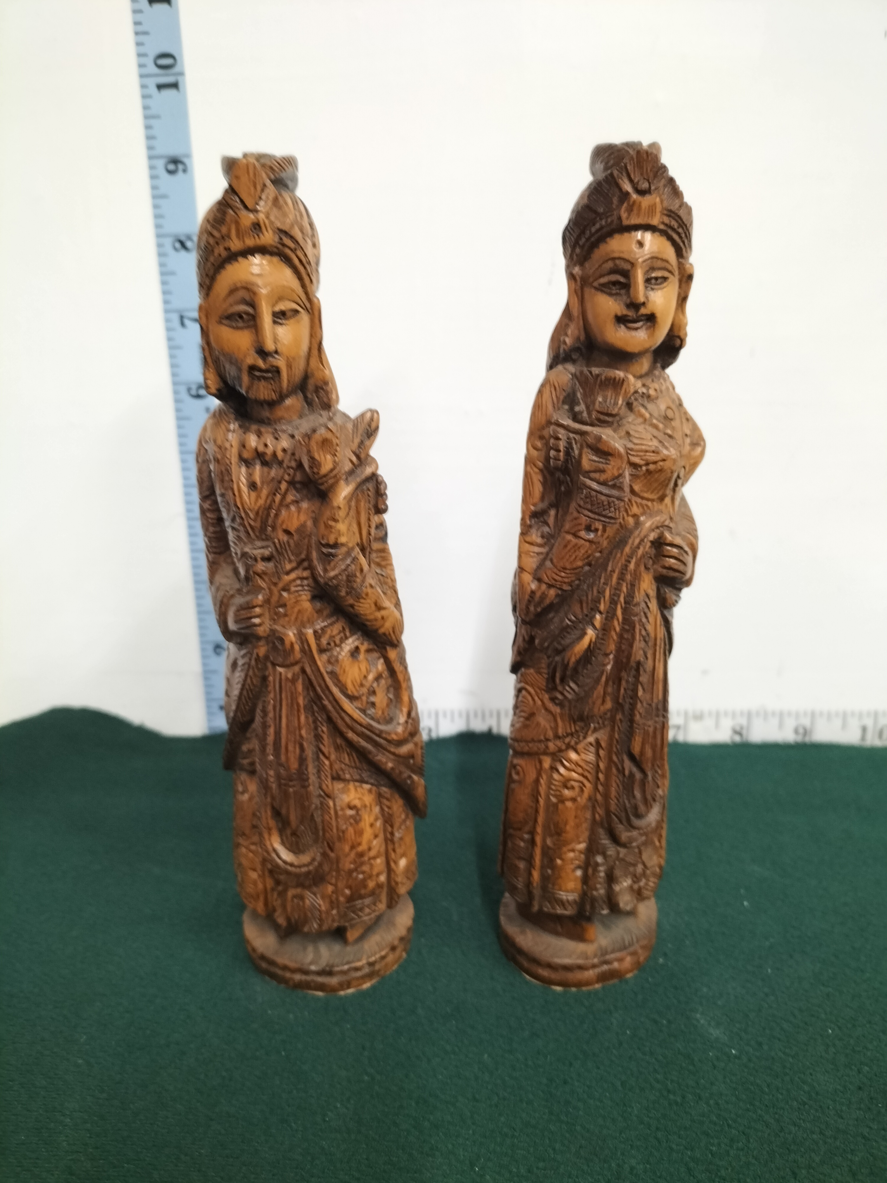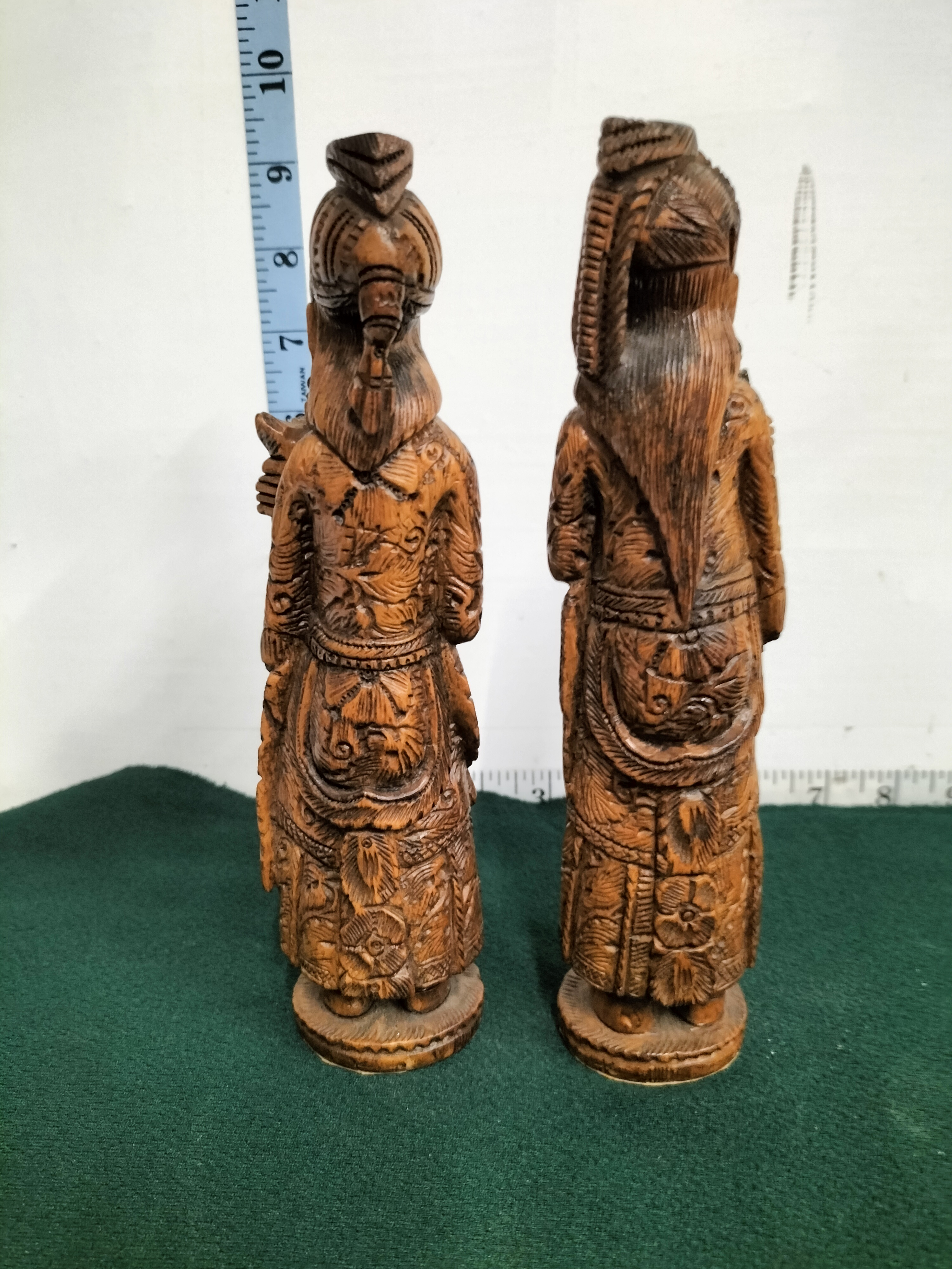A fine pair of hand-carved wooden figures, likely boxwood, depicting a male and female figure in traditional Middle Eastern courtly attire. Each figure is meticulously detailed with deeply carved floral and geometric motifs across the flowing robes and elaborate headdresses. The wood displays a warm medium-brown patina with darker accents to the recessed areas, enhancing the three-dimensional quality of the workmanship. Both figures are set upon integrated circular bases. The style reflects traditional East Asian decorative arts, showcasing a high level of craftsmanship in the textile patterns and facial expressions. Height: approximately 21.5 to 23 centimetres (8.5 to 9 inches).