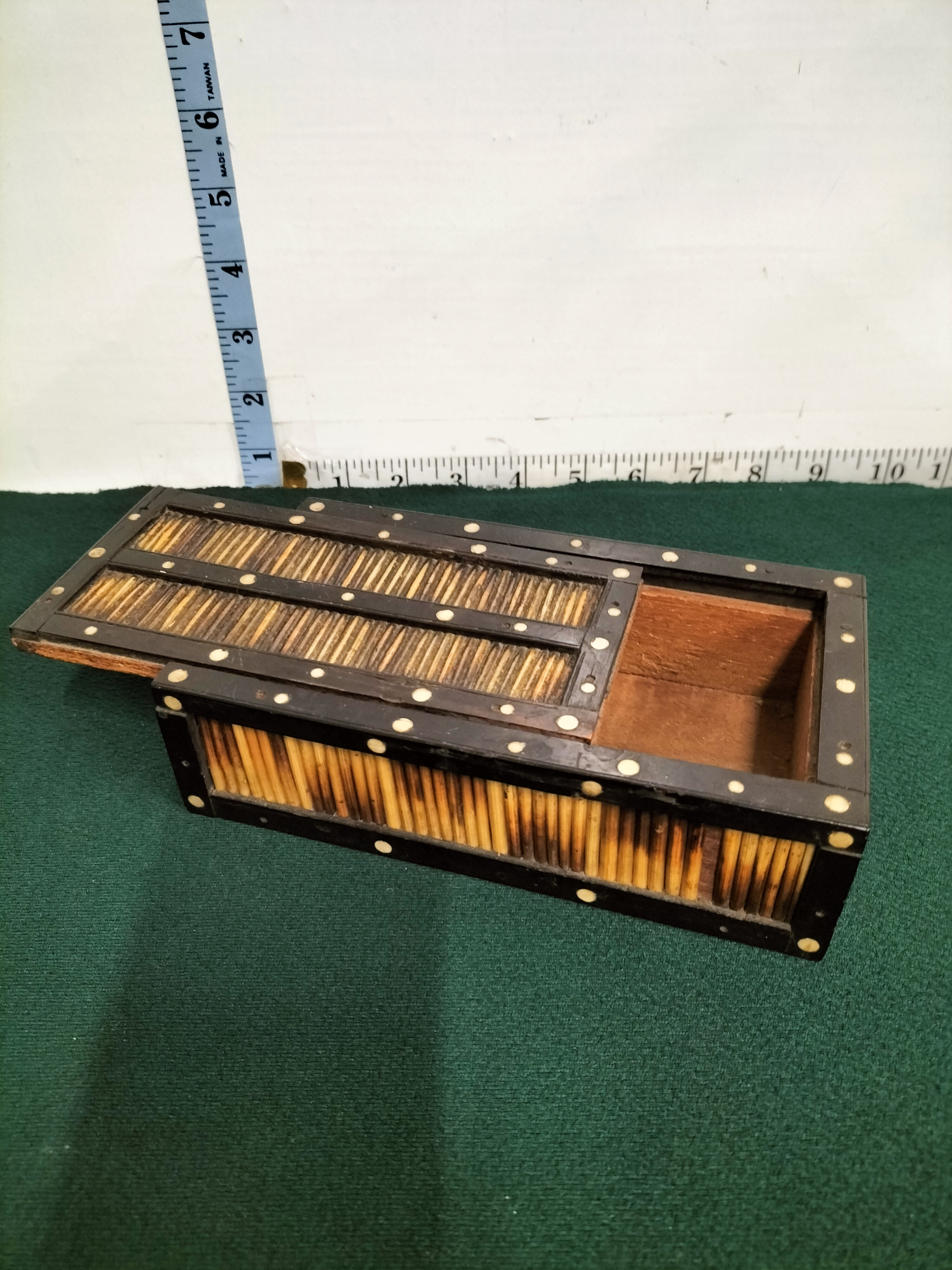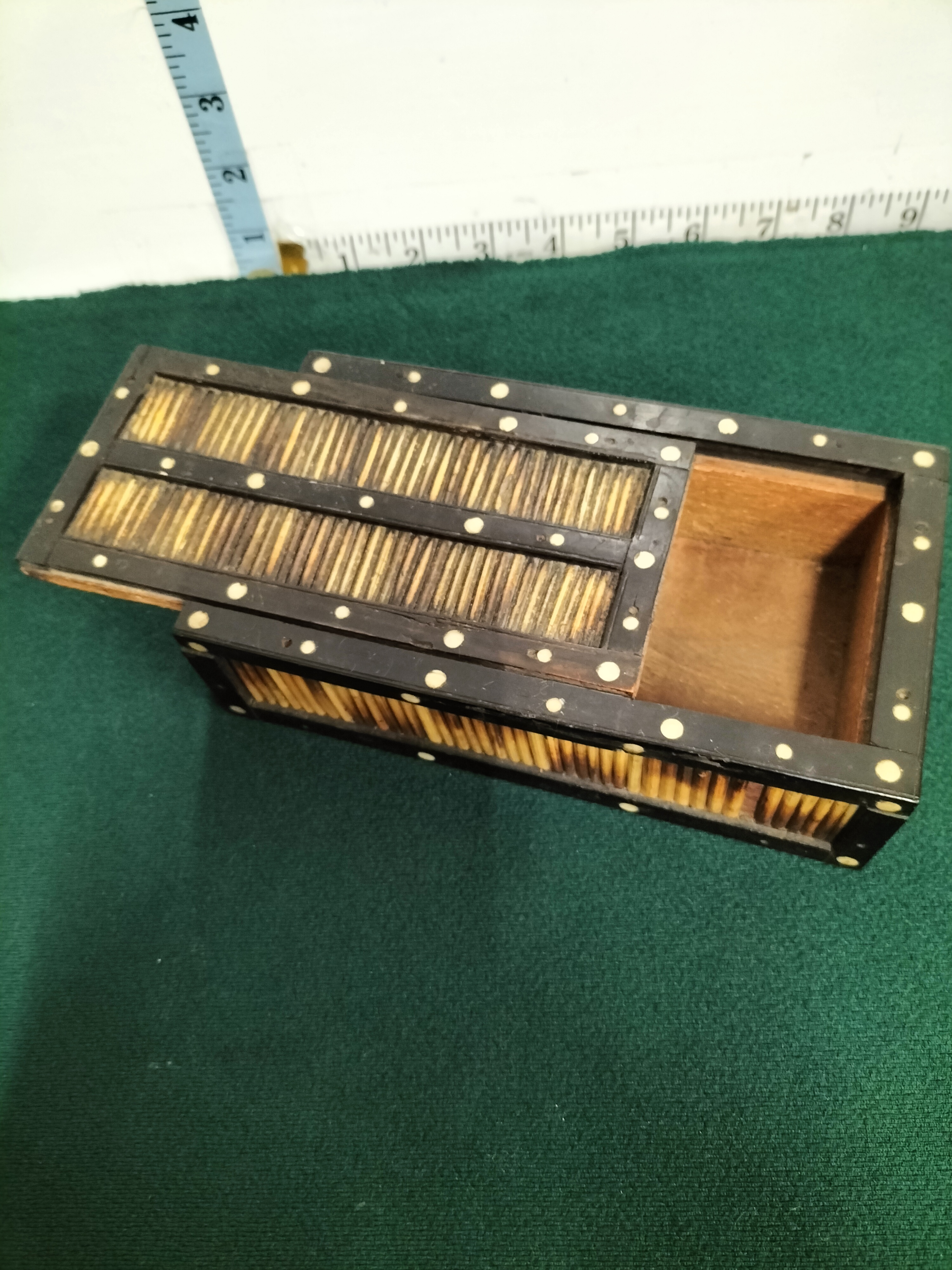 A fine late 19th-century Anglo-Indian or Ceylonese (Sri Lankan) rectangular decorative box. The piece is constructed from ebonised wood, likely ebony, and features a traditional sliding lid mechanism. The exterior is meticulously inset with panels of variegated porcupine quills arranged in vertical parallel bands, a decorative technique characteristic of the Matara district in Ceylon. The dark wood borders are embellished with numerous circular bone dot inlays. The interior of the box and the underside of the lid reveal the natural, unfinished grain of the wood. These boxes were highly popular as exotic souvenirs for British travellers and colonial officials during the Victorian and Edwardian eras. Length: approximately 25.4 cm (10 inches).