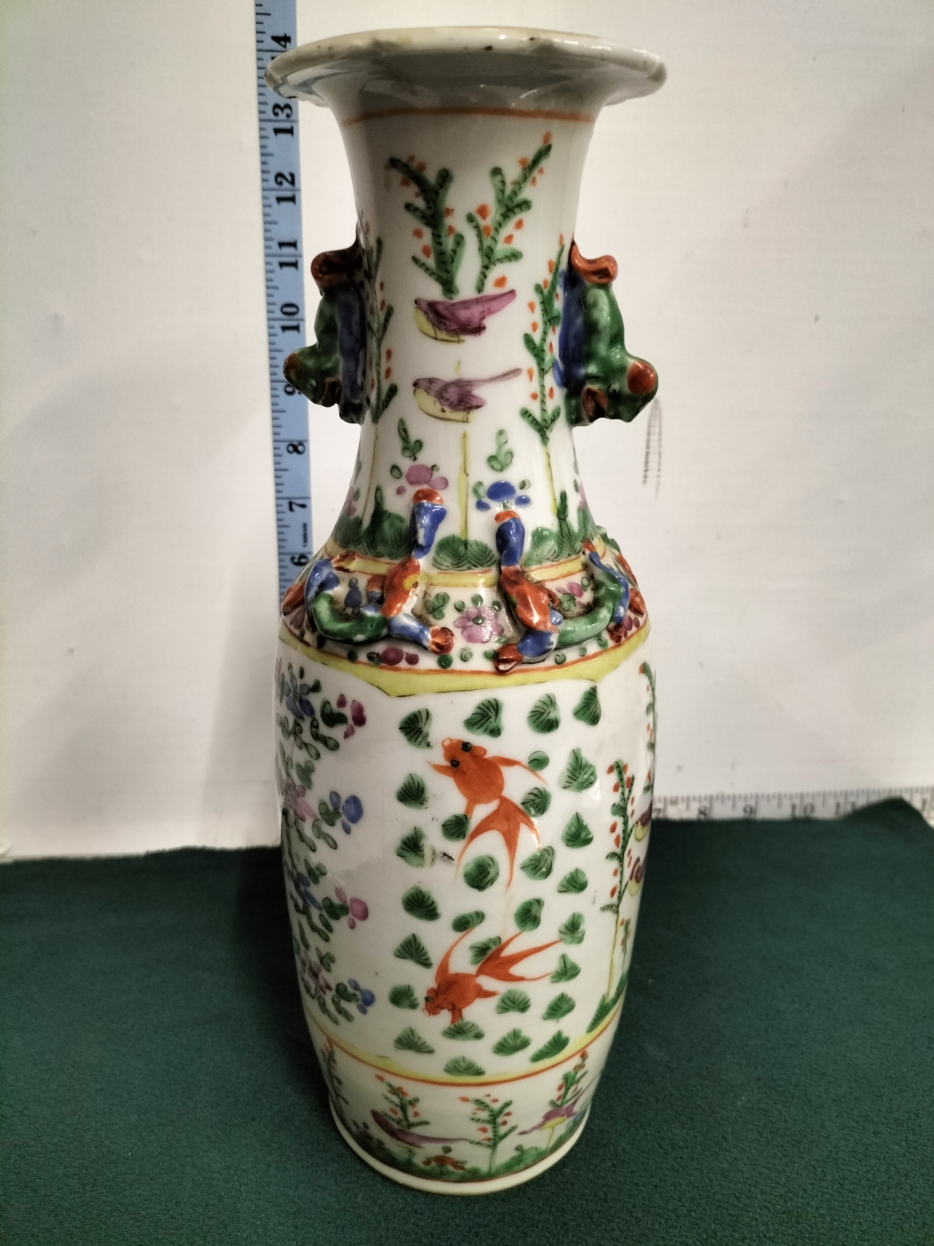 A Chinese export polychrome decorated porcelain vase, dating to the 19th century, late Qing Dynasty. The vessel features a flared, scalloped rim above a waisted neck flanked by two applied Buddhist lion-dog handles. The ovoid body is further embellished with four applied chilong dragons at the shoulders. The exterior is hand-painted in overglaze enamels, featuring alternating vertical panels. These panels depict various traditional motifs including floral sprays, birds perched amongst foliage, and goldfish swimming amidst aquatic plants. The base is unmarked. Height: Approximately 14 inches.