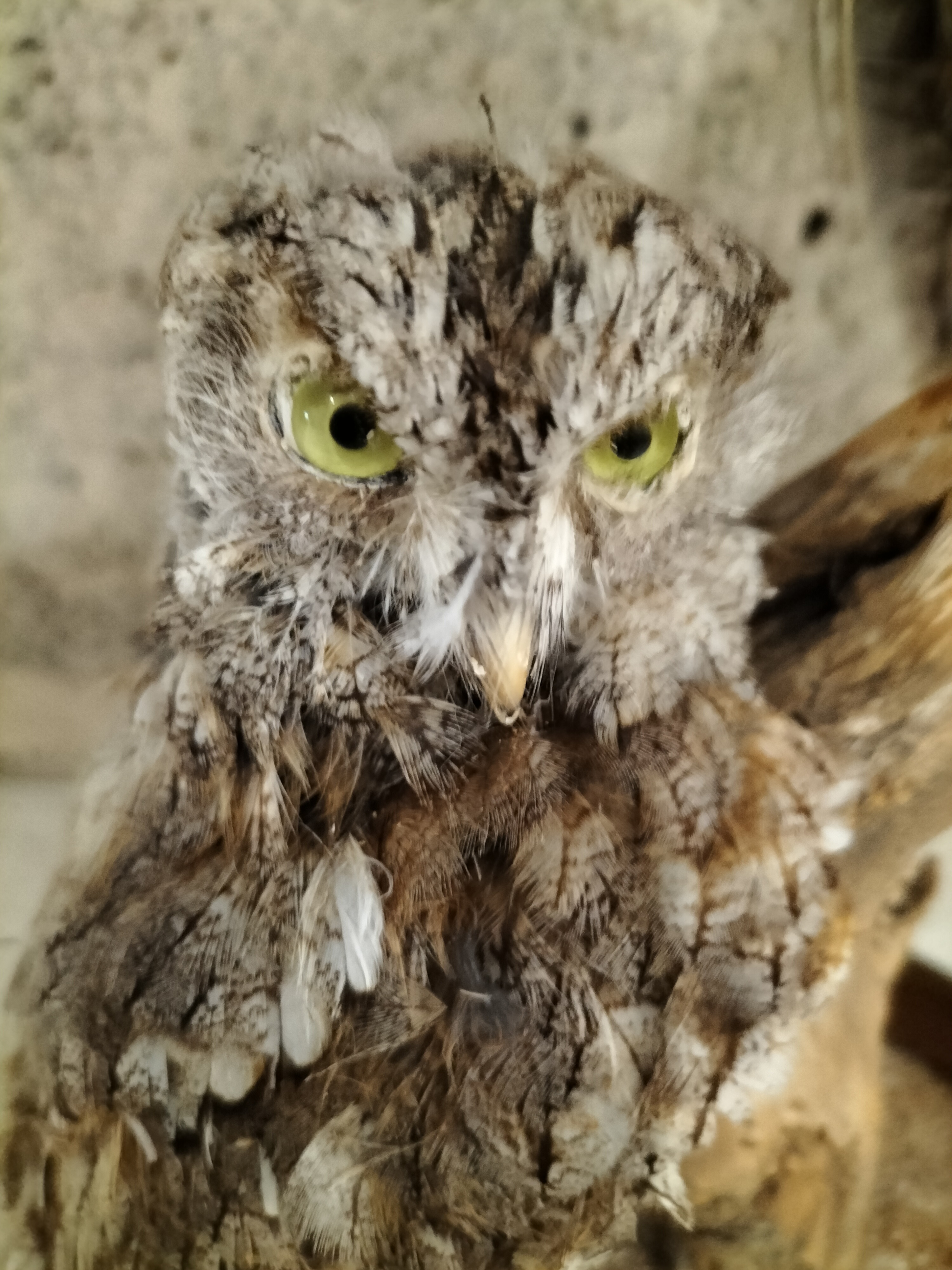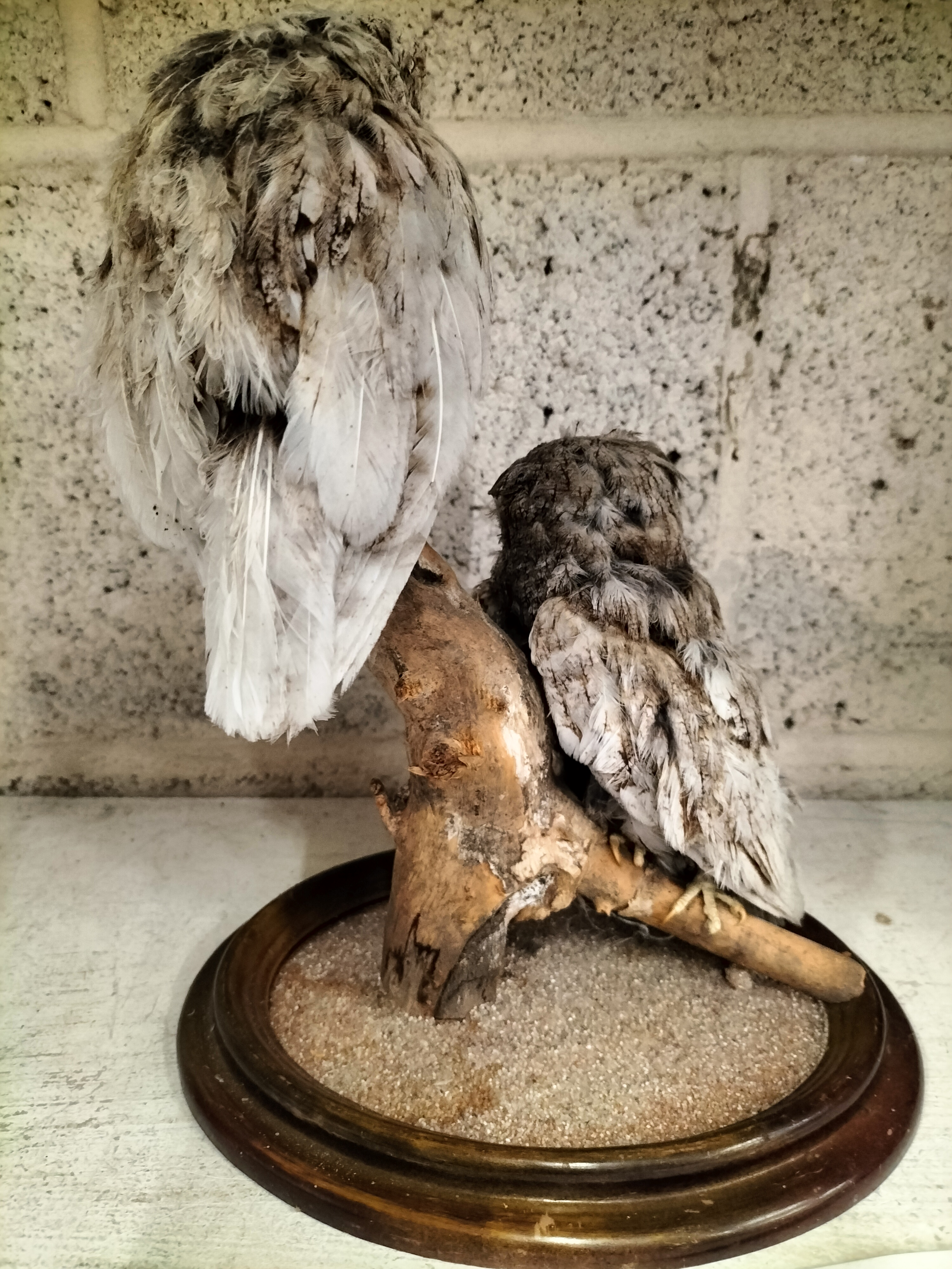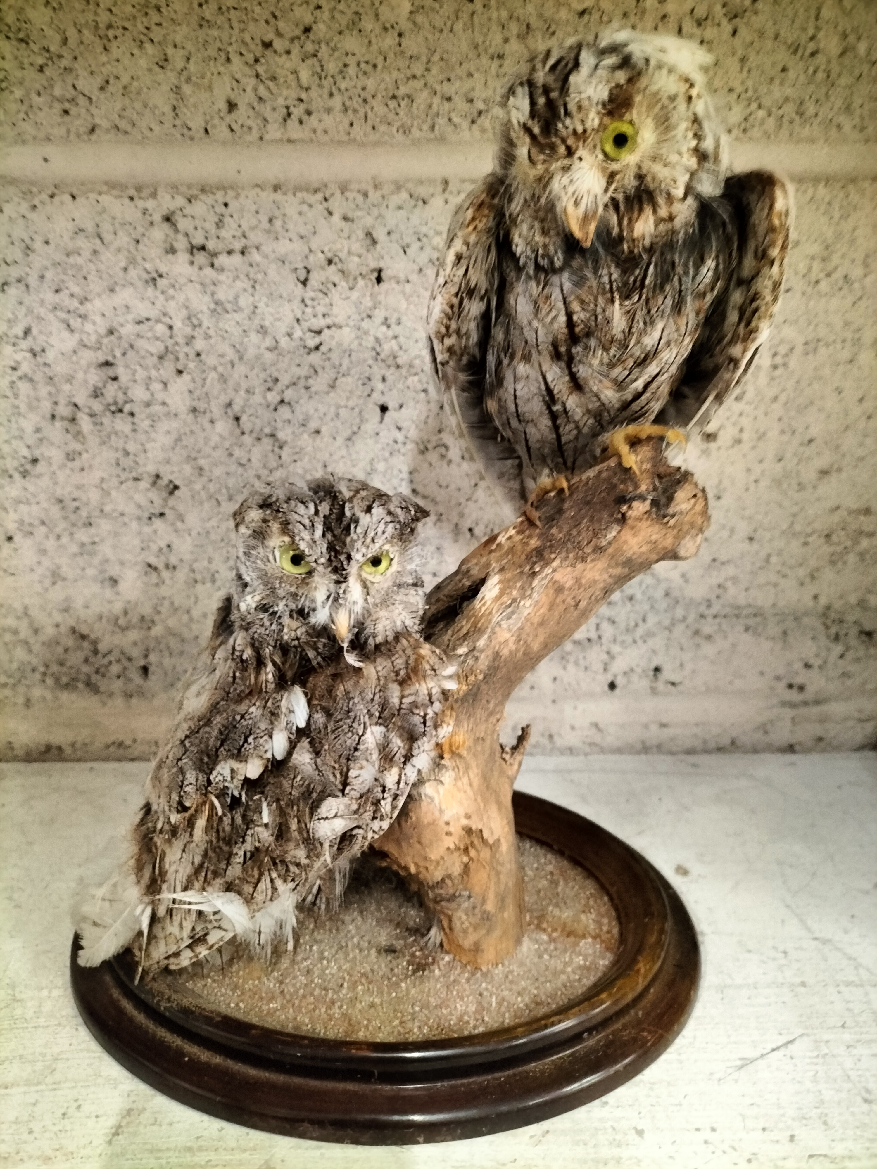 A naturalistic taxidermy mount featuring a pair of small owls, likely Eastern Screech Owls (Megascops asio) or a similar Scops species (Otus sp.). The specimens are positioned on a weathered driftwood branch, mounted upon a circular, dark-stained wooden base. The base features a grooved rim intended for a glass cloche and is finished with a sandy substrate. This style of display is characteristic of late 19th or early 20th-century natural history preservation. No taxidermist’s labels or provenance are present. Please note that these species are subject to international and local trade regulations; buyers must ensure compliance with relevant wildlife legislation such as CITES or the Migratory Bird Treaty Act.