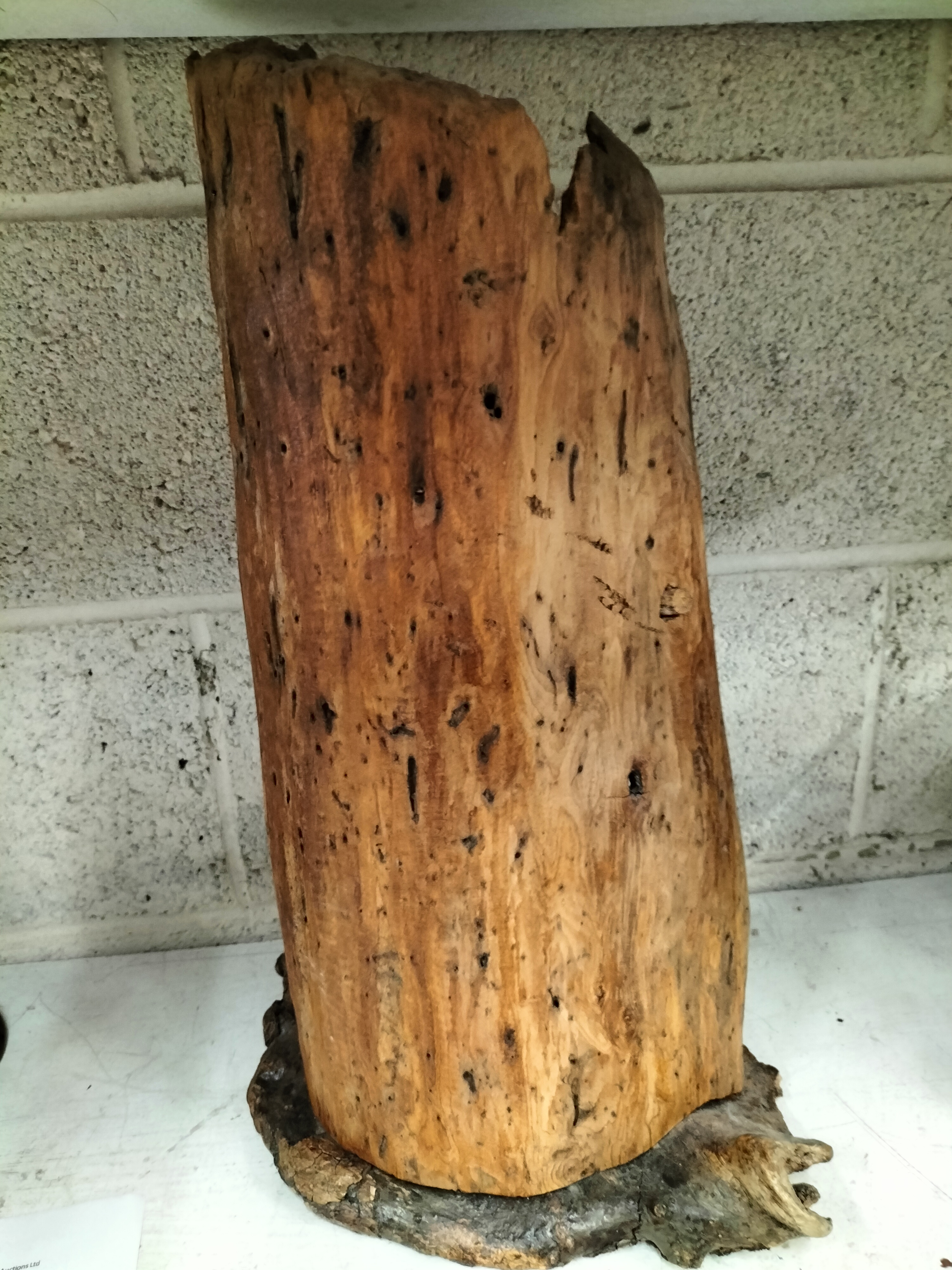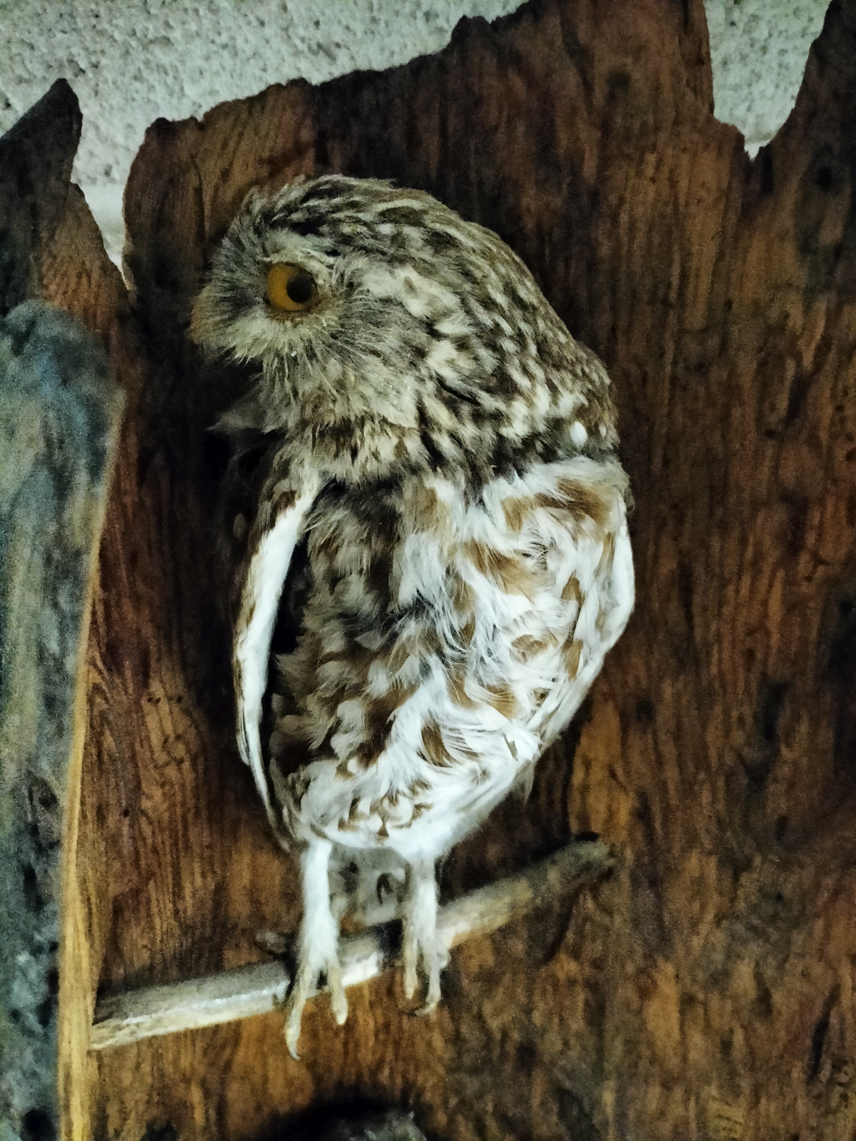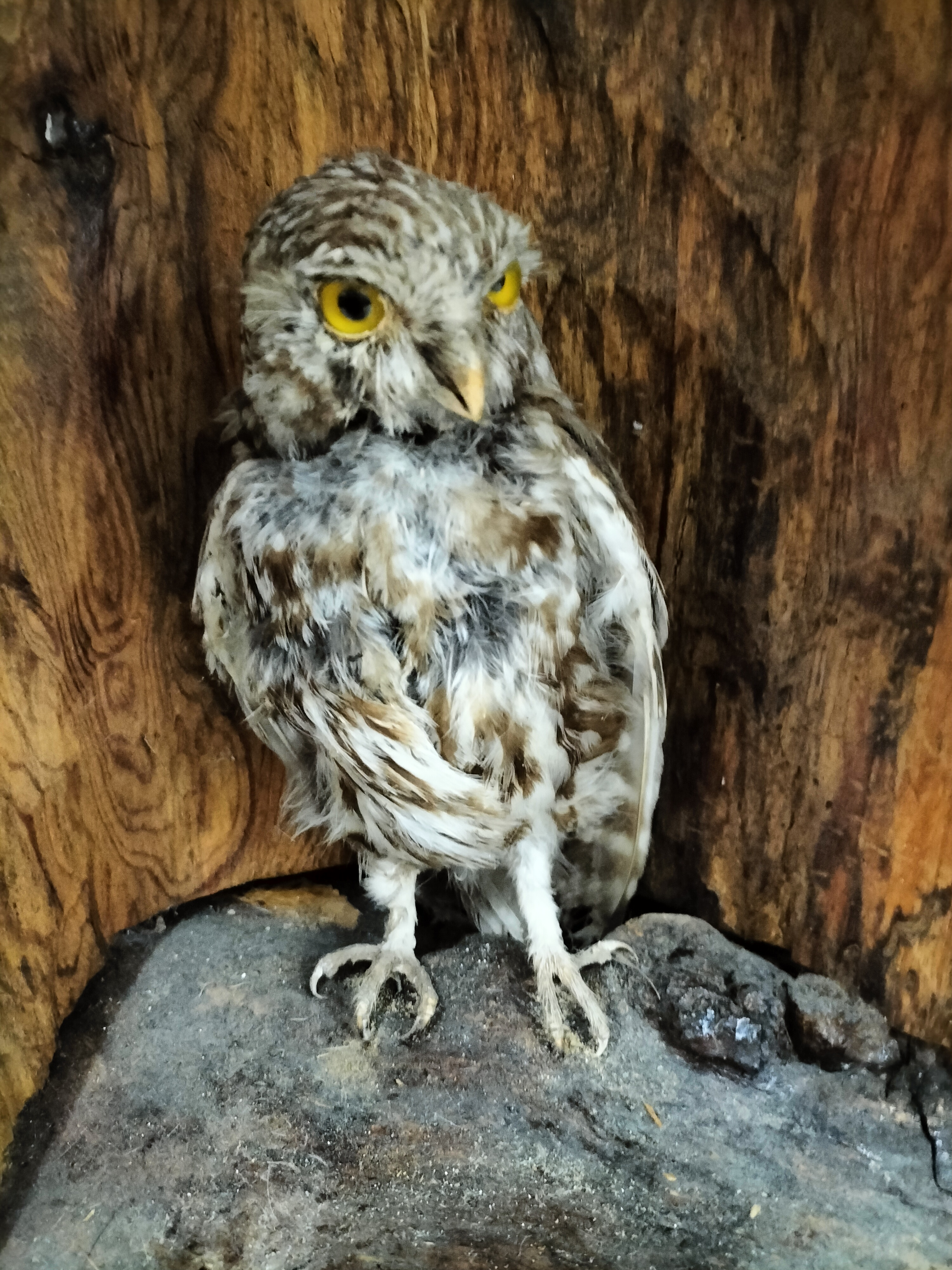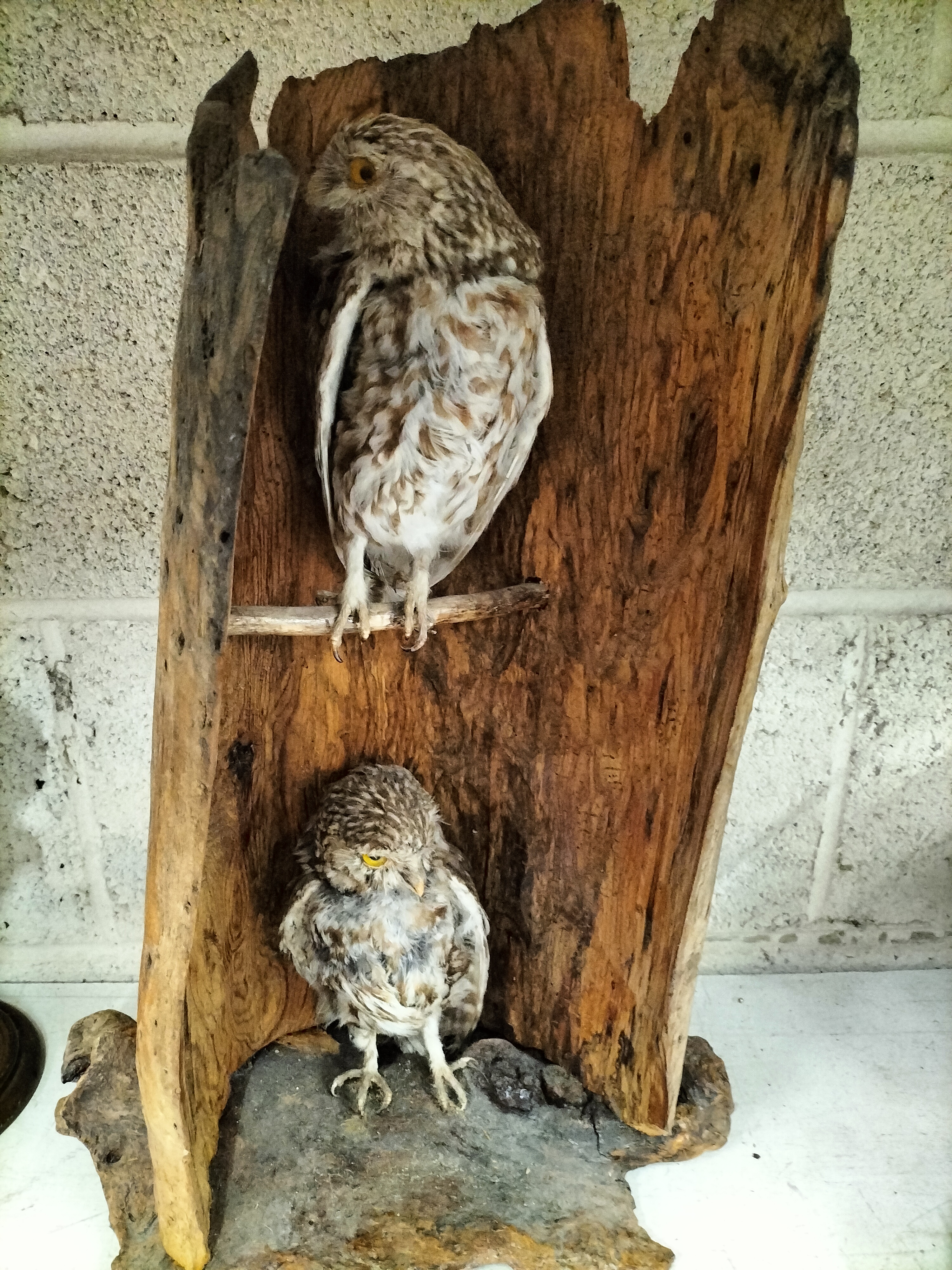A naturalistic composition featuring a pair of Little Owls (Athene noctua). The specimens are presented as full-body taxidermy mounts within a large, vertically-oriented hollowed-out section of a tree trunk, designed to simulate a natural nesting or roosting cavity. One specimen is perched on a small horizontal twig within the niche, while the second stands at the base on a simulated stony floor. The entire trunk section is mounted onto a larger, irregular natural wood base. As a member of the Strigiformes order, this species is listed under CITES Appendix II. Potential buyers are advised to ensure compliance with local wildlife protection regulations and CITES requirements for international transport. No maker’s marks or collection history are present.
