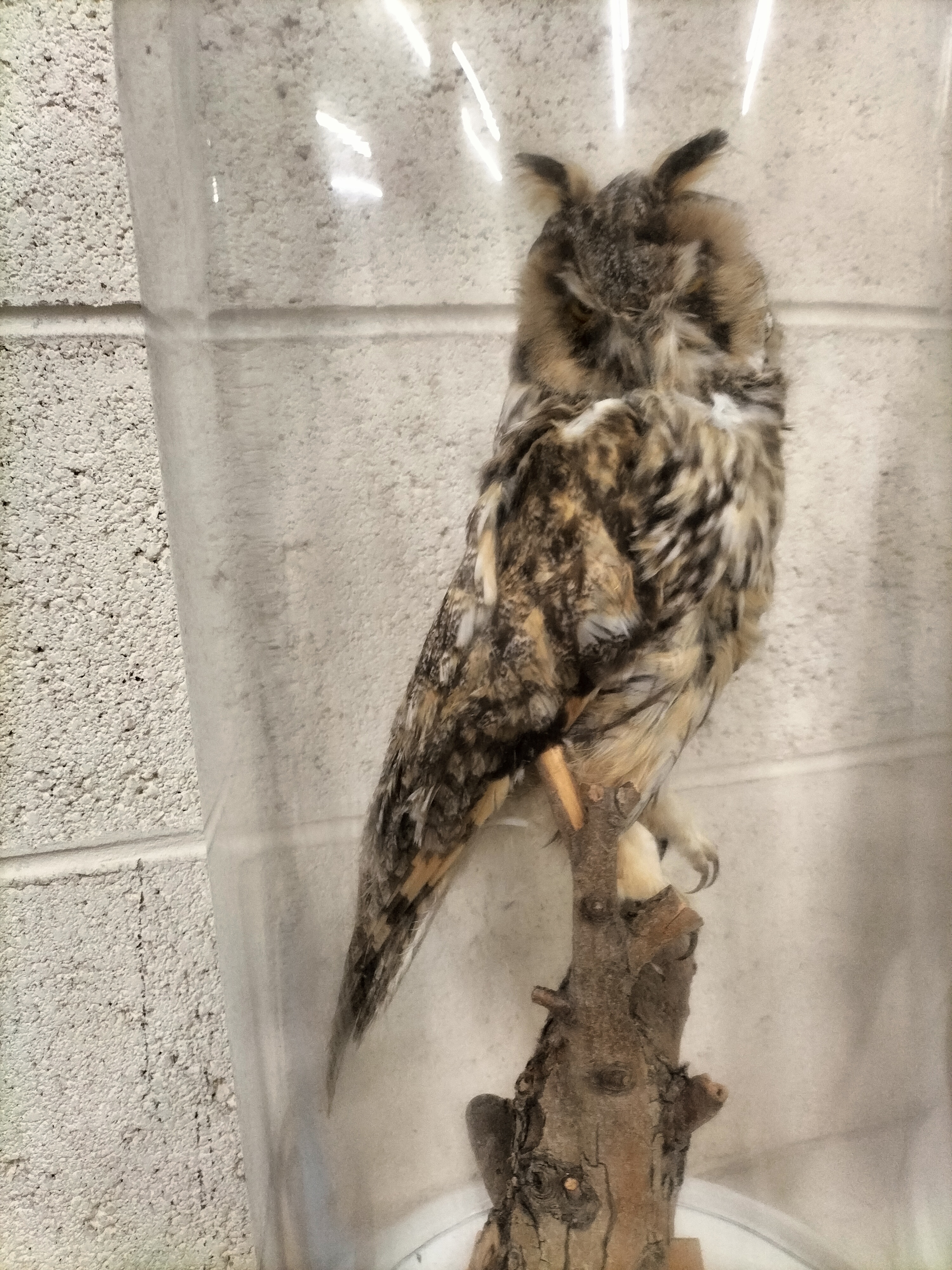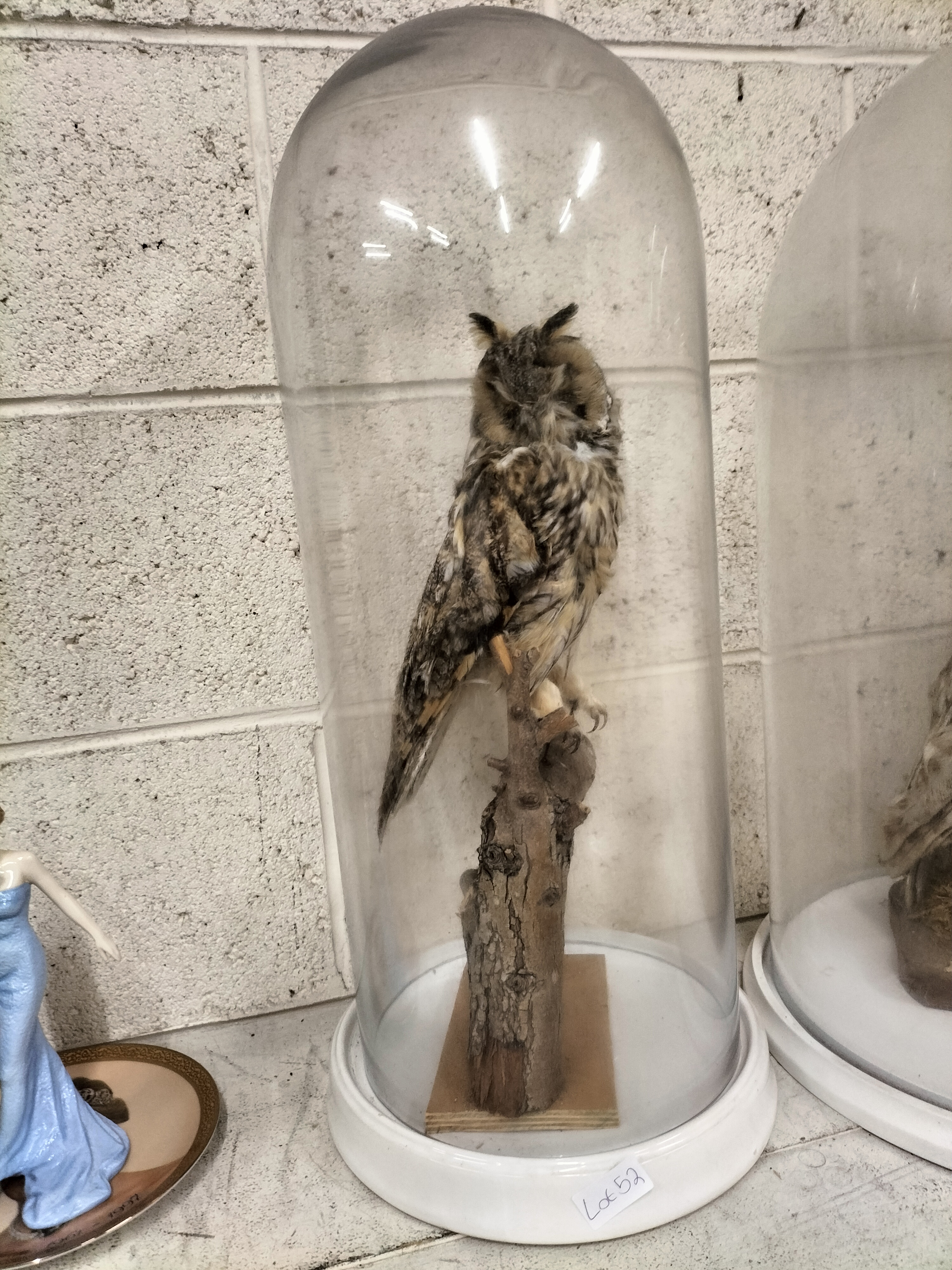 A professionally prepared taxidermy specimen of a Long-eared Owl (Asio otus). This full-body mount features the bird naturally perched on a section of weathered wooden branch, presented in a three-quarter profile. The specimen is housed within a tall, clear display dome (cloche) resting on a white, circular, stepped base. The mount captures the characteristic facial disk and prominent ear tufts of the species. Please note that the sale of this specimen may be subject to CITES or local wildlife protection regulations; it is the responsibility of the buyer to ensure compliance with relevant laws and permit requirements.