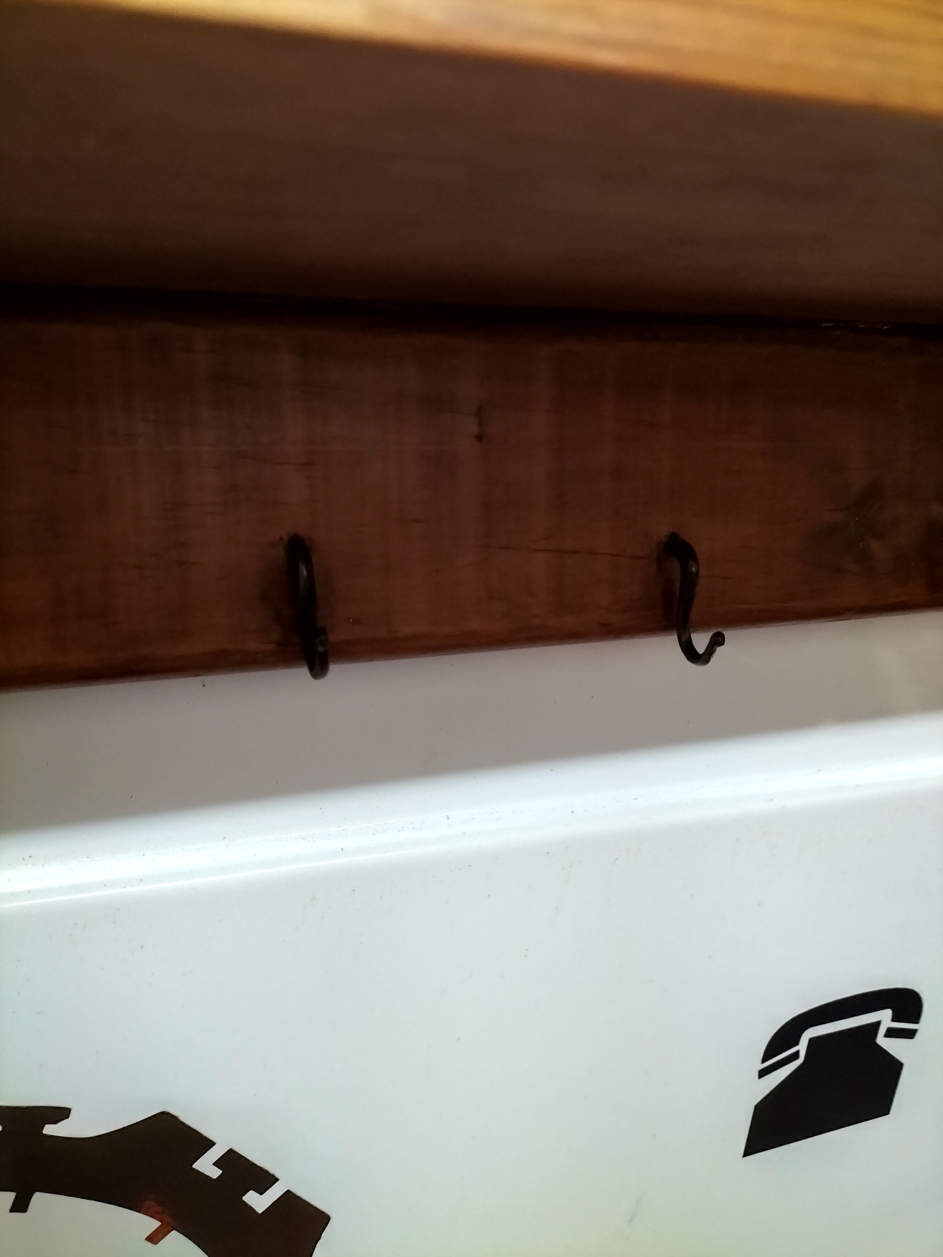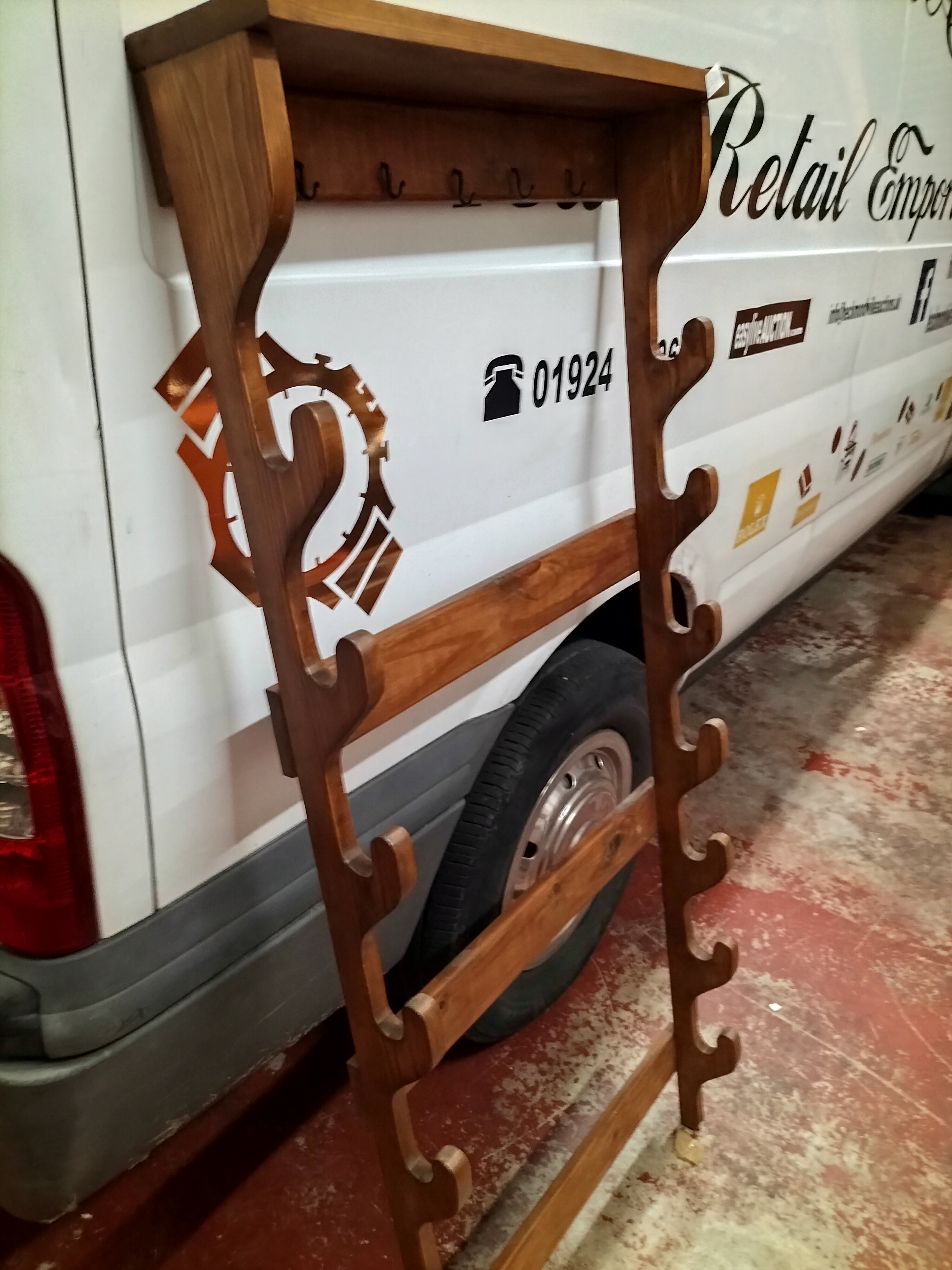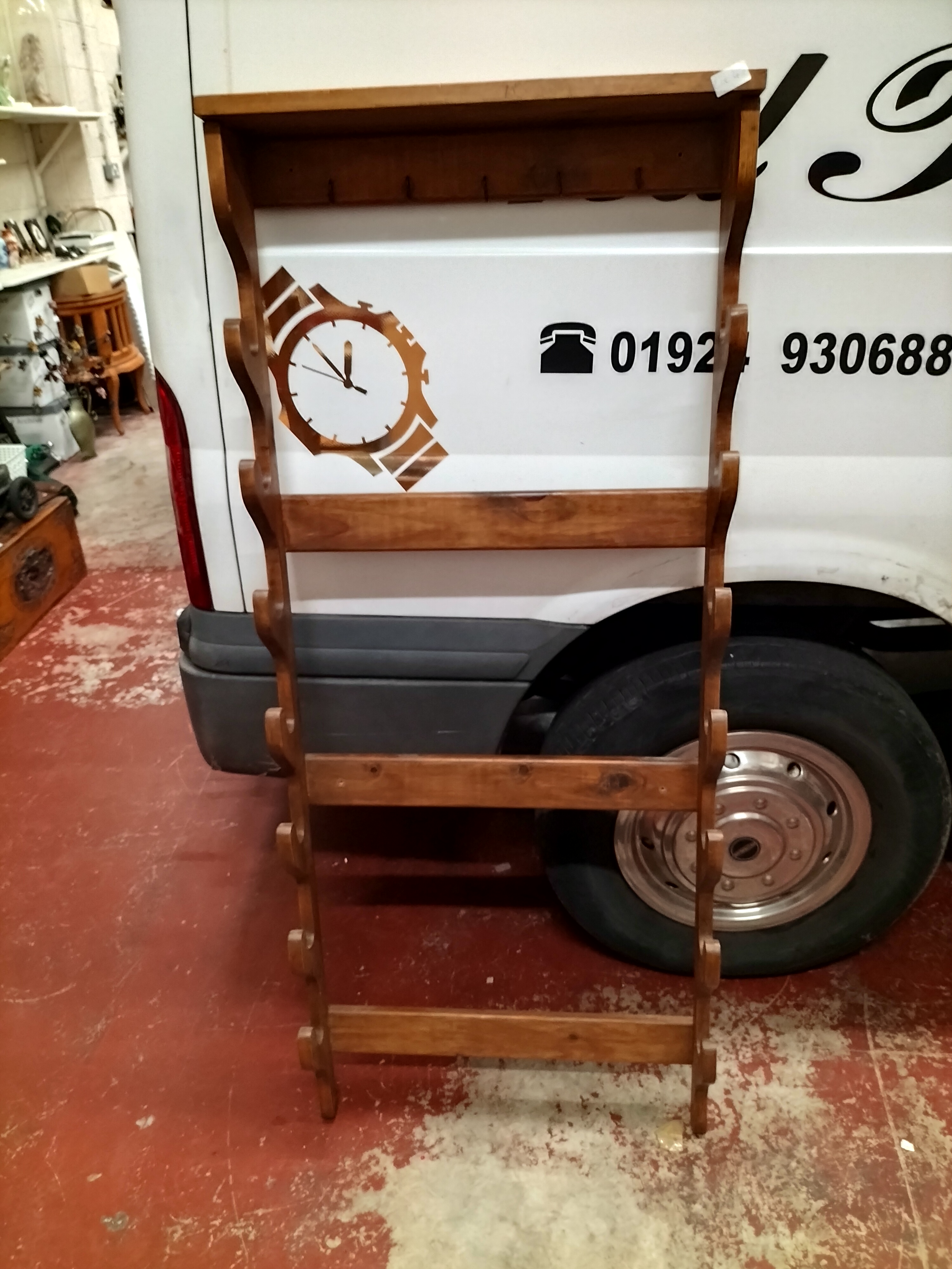 A wall-mounted display rack constructed from stained wood with a medium-brown finish, designed for the horizontal storage of firearms or fishing rods. The piece features a flat top shelf positioned above a row of small, black-finished metal hooks. The two vertical side supports are prominently notched to accommodate several items. The structure is reinforced by three horizontal cross-slats. The design reflects a rustic or farmhouse aesthetic, suitable for utilitarian display.
