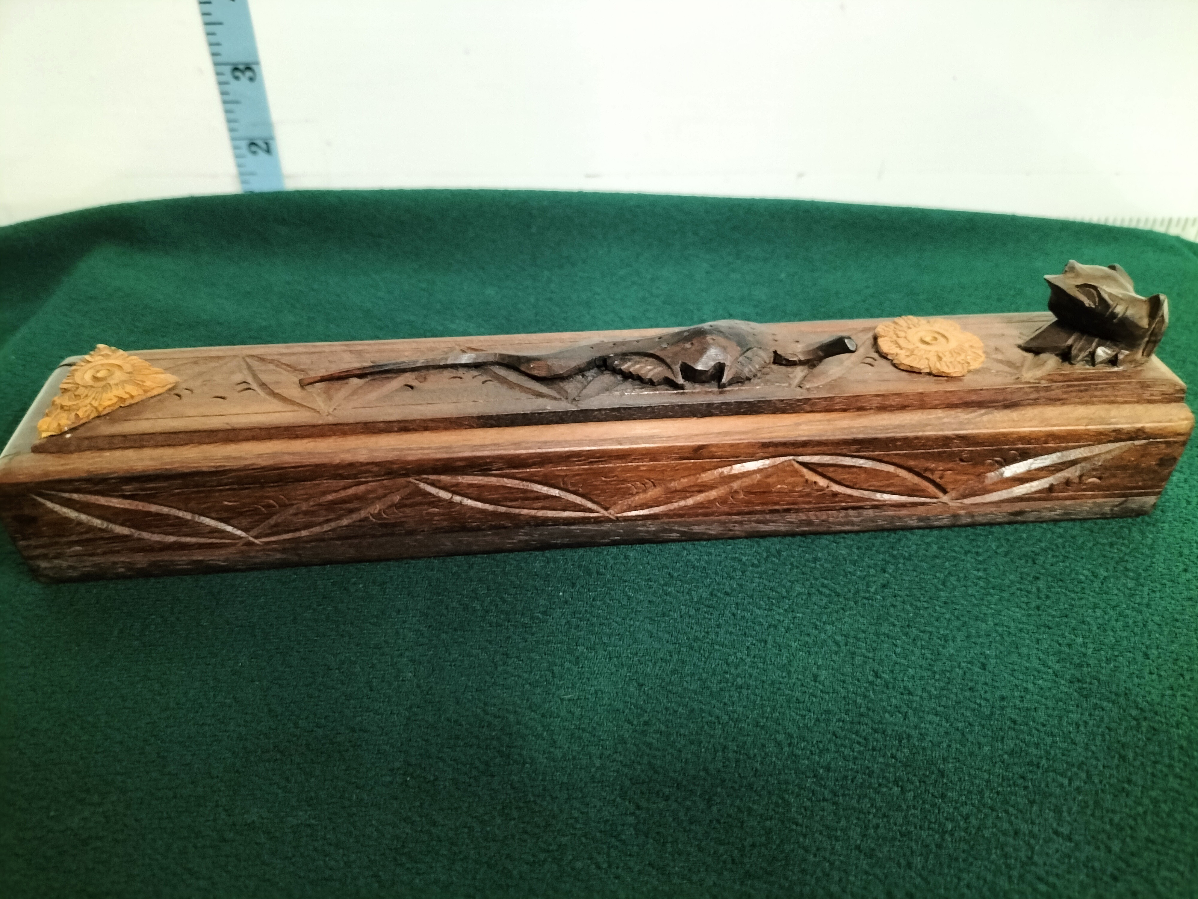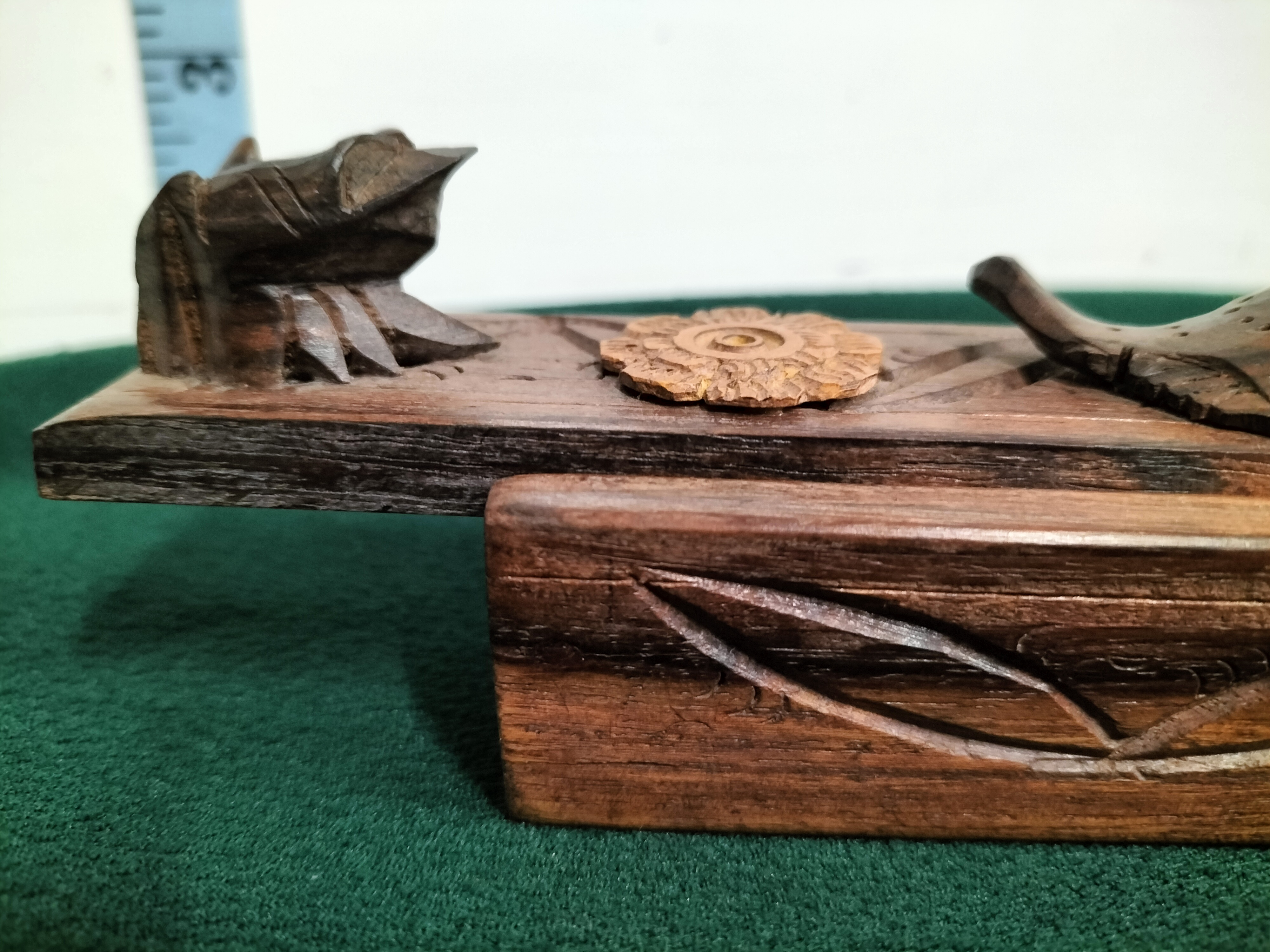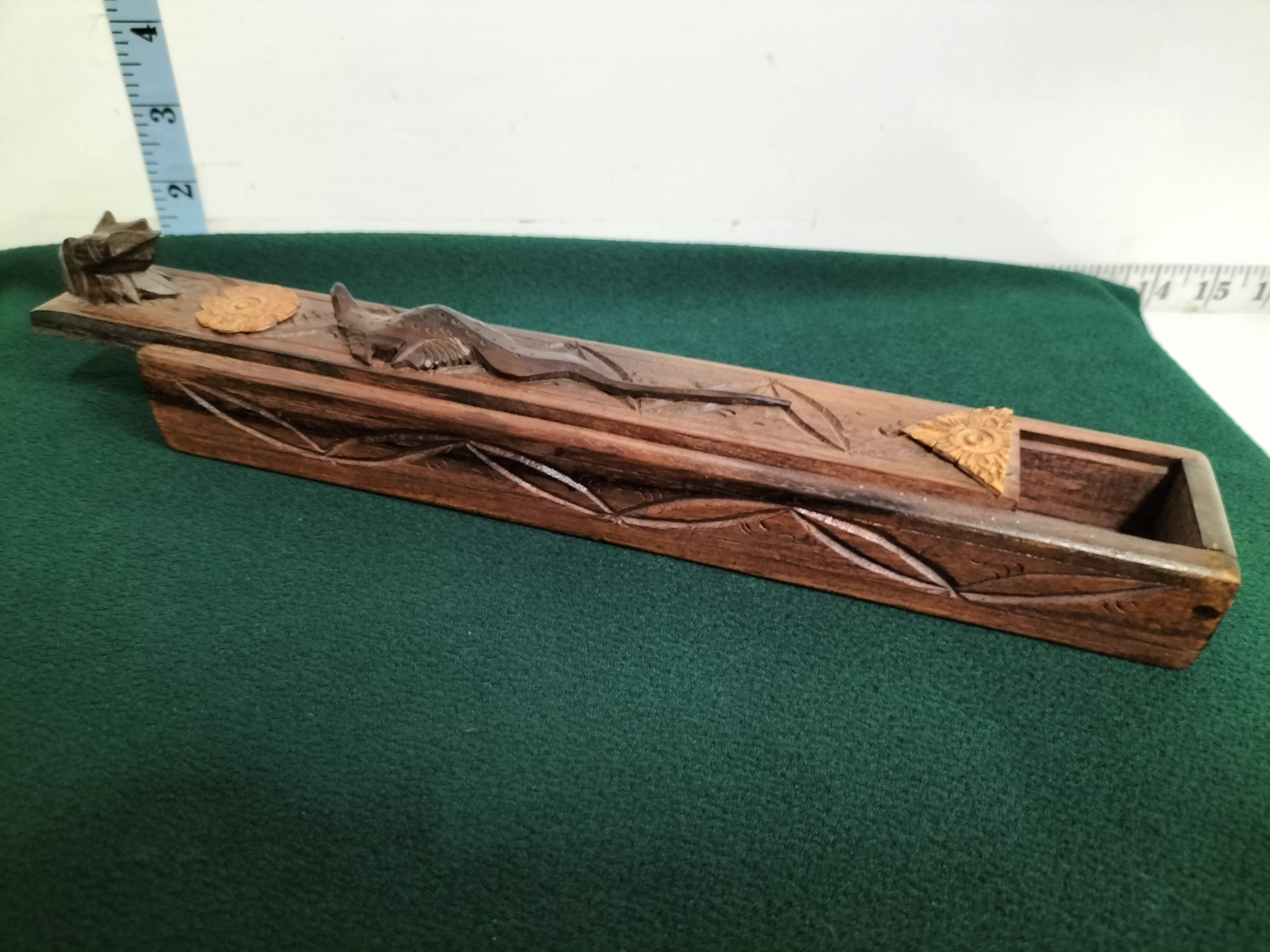 A vintage Balinese hand-carved decorative wooden box, traditionally utilised for the storage of incense sticks or small personal items. This folk art piece is meticulously crafted from a dark-toned tropical hardwood and features a functional sliding lid mechanism. The lid is embellished with high-relief carvings of a frog and a lizard, alongside applied lighter-coloured carved floral rosettes. The longitudinal sides are decorated with incised repeating leaf patterns. The style is indicative of mid-20th century Southeast Asian craftsmanship, specifically from the Bali region. The box exhibits no visible maker’s marks or signatures. Length: approximately 10.5 inches.