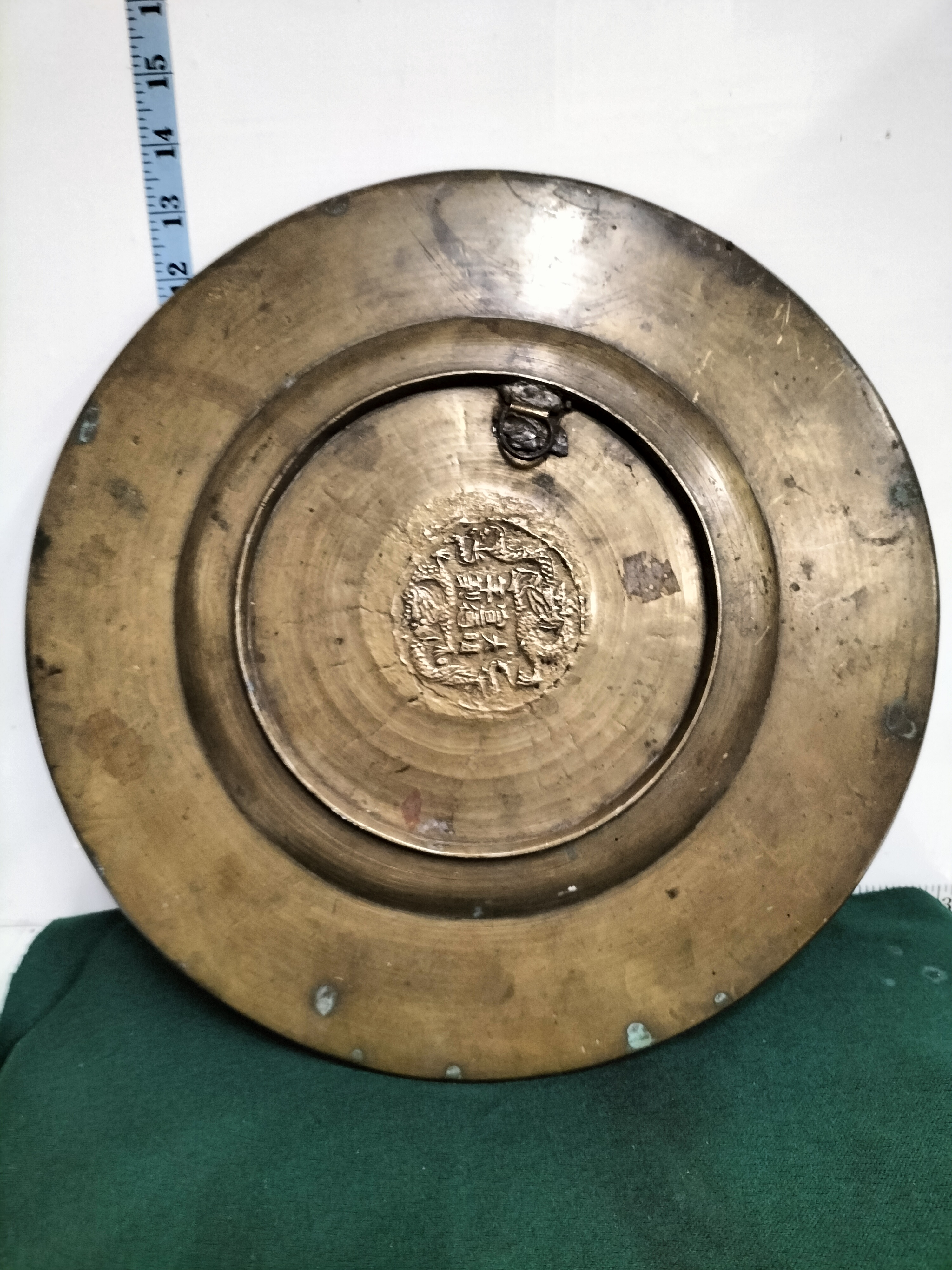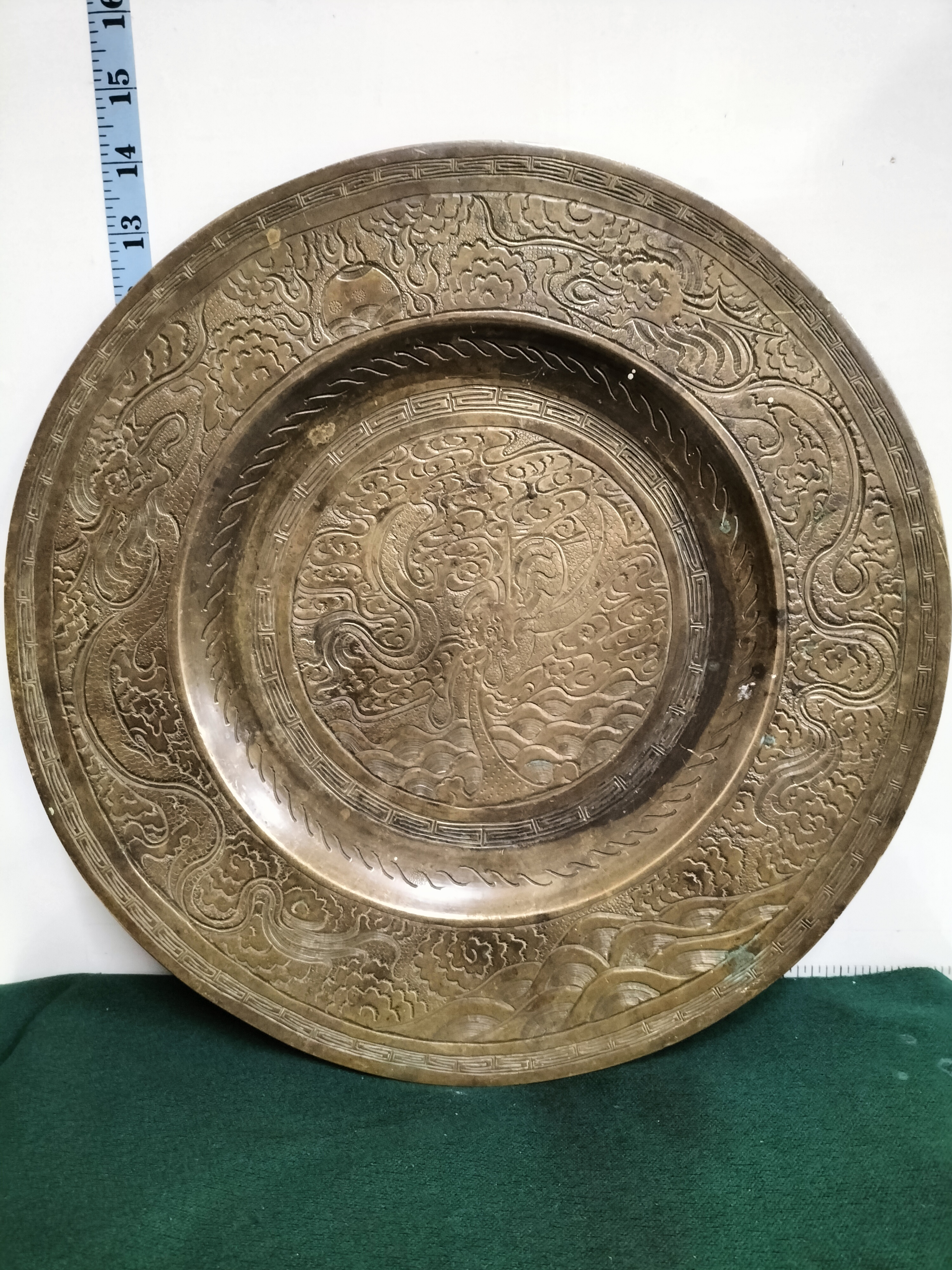 A substantial Chinese brass charger dating to the late Qing Dynasty or early Republic period. The piece features intricate chased and embossed decoration, with the central well depicting a powerful five-clawed dragon writhing amidst stylised auspicious clouds. The broad rim is similarly decorated with dragons and clouds above a band of crashing waves, all contained within a classic key-fret border. The reverse is finished with a central medallion containing an apocryphal four-character mark in relief reading 宣德年製 (Xuande nian zhi – Made in the Xuande Reign), flanked by two dragons. The charger is fitted with a small mounting ring for display. Diameter: Approximately 14.5 inches (36.8 cm).