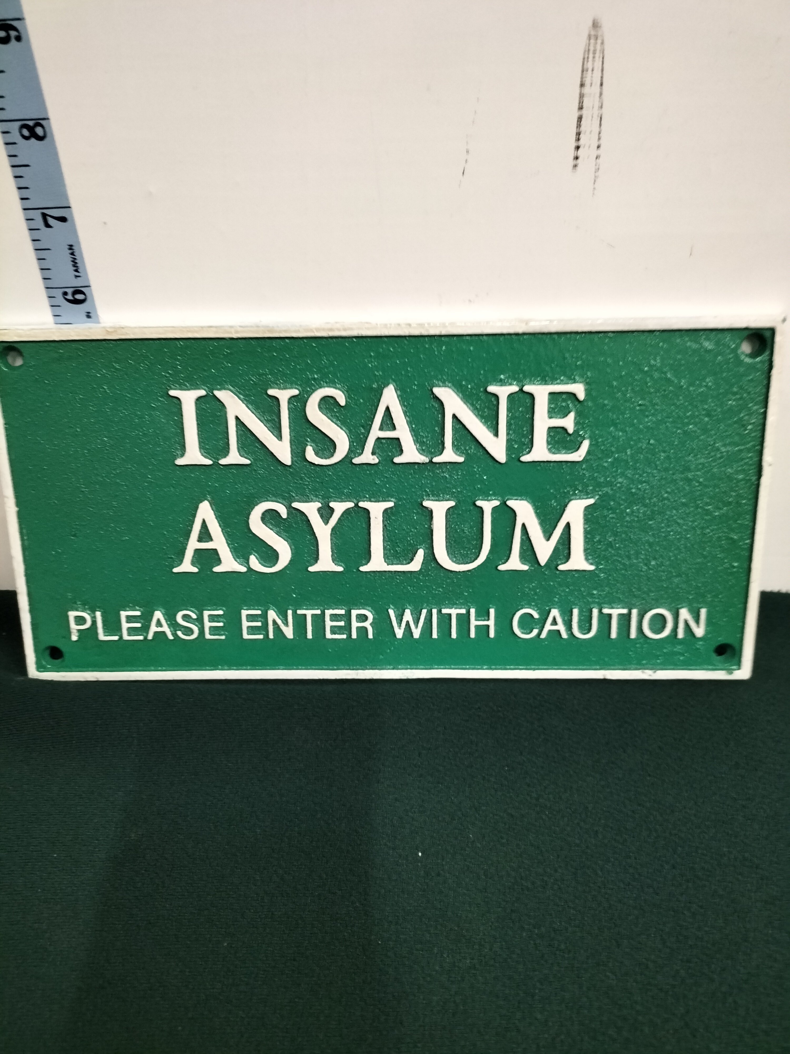 This is an unbranded contemporary novelty wall sign produced in the style of a vintage institutional plaque. The rectangular sign is manufactured from heavy cast iron with a pebbled texture and finished in a forest green colour. The face features raised white lettering that reads INSANE ASYLUM in a serif font, with the warning PLEASE ENTER WITH CAUTION in a smaller sans-serif font below. The sign is designed for wall mounting and includes four pre-drilled holes at the corners. Dimensions: Approximately 27 cm x 13 cm (10.5 inches x 5 inches).