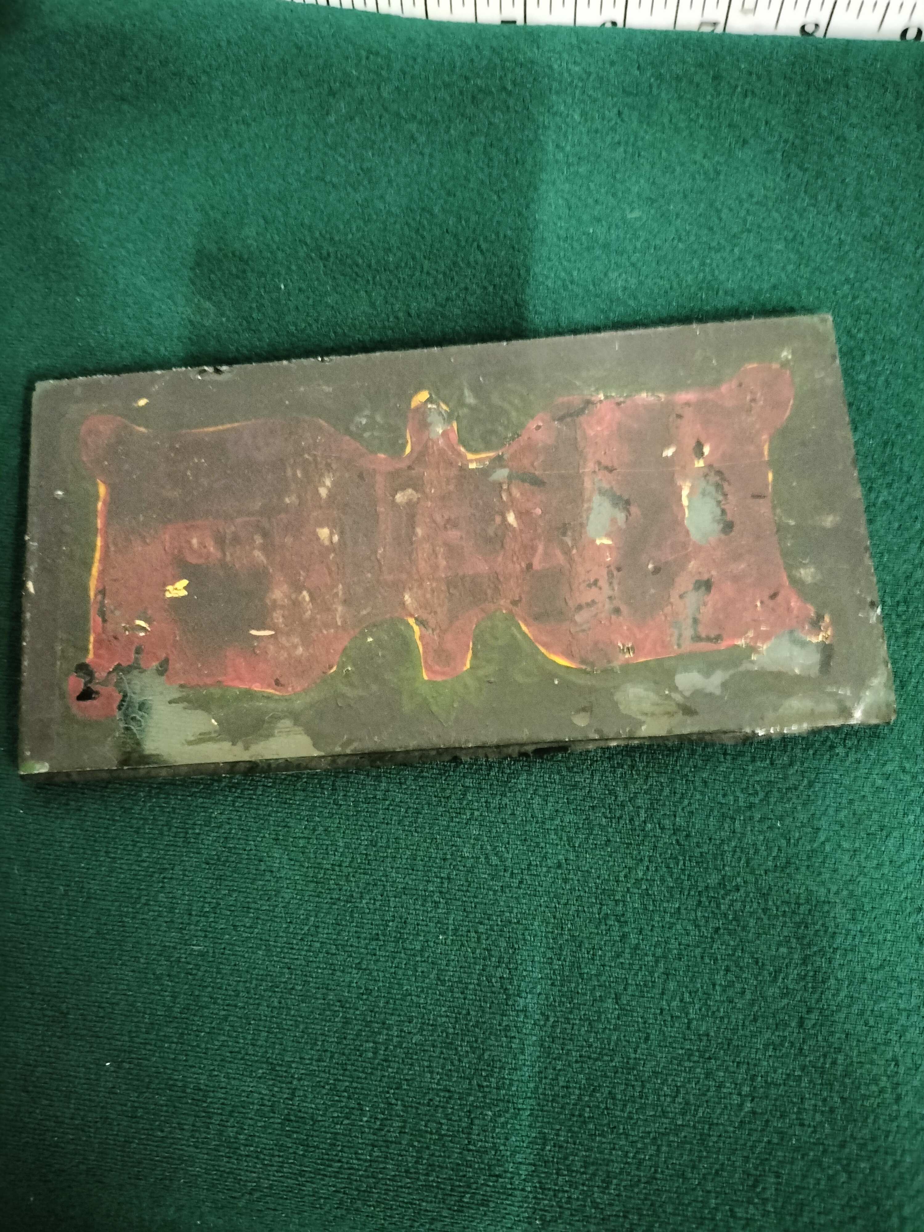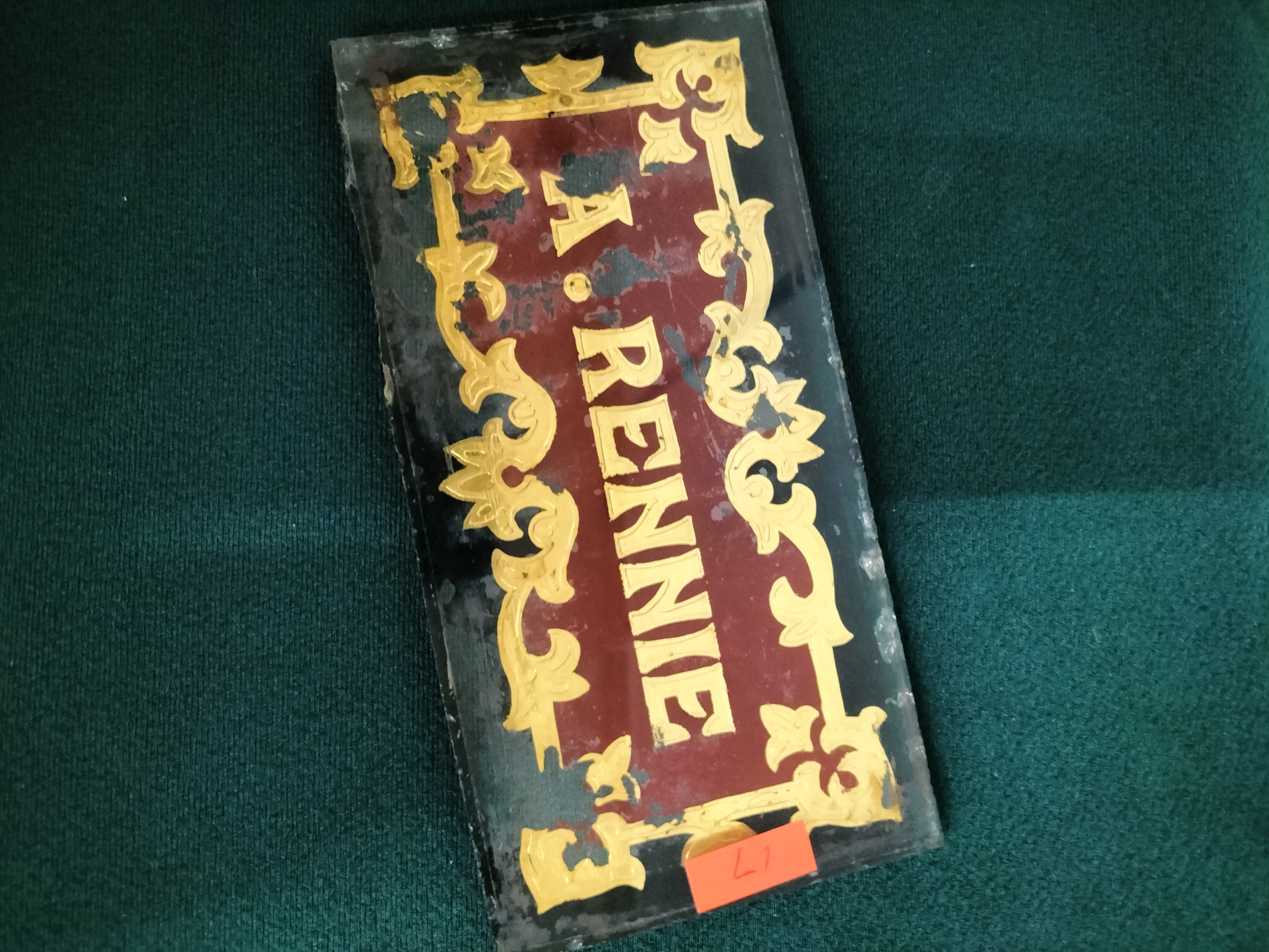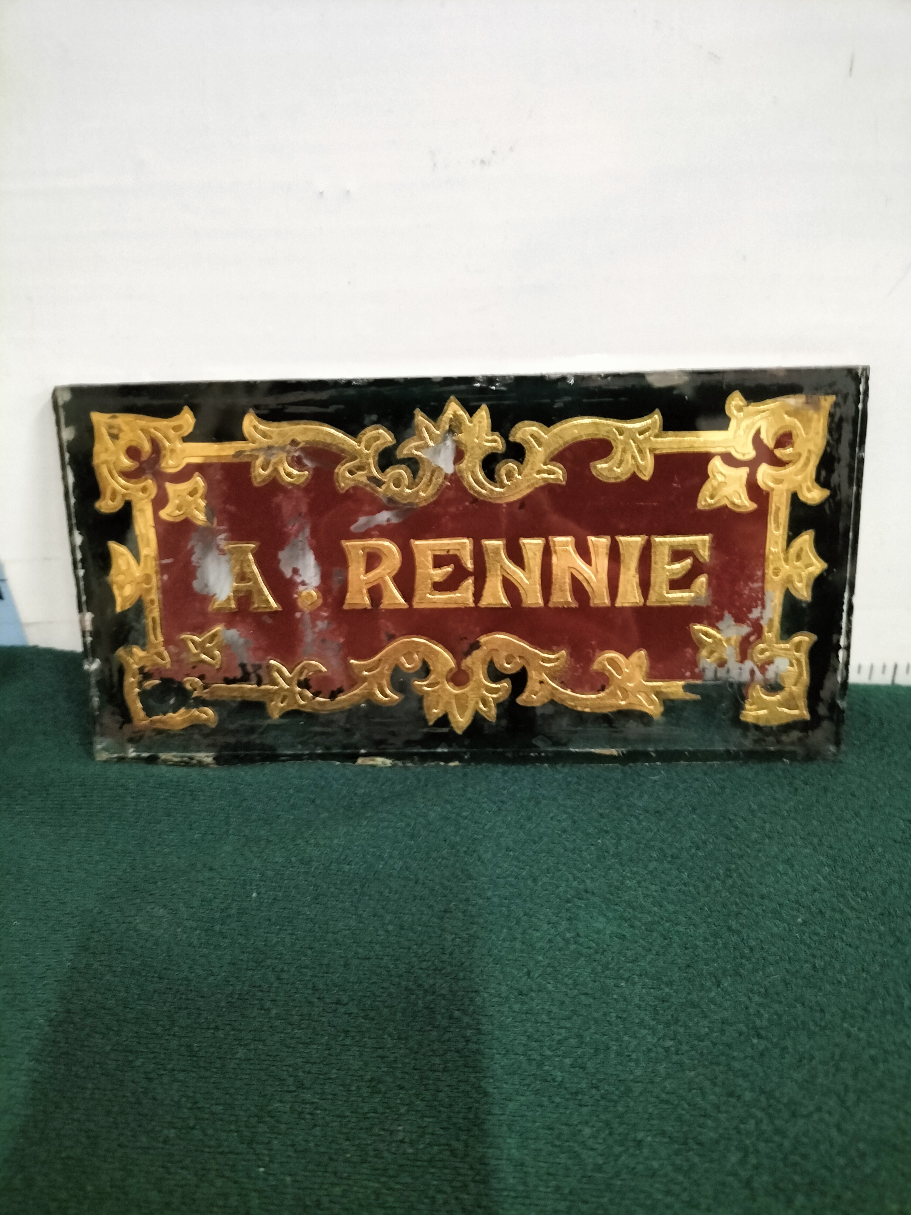 An original Victorian or Edwardian era professional nameplate or office shingle. This rectangular sign is crafted from heavy plate glass using the reverse-painted eglomisé technique. It features the name A. RENNIE in bold, gilded serif lettering set within a deep burgundy centre field. The composition is framed by an elaborate, ornate rococo-style scrollwork border in gold leaf, all set against a black background. The highly decorative typography and scrollwork are characteristic of the late 19th to early 20th century. Dimensions: 9 inches x 4.5 inches.