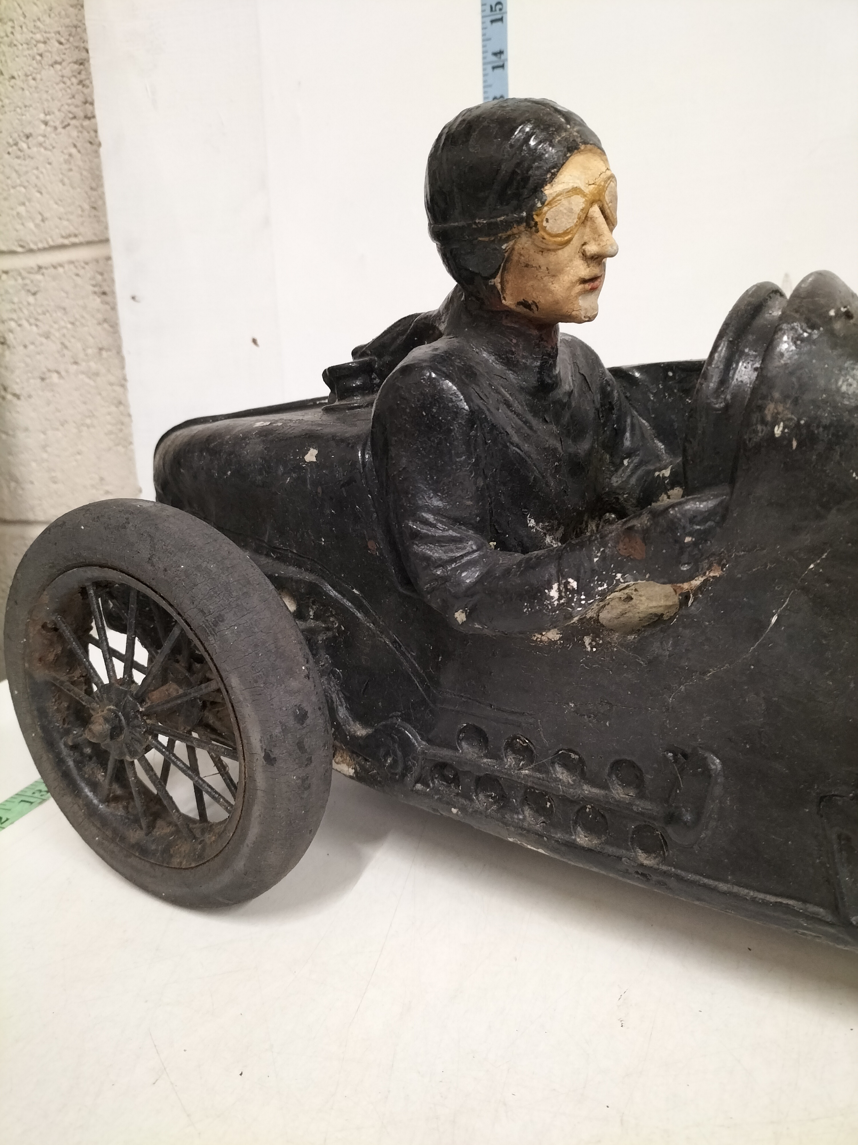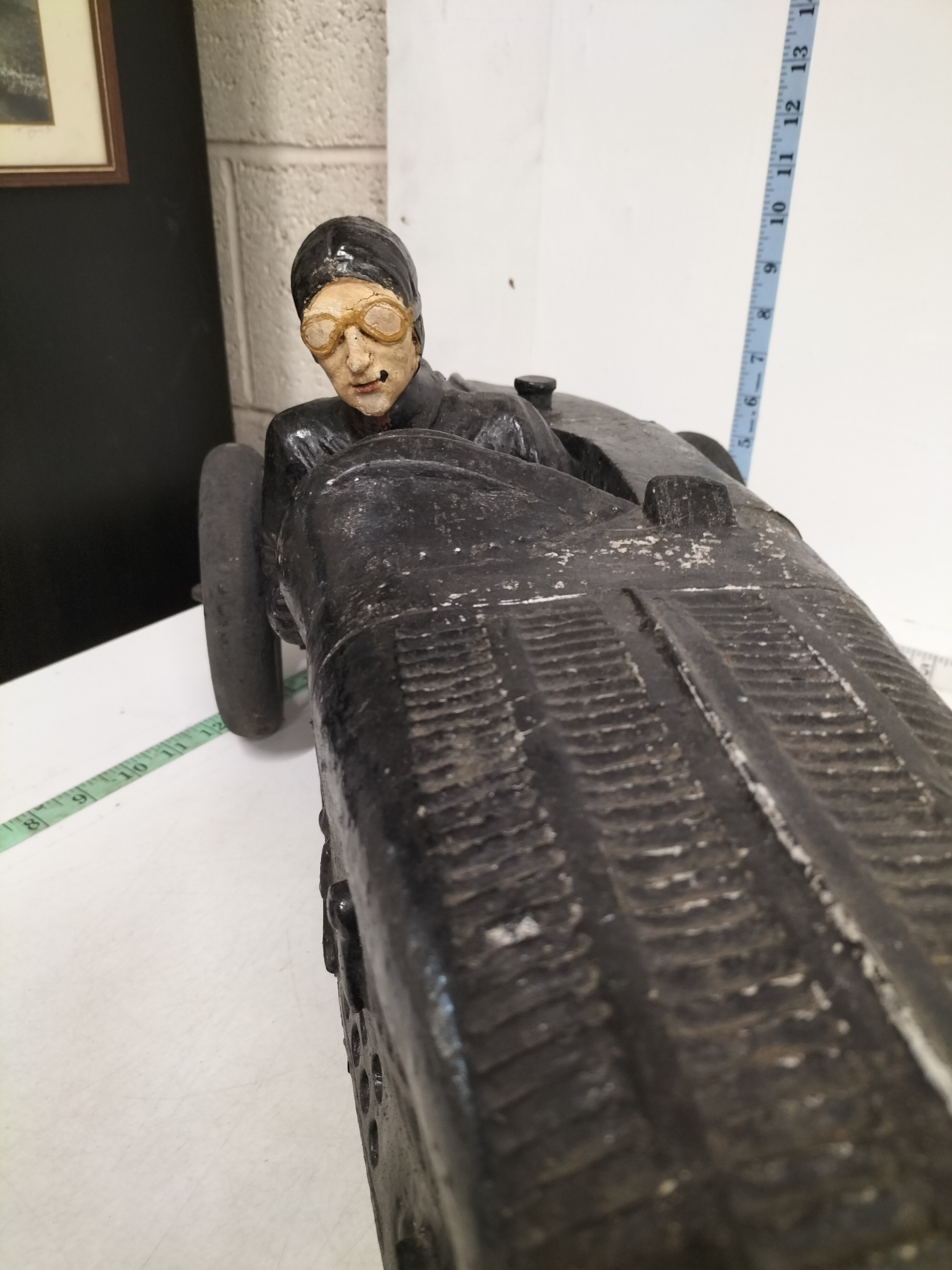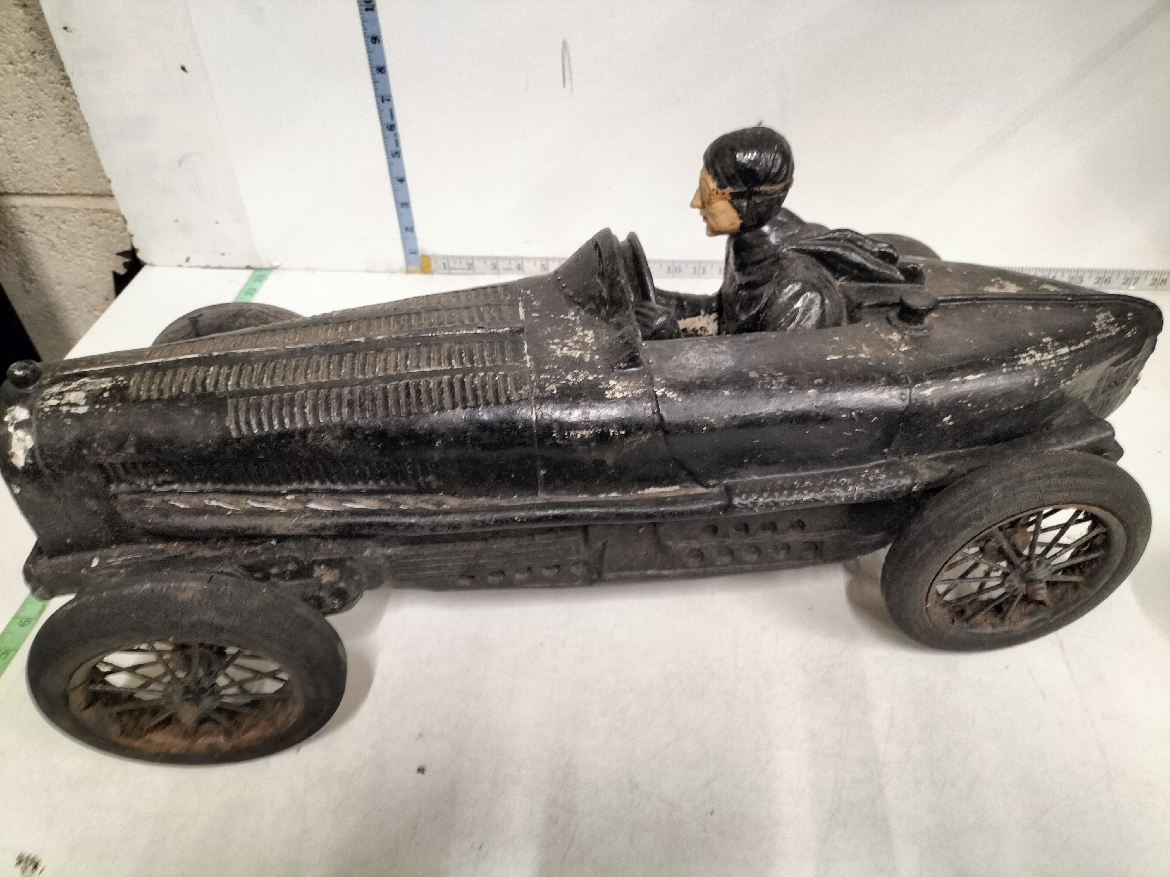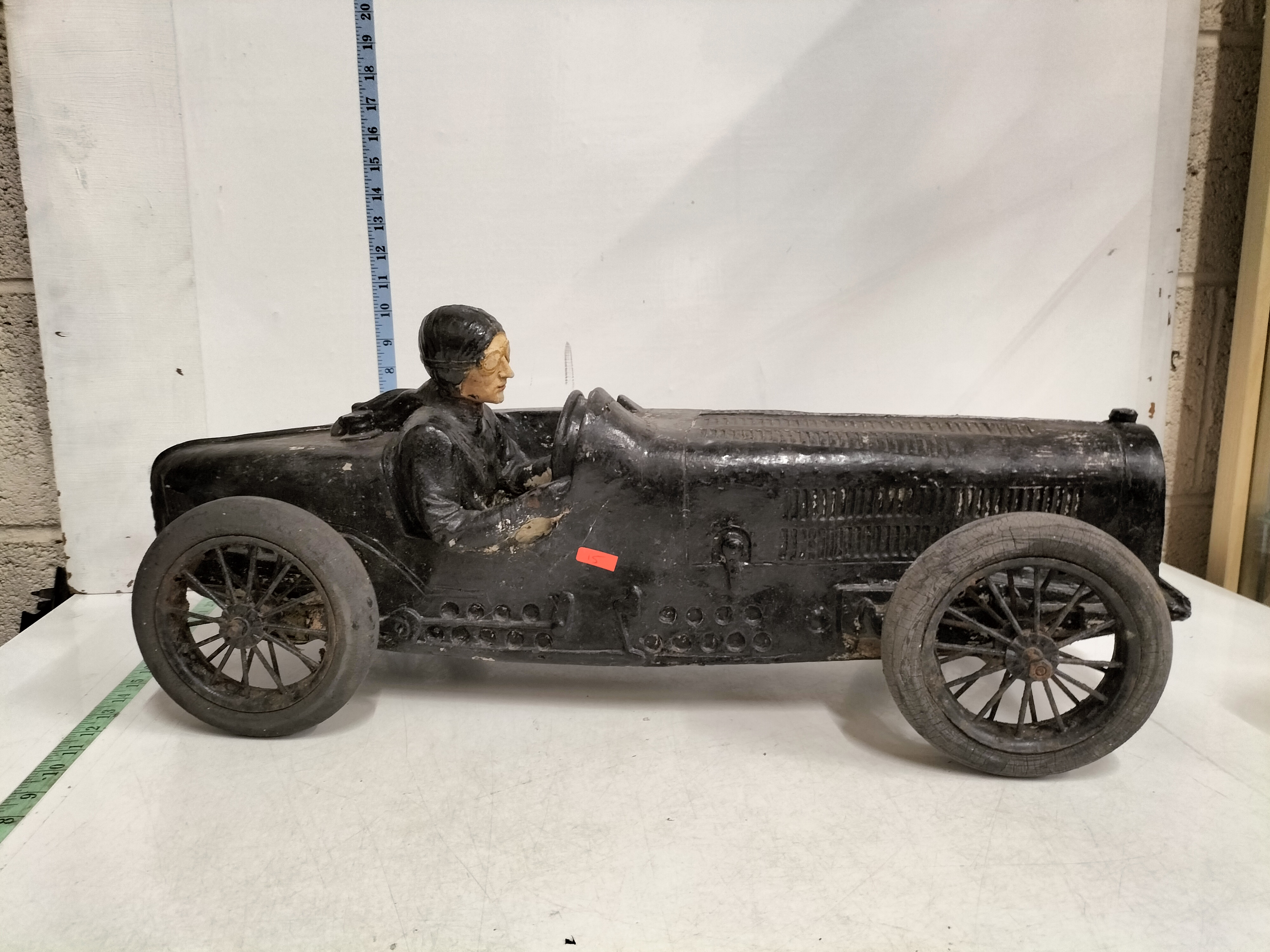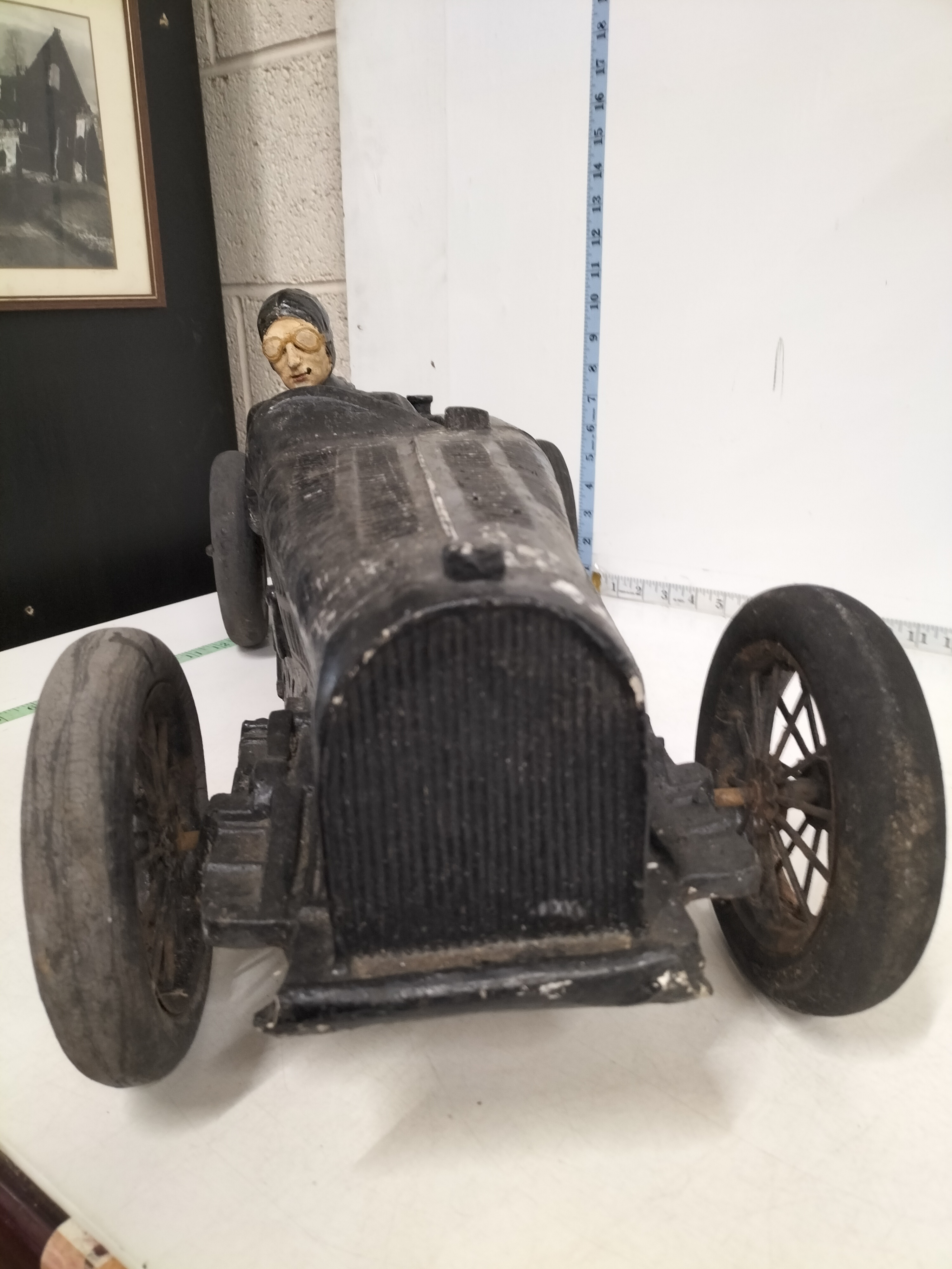 This impressive, large-scale automobilia piece depicts an early open-cockpit racing car in a style synonymous with the Golden Age of Grand Prix racing, specifically evocative of a 1920s Bugatti Type 35. The car features a prominent horseshoe-shaped radiator, moulded bonnet louvres, and external exhaust pipe detailing. Seated in the cockpit is a fixed driver figure in period-correct racing attire, including a leather-style cap and goggles. The model is constructed from heavy cast metal and is fitted with four wire-spoke wheels with composite rubber-style tyres. While unsigned, this piece is a later decorative reproduction of a vintage racer, serving as a substantial display item for an automotive enthusiast. Transcription: 45 (on orange sticker). Date: Mid-20th Century. Manufacturer: Unsigned. Length: 22 inches, Height: 14 inches, Width: 9 inches.