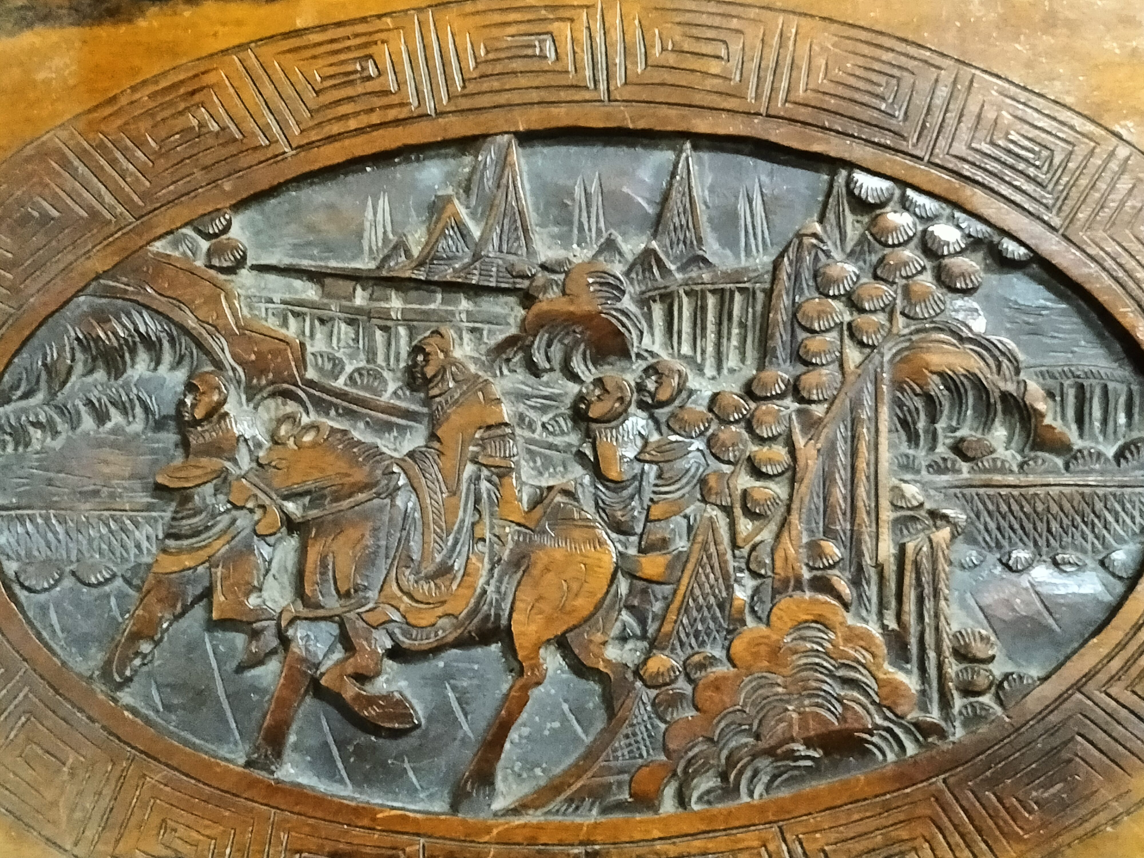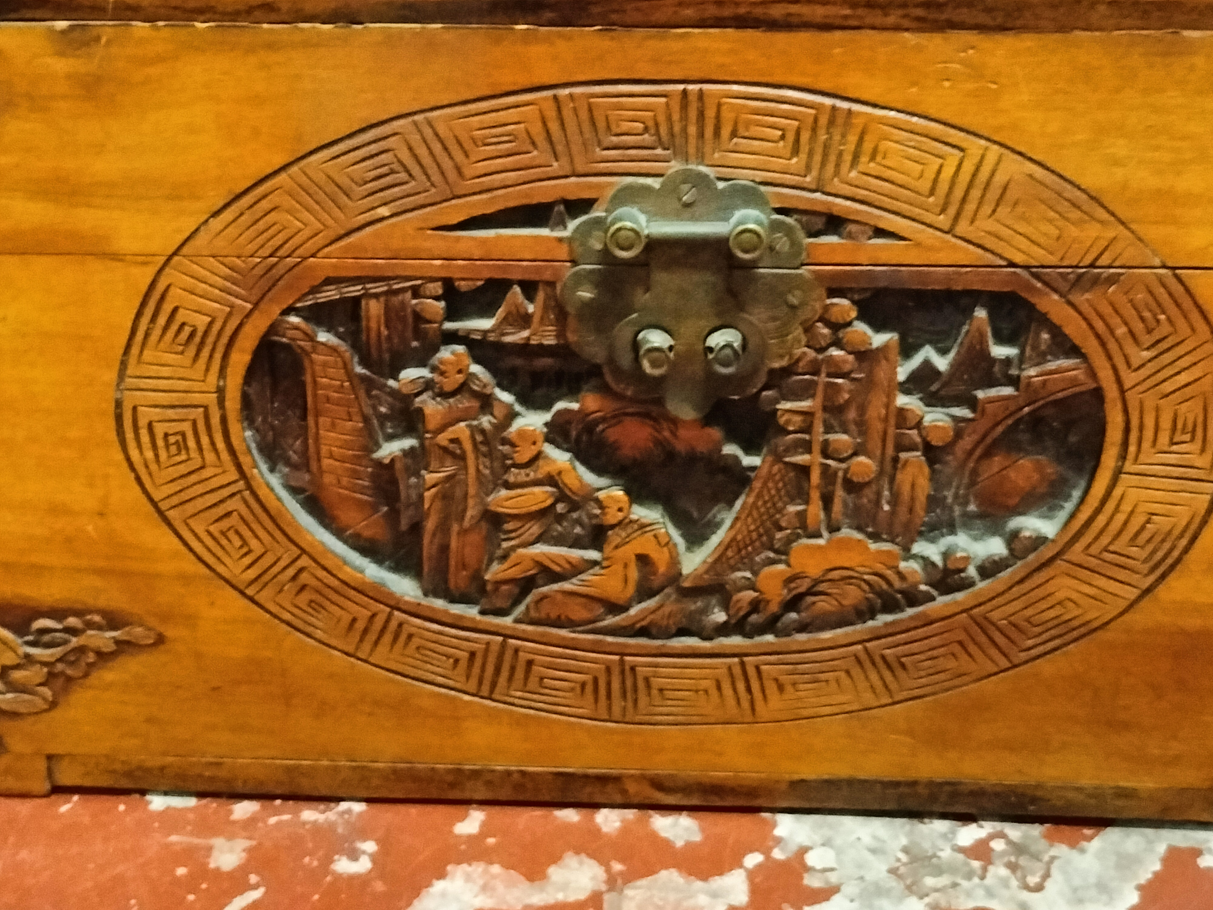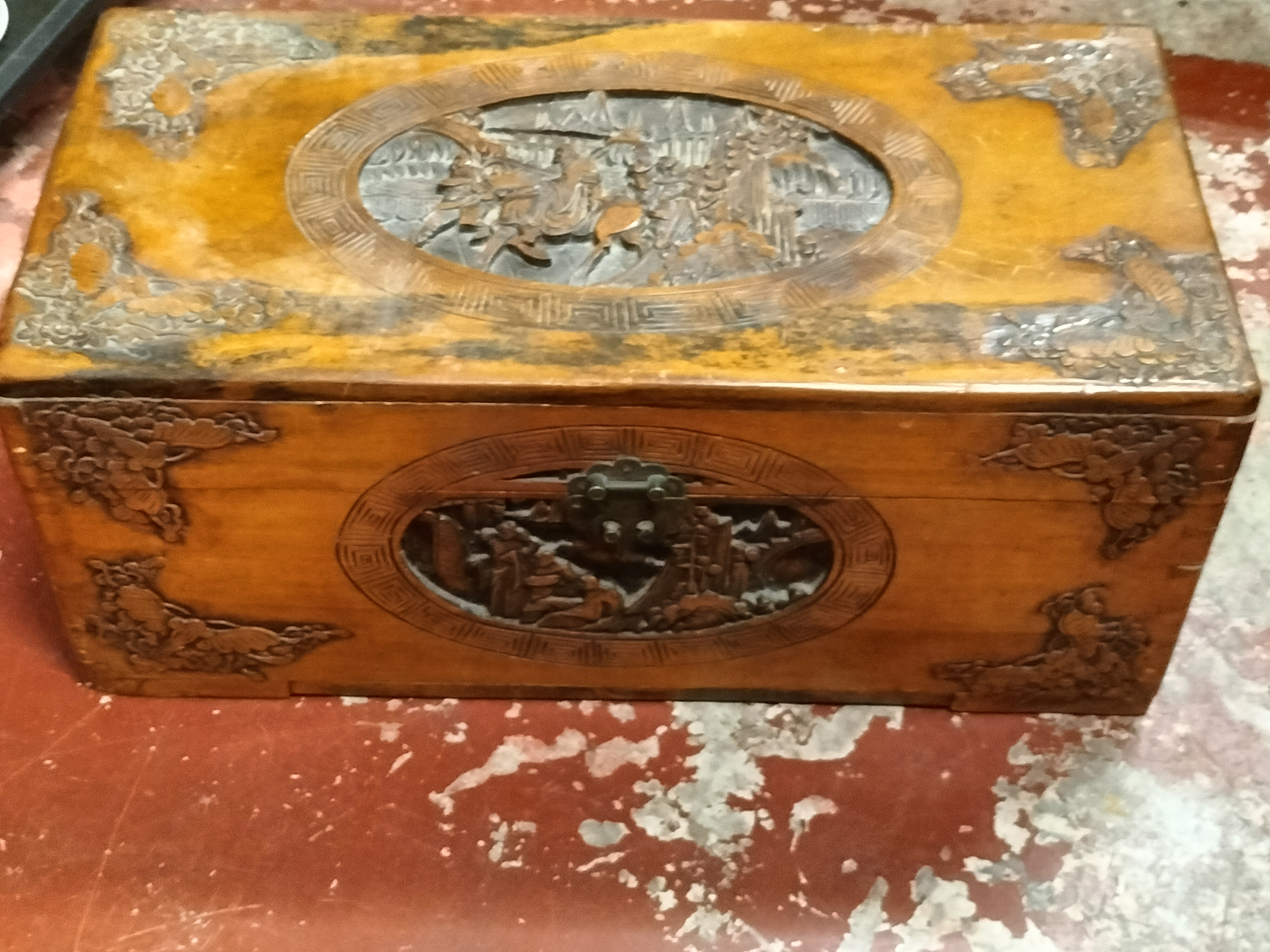 A Chinese camphor wood chest of rectangular form, dating to the mid-20th century. The exterior is elaborately decorated with hand-carved relief panels. The lid features a central oval medallion depicting equestrian figures and attendants traversing a mountainous landscape populated with pagodas and pine trees. A similar figural scene is carved into the front panel, with both inset within traditional key-fret borders. The corners of the chest are further detailed with relief-carved auspicious motifs. The piece is secured with a traditional cloud-shaped metal latch. Camphor wood was highly favoured for its aromatic properties and natural ability to repel insects, making these chests popular for the storage of textiles. No reign marks or signatures are present. Dimensions: Approximately 30cm x 15cm x 15cm (Estimated based on form; exact measurements unavailable).