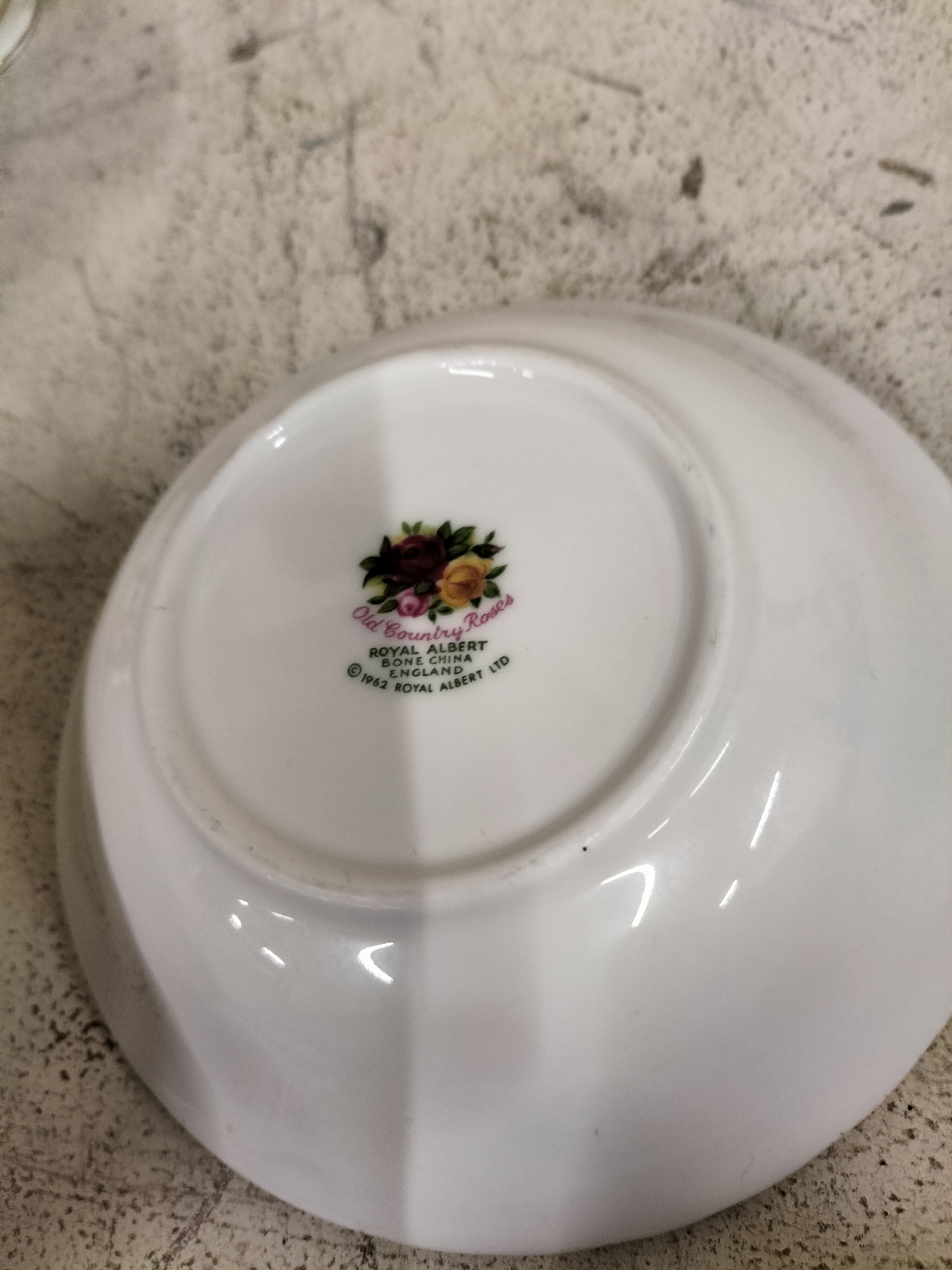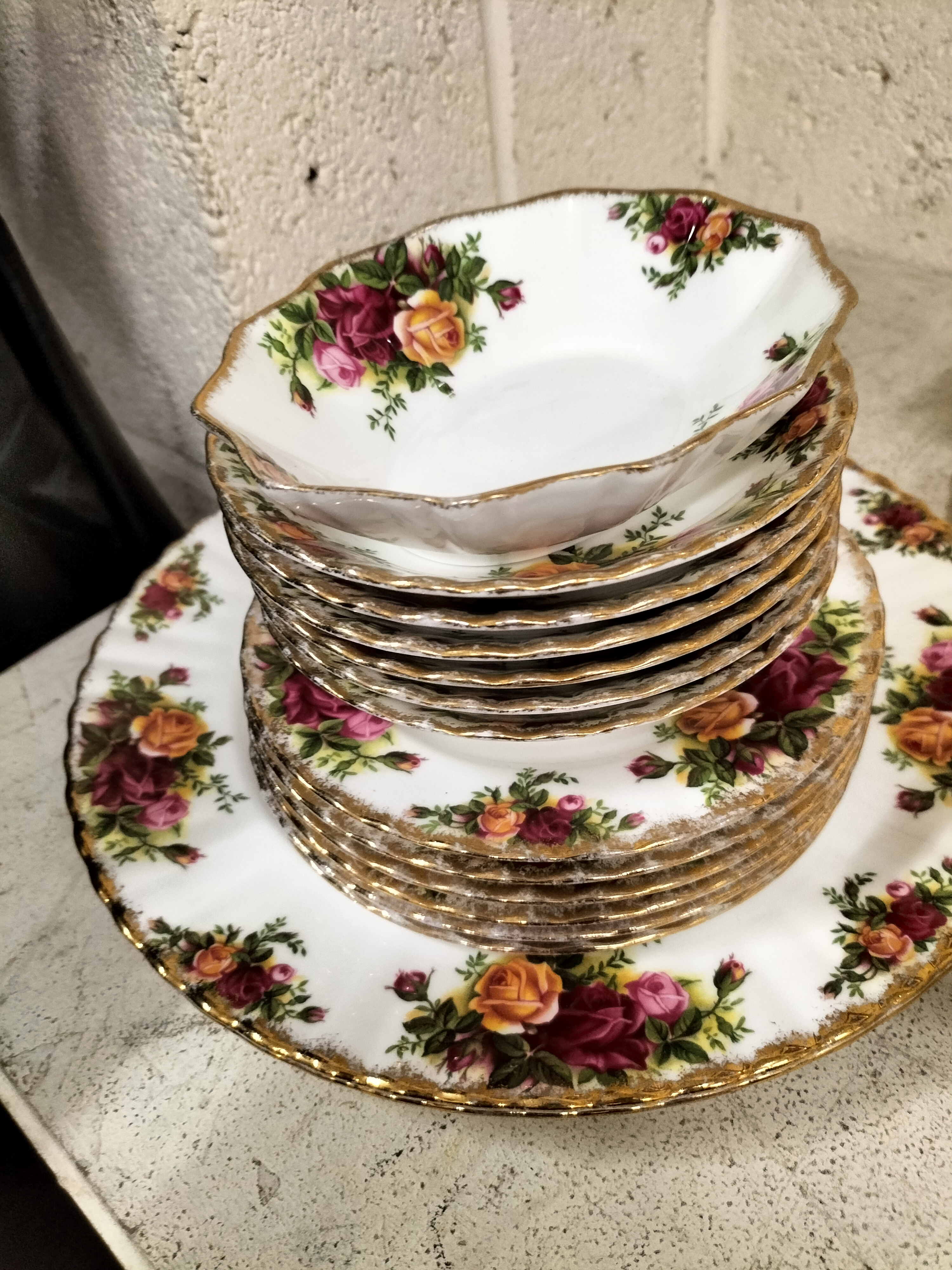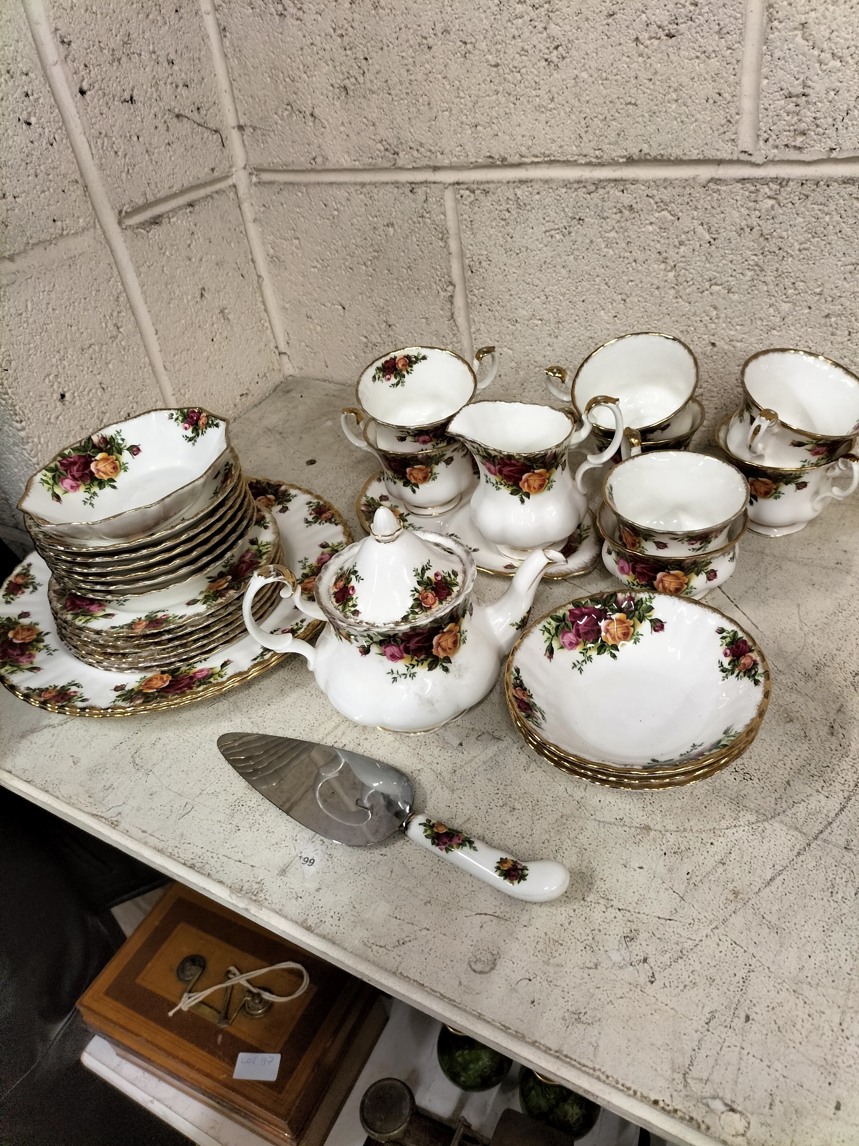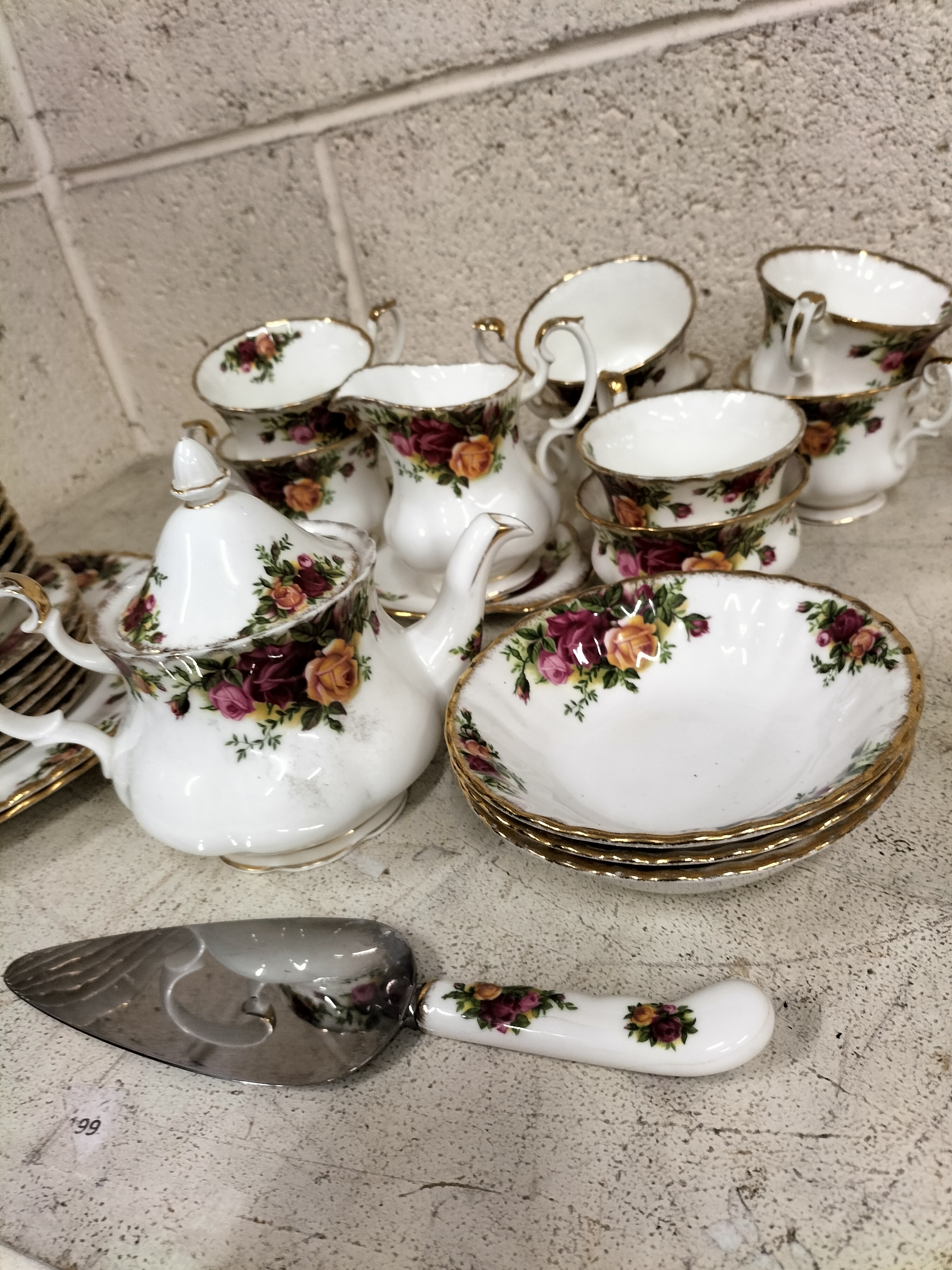 A comprehensive collection of Royal Albert bone china in the celebrated Old Country Roses pattern. This quintessential English design features vibrant clusters of burgundy, pink, and yellow roses with green foliage, set against a white glazed ground. Each piece is embellished with the characteristic hand-applied stippled gold-gilt rims. The set comprises a globular teapot with lid, a cream jug, two open sugar bowls of varying forms, six teacups, six saucers, six side plates, four dessert bowls, one large circular serving plate, and a coordinating cake server with a stainless steel blade and ceramic handle. The undersides bear the printed maker’s mark: Old Country Roses, Royal Albert, Bone China, England, © 1962 Royal Albert Ltd. Teapot height approx. 18cm, Large plate diameter approx. 26cm.
