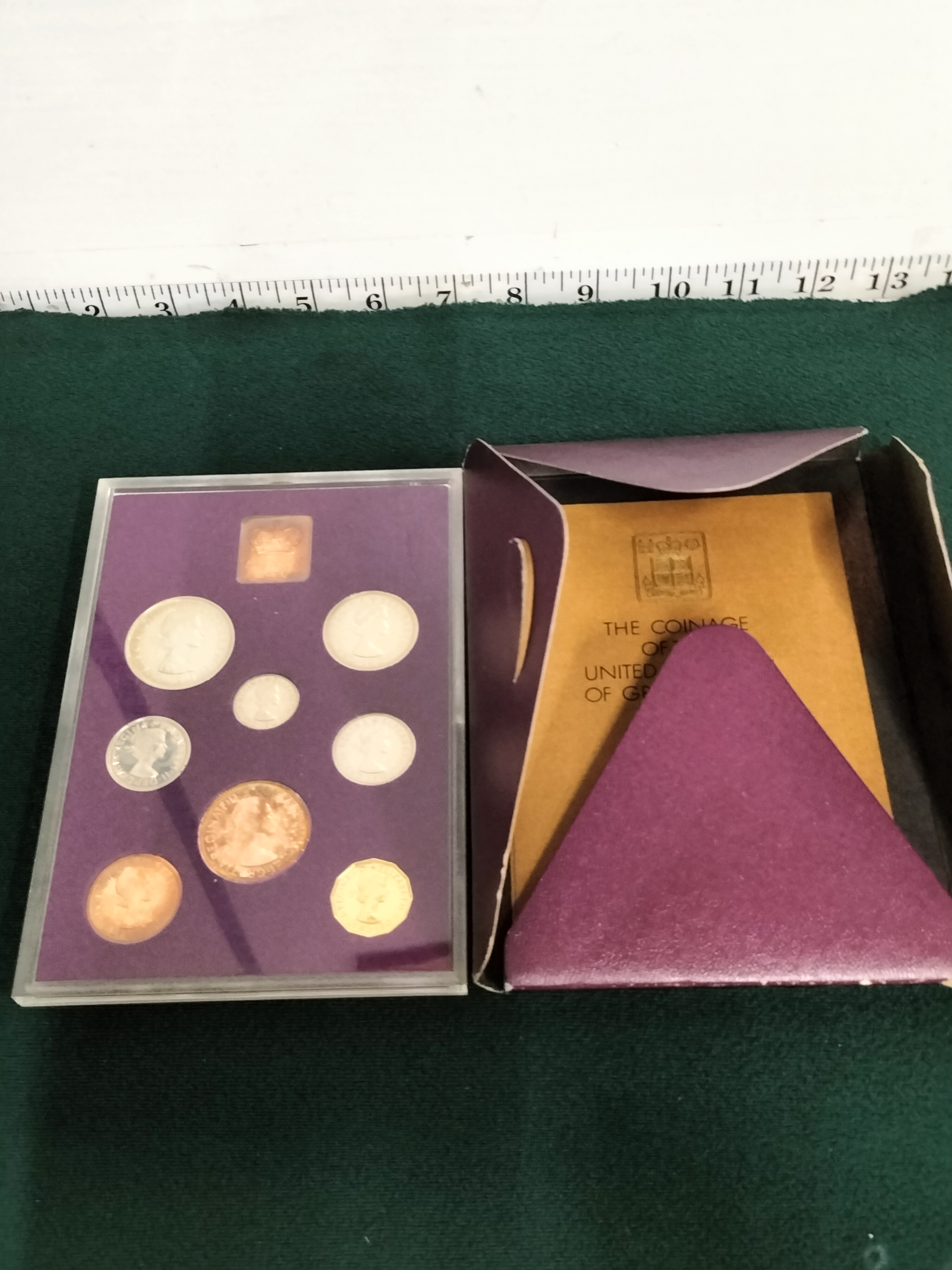 Royal Mint PS21. Obverse designer: Arnold Machin. Minted at the Royal Mint. Elizabeth II obverse / Heraldic reverse. This collection includes the Halfcrown, Florin, English Shilling, Scottish Shilling, Sixpence, Threepence, Penny, and Halfpenny. This set represents the final strike of pre-decimal currency issued before the 1971 decimalisation.
