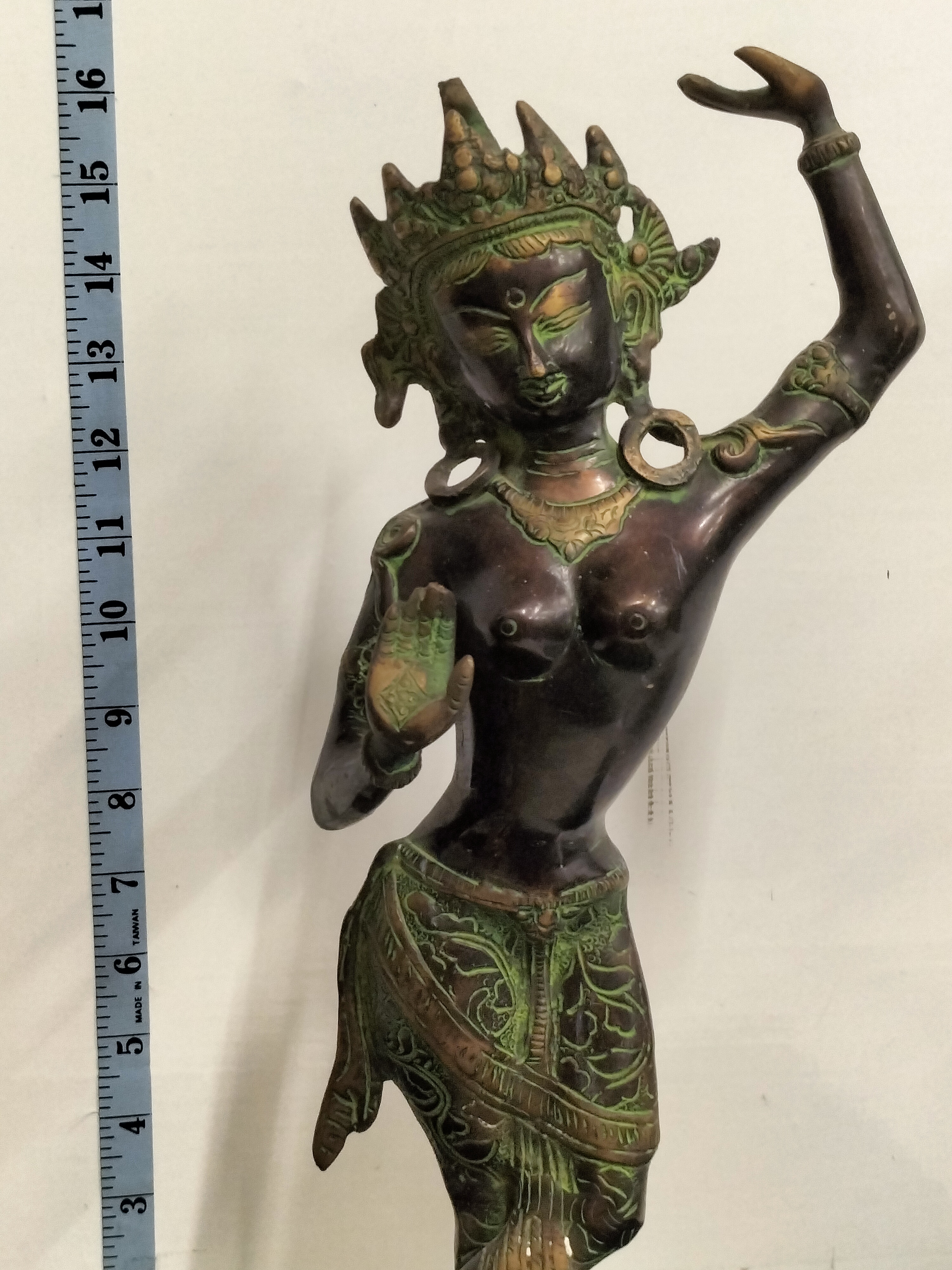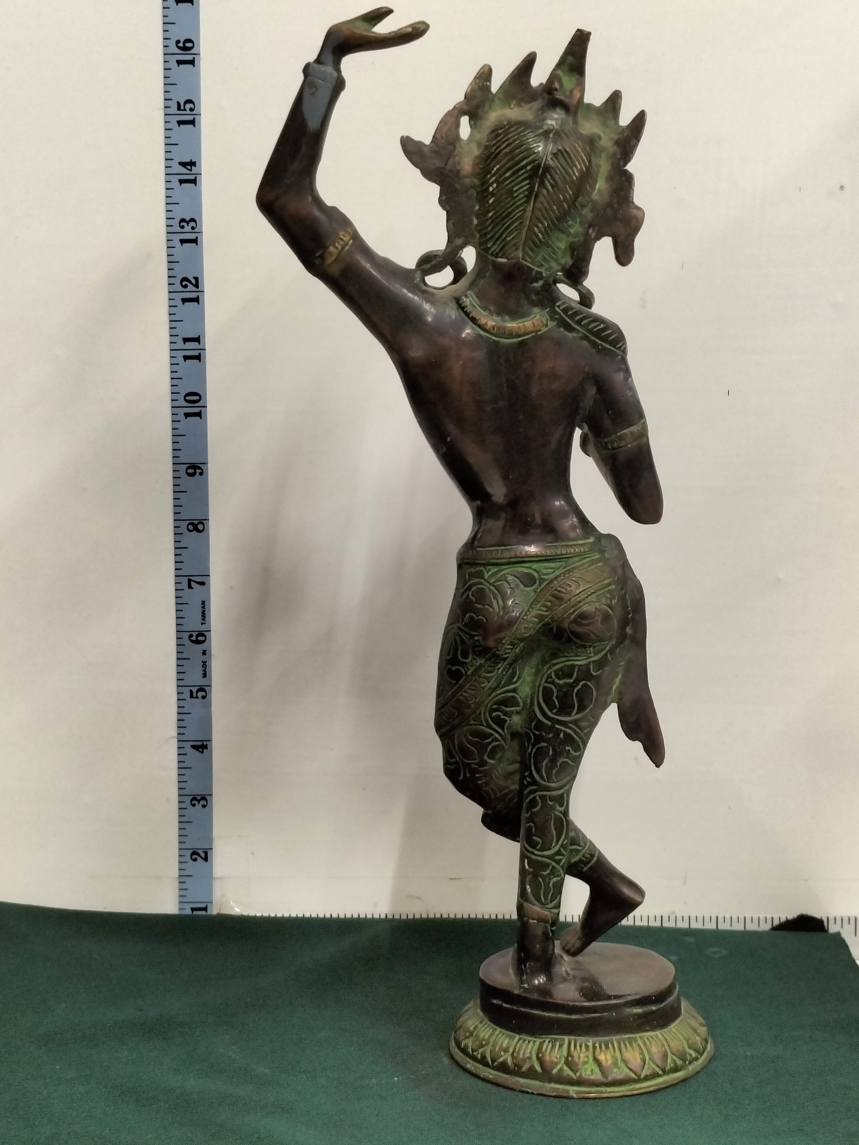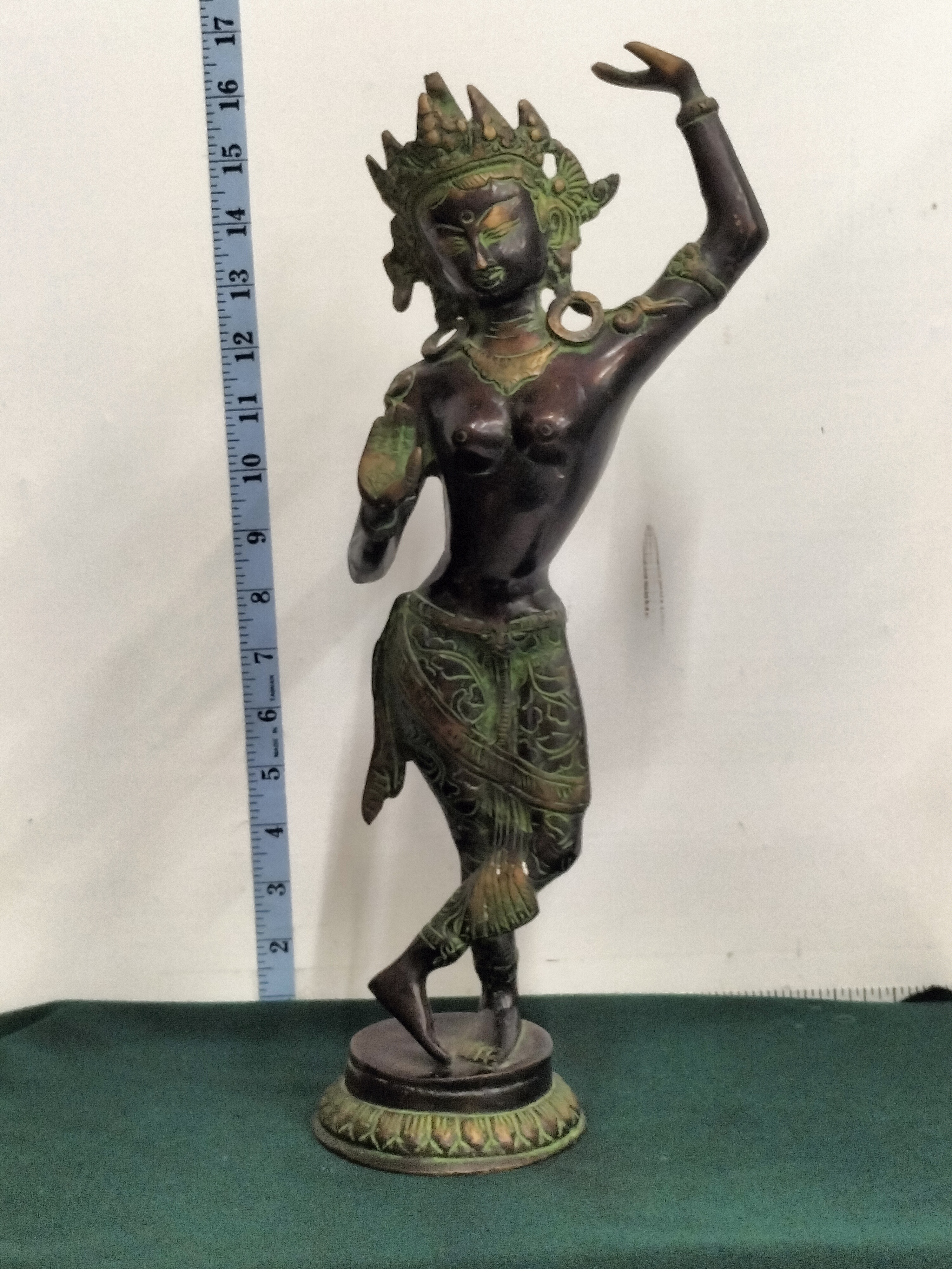 An anonymous cast bronze sculpture of a celestial dancer or Apsara, rendered in a traditional South Asian style. The figure is captured in a fluid, serpentine pose with her right hand held in a mudra and her left arm raised. She is adorned with an elaborate pointed headdress, large circular earrings, and detailed jewellery. The piece is produced using the lost-wax casting method, evidenced by the intricate detailing in the crown and garments. The sculpture features a dark chocolate-brown patina with heavy green verdigris-like oxidation concentrated in the recessed details of the headdress, clothing, and base, which appears to be an intentional decorative finish. The figure stands on an integrated circular tiered base featuring a stylised petal or lotus motif. No artist signatures or foundry marks are present. 16.5 x 6.0 x 4.0 inches.