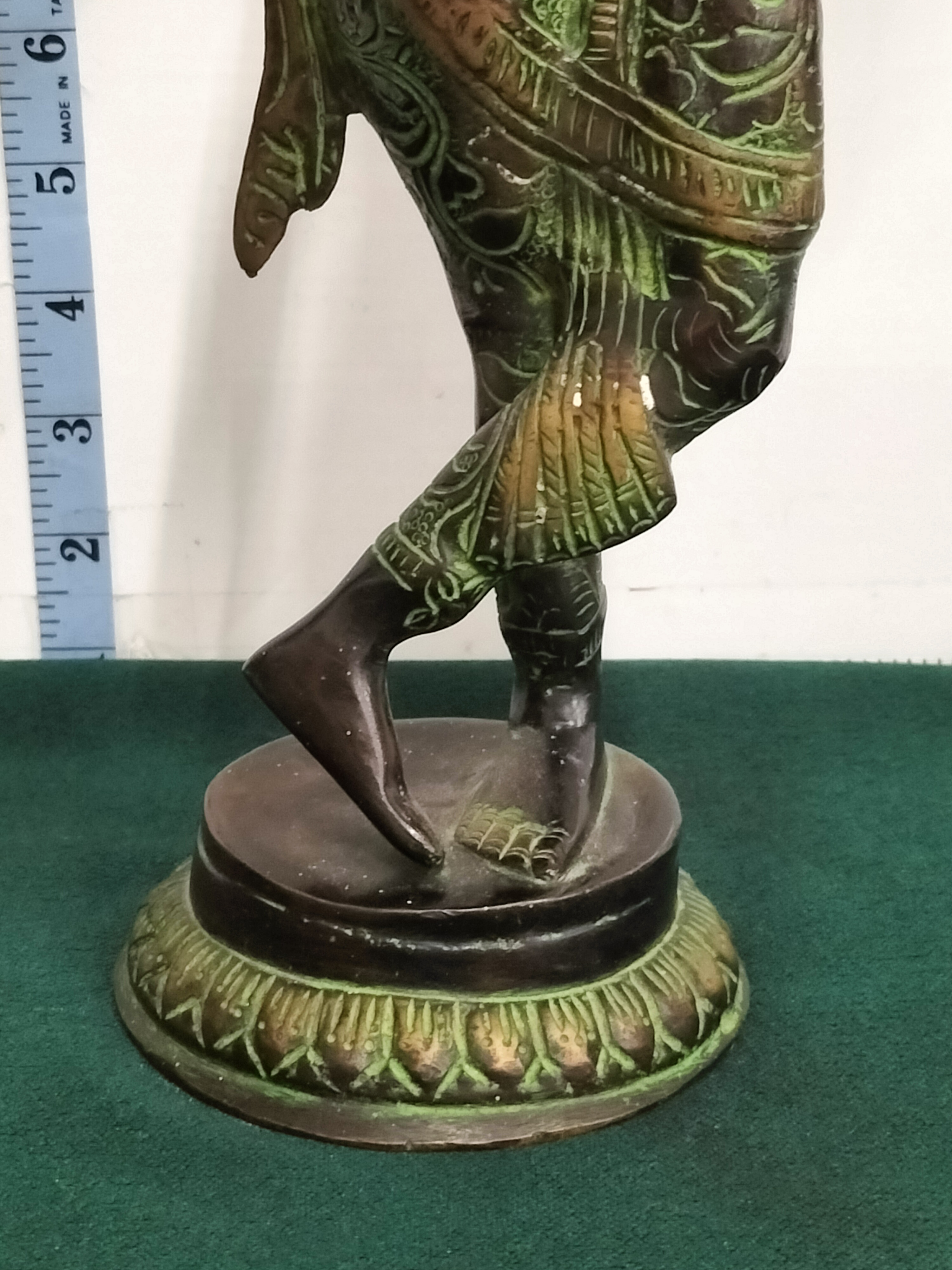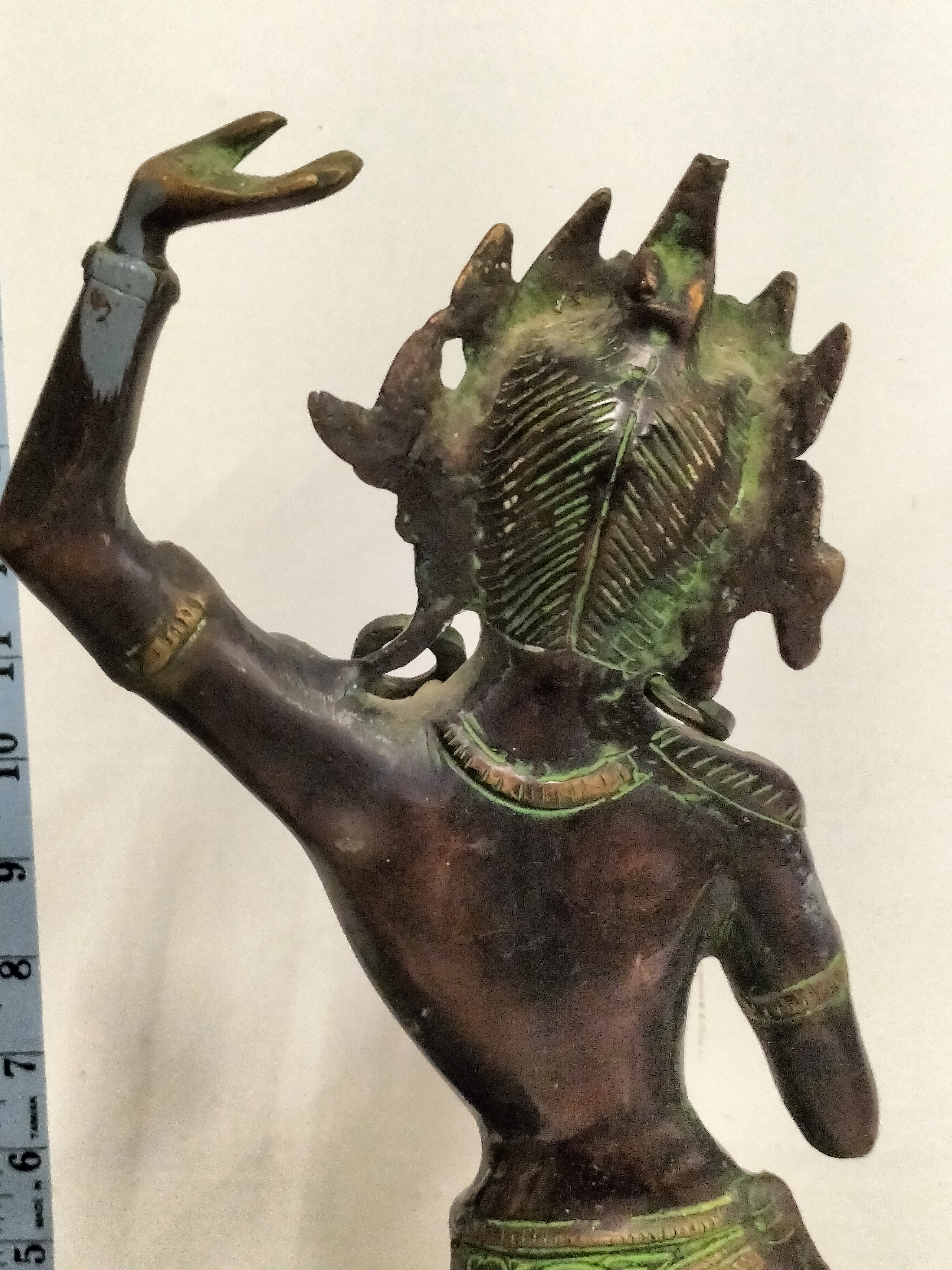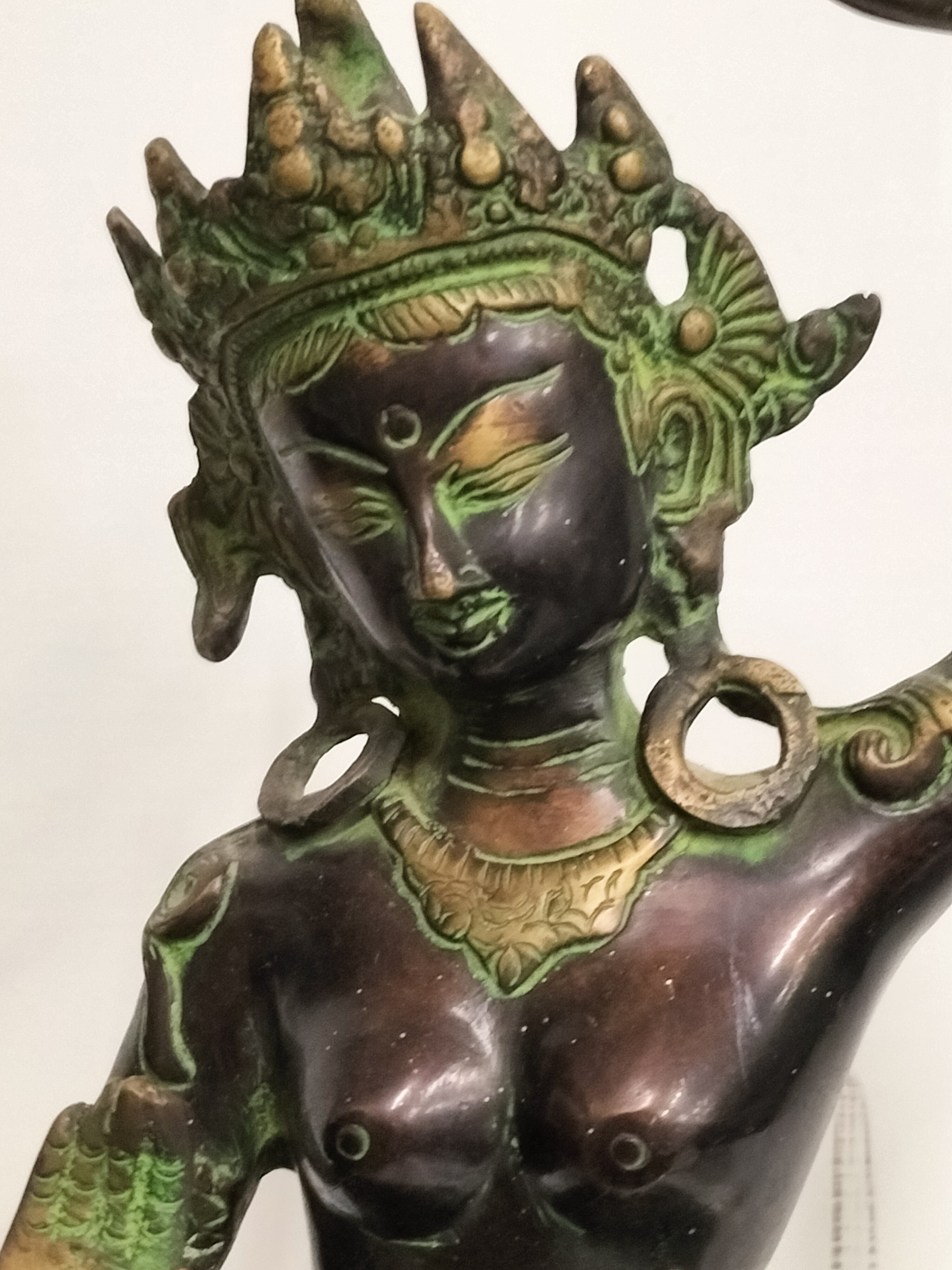 An anonymous cast bronze sculpture of a celestial dancer or Apsara, rendered in a traditional South Asian style. The figure is captured in a fluid, serpentine pose with her right hand held in a mudra and her left arm raised. She is adorned with an elaborate pointed headdress, large circular earrings, and detailed jewellery. The piece is produced using the lost-wax casting method, evidenced by the intricate detailing in the crown and garments. The sculpture features a dark chocolate-brown patina with heavy green verdigris-like oxidation concentrated in the recessed details of the headdress, clothing, and base, which appears to be an intentional decorative finish. The figure stands on an integrated circular tiered base featuring a stylised petal or lotus motif. No artist signatures or foundry marks are present. 16.5 x 6.0 x 4.0 inches.
