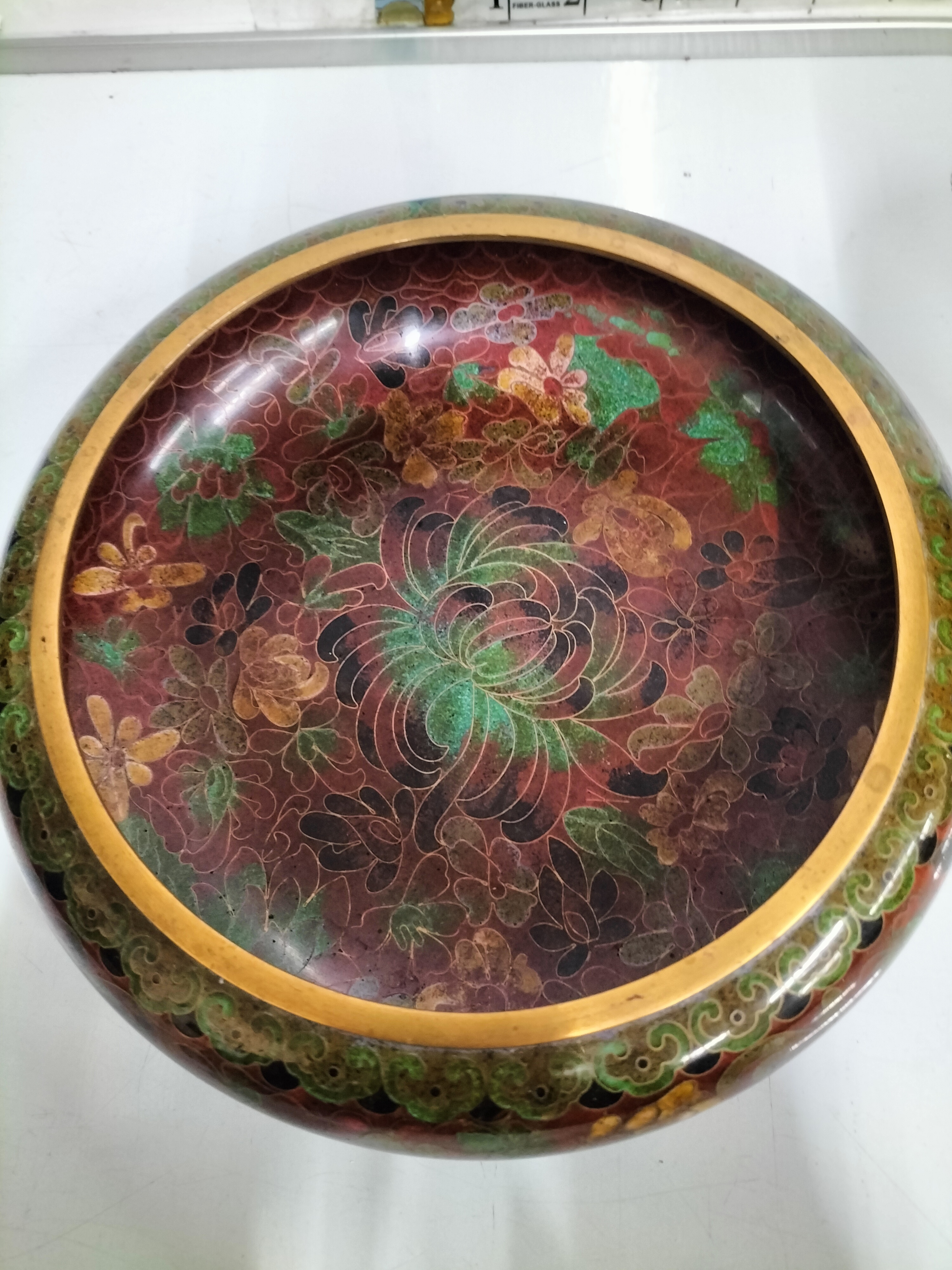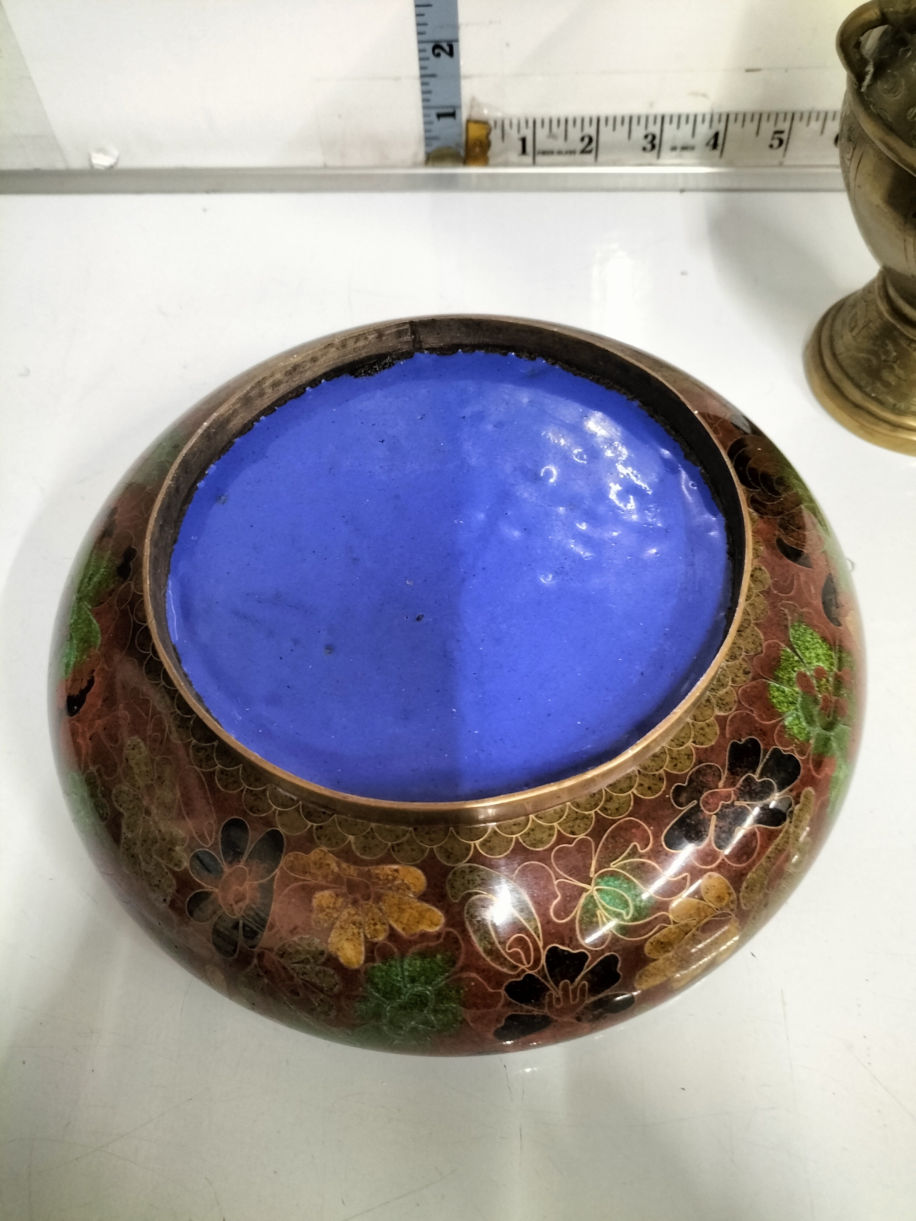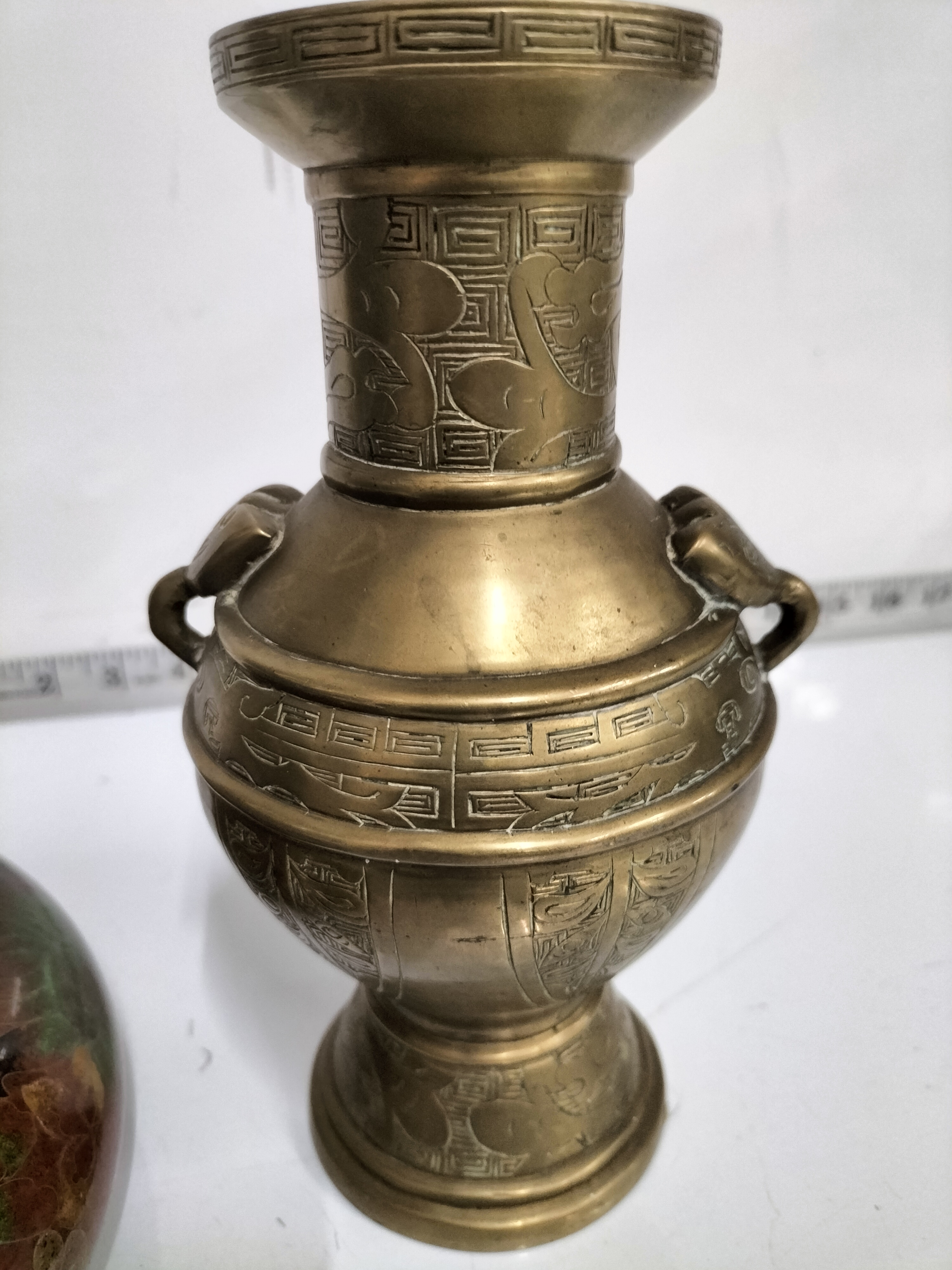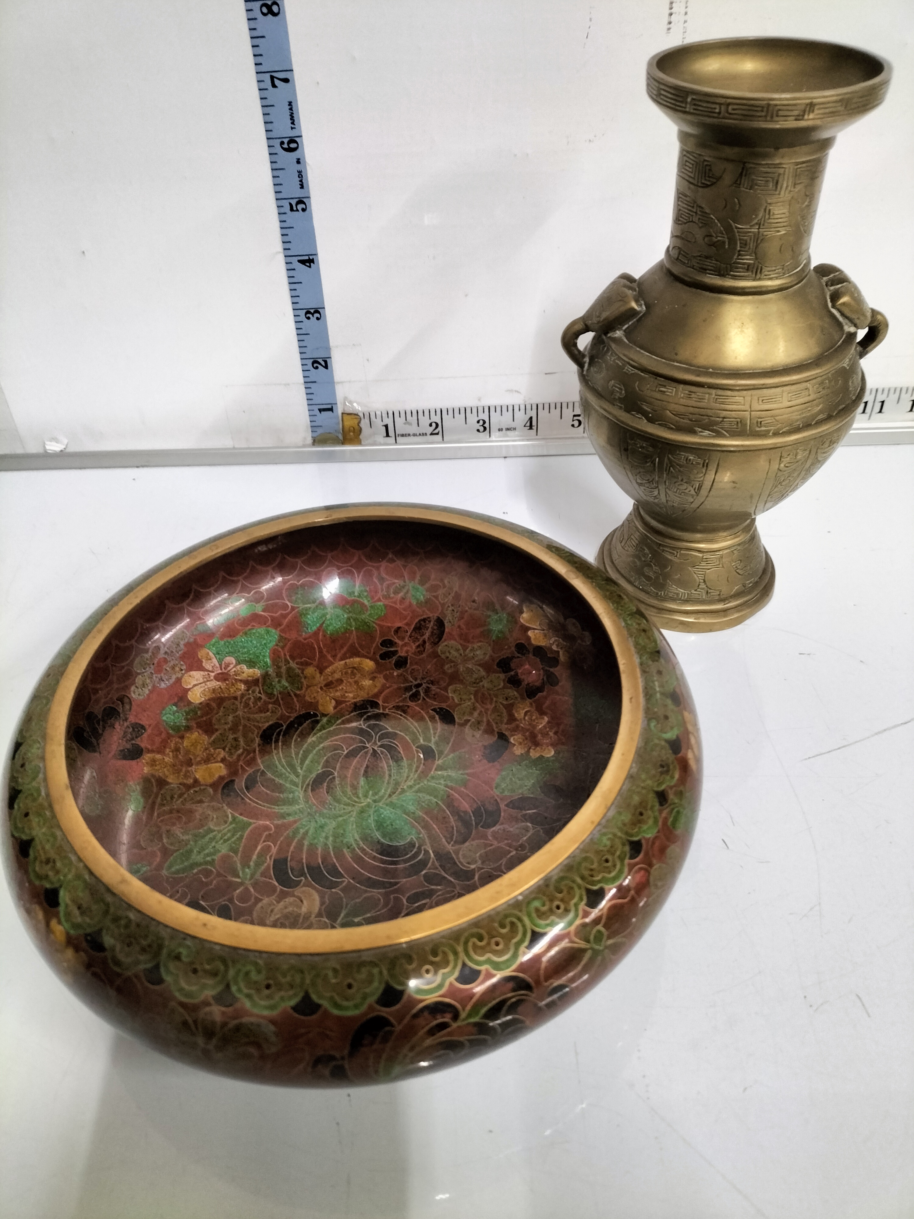 This lot comprises two decorative metalware objects of Chinese origin. The first is a circular cloisonne enamel bowl, likely mid-20th century, featuring a central polychrome floral blossom on a reddish-brown ground, surrounded by dense floral motifs in the Thousand Flowers style and a ruyi-head border. The enamel is applied within brass wirework in a scale pattern, with the underside finished in solid cobalt blue enamel and a brass foot ring. The second item is a cast brass vase of archaic baluster form with twin loop handles. The body is decorated with relief-cast bands of geometric key fret (leiwen) and stylised zoomorphic patterns. Both pieces exhibit traditional motifs consistent with the late Qing to Republic period style. No maker marks are visible. Bowl diameter approximately 20.3 centimetres (8 inches); Vase height approximately 22.8 centimetres (9 inches).