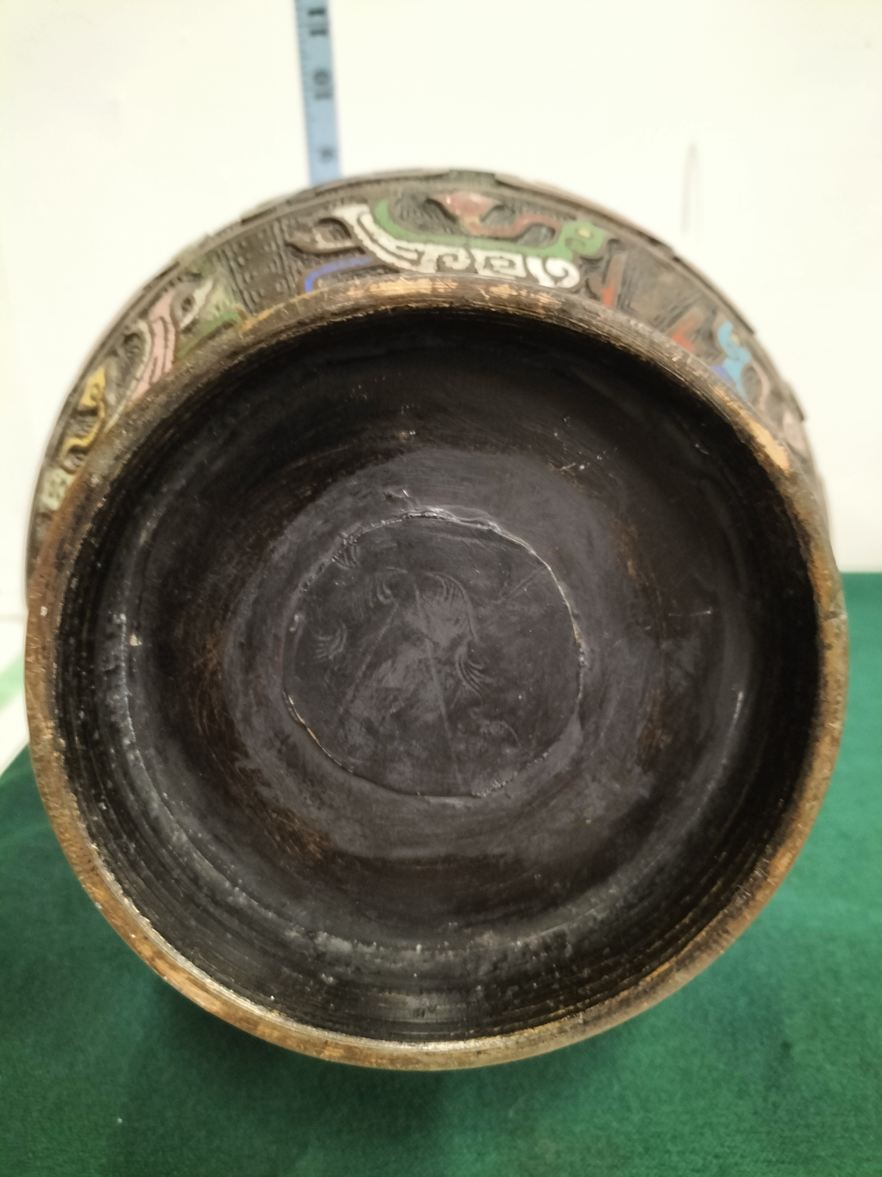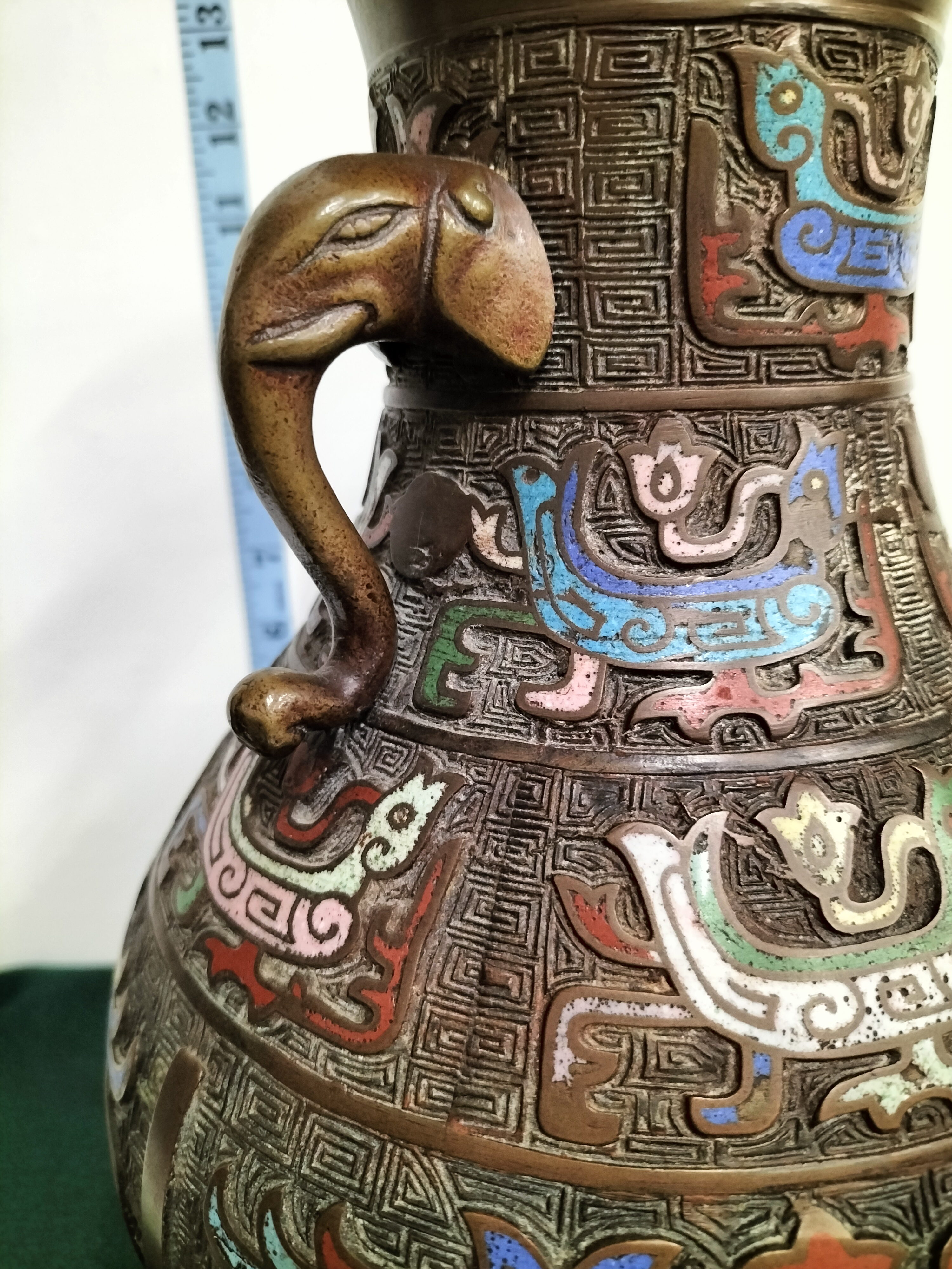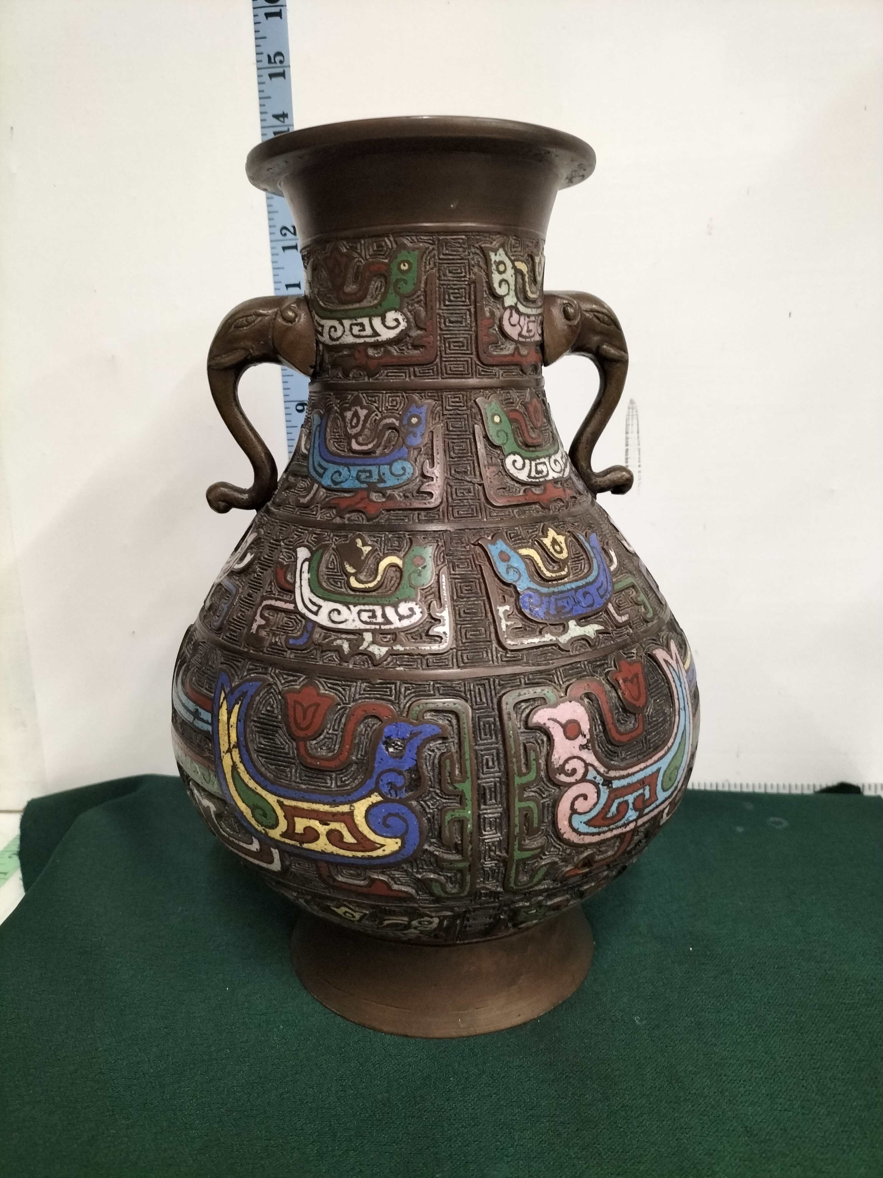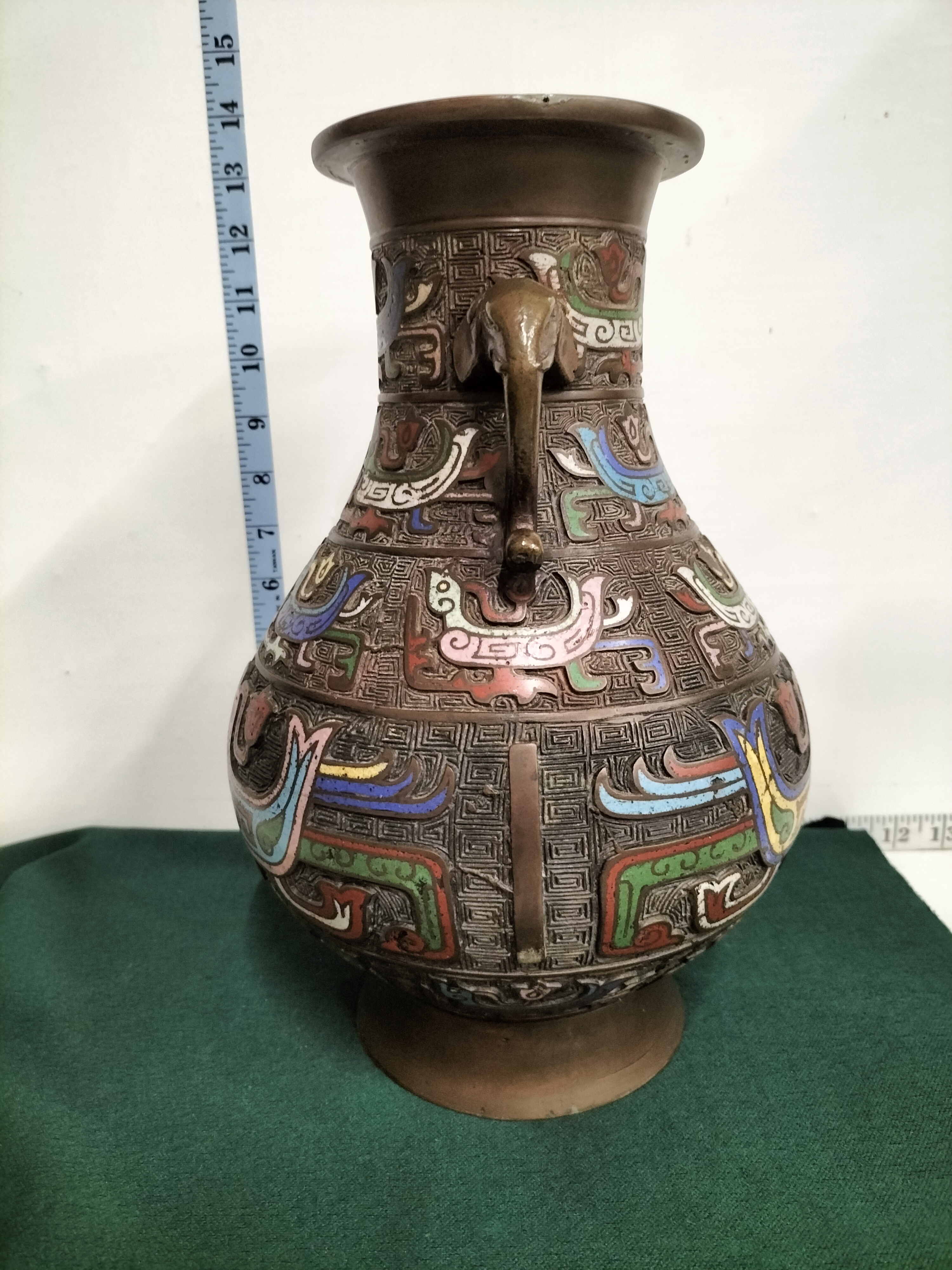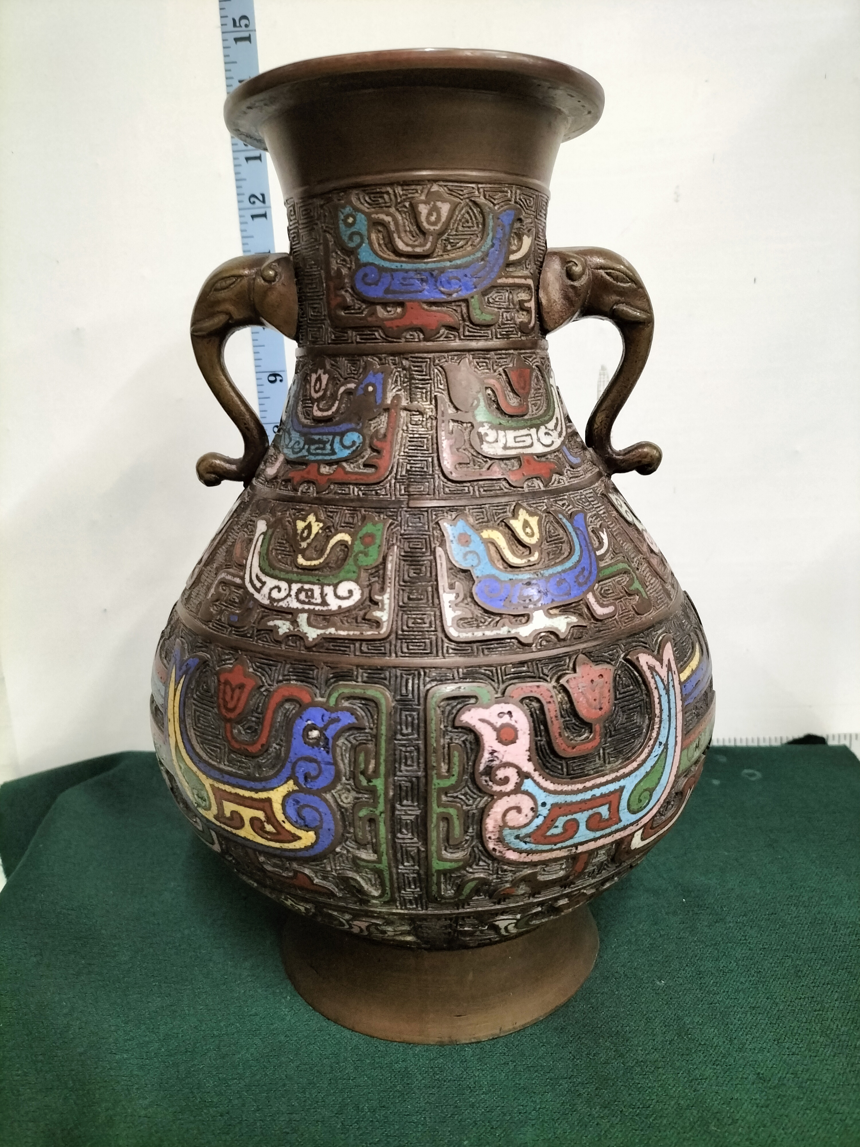 A large Japanese bronze vase of archaic Chinese hu form, dating to the late Meiji or early Taisho period, circa 1900. The pear-shaped body is cast with multiple horizontal registers containing stylised phoenix or bird motifs executed in polychrome champleve enamels. The palette includes vibrant shades of turquoise, cobalt blue, yellow, pink, and white, all set against a dense cast leiwen (thunder pattern) ground. The neck is flanked by a pair of prominent elephant-head handles with trunks forming loops. The bronze exhibits a rich, dark chocolate-brown patina. The underside of the vase features a central circular inset, characteristic of Japanese bronze casting from this era. This piece reflects the late 19th-century Japanese aesthetic movement that drew heavy inspiration from ancient Chinese bronzes, adapted for the international export market. Height: approximately 14.5 inches (36.8 cm).
