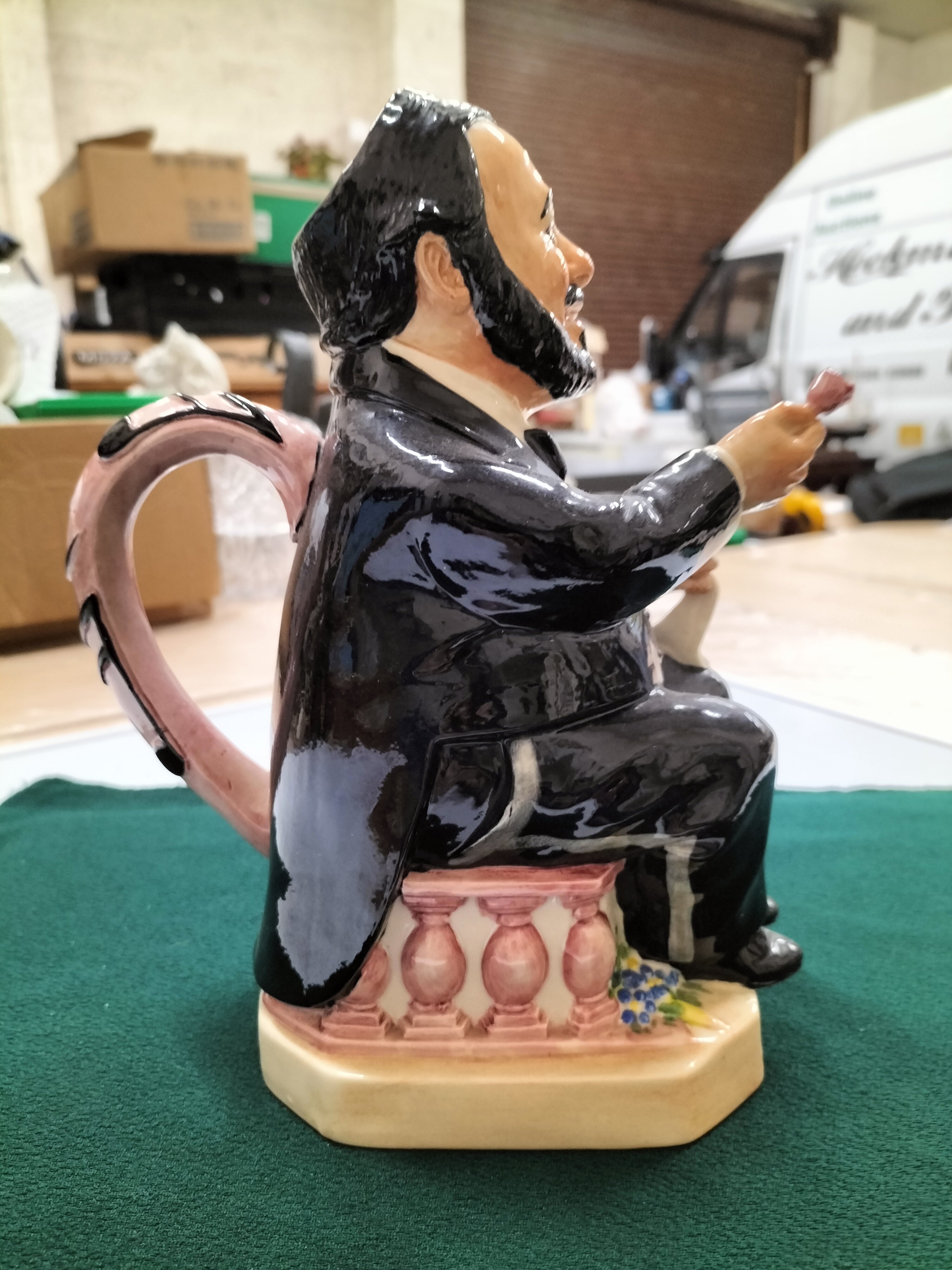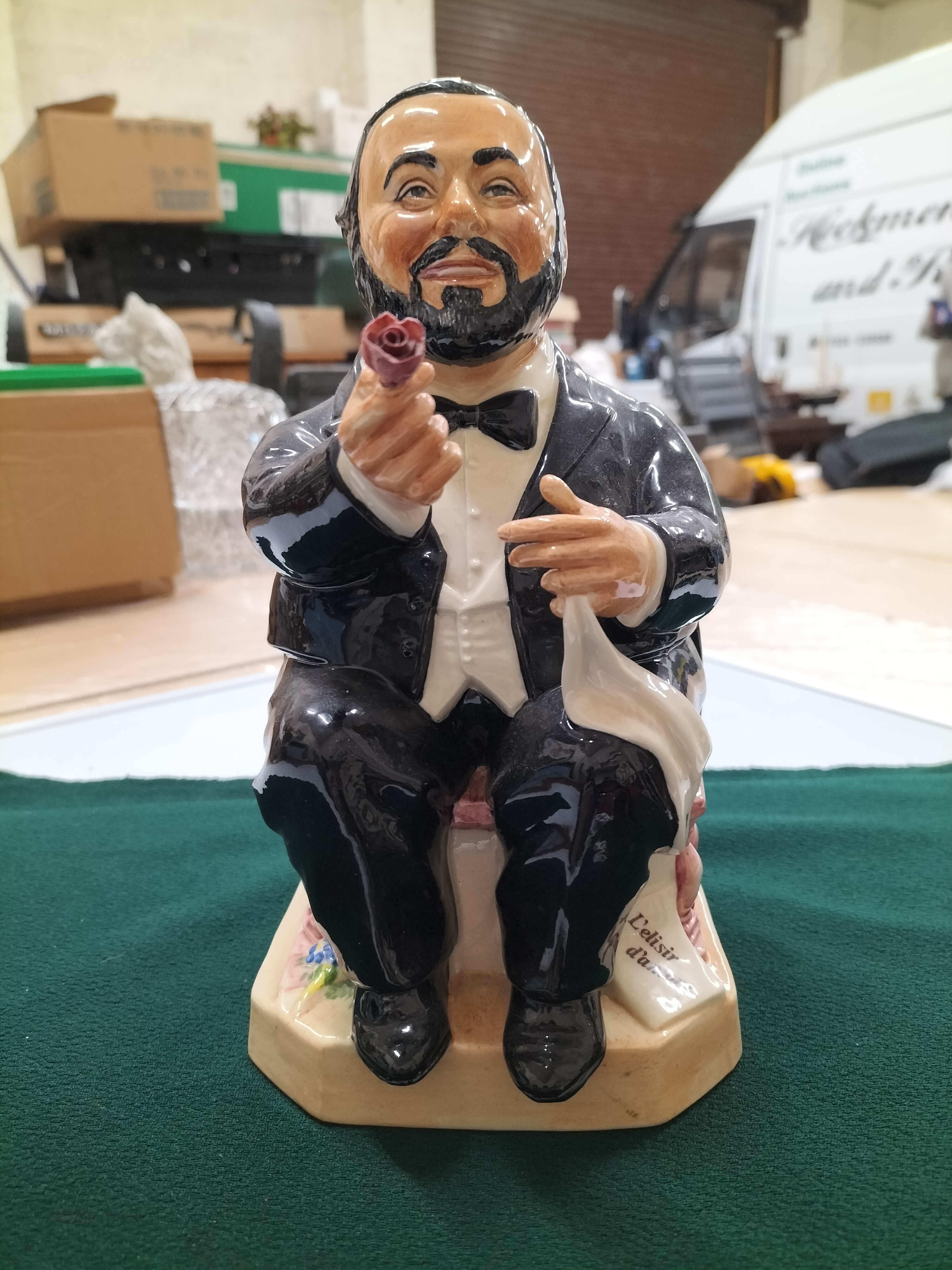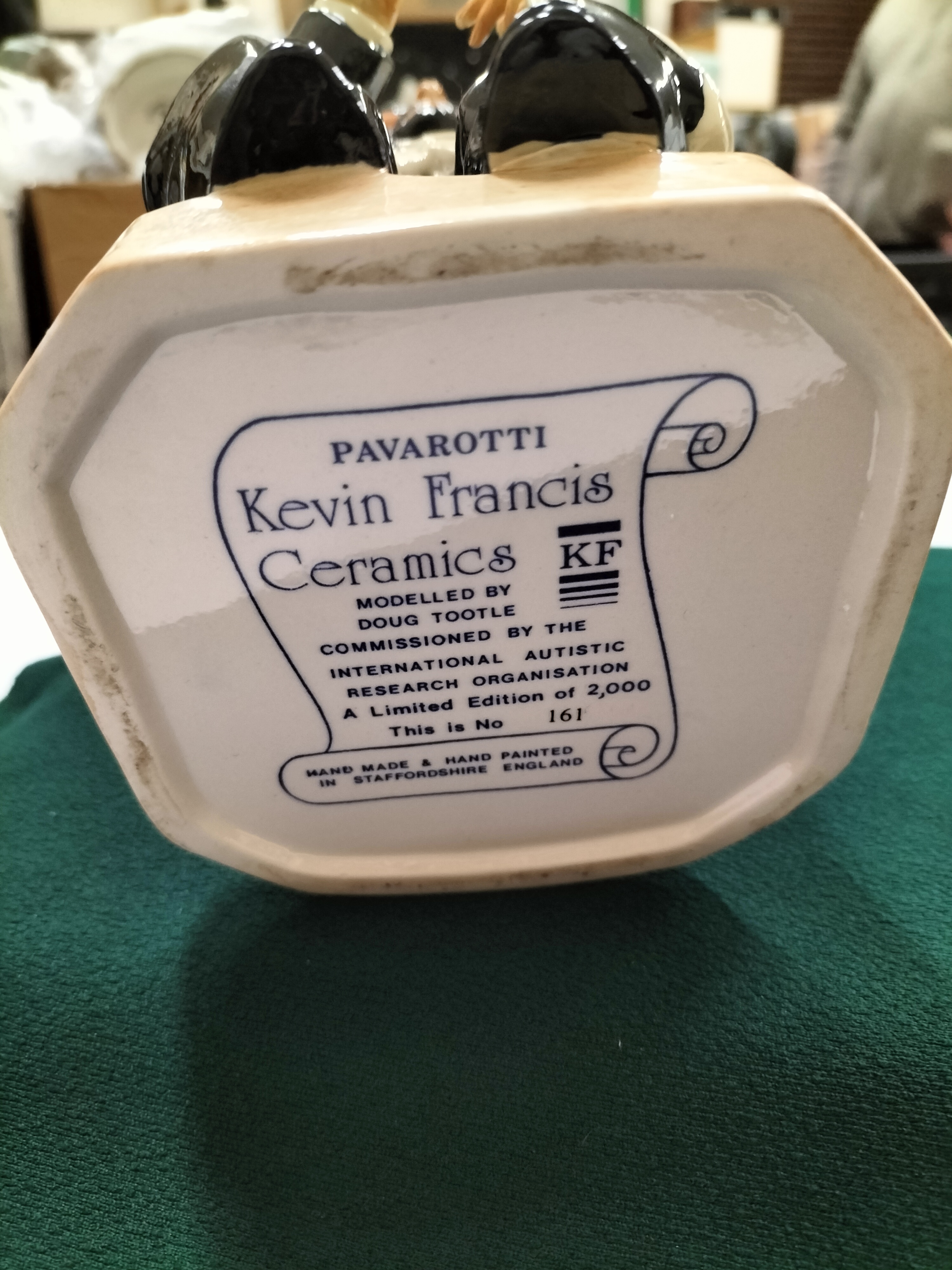 A finely detailed limited edition character jug by Kevin Francis Ceramics, depicting the world-renowned operatic tenor Luciano Pavarotti. Modelled by Doug Tootle, the figure is shown seated in full concert dress, featuring a black tailcoat, white waistcoat, and black bowtie. He is depicted holding a single red rose in his right hand and his signature white handkerchief in his left. He sits upon a pink balustraded bench, with a scroll at his side inscribed with the title of the Donizetti opera L’elisir d’amore. Commissioned by the International Autistic Research Organisation. Hand-made and hand-painted in Staffordshire, England. Limited edition of 2,000, this piece is hand-numbered 161. Height approx. 22cm.
