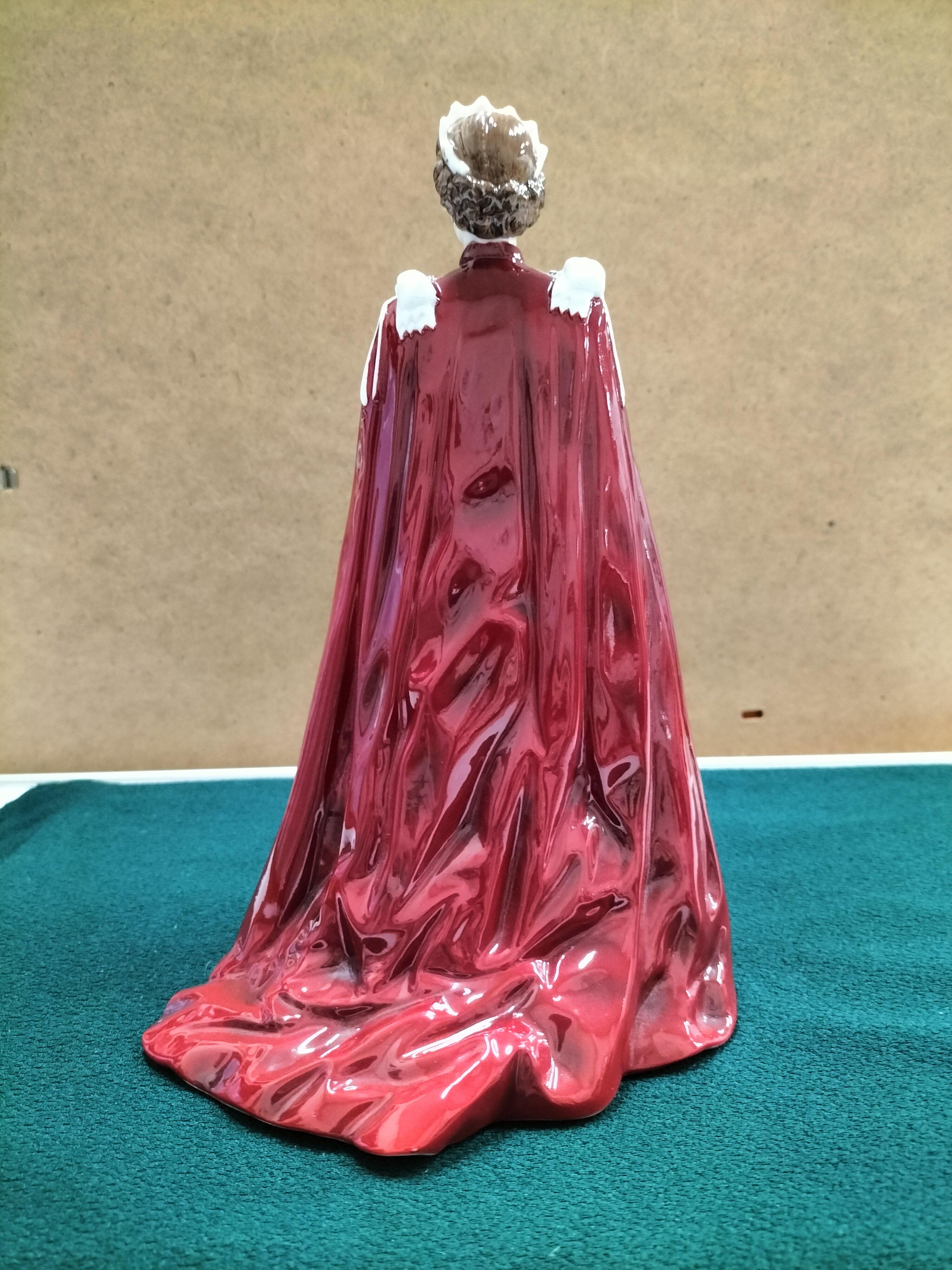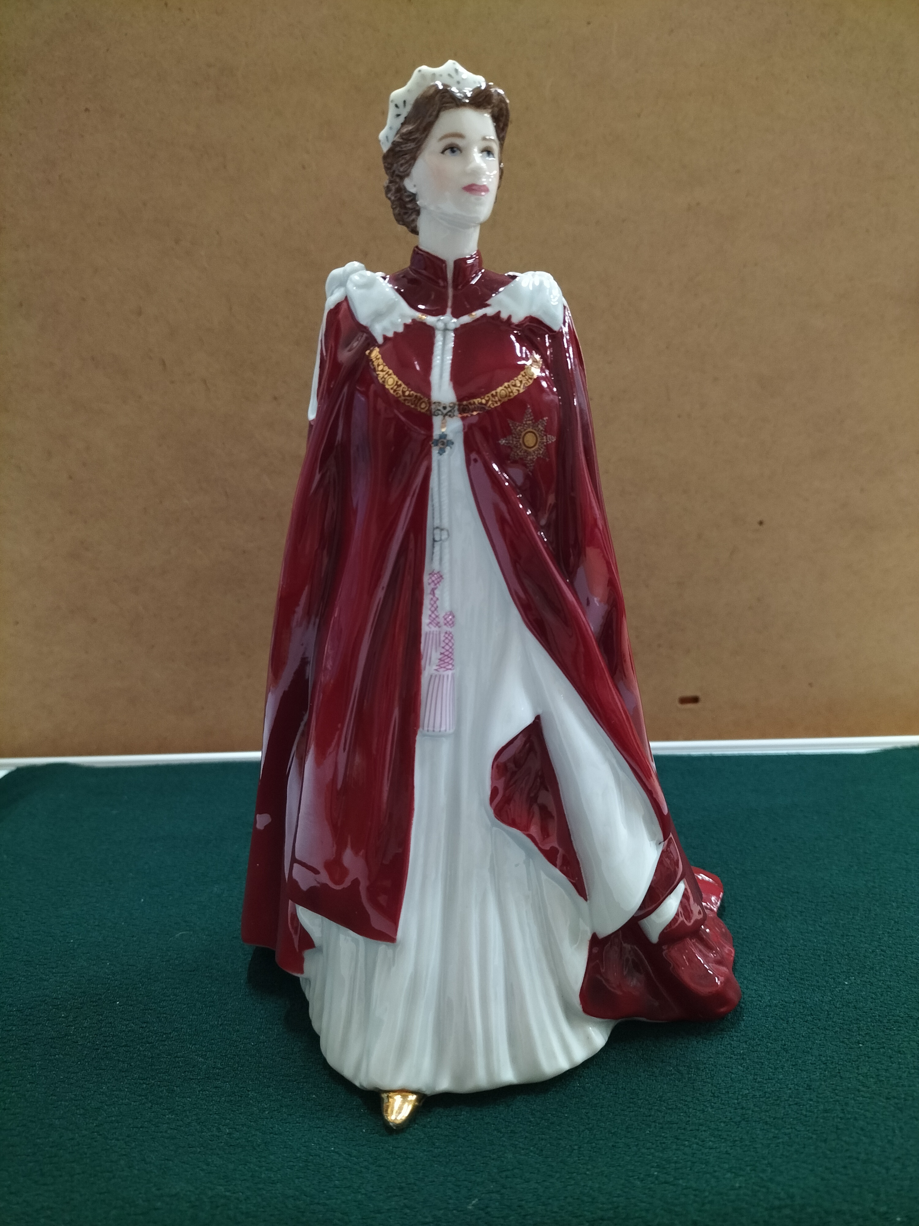 A Royal Worcester porcelain figurine produced to commemorate the 80th birthday of Queen Elizabeth II in 2006. The figure is depicted in ceremonial dress, wearing a white diadem and a full-length pleated white gown. Over the gown is a voluminous, deep red glazed mantle featuring white fur-style trim at the shoulders and a long trailing train to the reverse. The attire is further detailed with a painted gold chain collar, an order suspended from a blue ribbon, a large star-shaped breast star, and a pink and white tassel. A single gilded shoe tip is visible at the front hem. The piece is finished with a high-gloss glaze throughout.