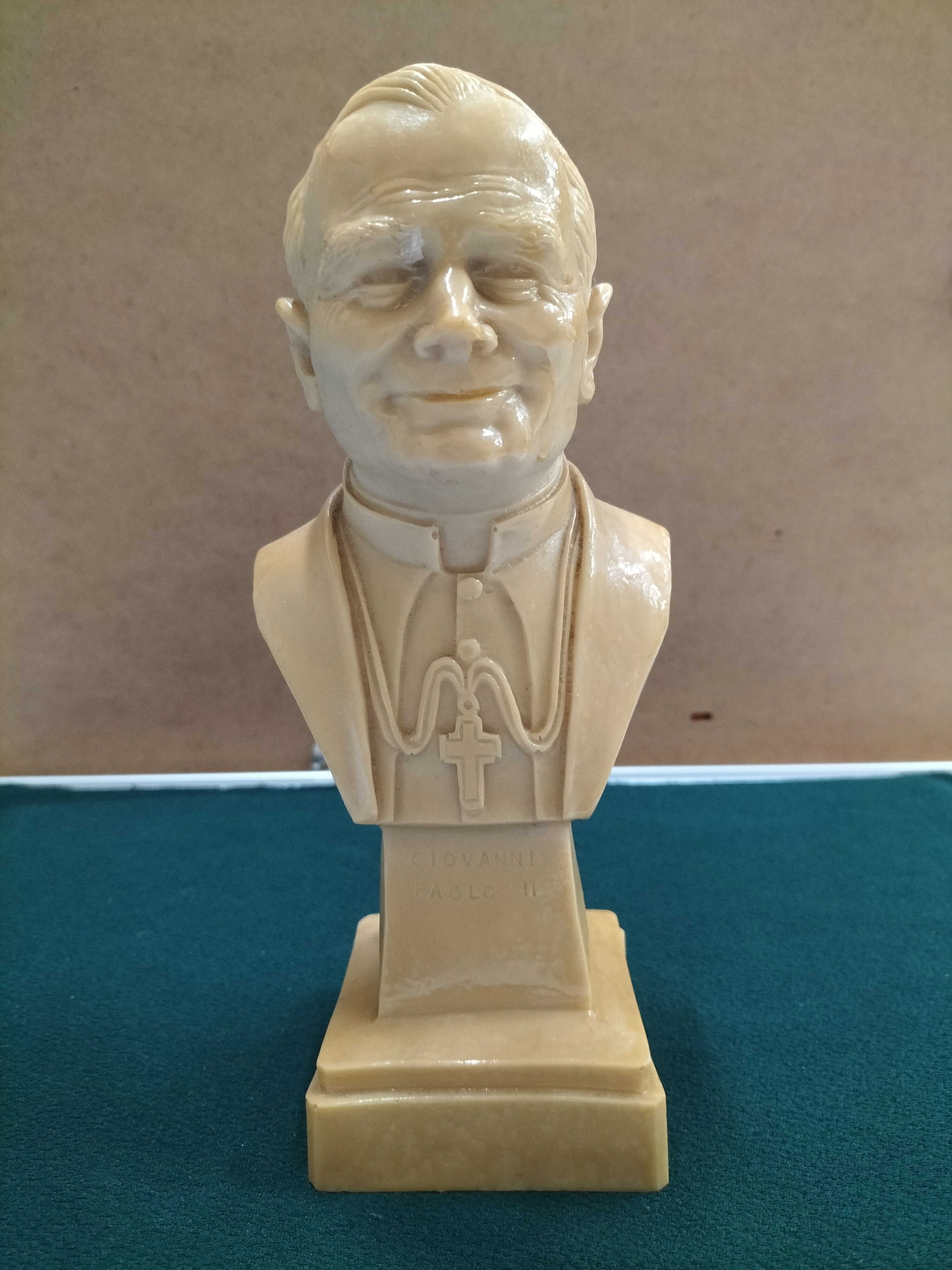 A contemporary commemorative portrait bust of Pope John Paul II, cast in a bonded alabaster resin with a polished, off-white finish. The subject is depicted in traditional ecclesiastical attire, including a prominent pectoral cross. The sculpture is set upon an integral, multi-tiered square pedestal which bears the moulded inscription GIOVANNI PAOLO II on the front face. This type of piece is a common religious souvenir, likely of Italian manufacture from the late 20th century. No artist signature or foundry marks are apparent. 14.0 x 6.5 x 5.0 cm.