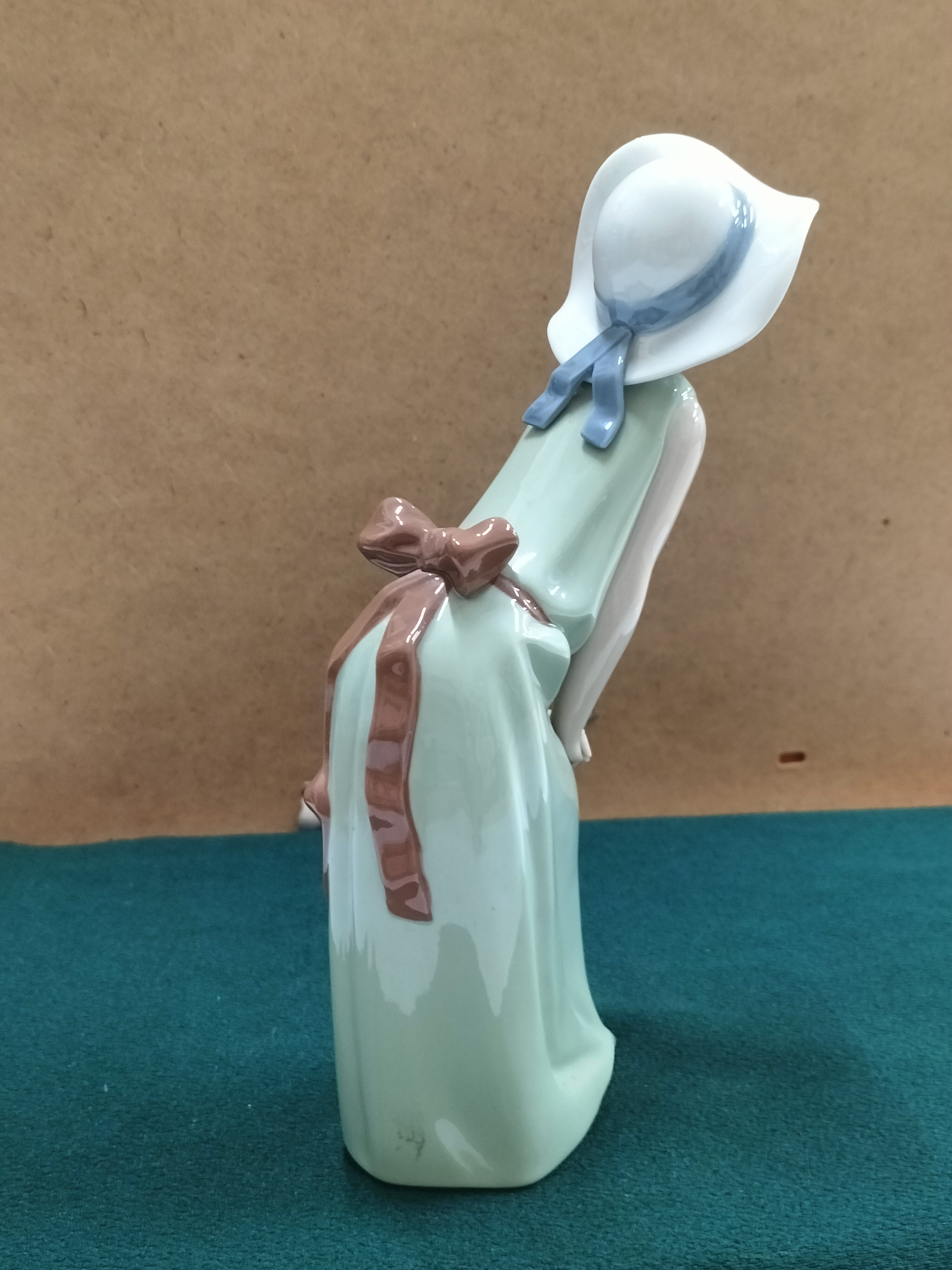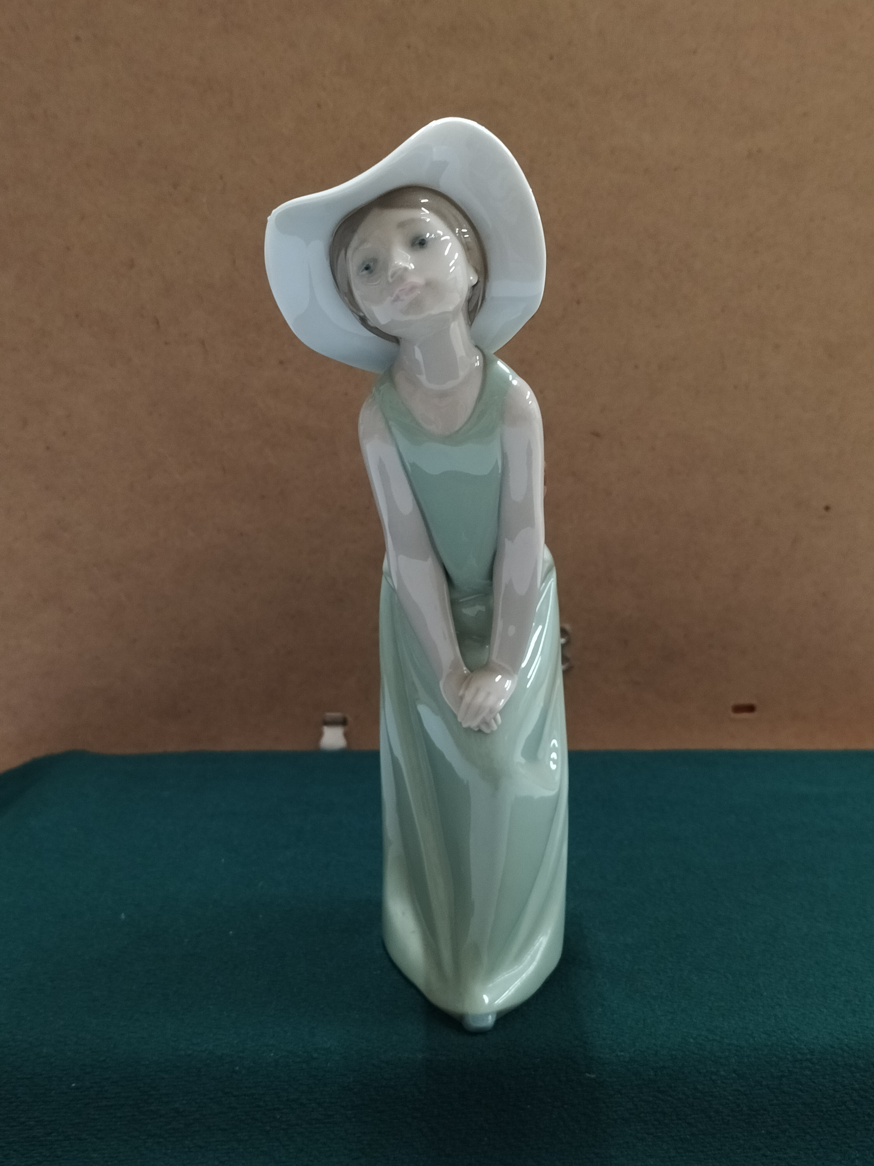 A fine Lladro porcelain figurine titled Curious (also known as Curious Girl), model number 5009, from the Sun Hat Girls collection. This piece was designed by sculptor Francisco Catala and originally issued in 1978. The figurine depicts a slender young woman in a graceful leaning pose, dressed in a sleeveless pale green gown featuring a large, stylised brown bow at the lower back. She wears a wide-brimmed white sunhat adorned with a light blue ribbon tied at the reverse. The piece is executed in the classic muted pastel colour palette and high-gloss glaze finish characteristic of the Spanish manufacturer. Although factory marks are not visible in the provided images, the style and execution are consistent with authentic Lladro production. Height: 23 cm.