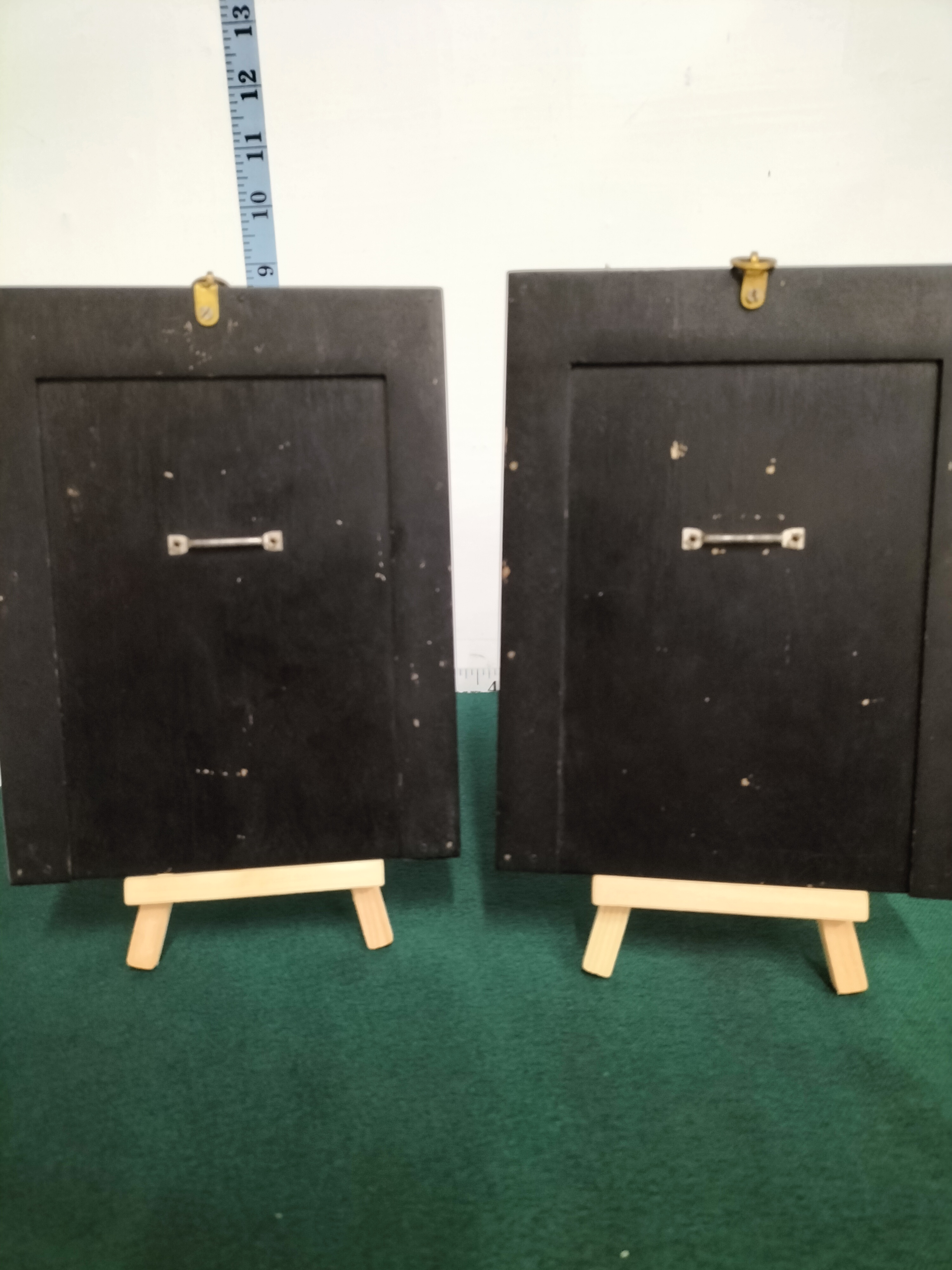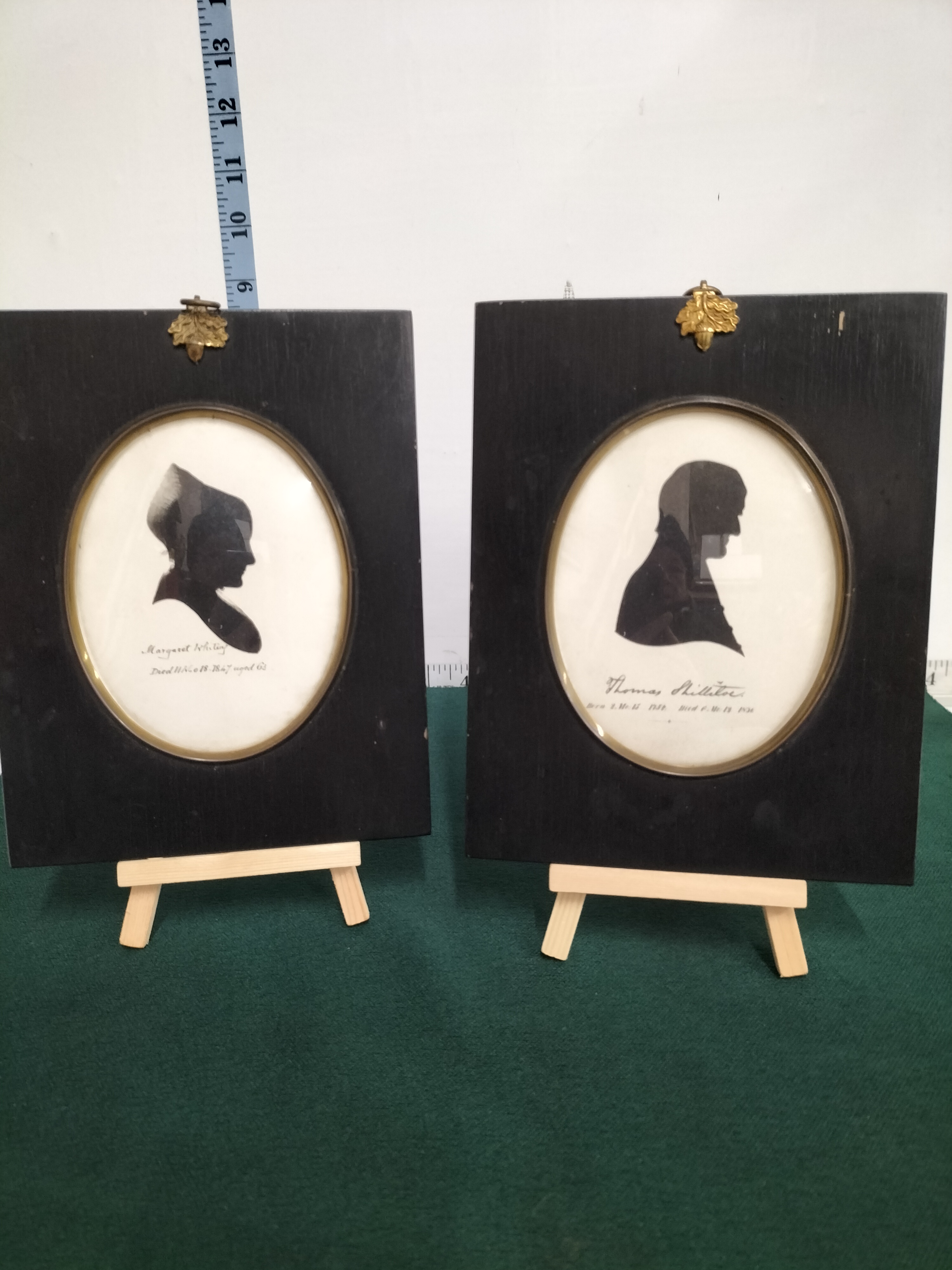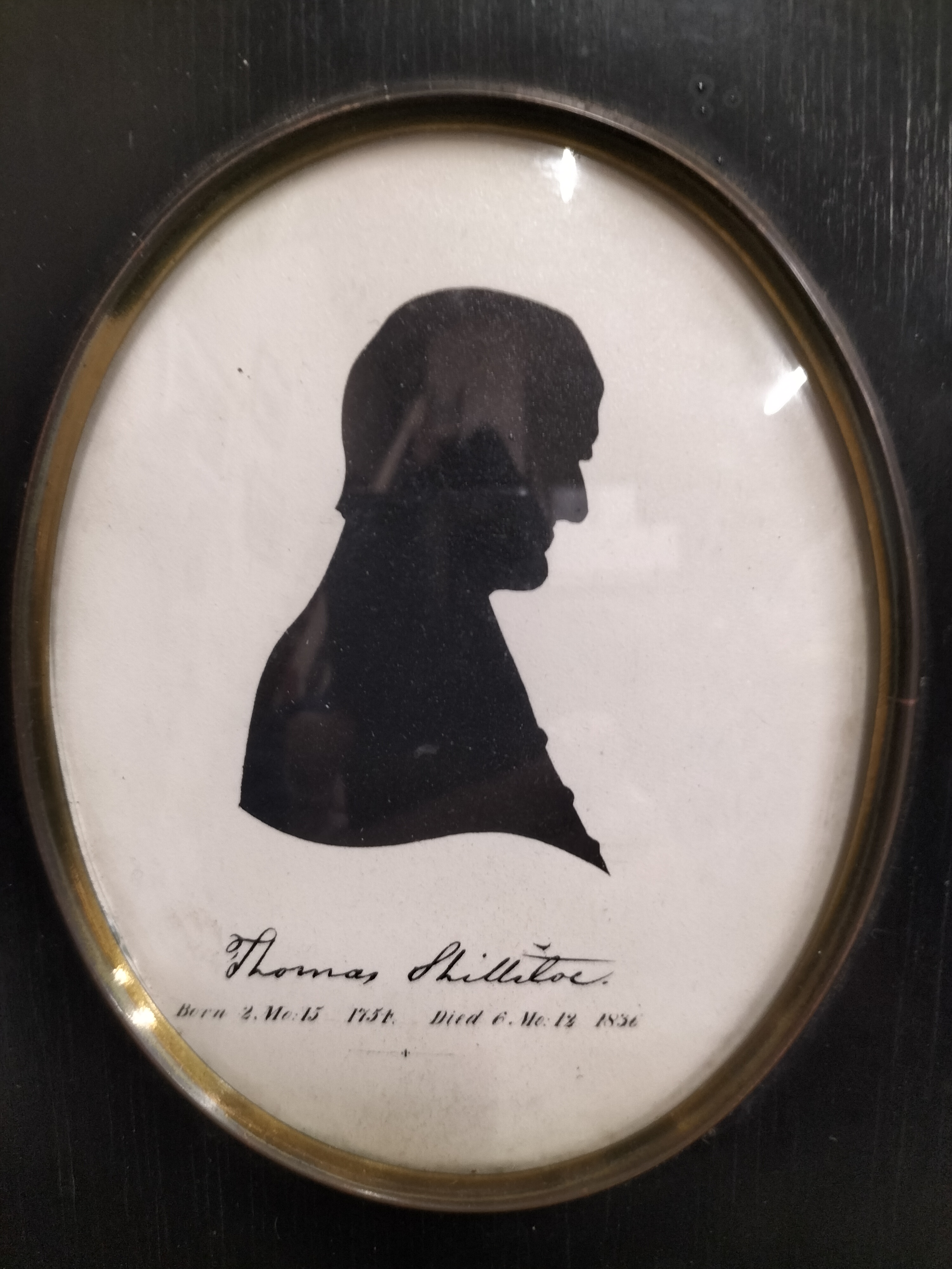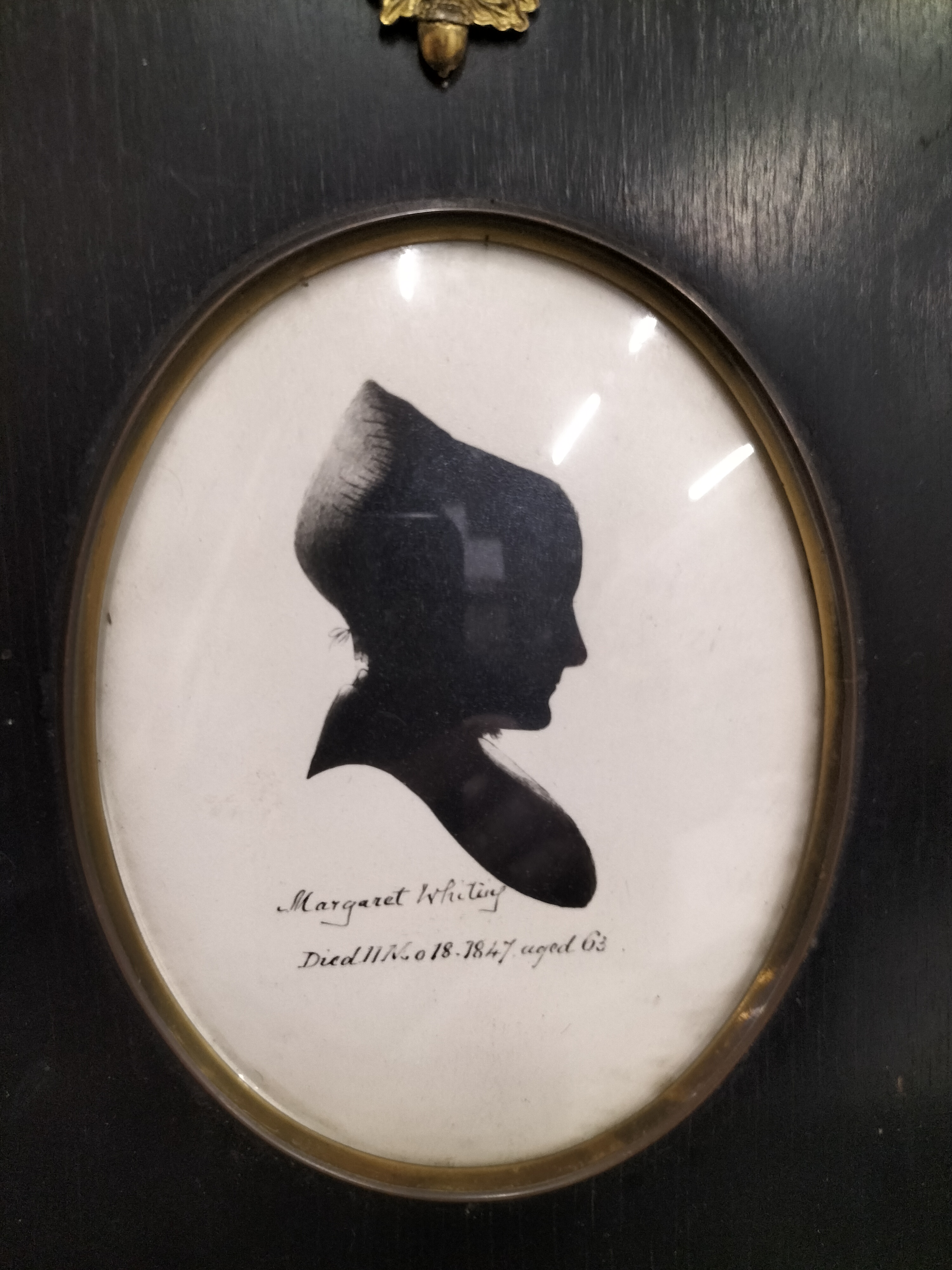 British School, 19th Century. A pair of bust-length profile silhouettes, likely executed in ink or cut paper on paper supports. One portrait depicts a woman in a bonnet, identified by a handwritten inscription as Margaret Whiting, inscribed ‘Margaret Whiting / Died 11 Mo 18. 1847 aged 63’. The companion silhouette depicts the Quaker minister Thomas Shillitoe, with an inscription reading ‘Thomas Shillitoe / Born 2. Mo: 15 1754. Died 6. Mo: 12 1836’. Both artworks are housed under glass in matching rectangular black-painted wooden frames featuring oval brass-trimmed openings and decorative brass acorn hangers.